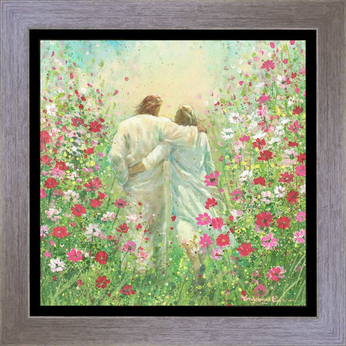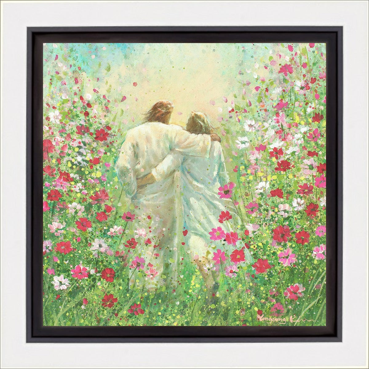 Divine Counselor by Yongsung Kim features Jesus Christ giving advice to a follower in white garments while walking arm in arm through a field of bright flowers