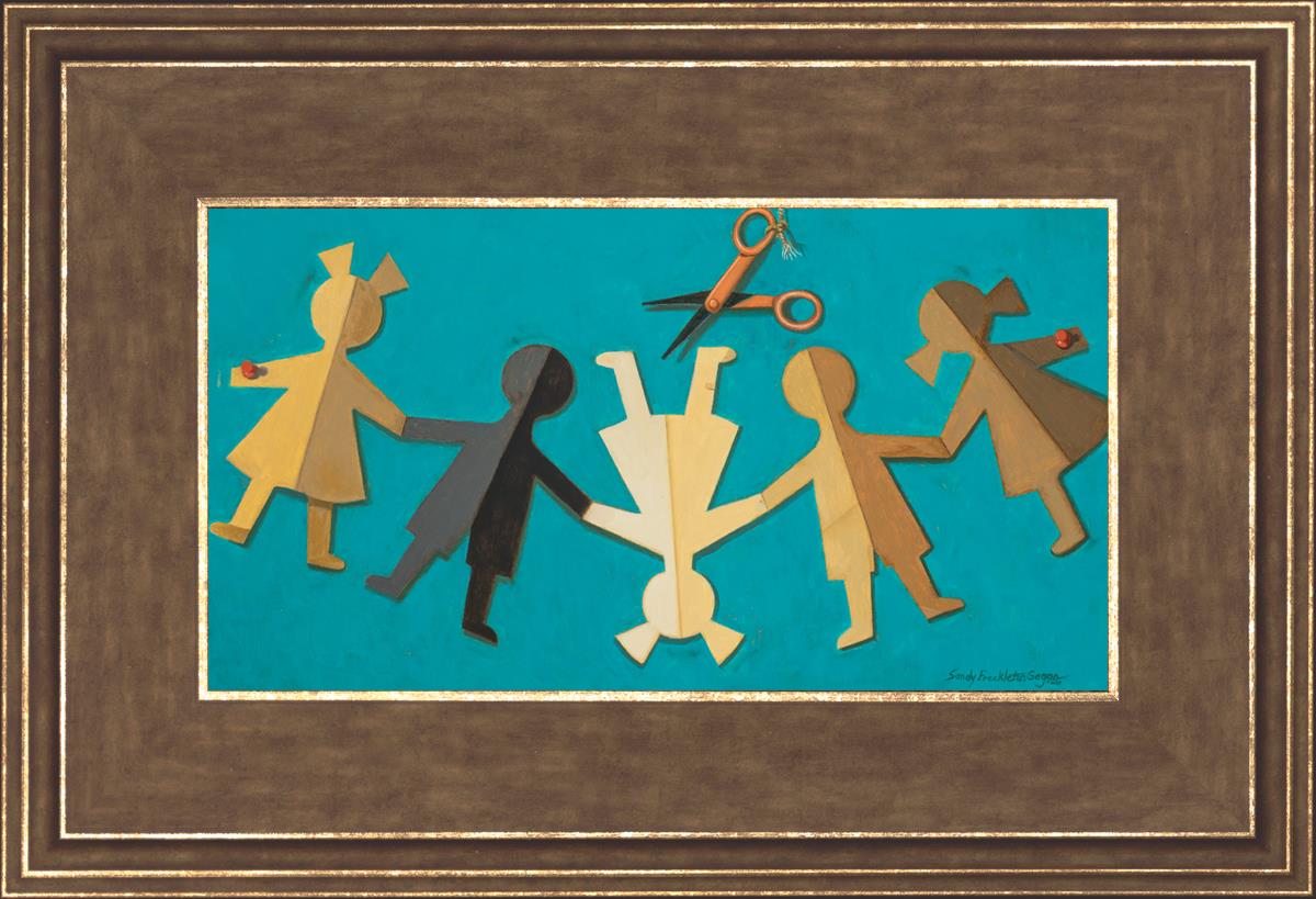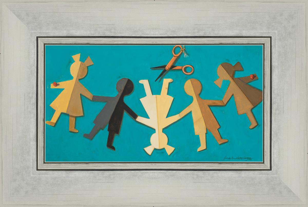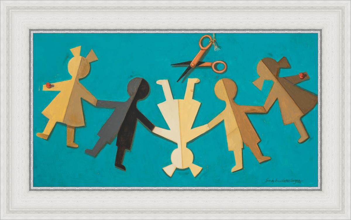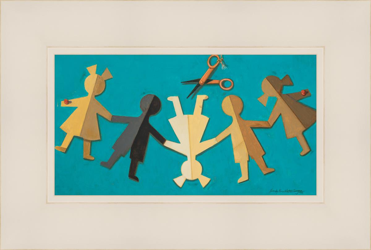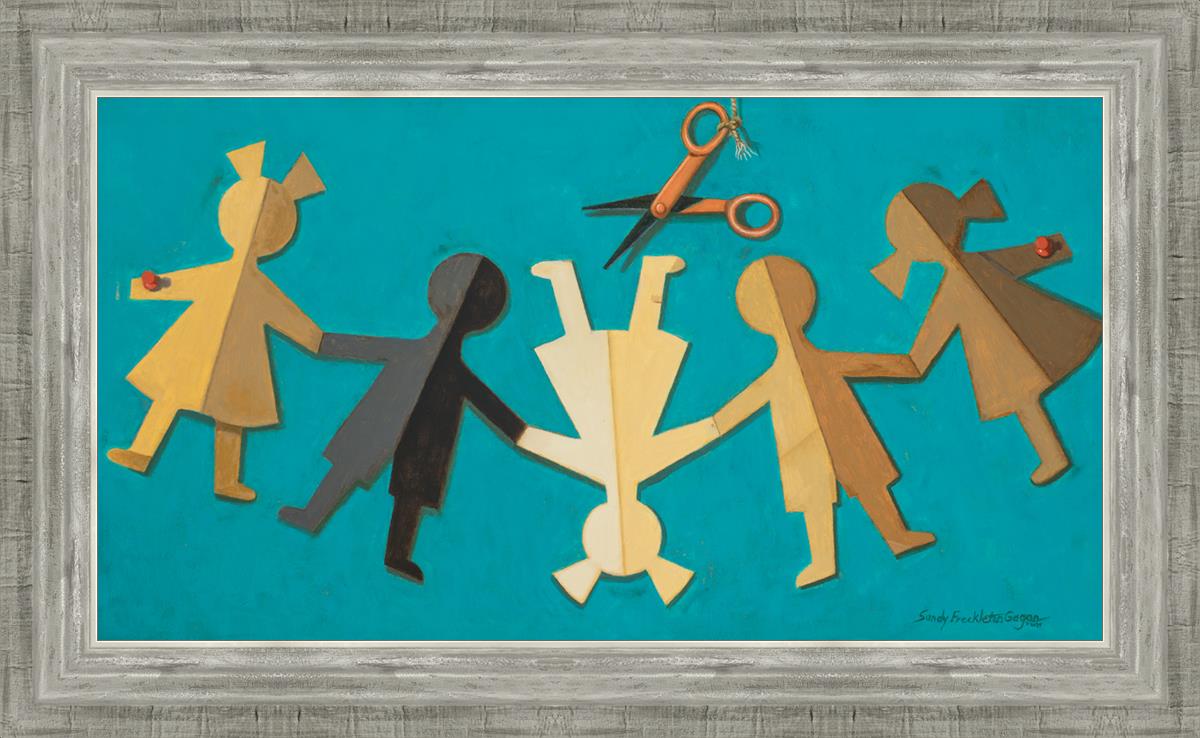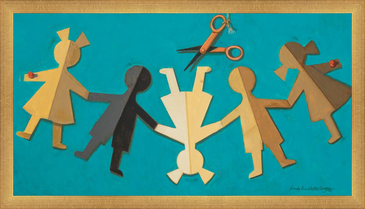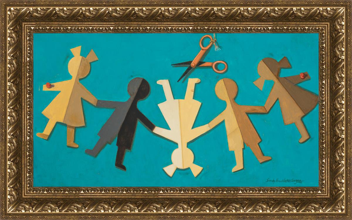 Later in the evening I reflected on my conversation with Bonnie about the golden rule. I remembered making paper doll chains as a little girl. The concept for this painting coalesced.