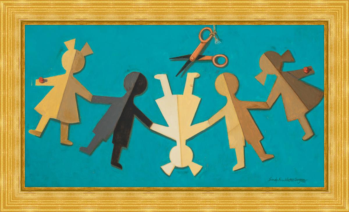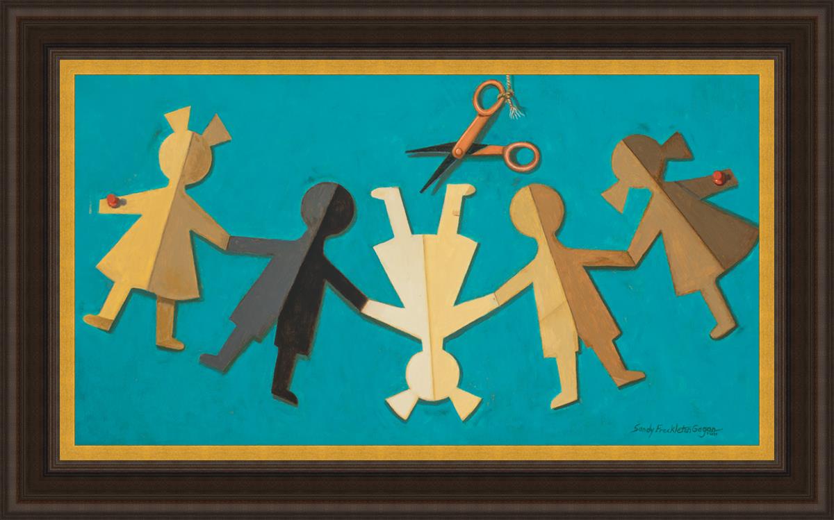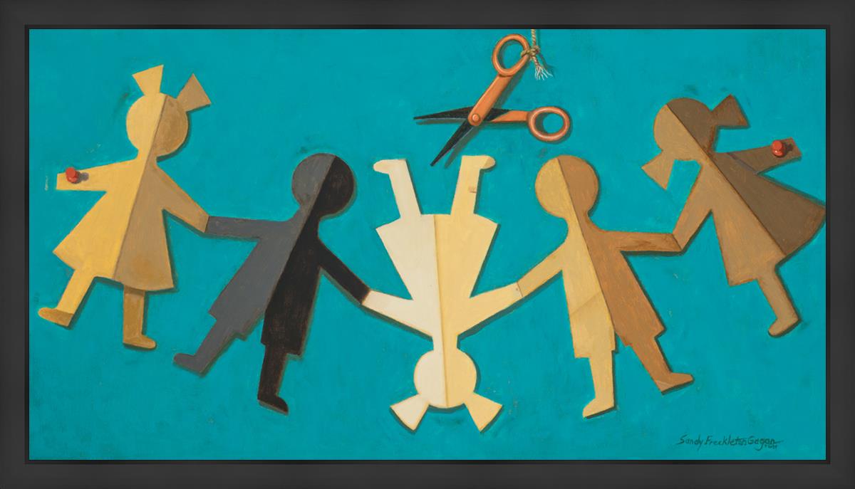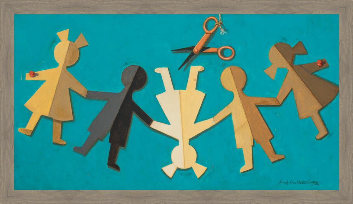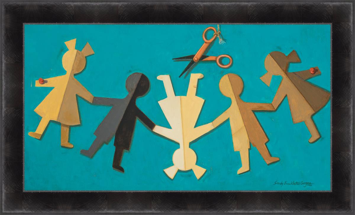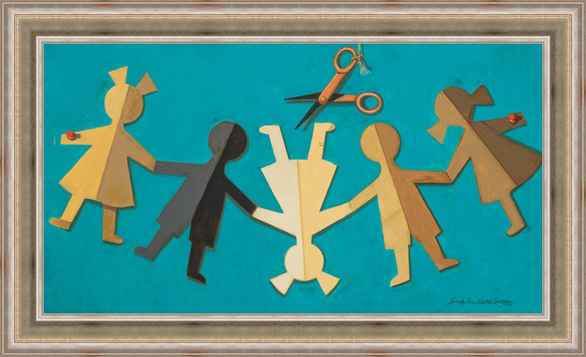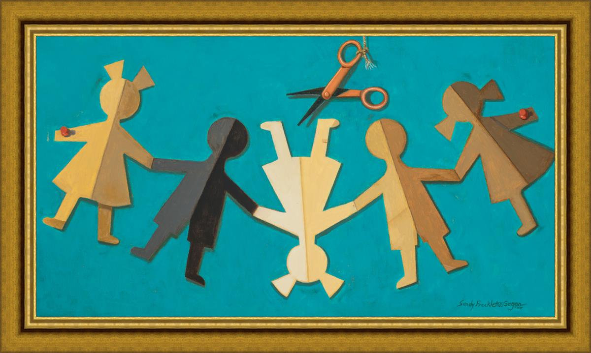 Later in the evening I reflected on my conversation with Bonnie about the golden rule. I remembered making paper doll chains as a little girl. The concept for this painting coalesced.