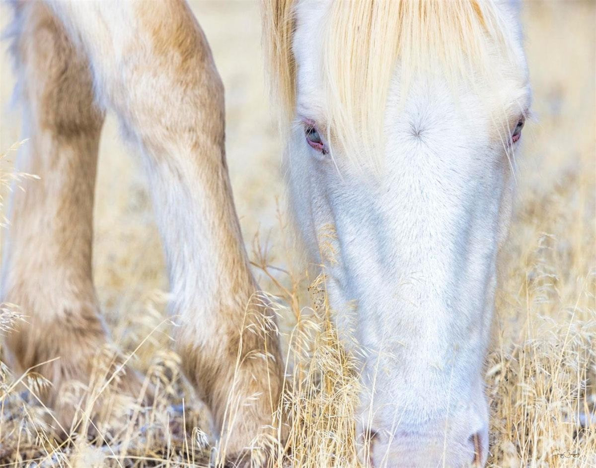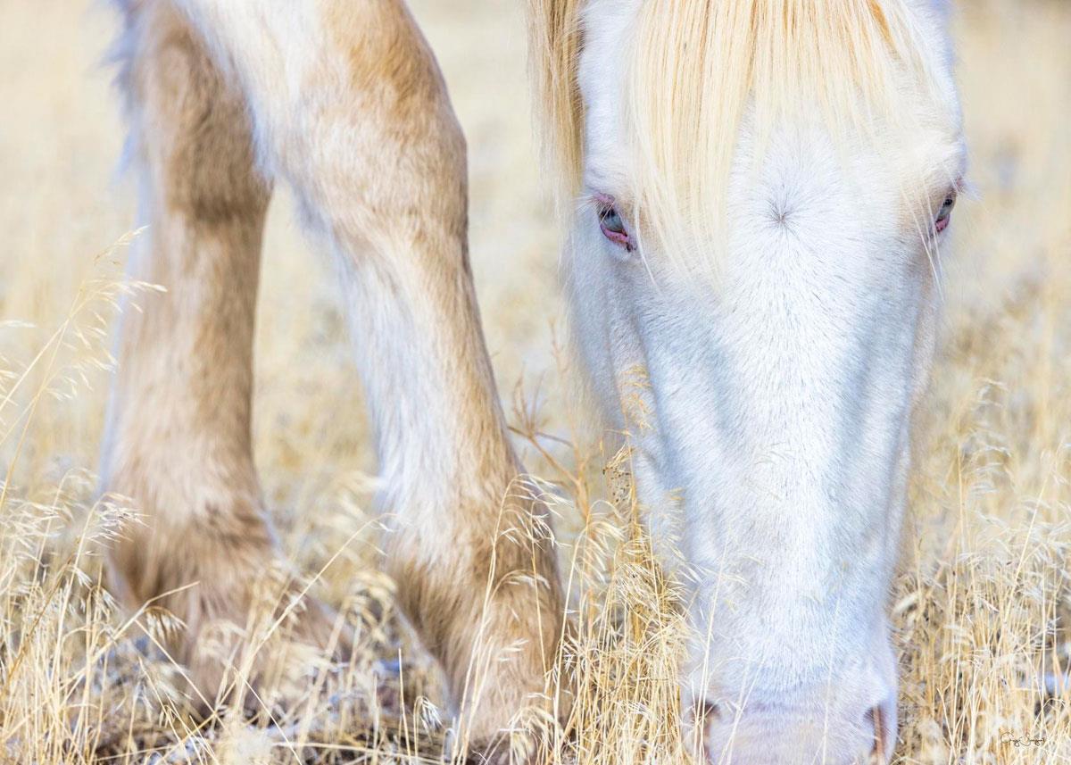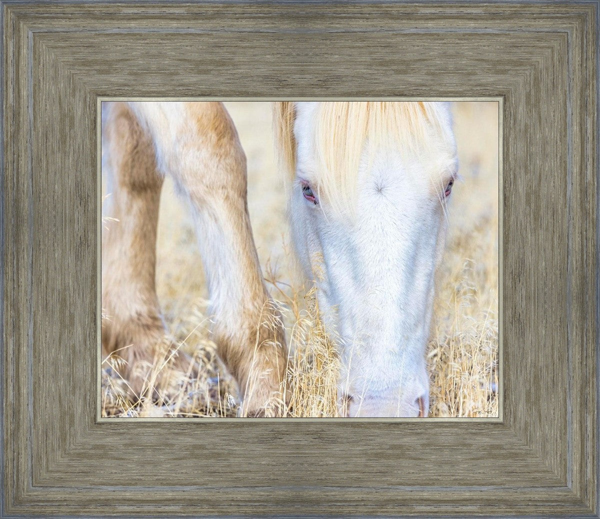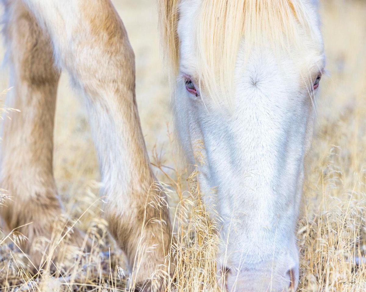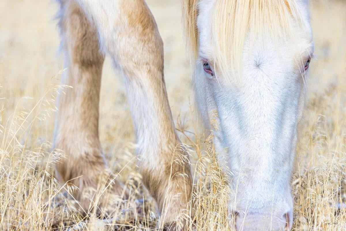 Low angle shot of a wild horse trying to get the last of the dry summer grass.