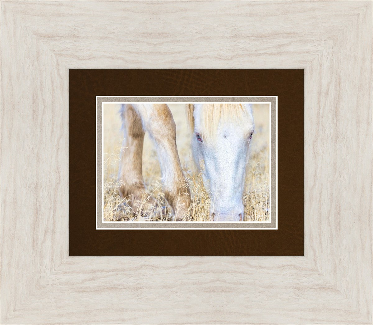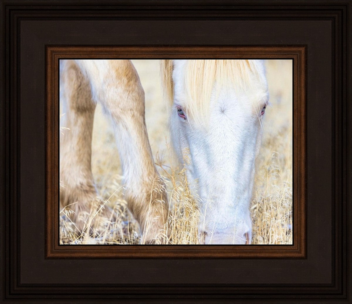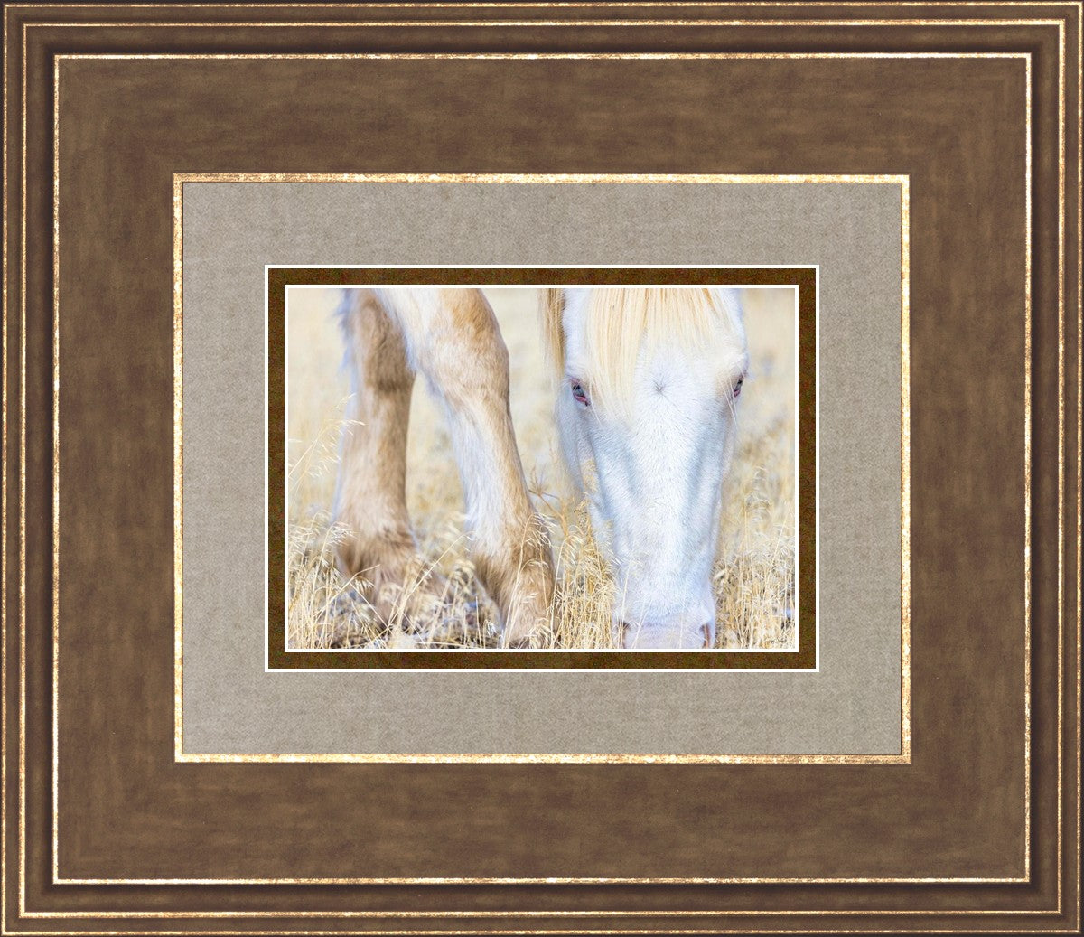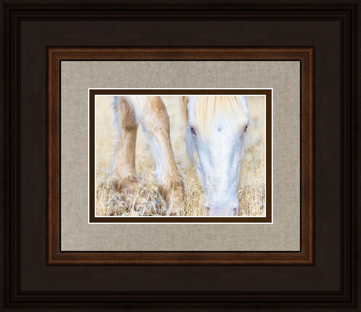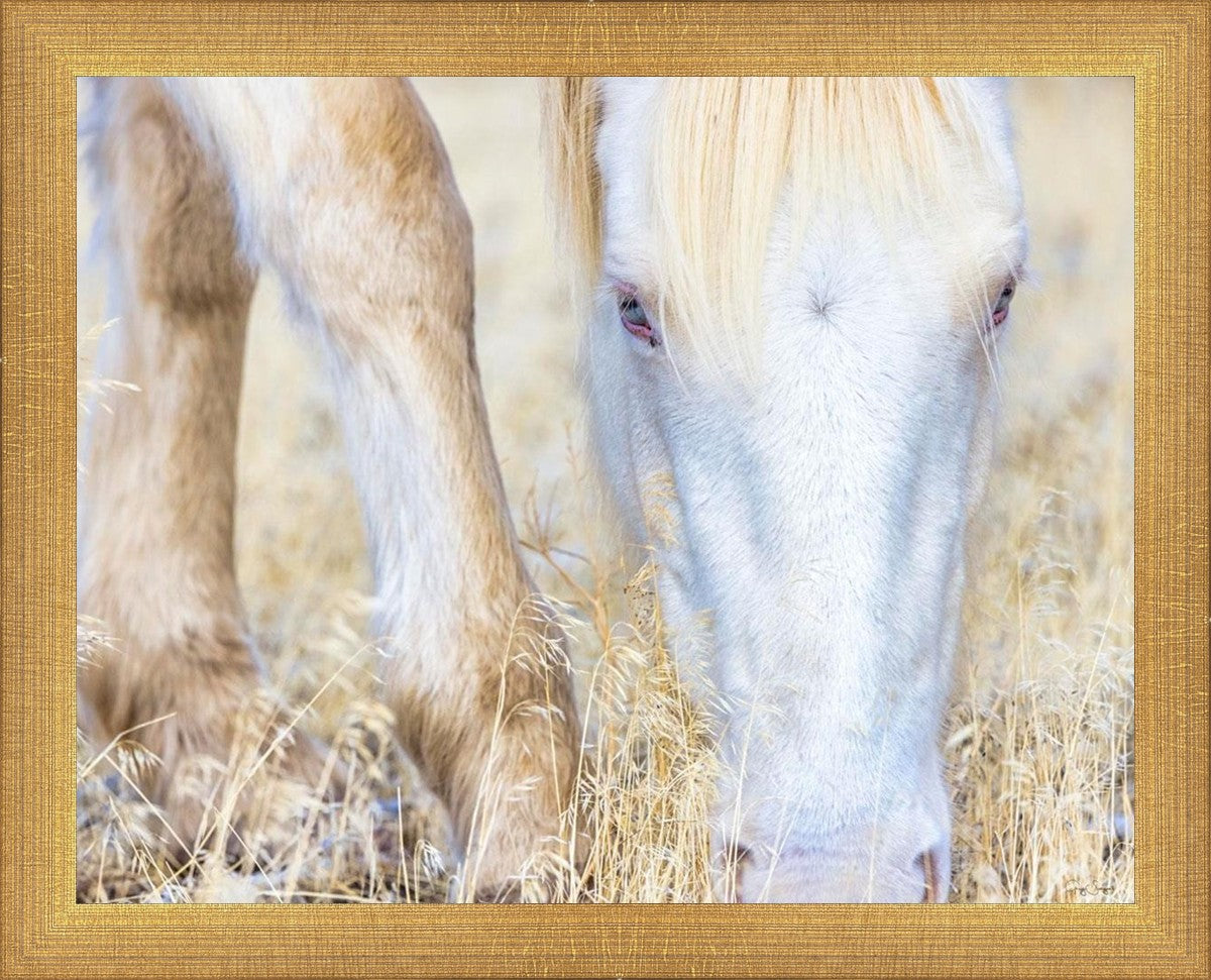 Low angle shot of a wild horse trying to get the last of the dry summer grass.