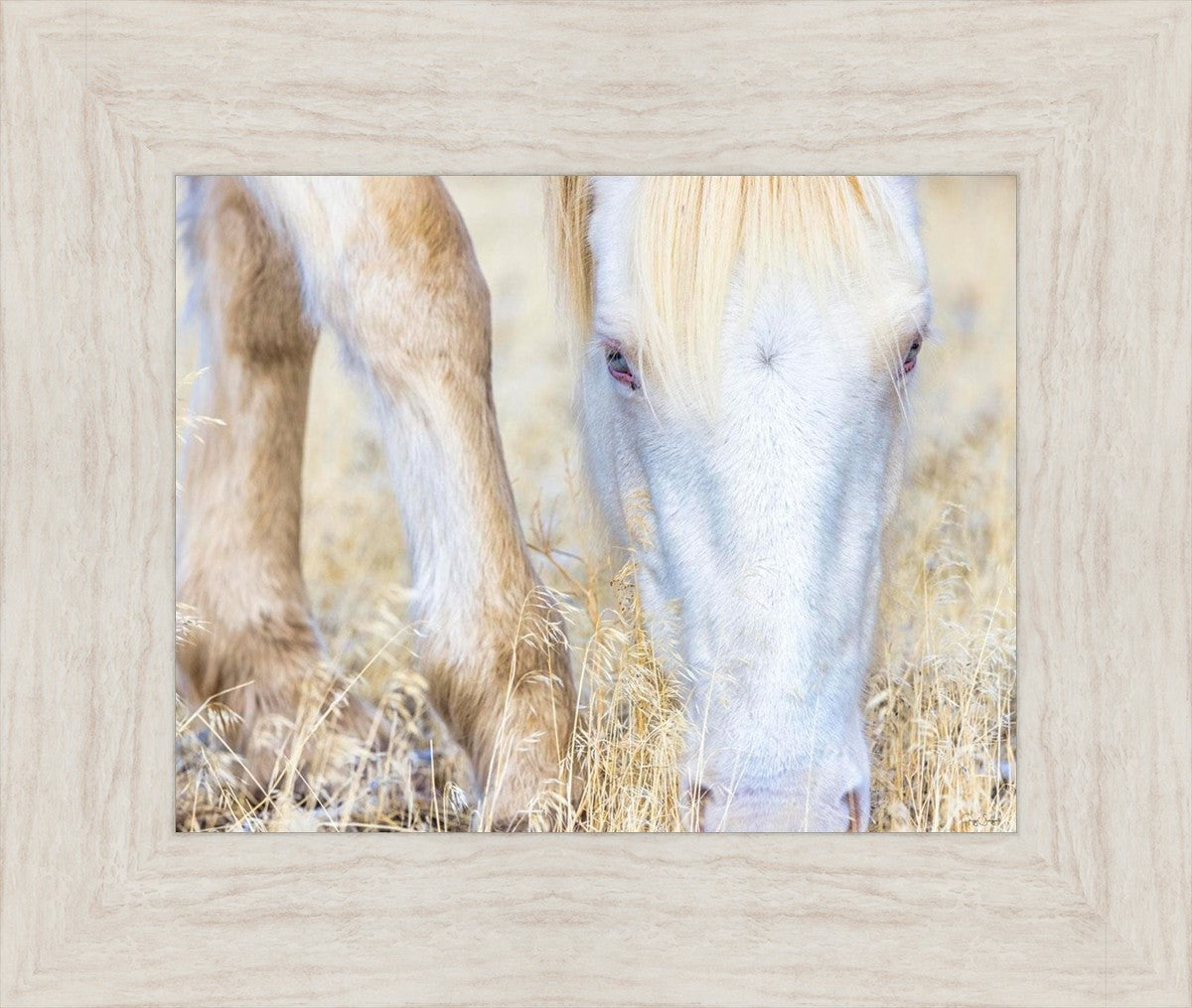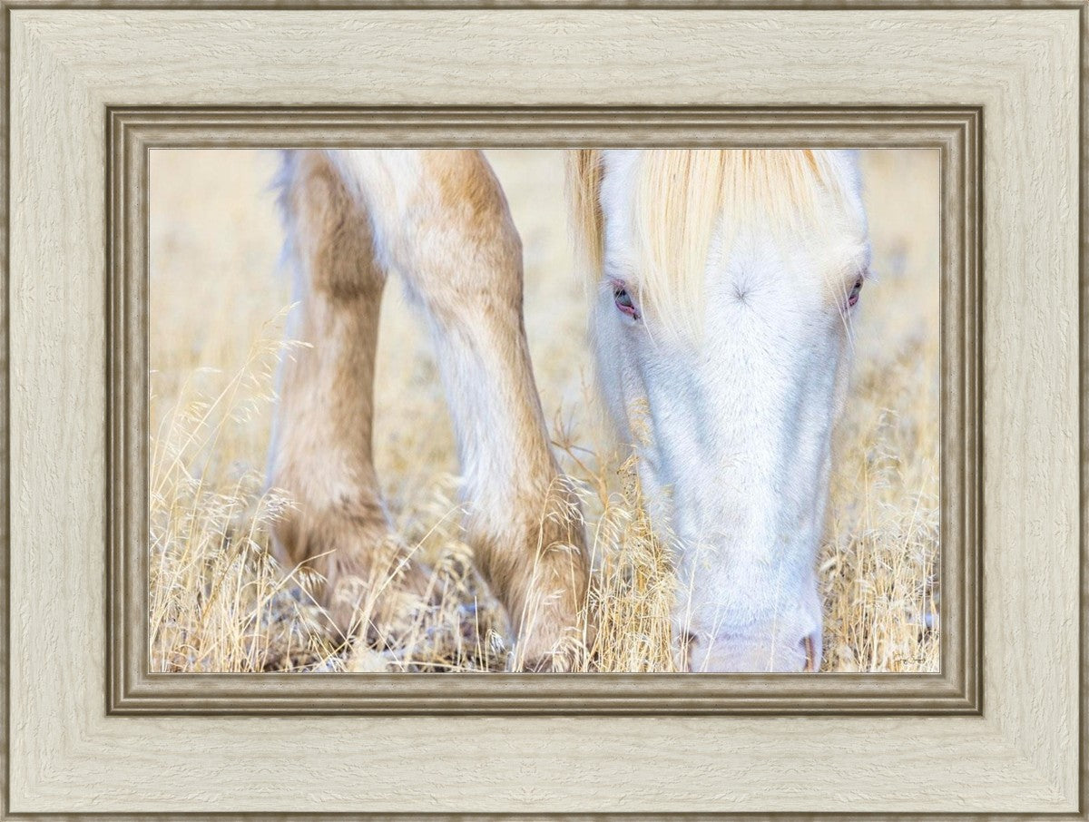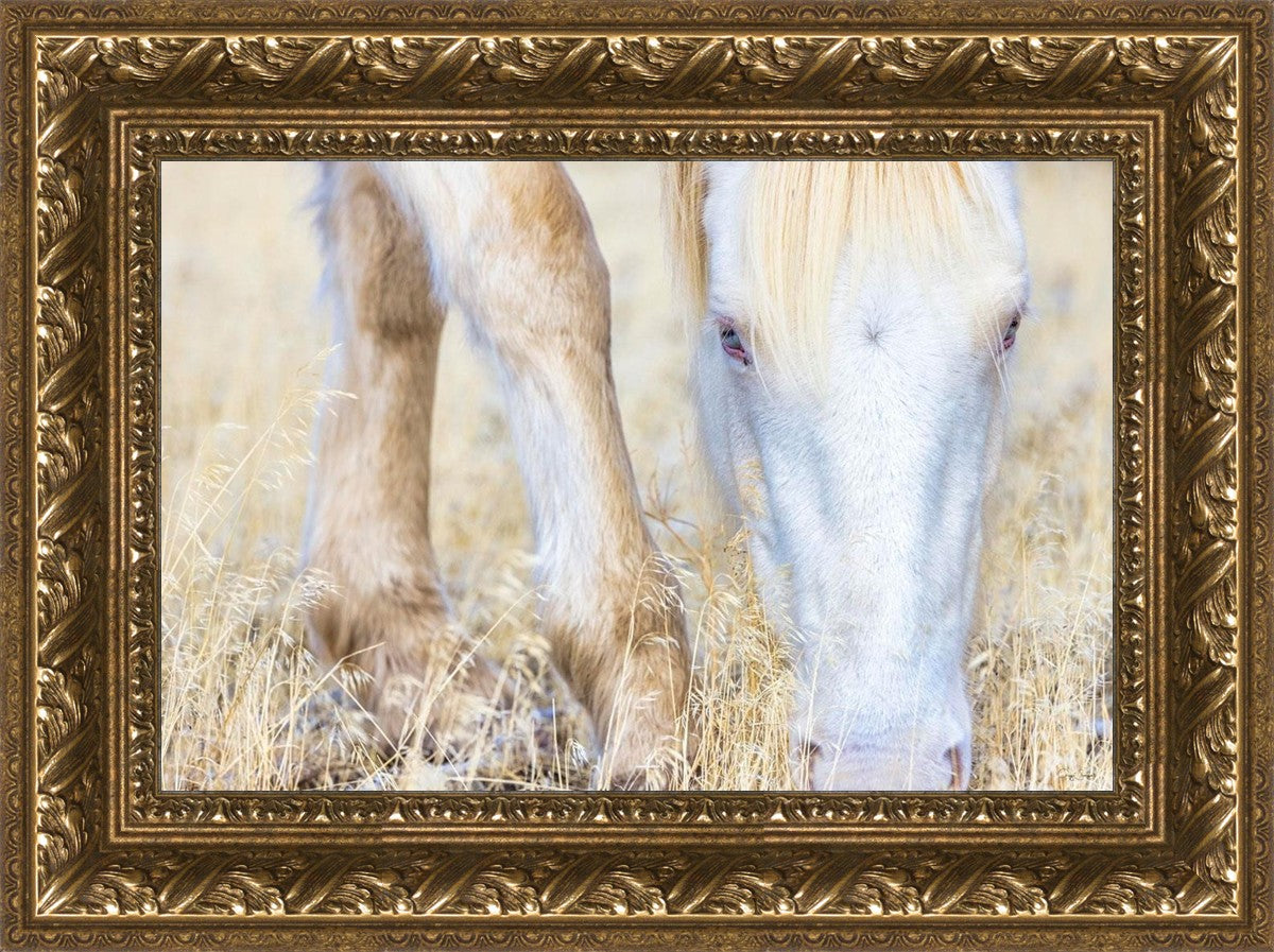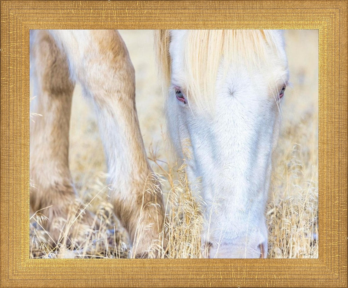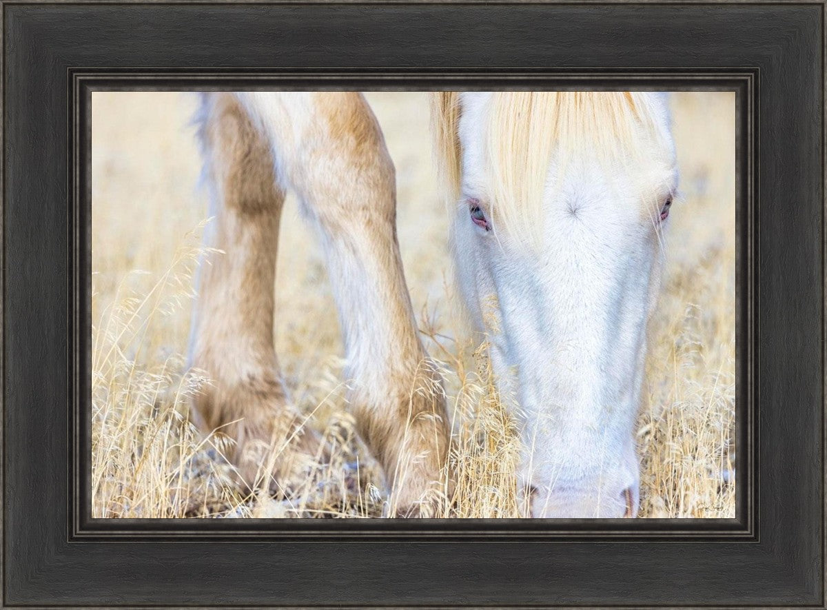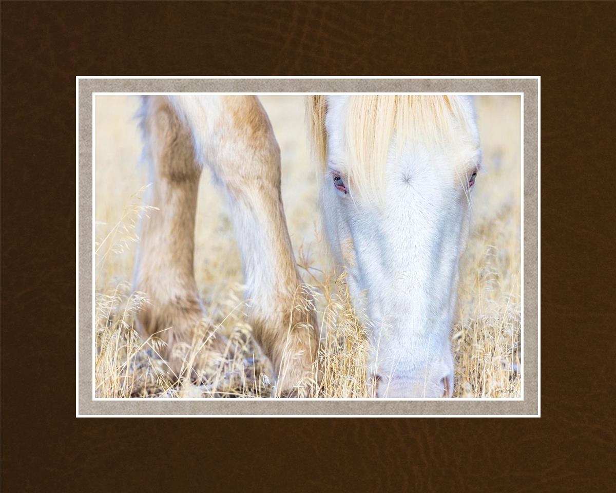 Low angle shot of a wild horse trying to get the last of the dry summer grass.