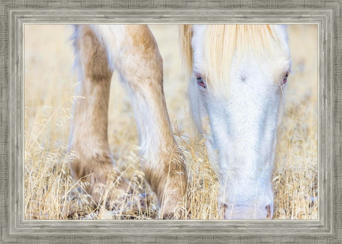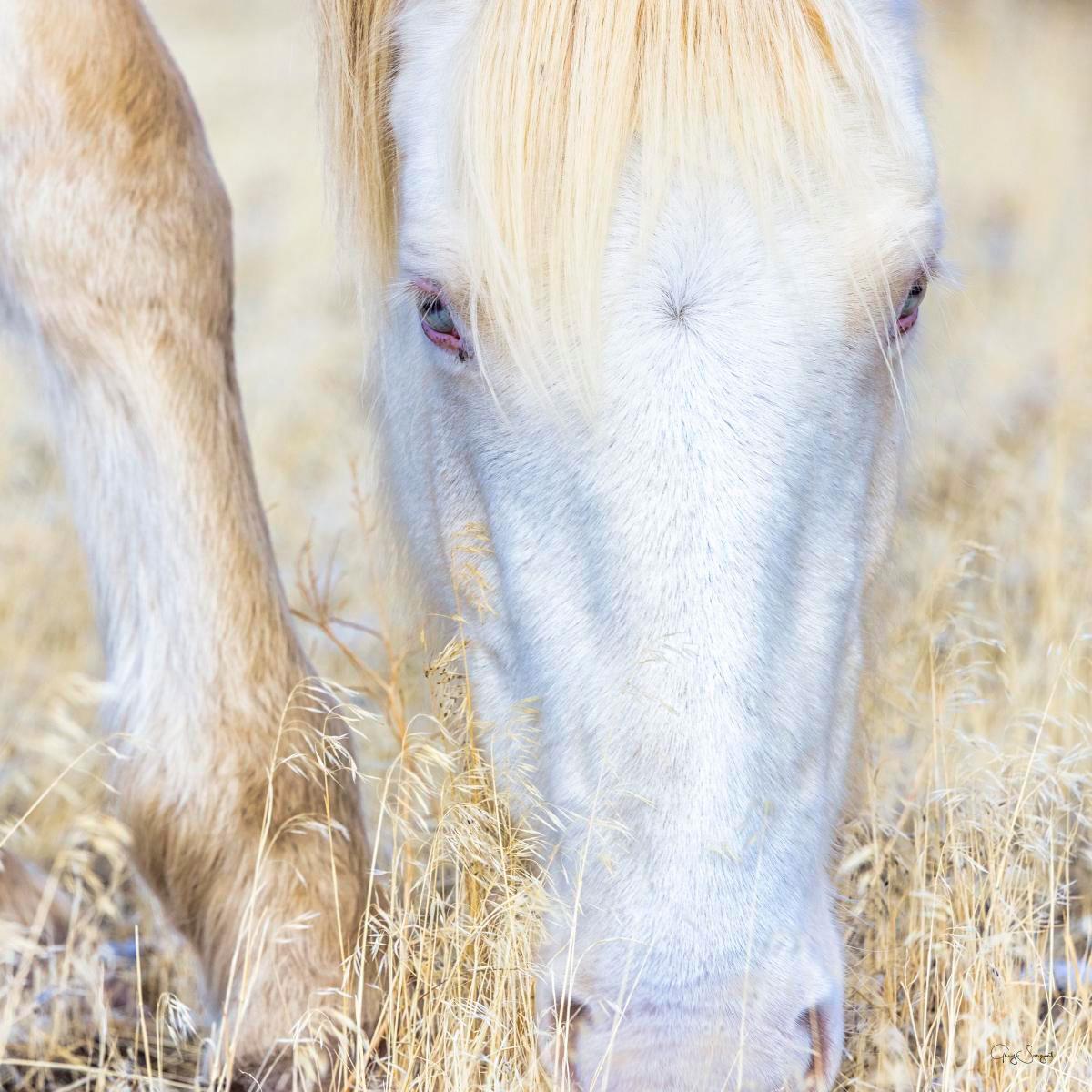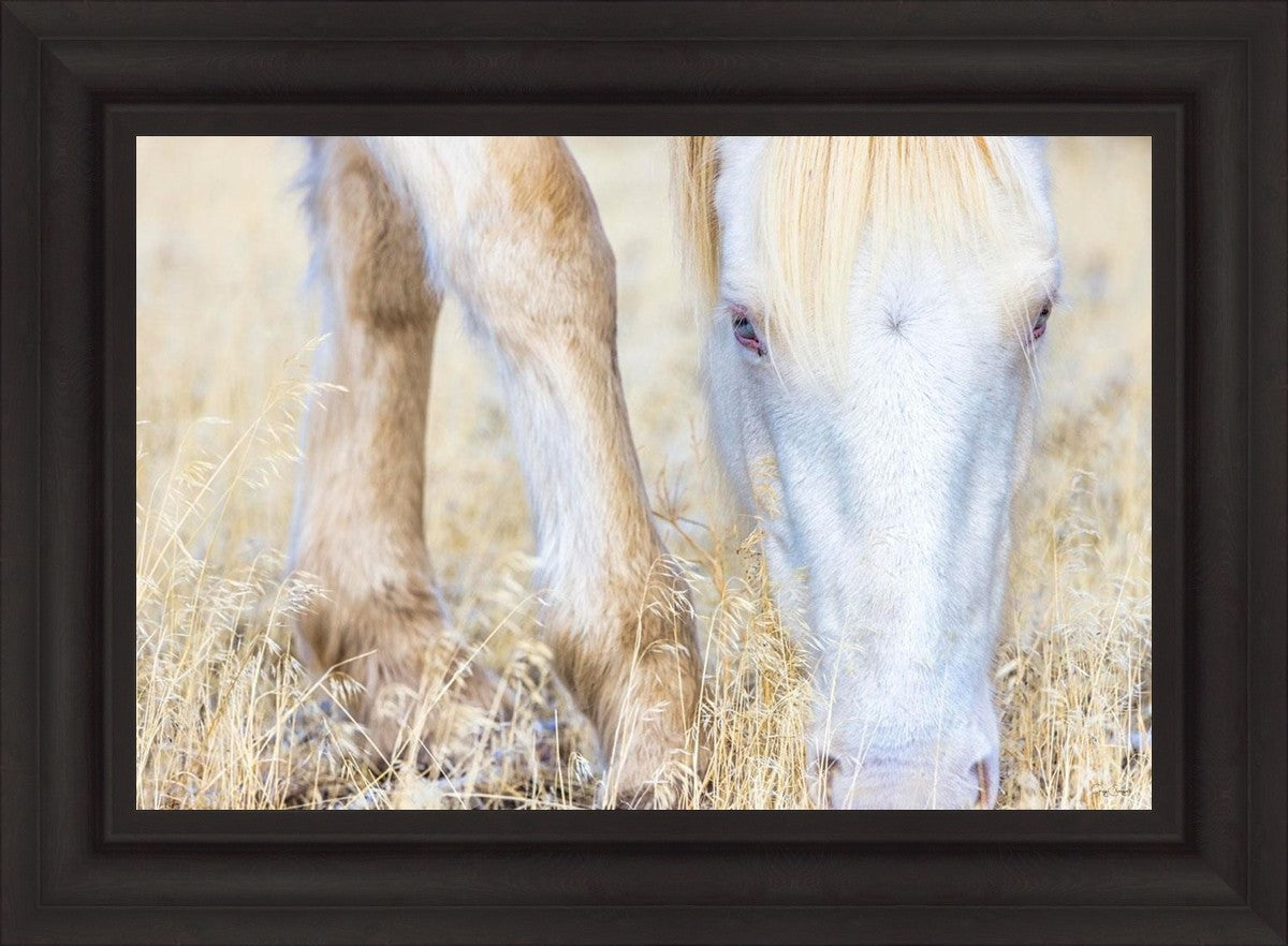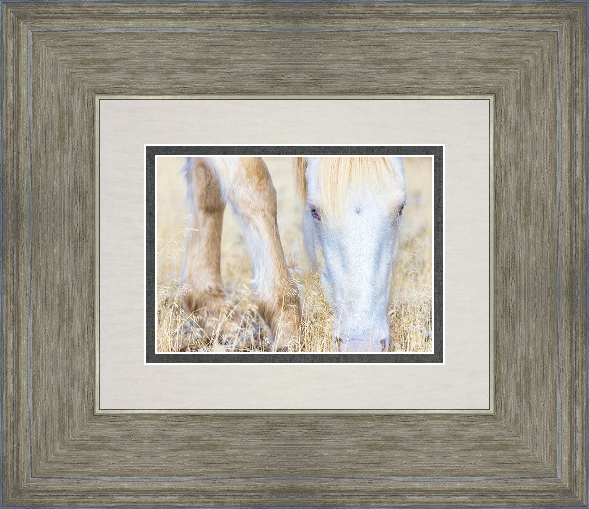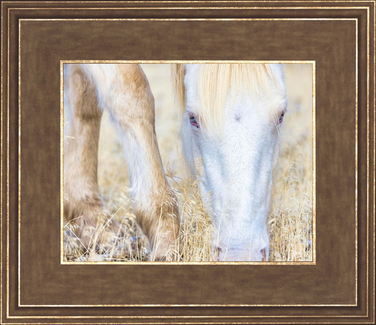 Low angle shot of a wild horse trying to get the last of the dry summer grass.