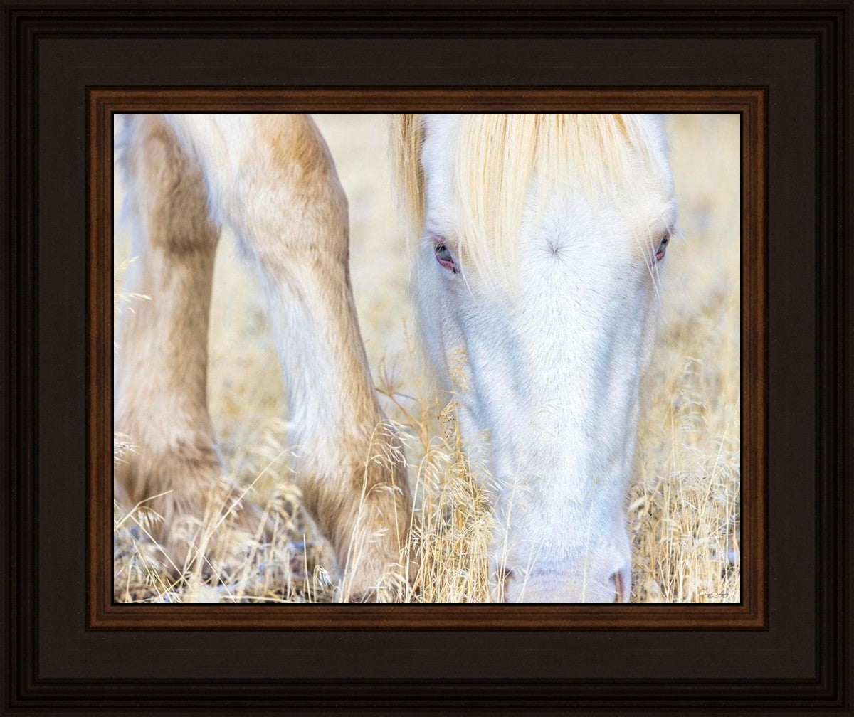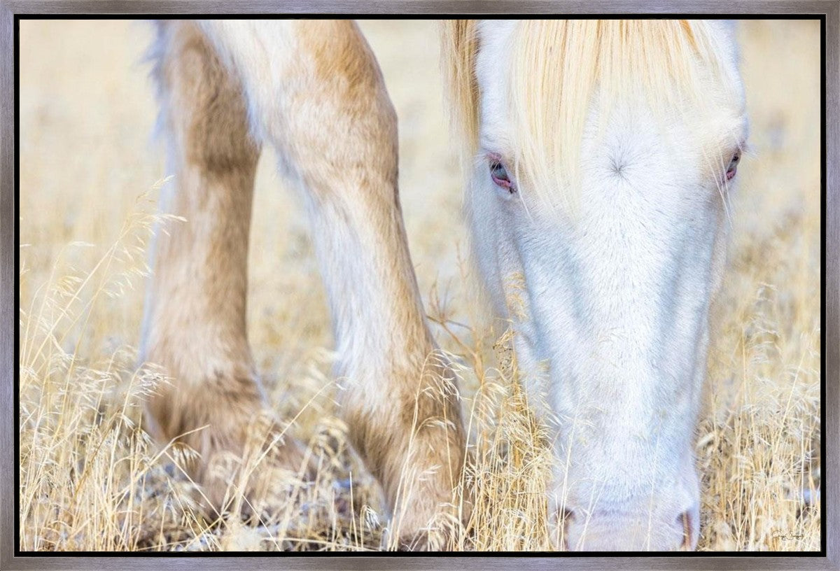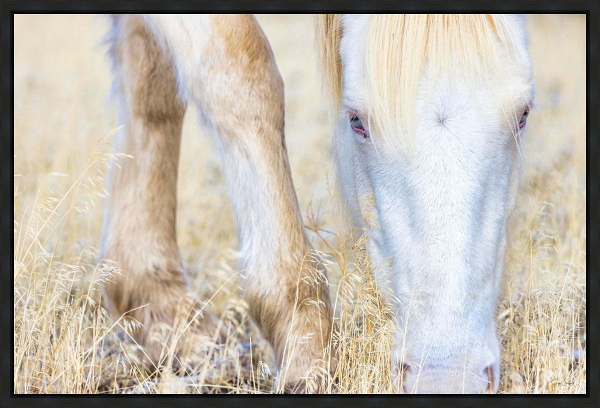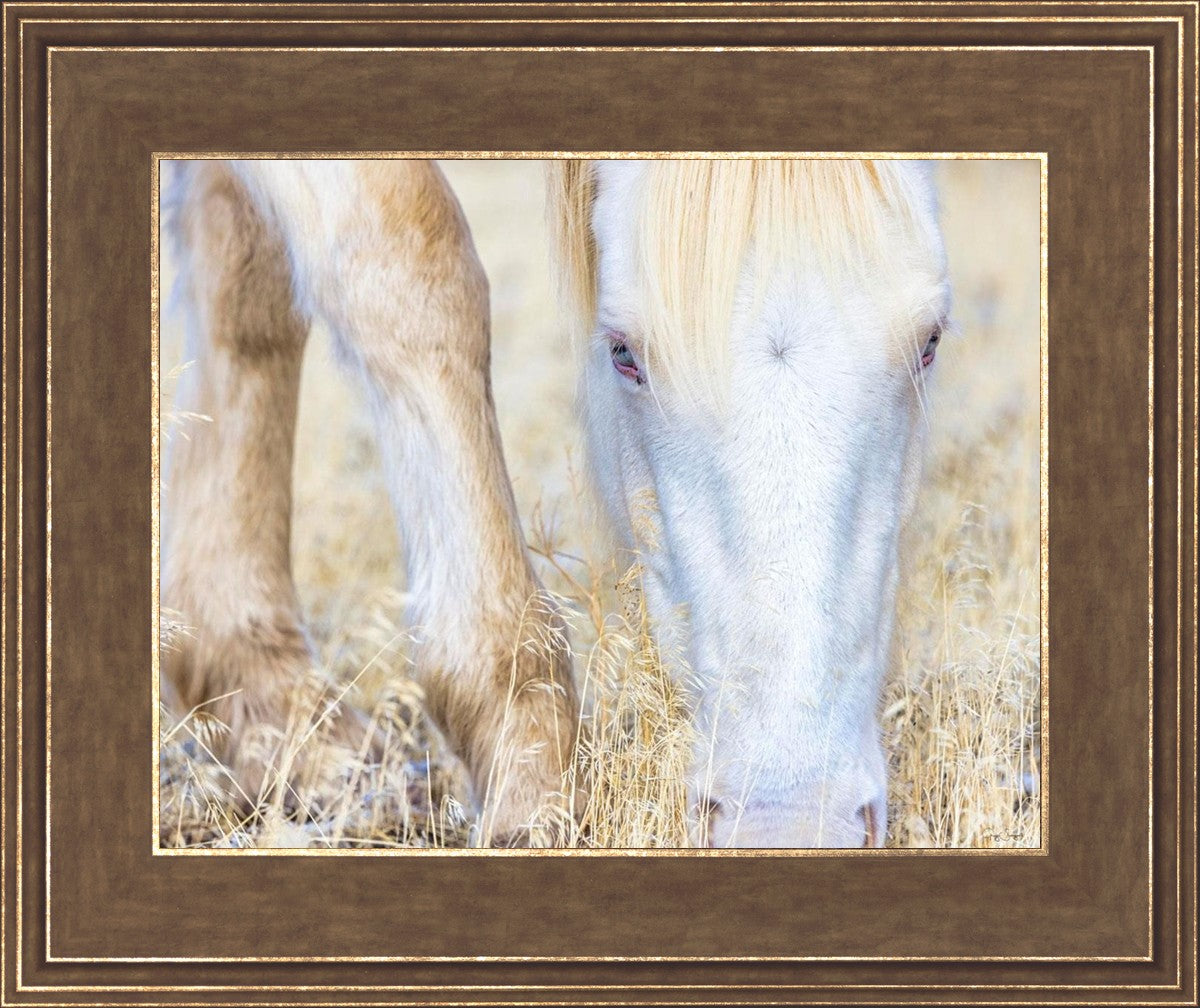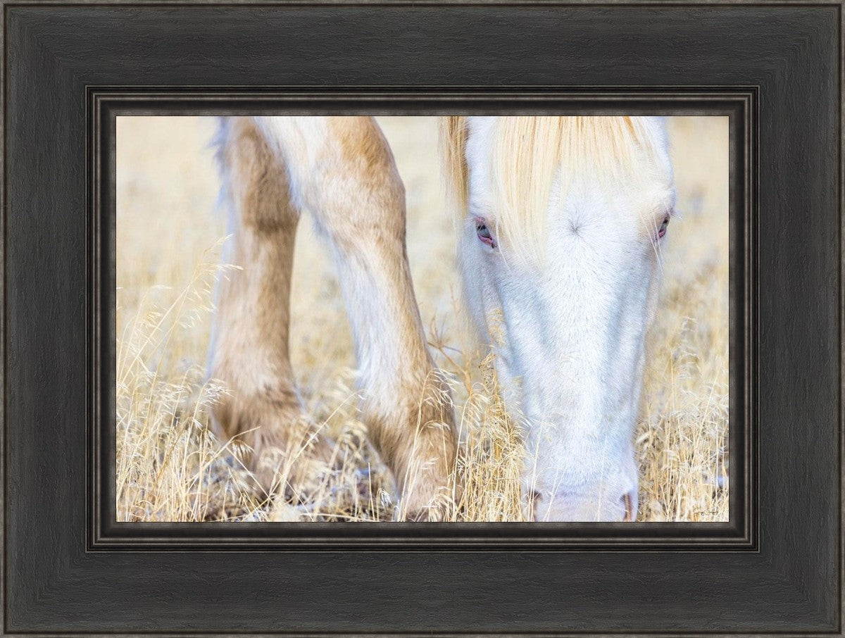 Low angle shot of a wild horse trying to get the last of the dry summer grass.