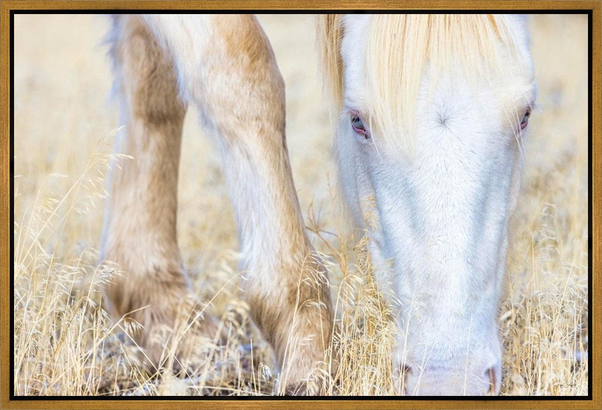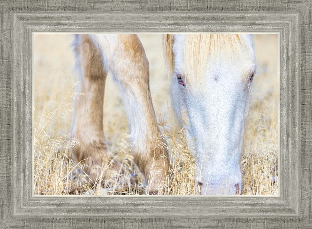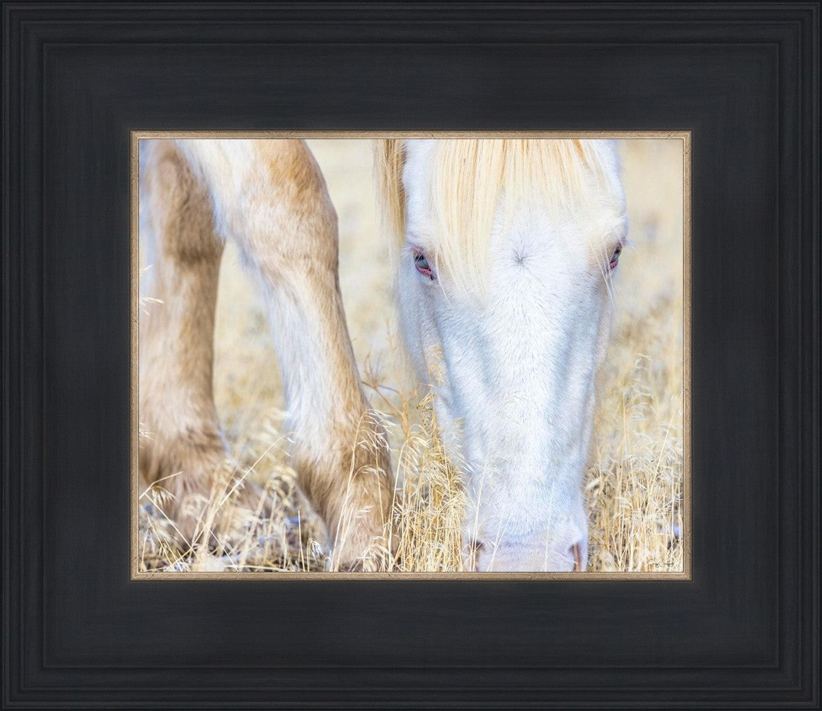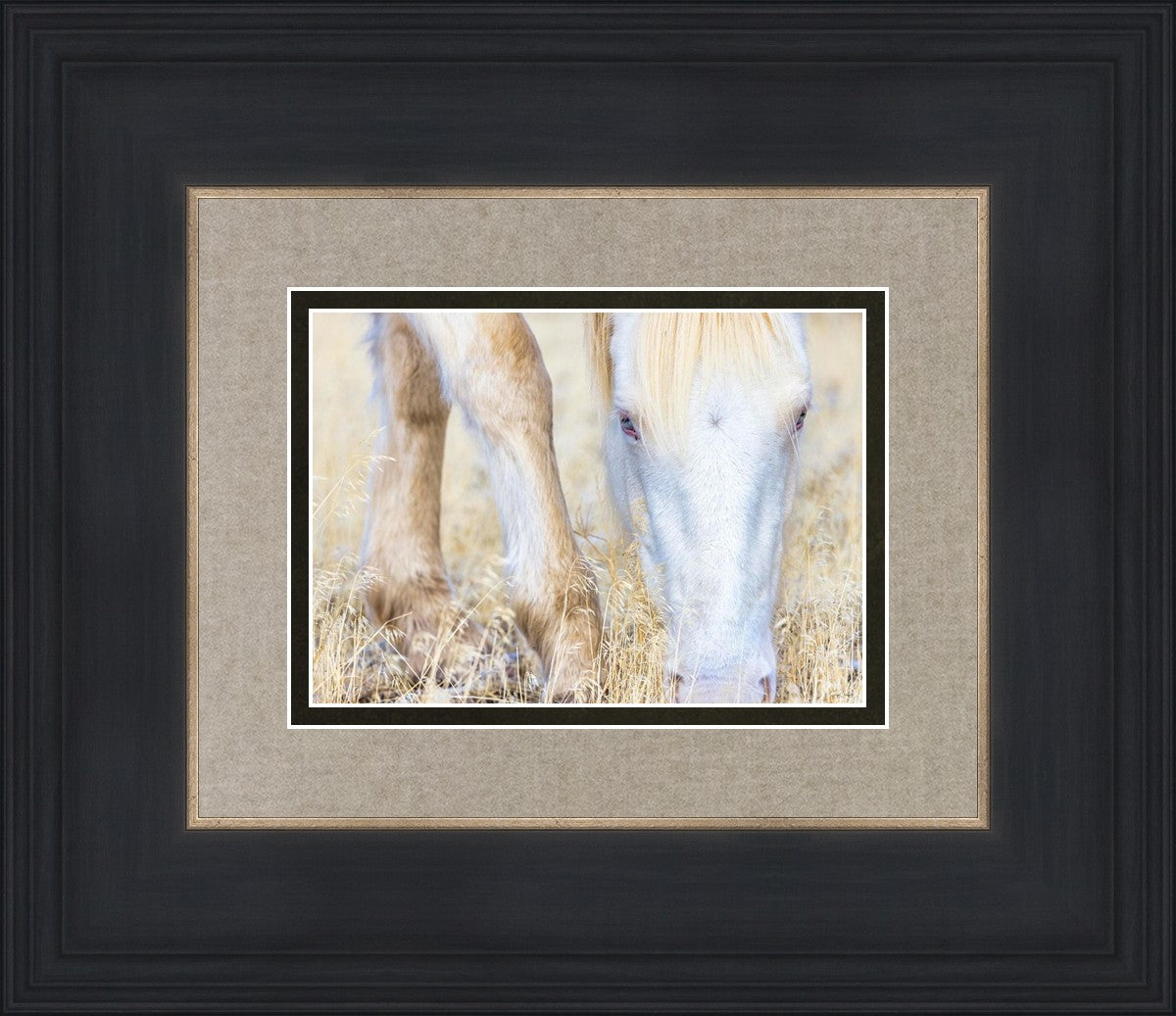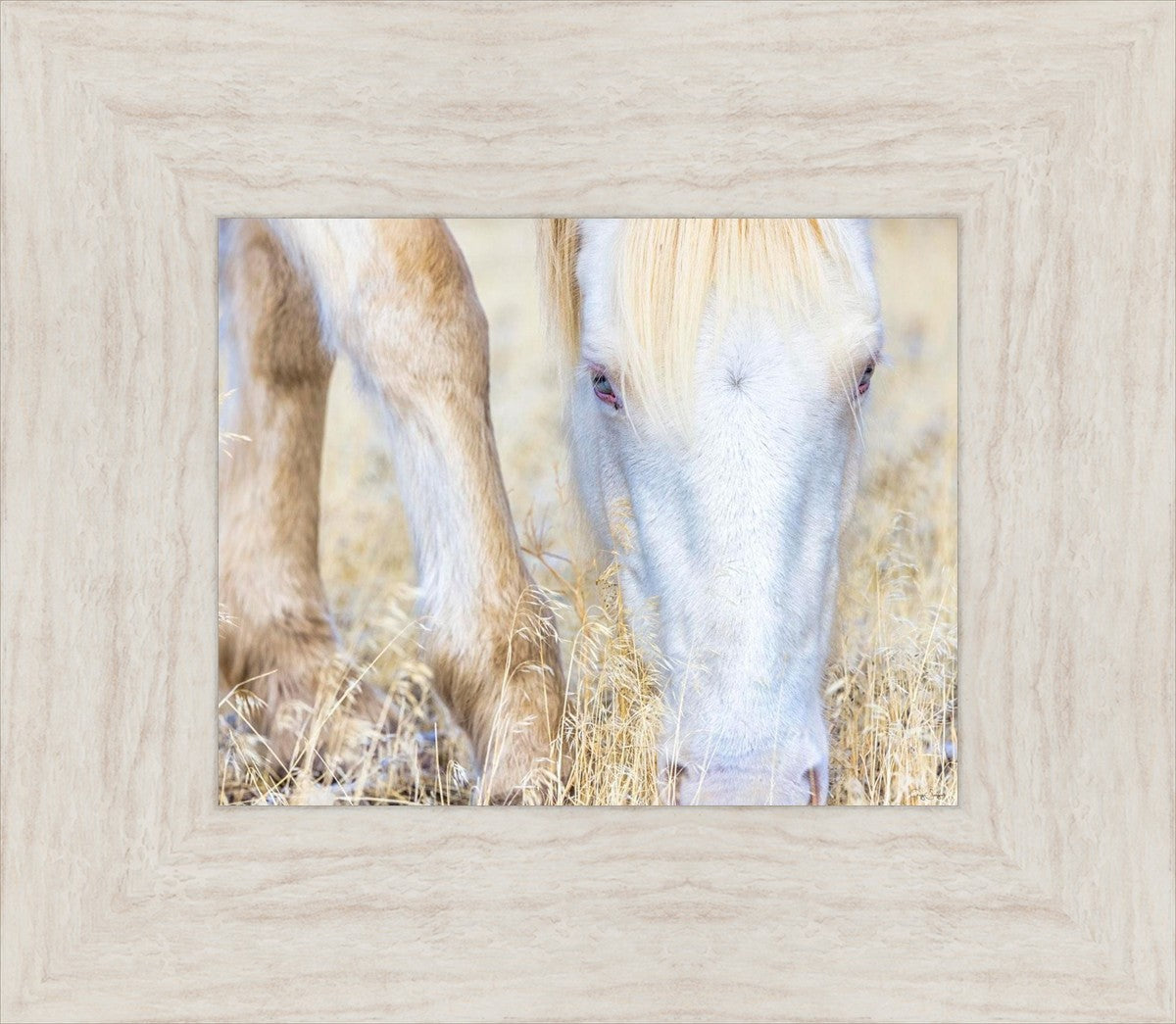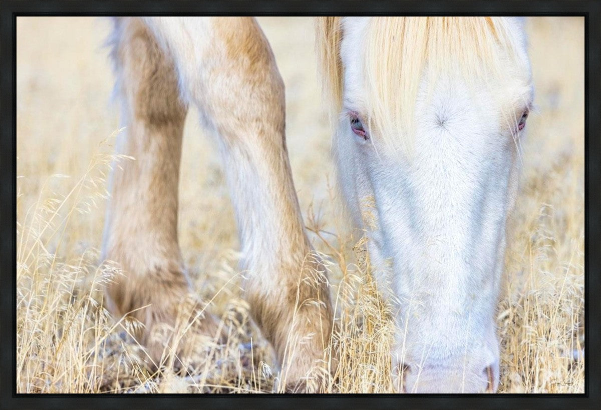 Low angle shot of a wild horse trying to get the last of the dry summer grass.