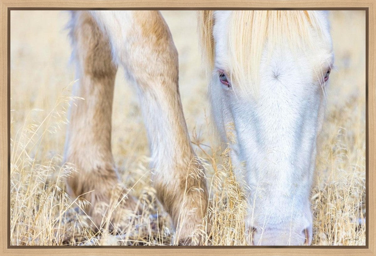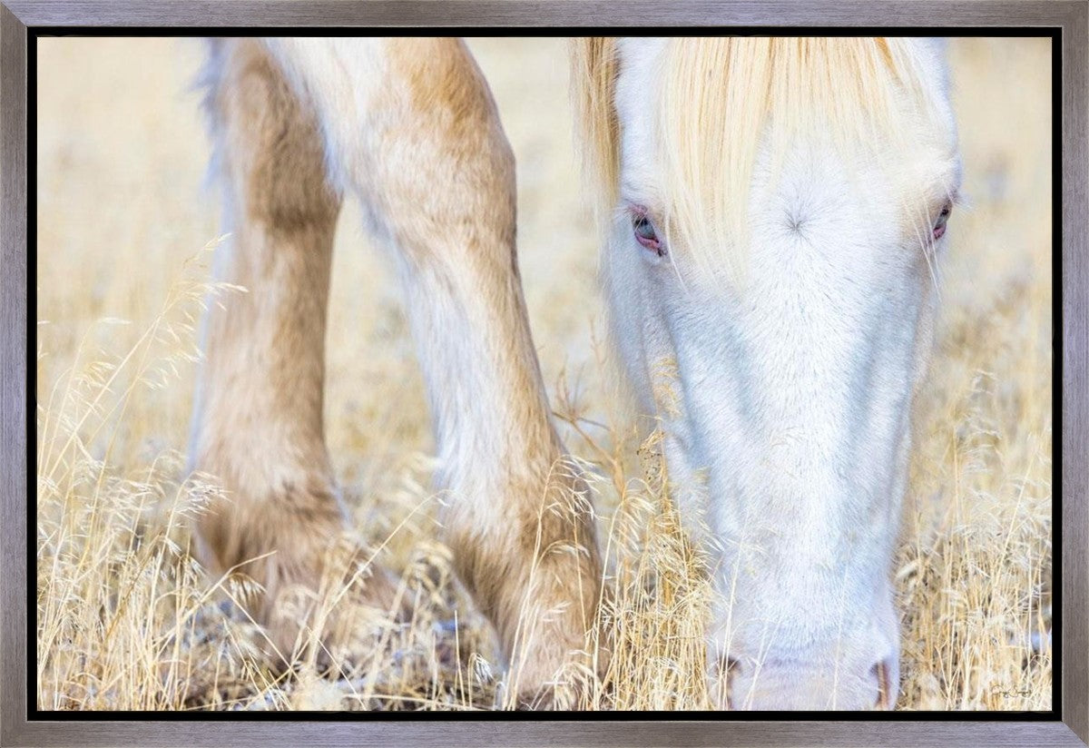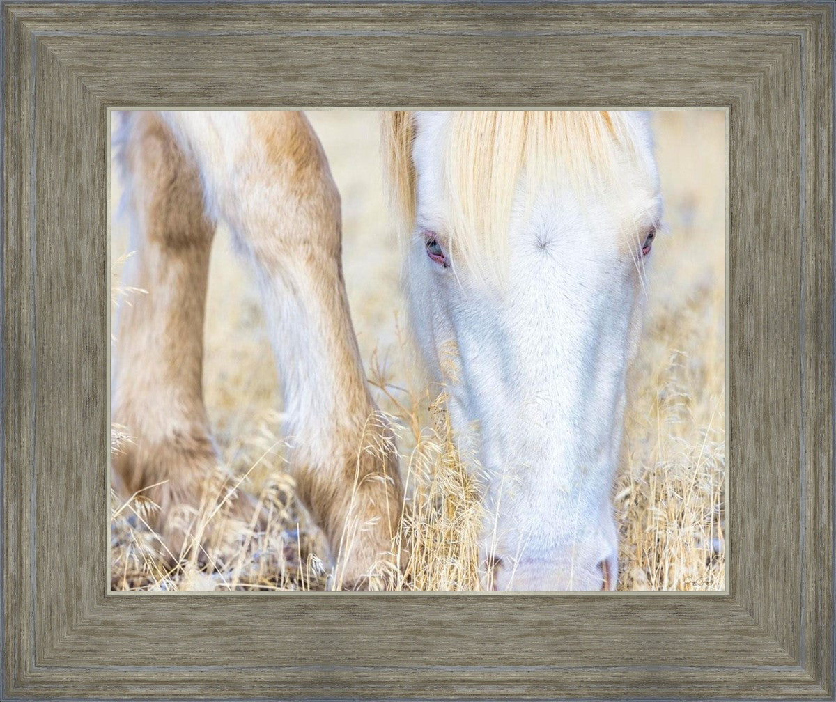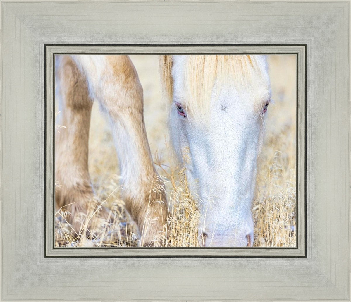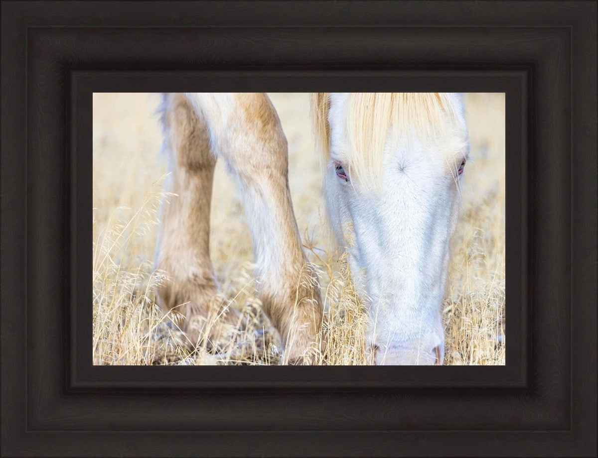 Low angle shot of a wild horse trying to get the last of the dry summer grass.