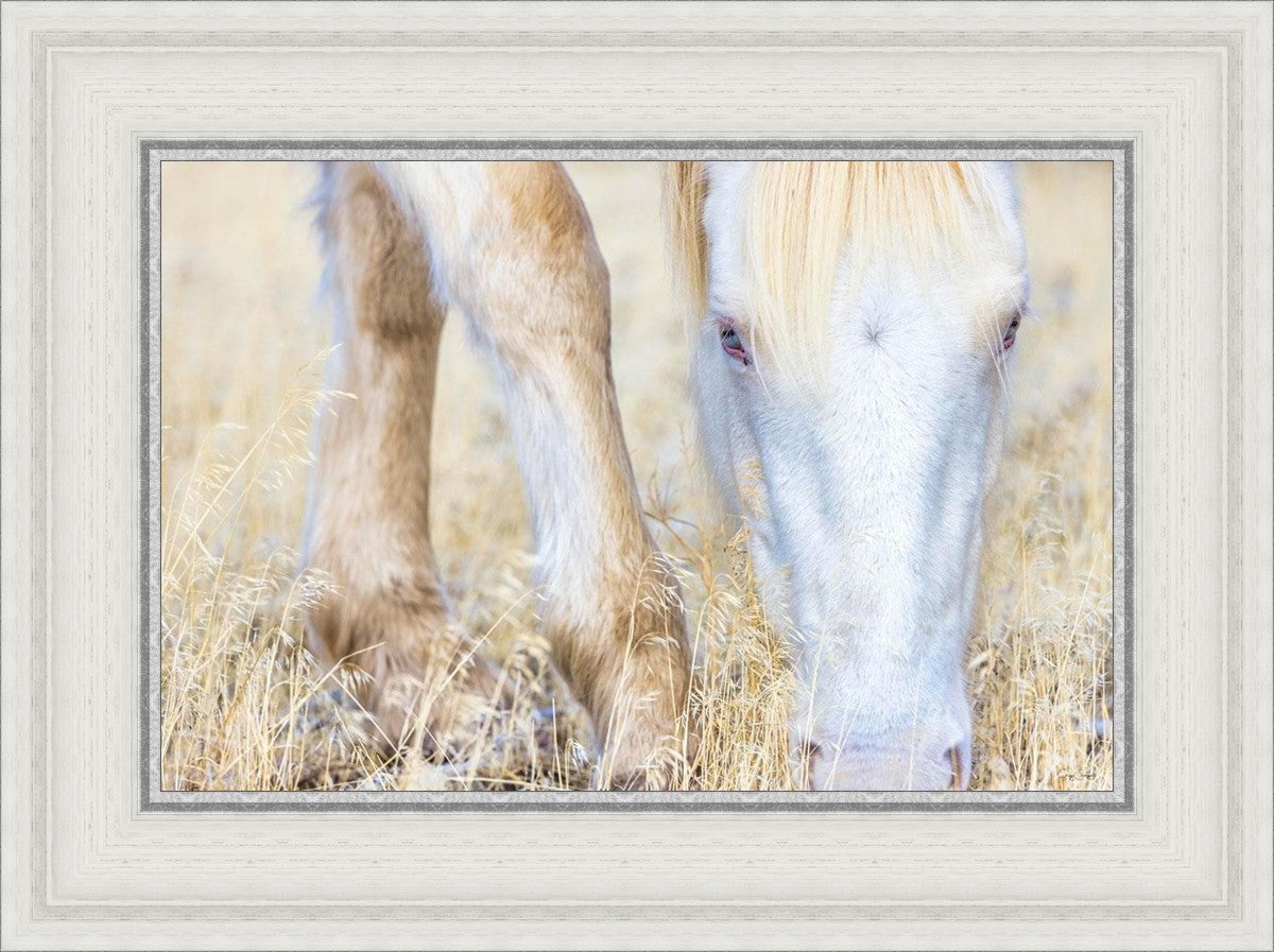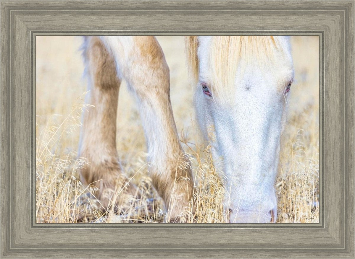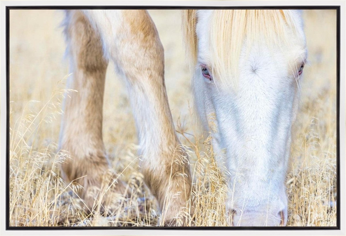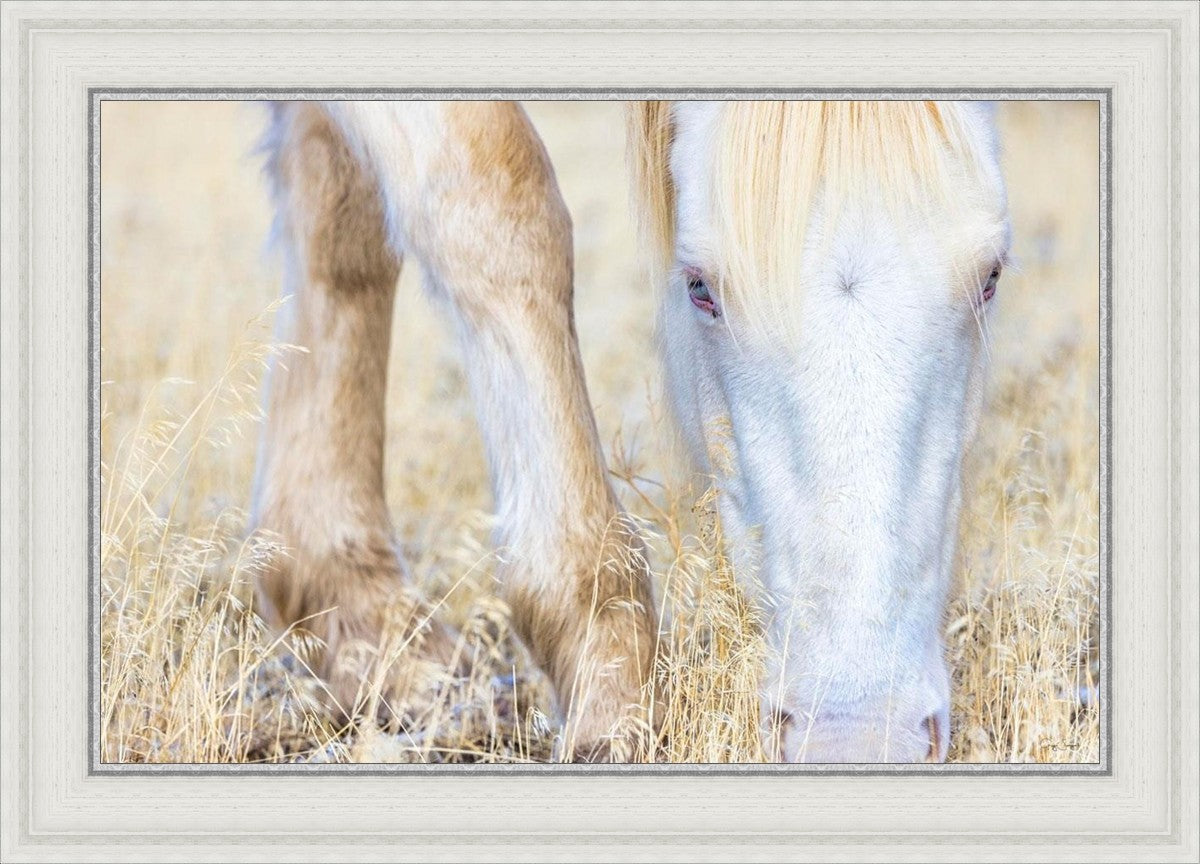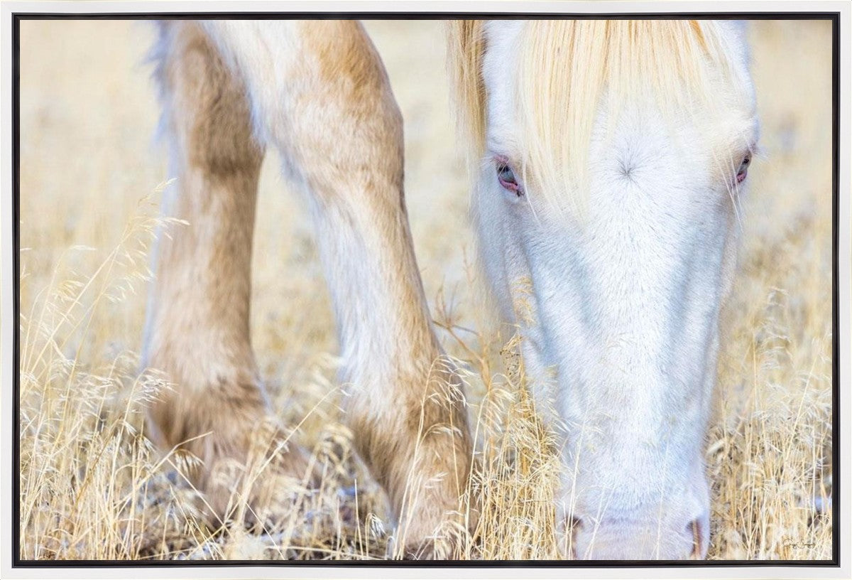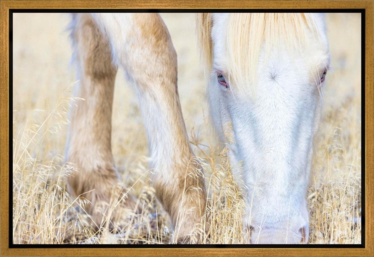 Low angle shot of a wild horse trying to get the last of the dry summer grass.