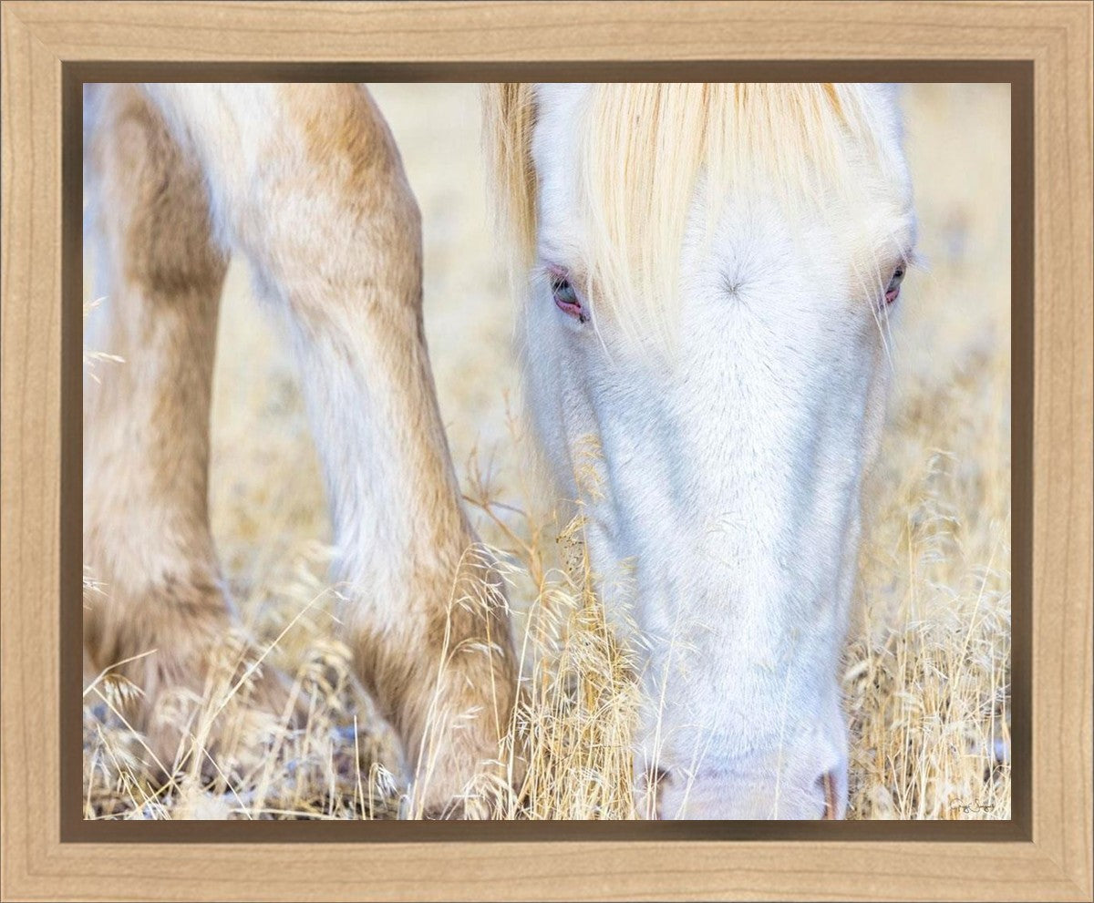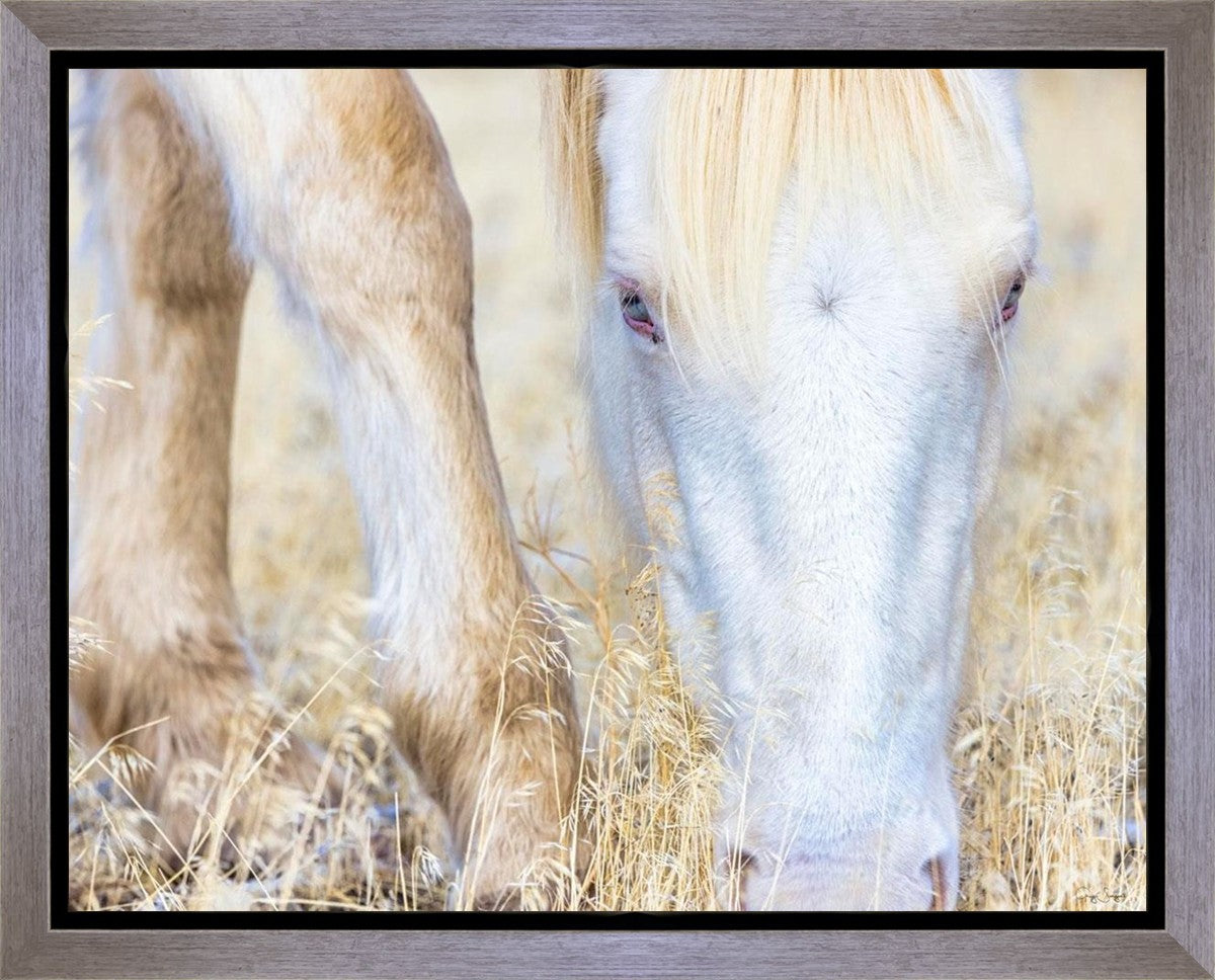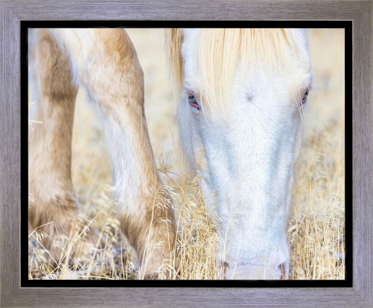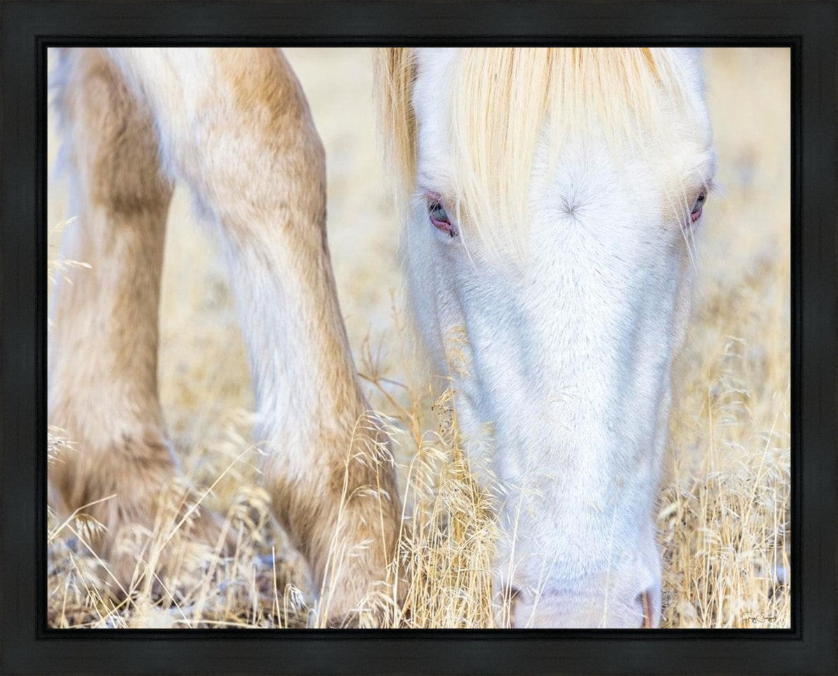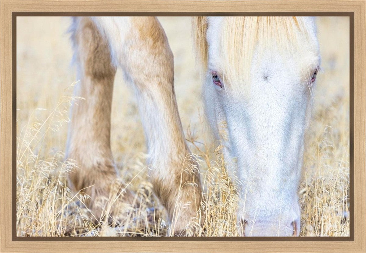 Low angle shot of a wild horse trying to get the last of the dry summer grass.