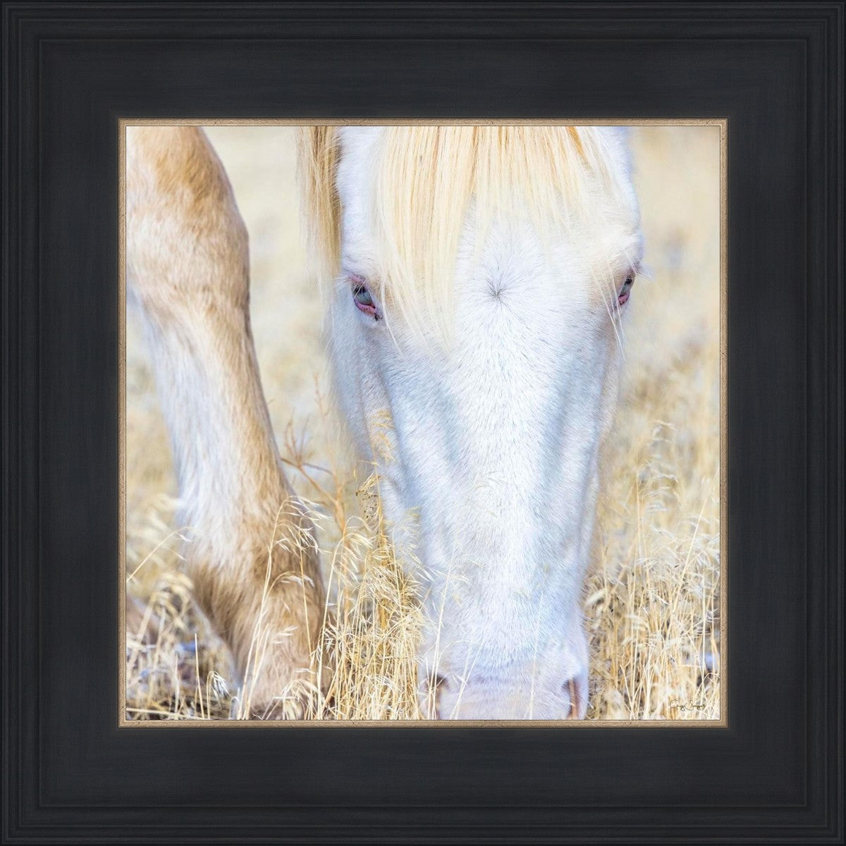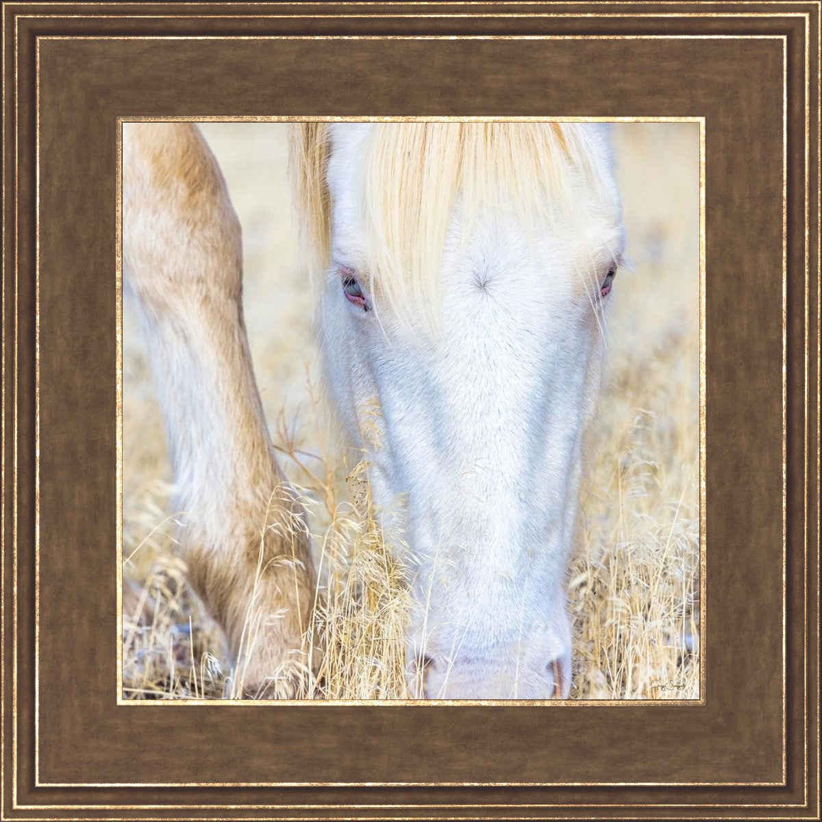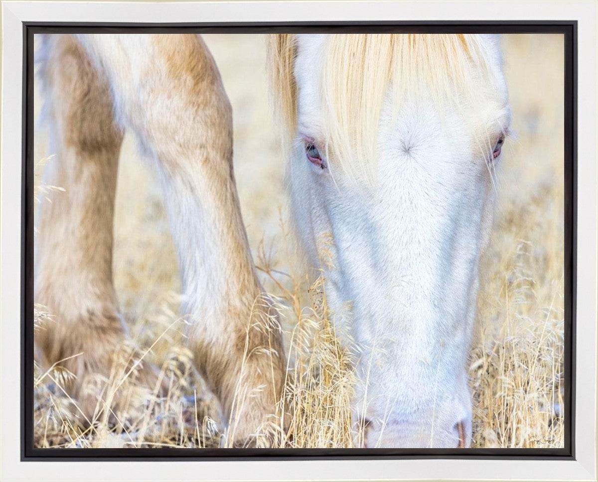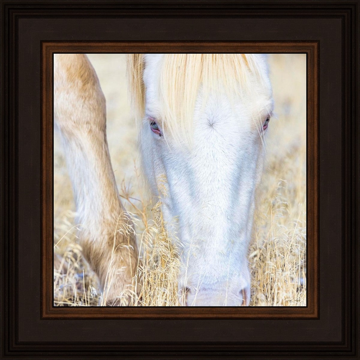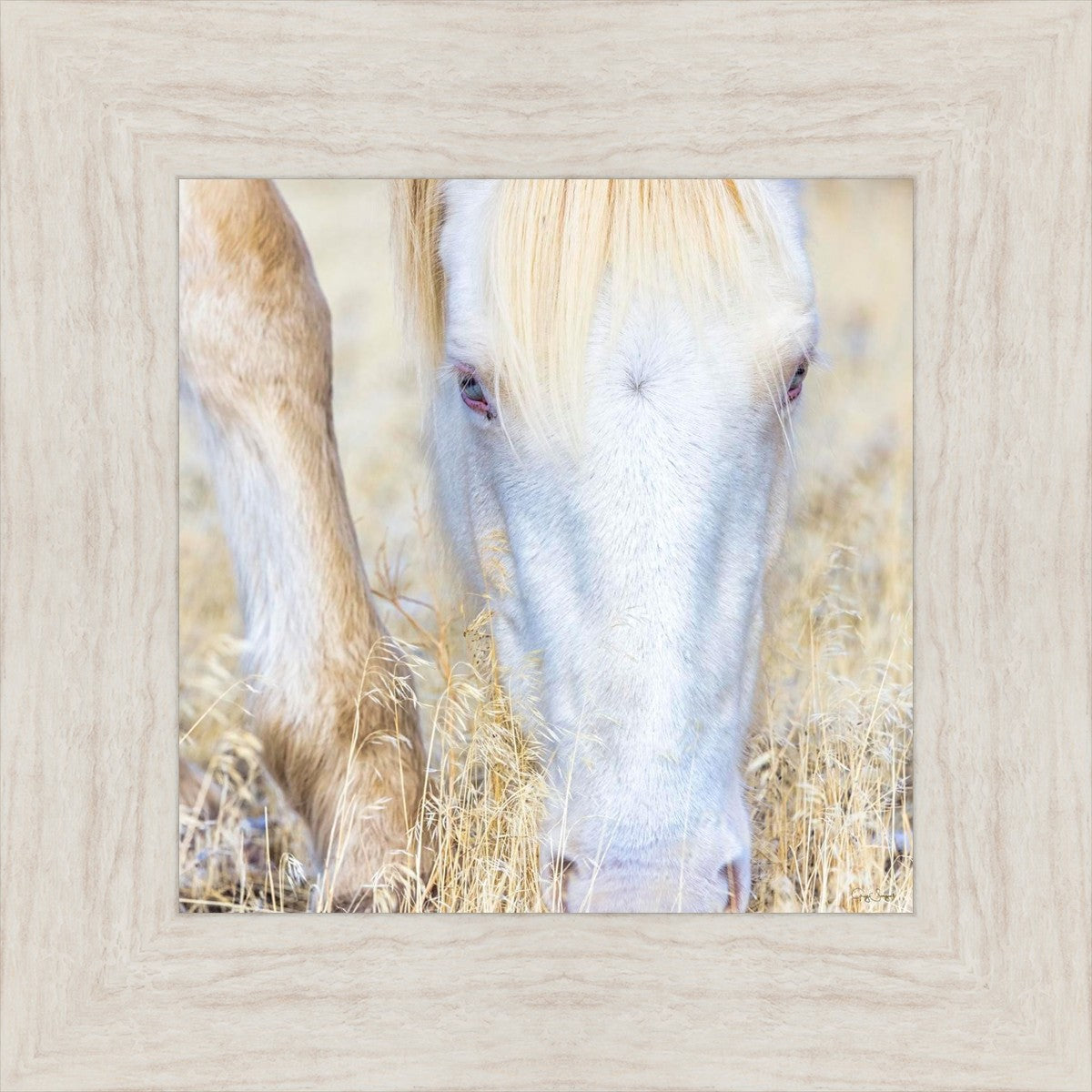 Low angle shot of a wild horse trying to get the last of the dry summer grass.