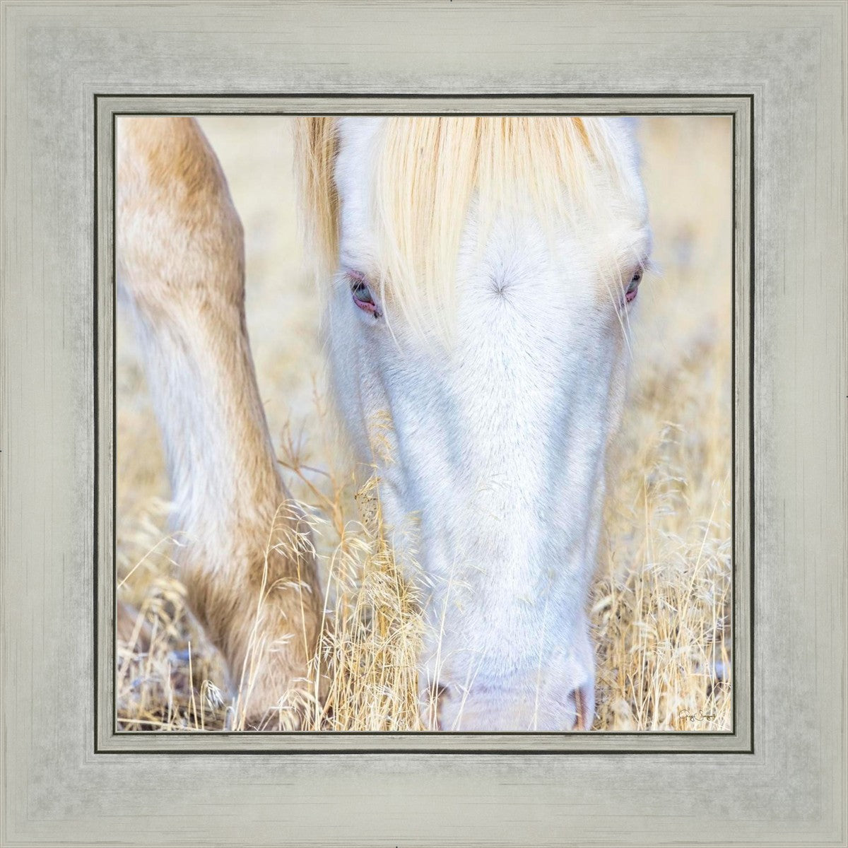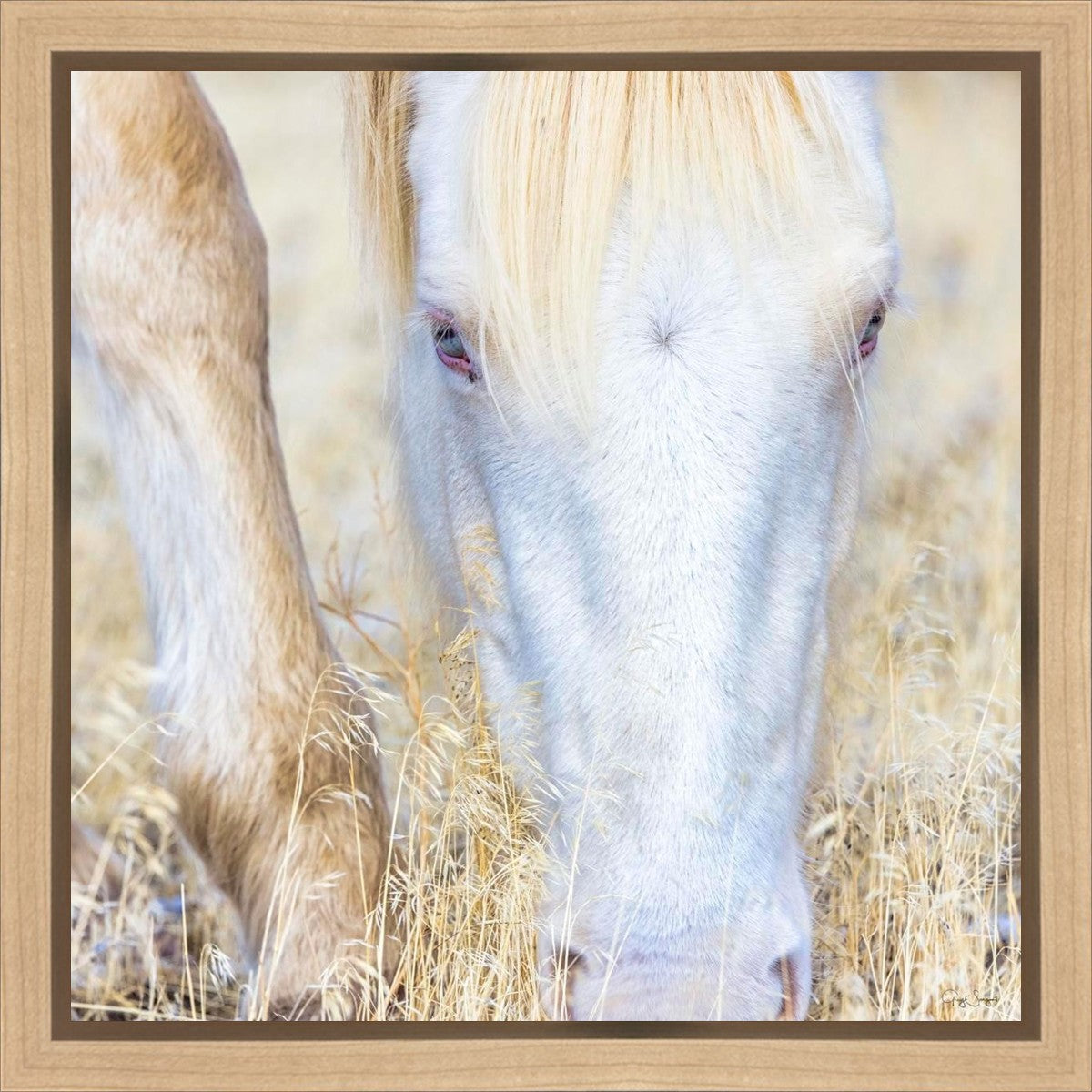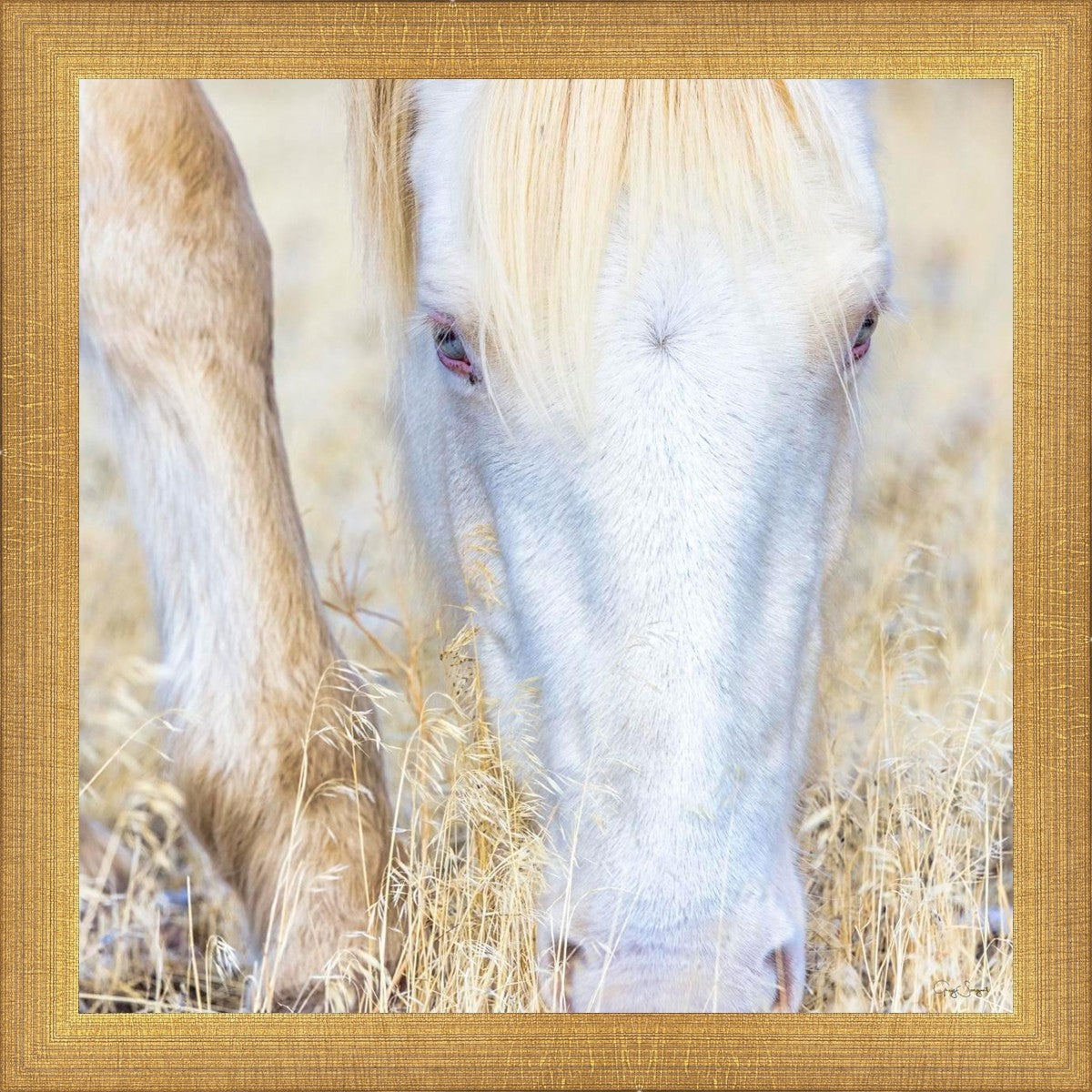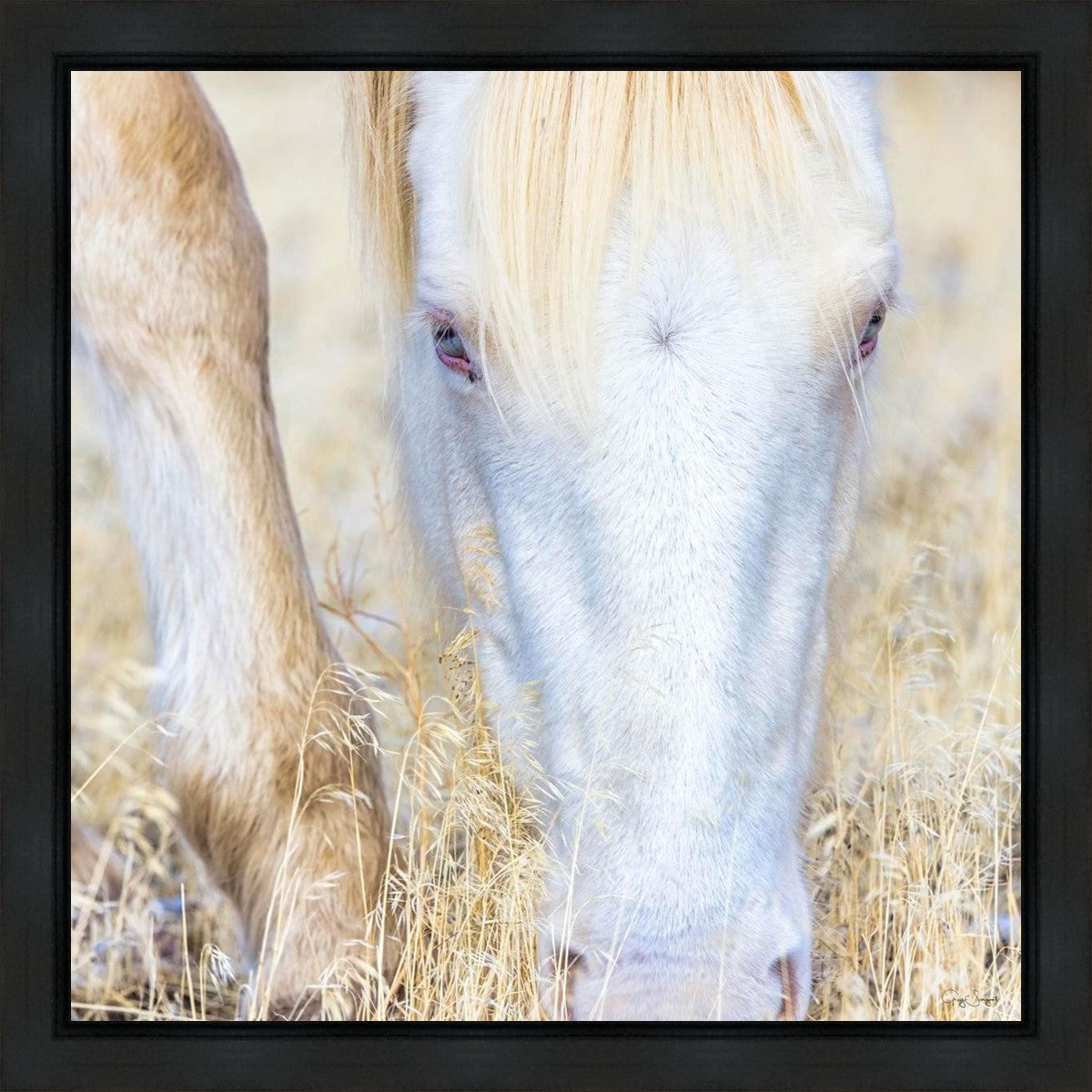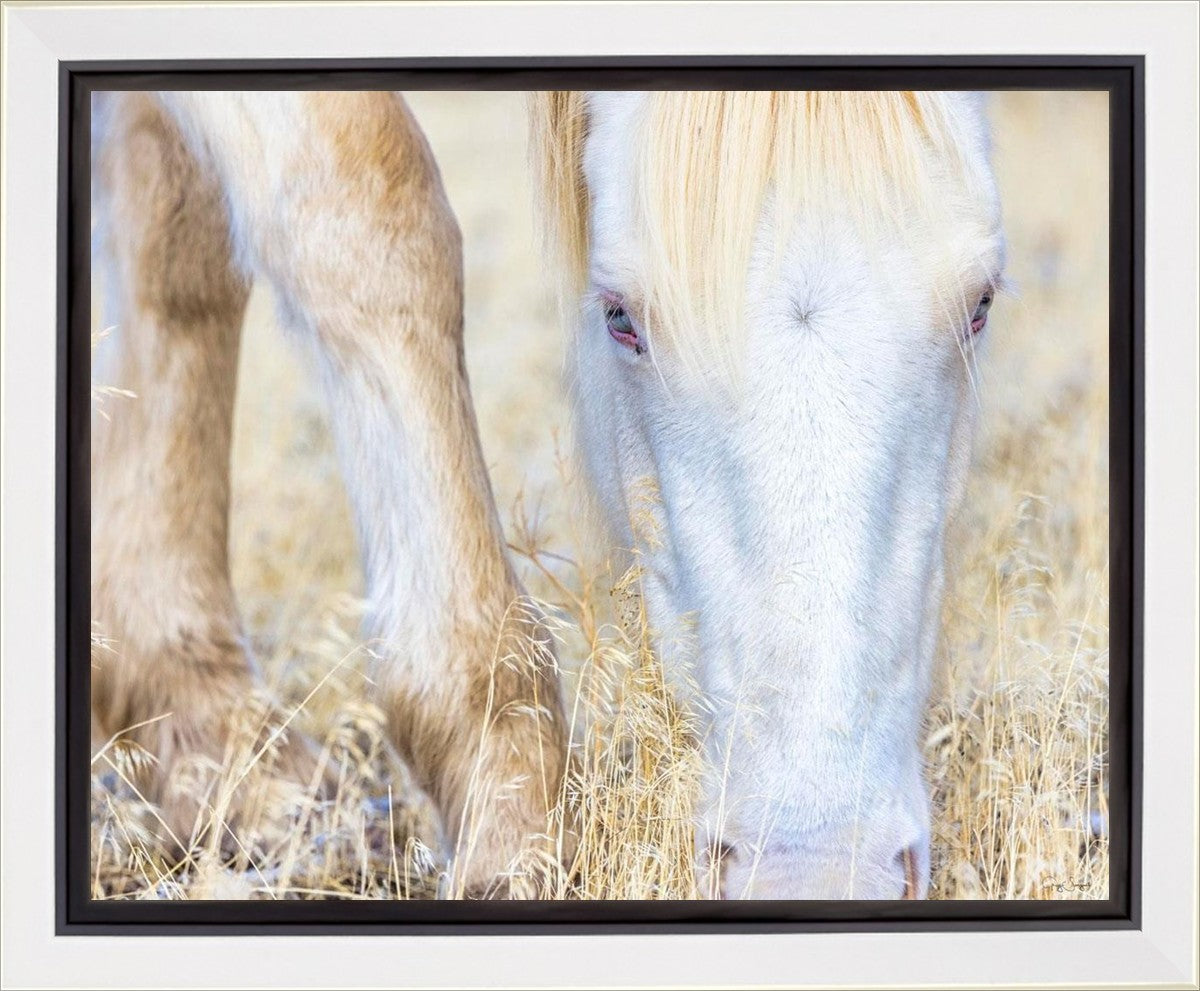 Low angle shot of a wild horse trying to get the last of the dry summer grass.