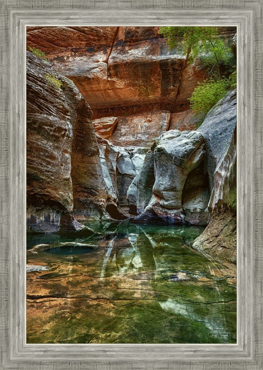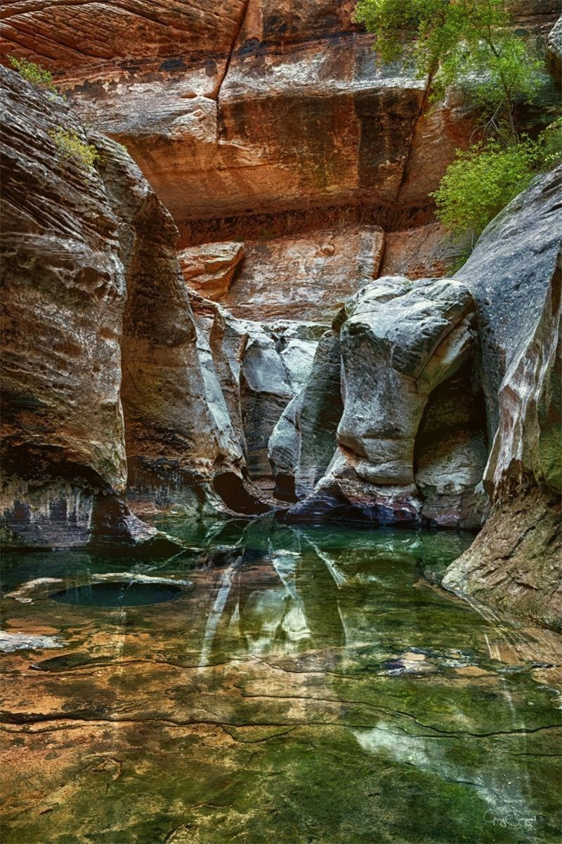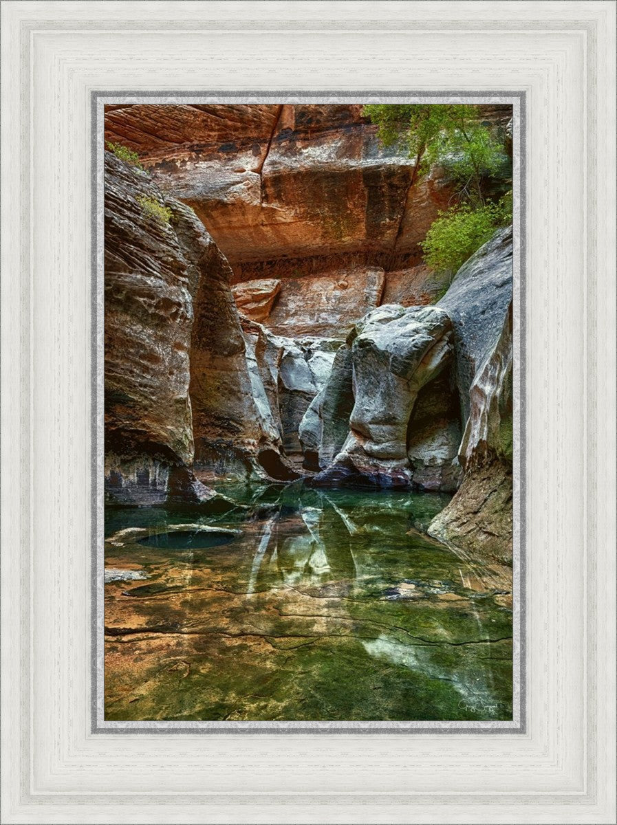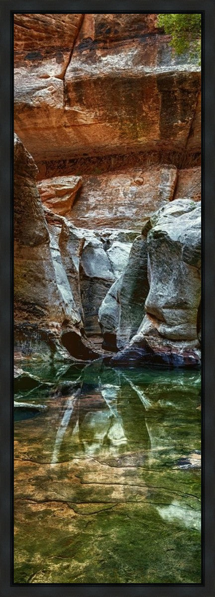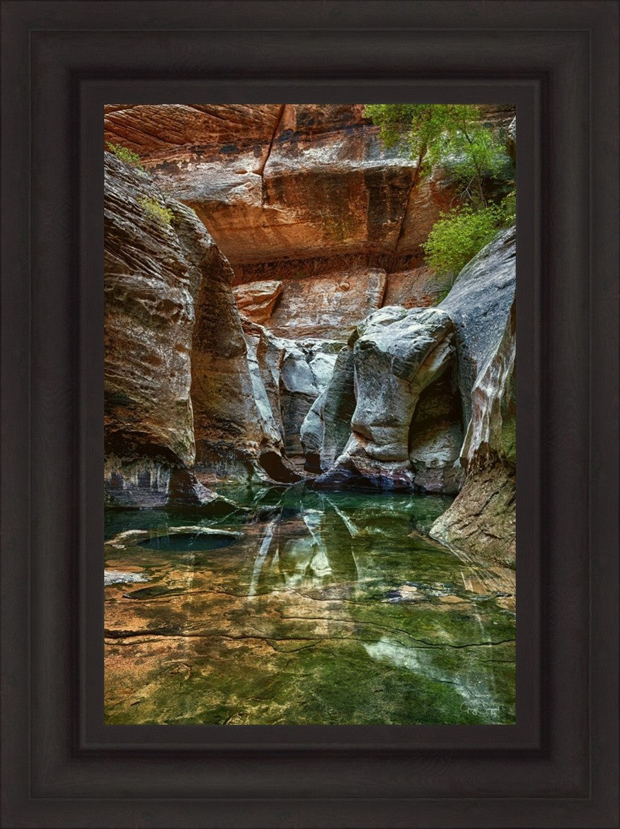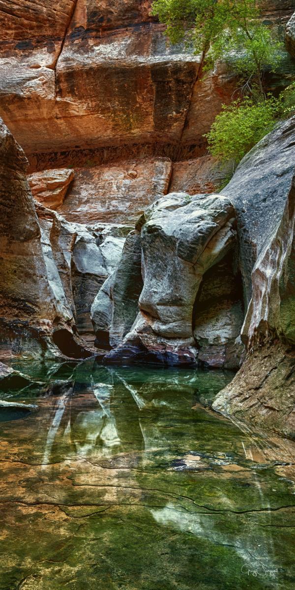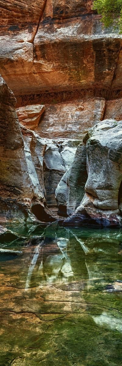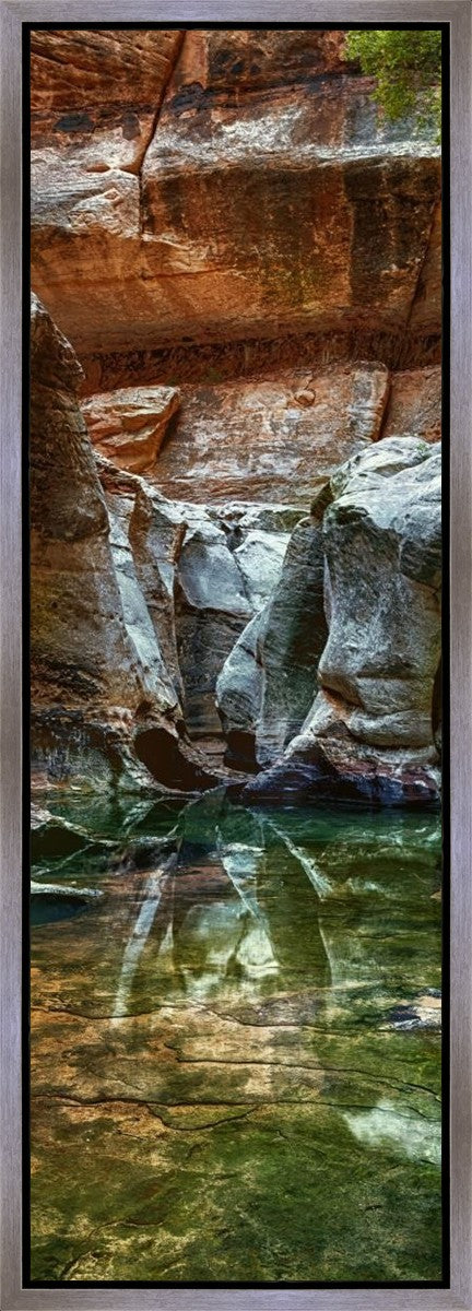 The canyon comes to and end, the water is calm and provides a perfect reflection deep inside of Zions Wilderness Area.