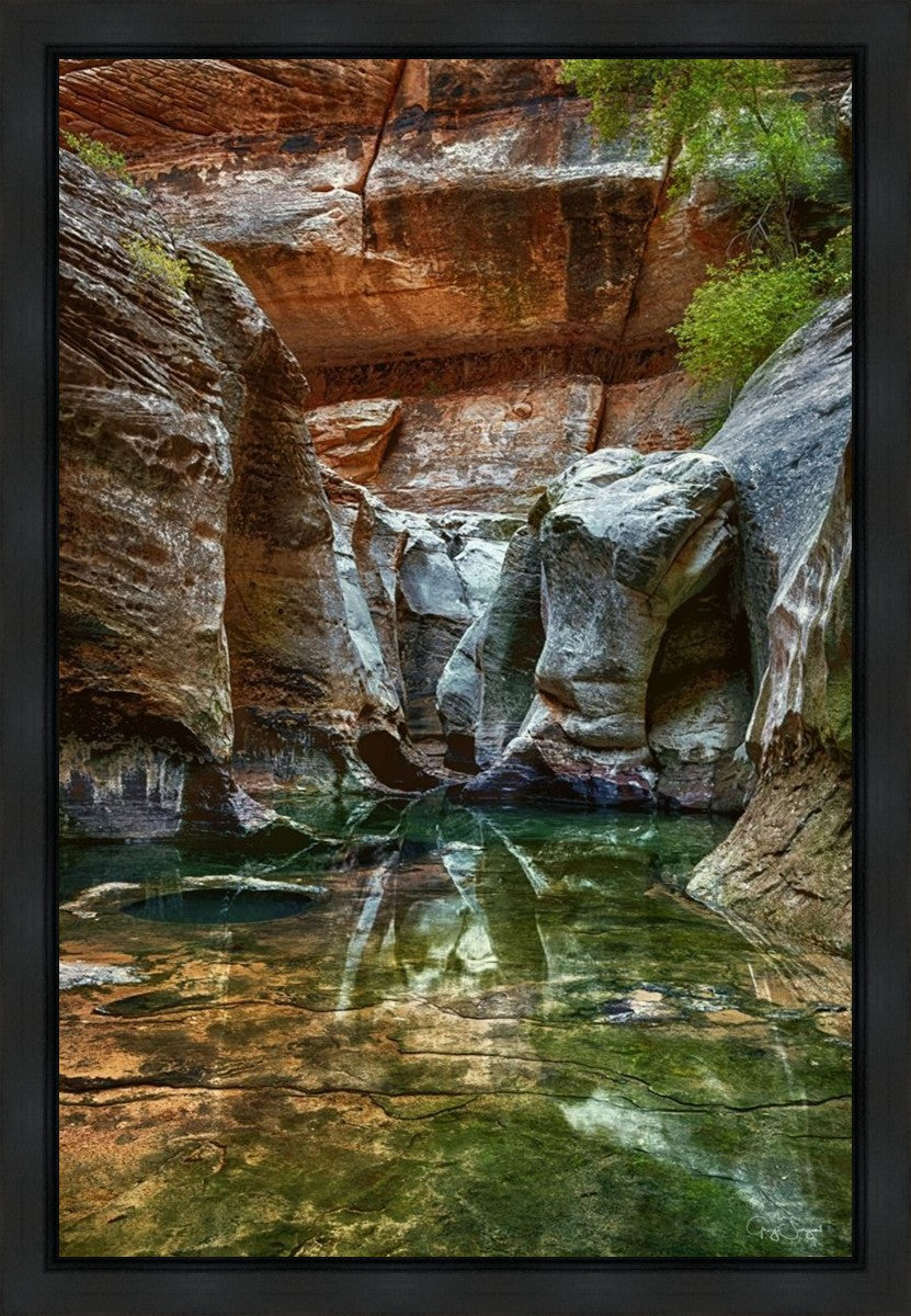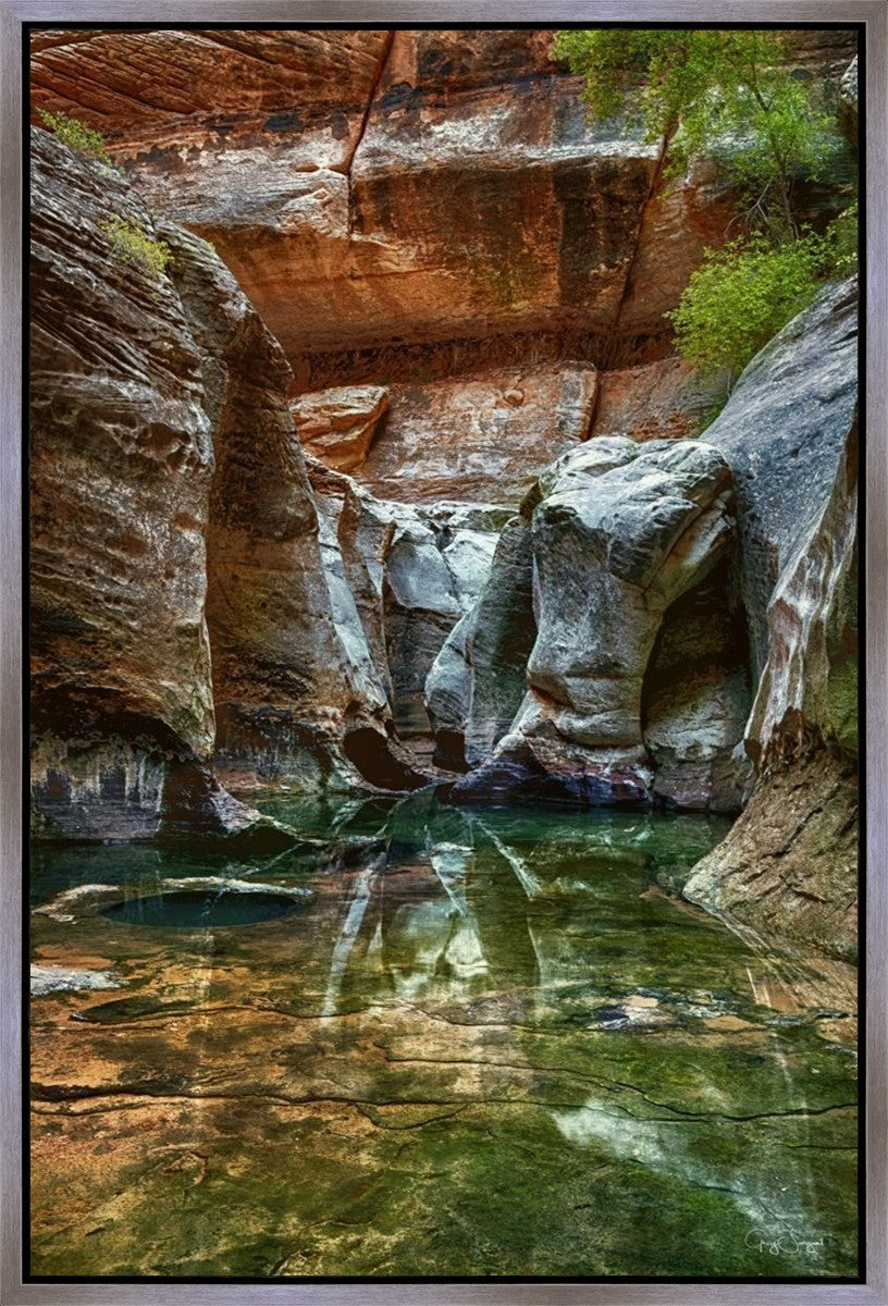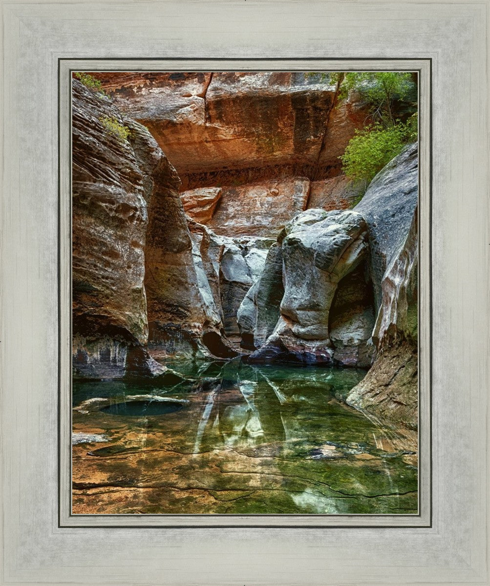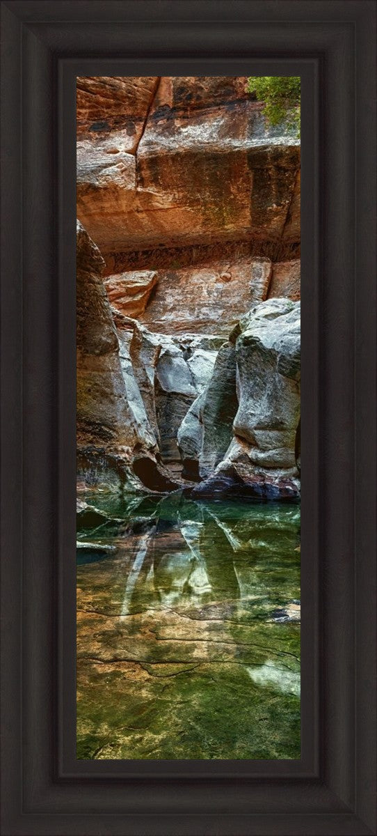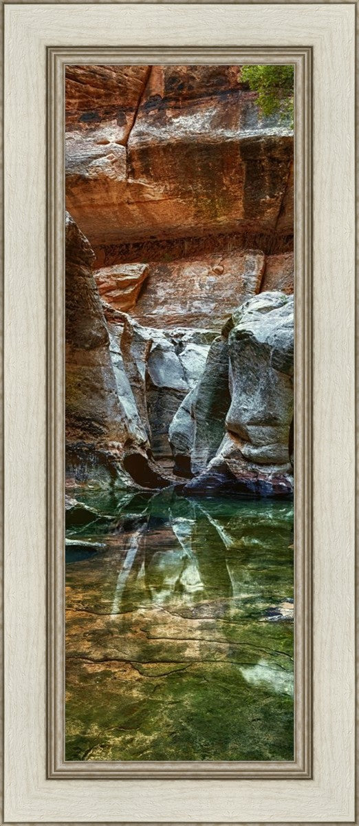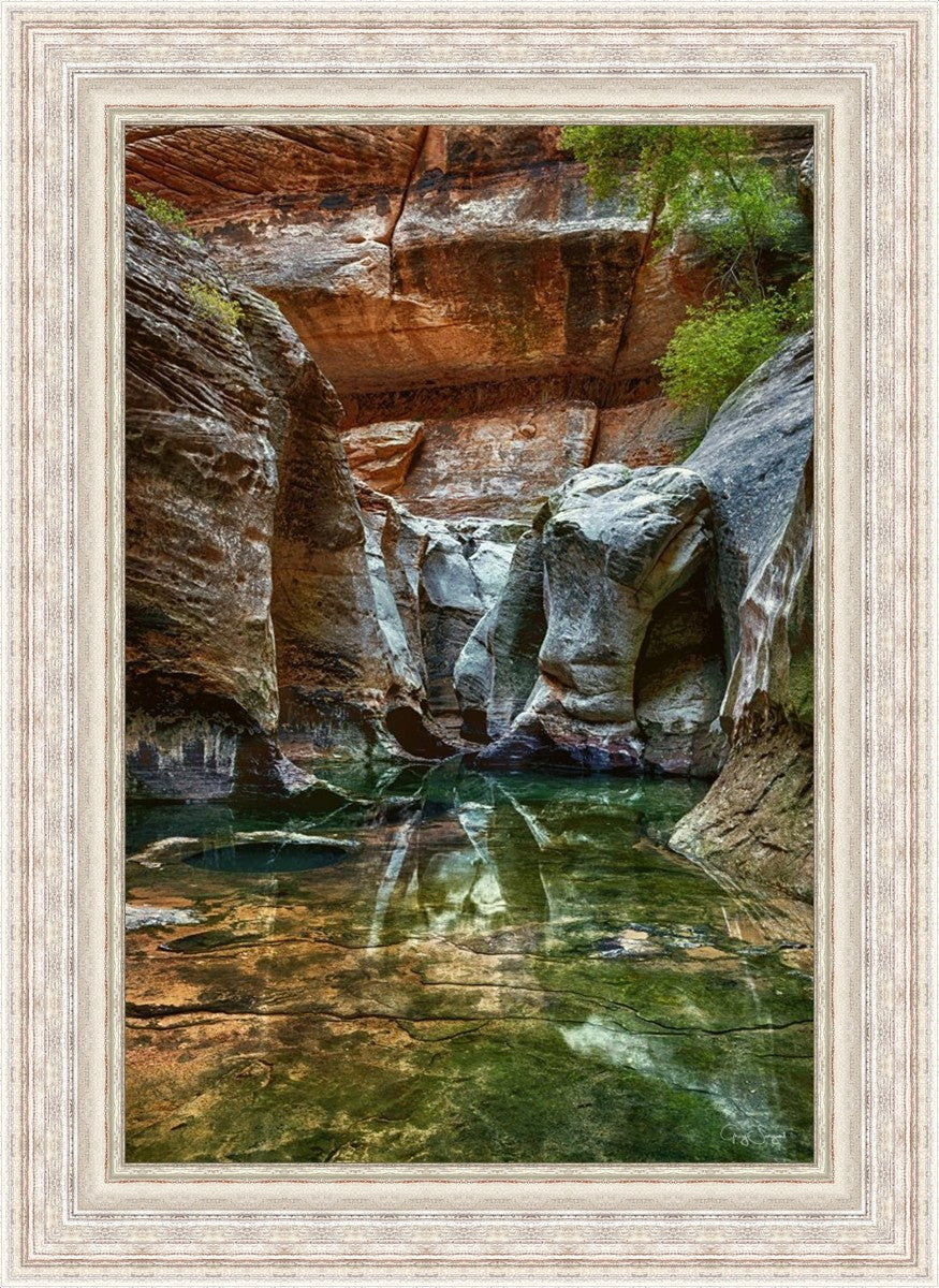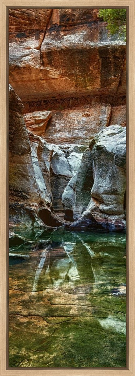 The canyon comes to and end, the water is calm and provides a perfect reflection deep inside of Zions Wilderness Area.