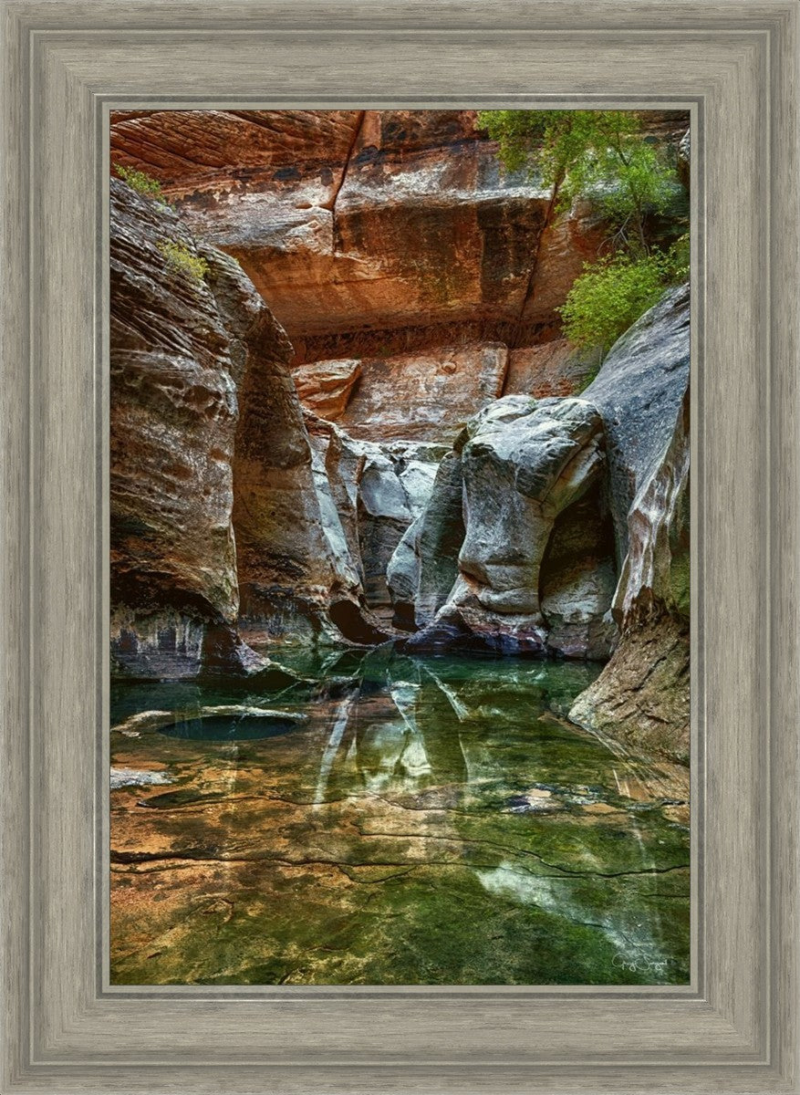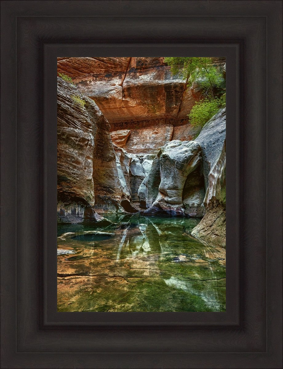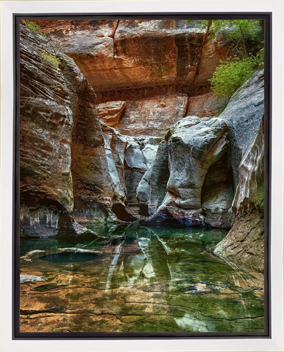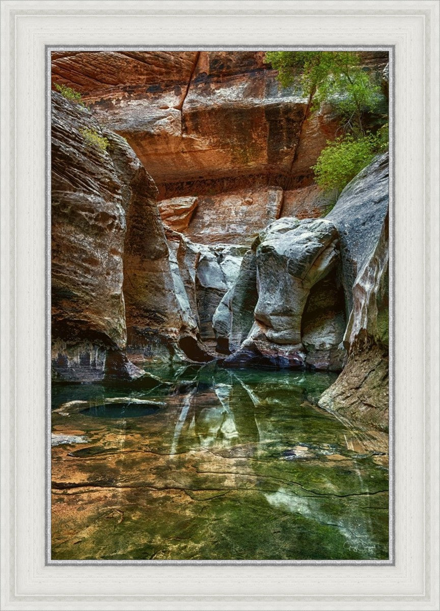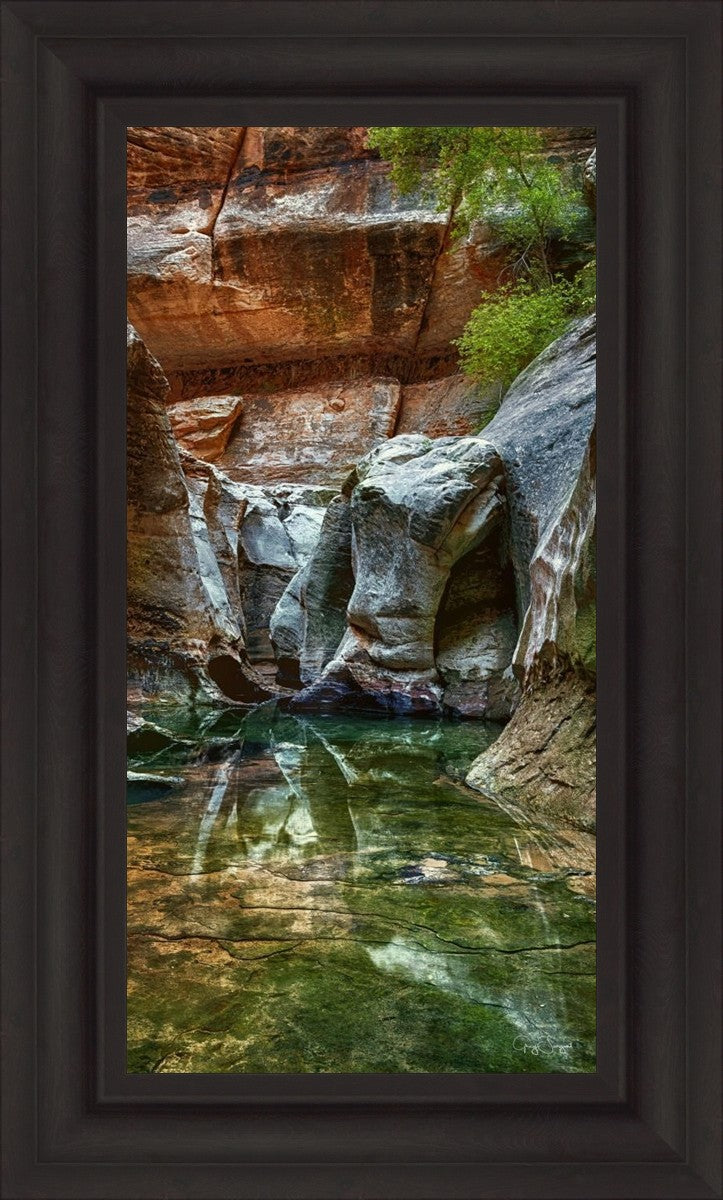 The canyon comes to and end, the water is calm and provides a perfect reflection deep inside of Zions Wilderness Area.