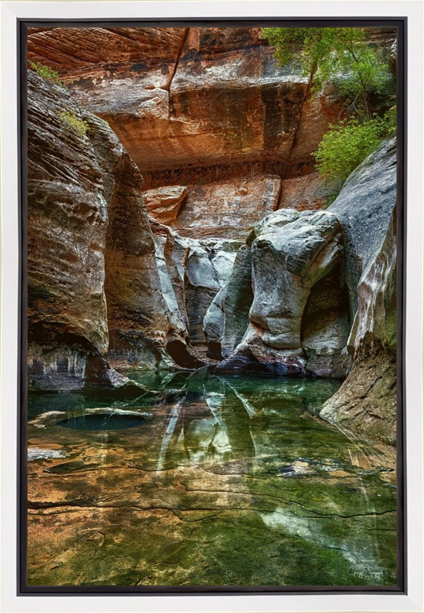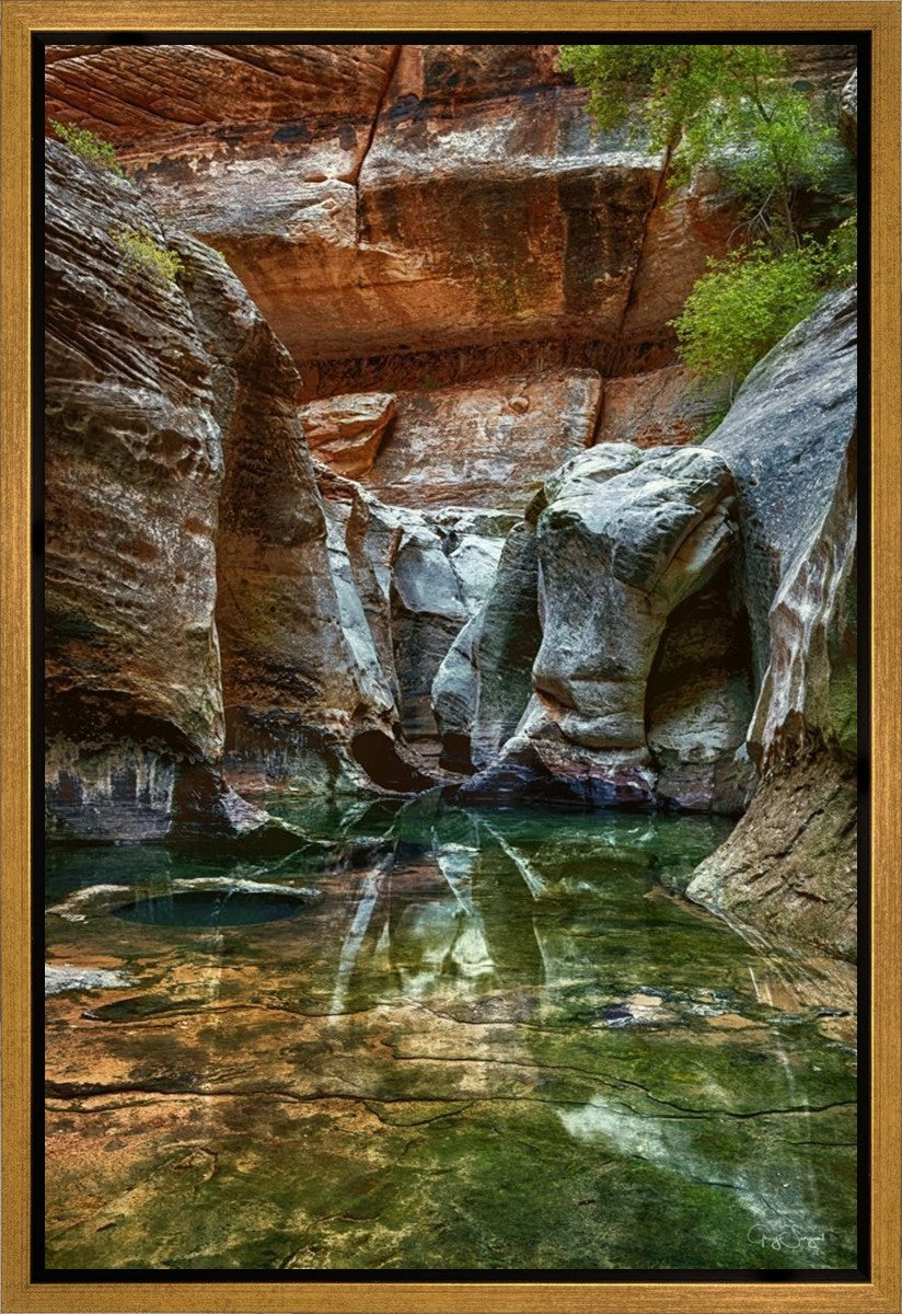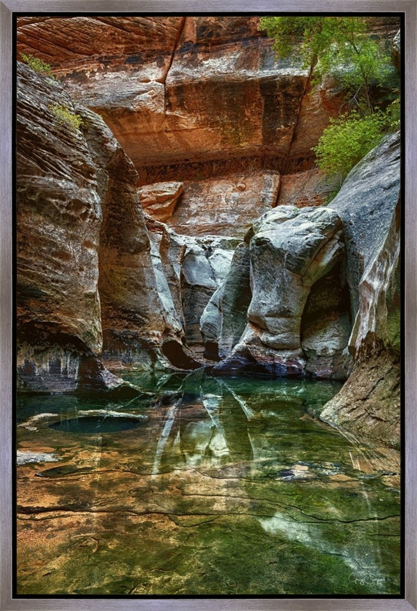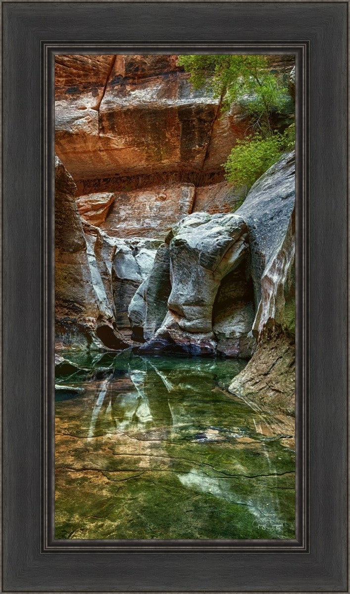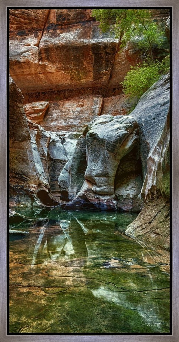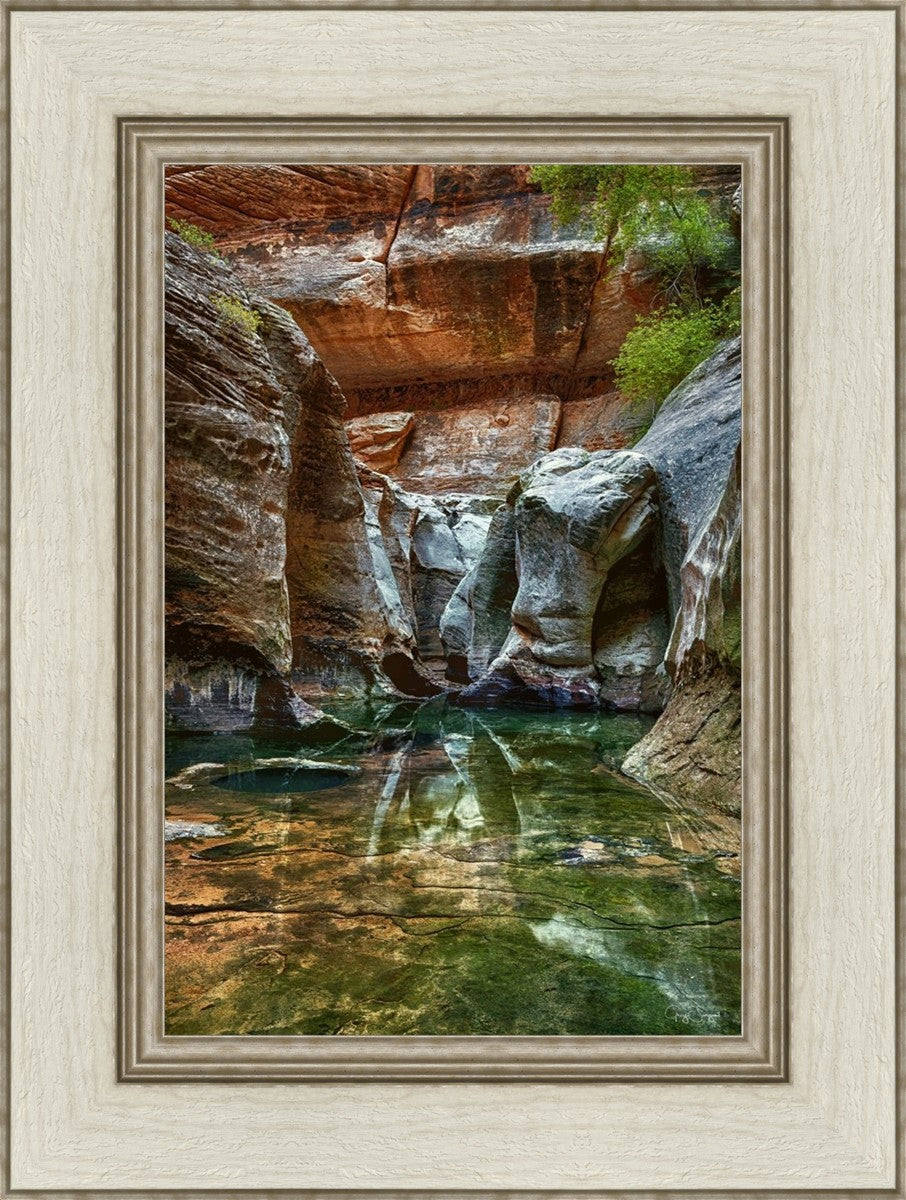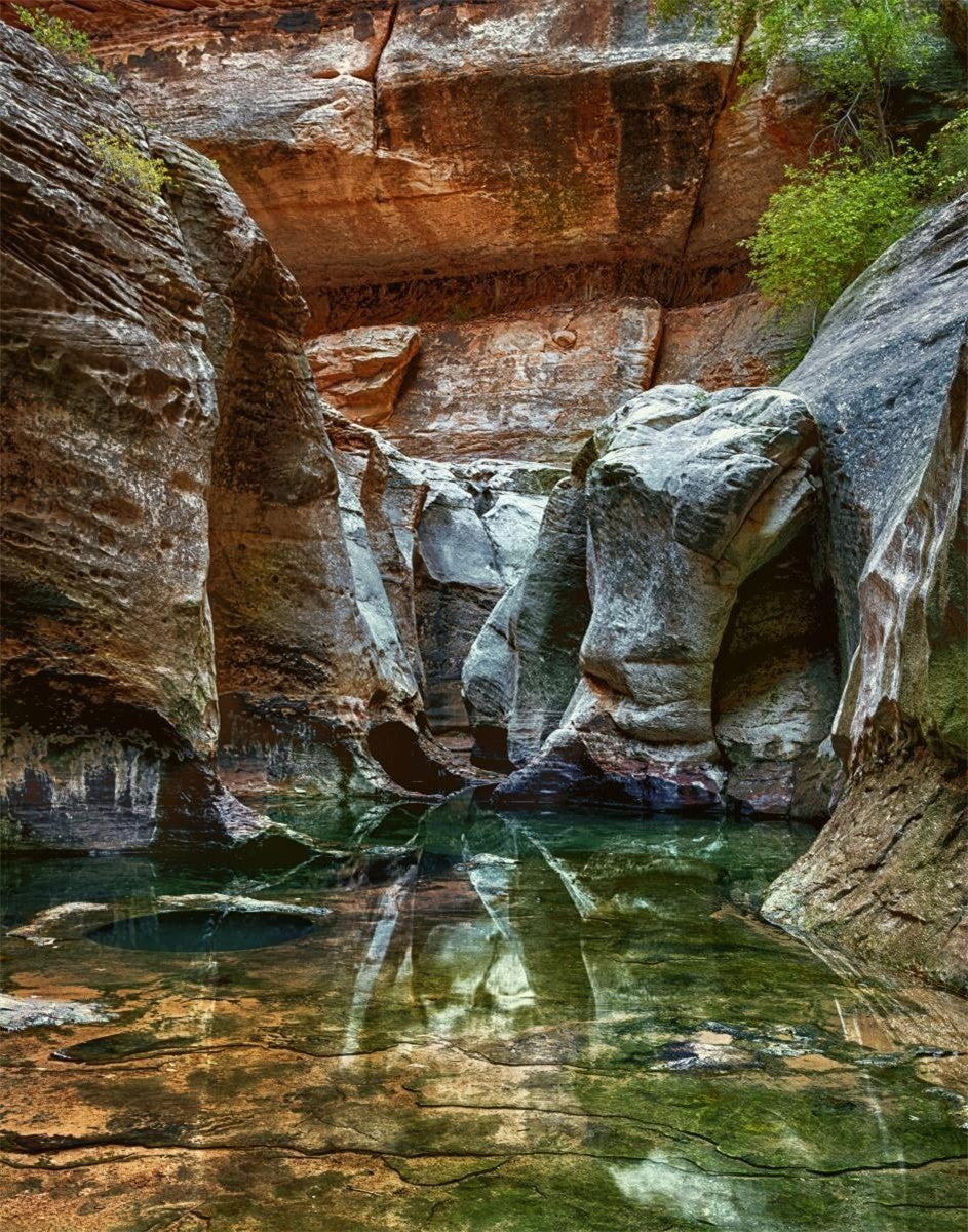 The canyon comes to and end, the water is calm and provides a perfect reflection deep inside of Zions Wilderness Area.