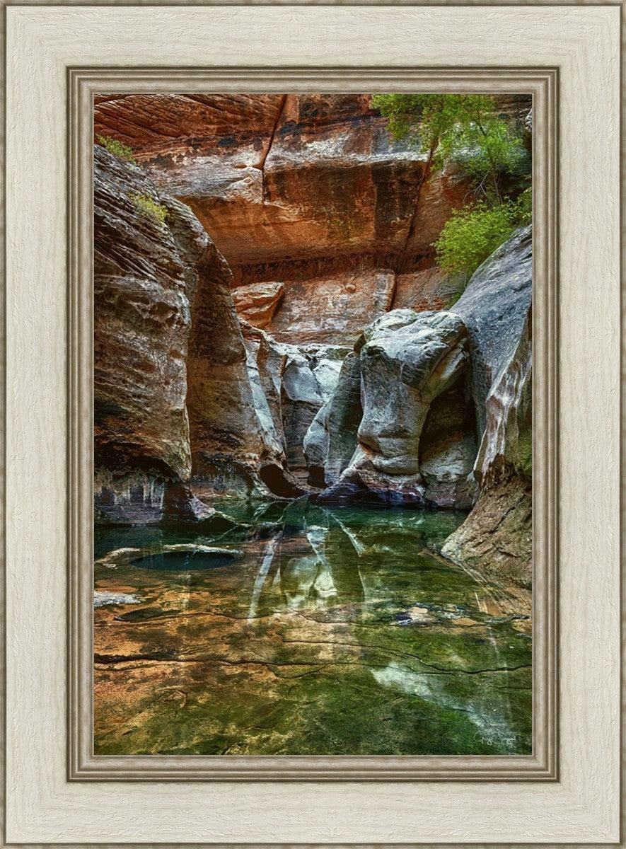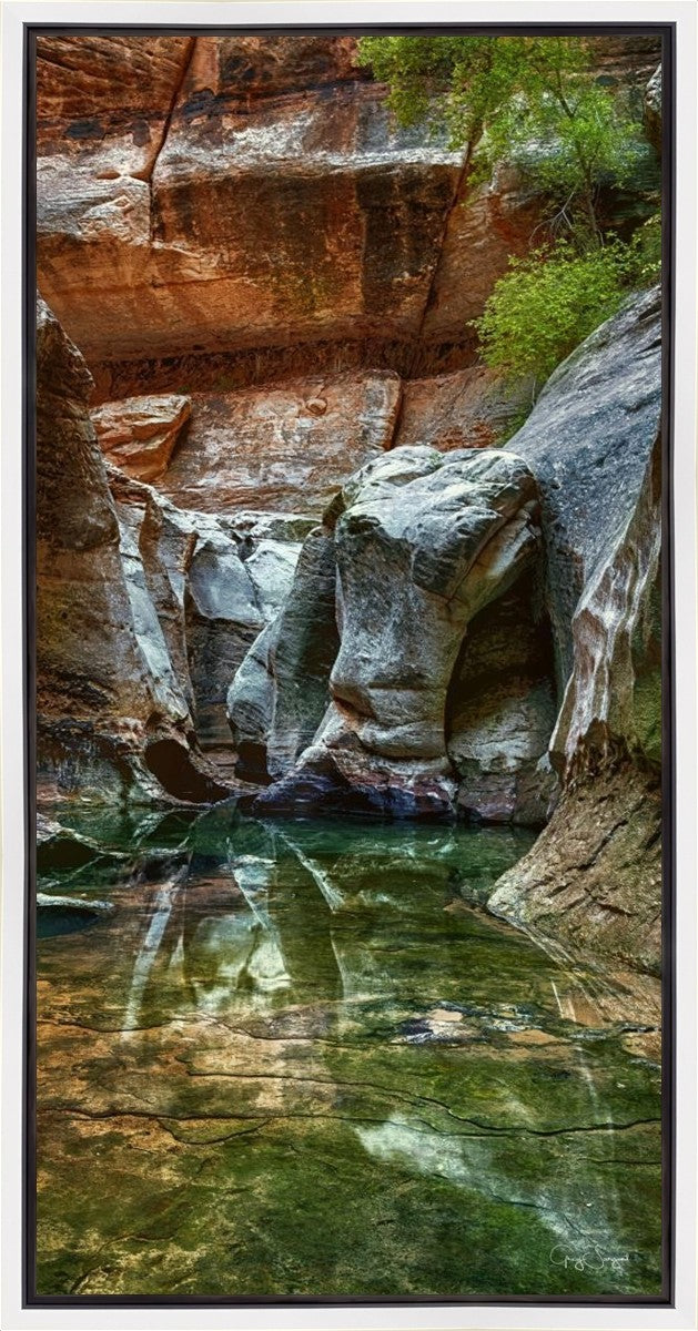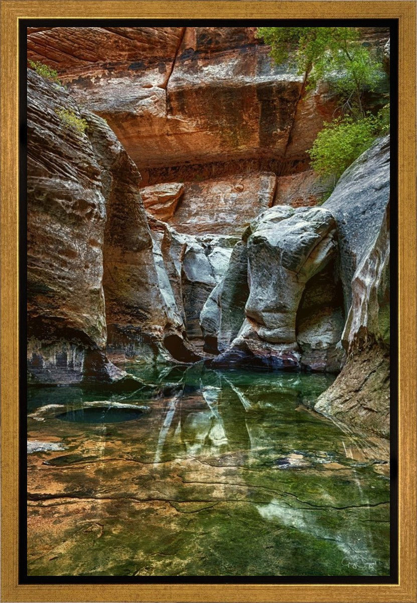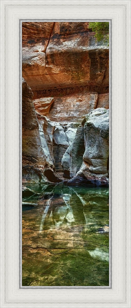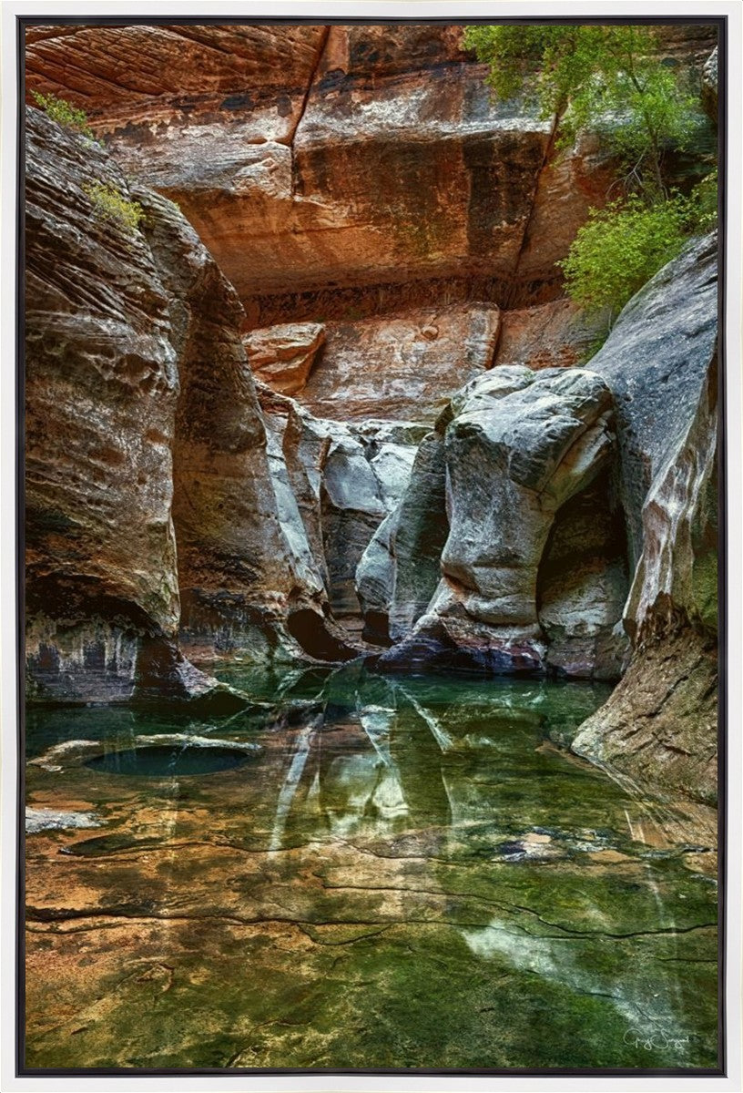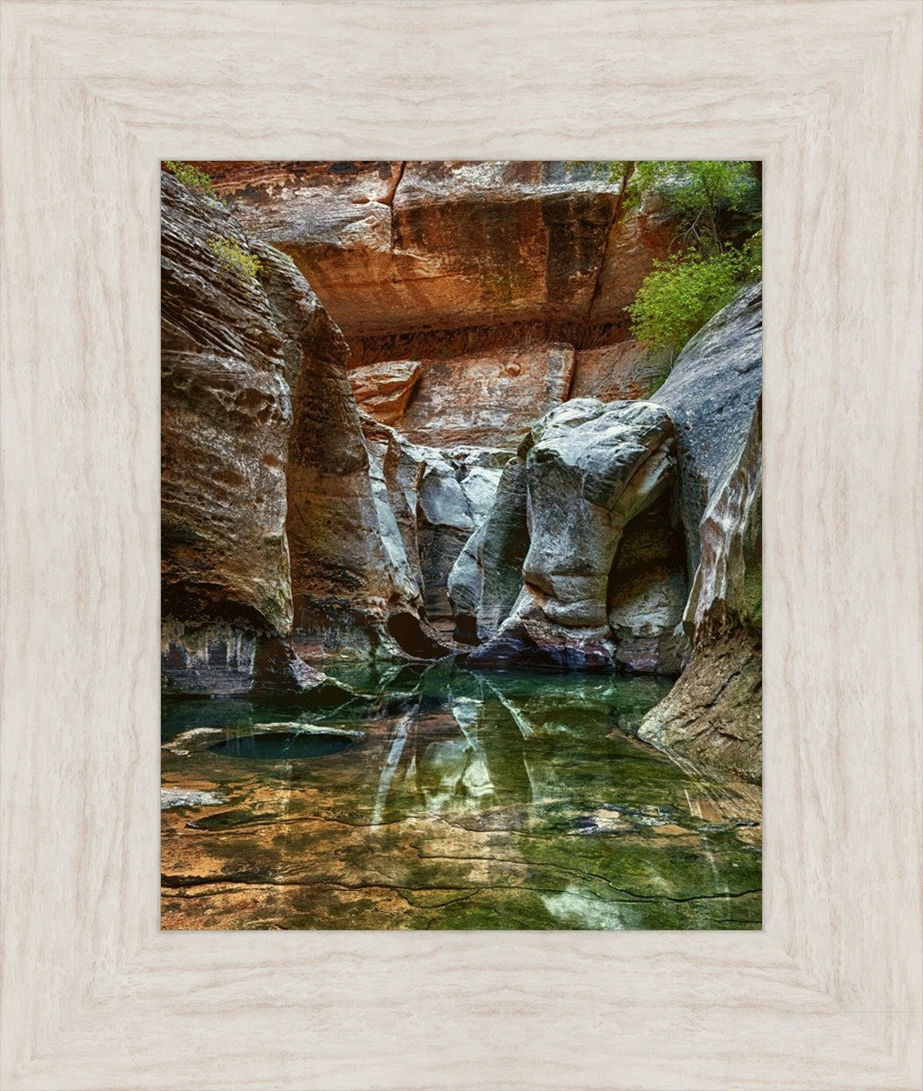The canyon comes to and end, the water is calm and provides a perfect reflection deep inside of Zions Wilderness Area.