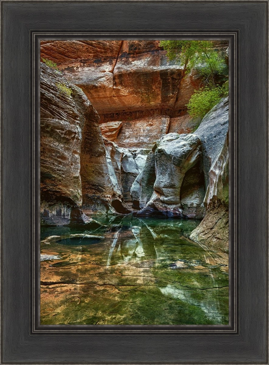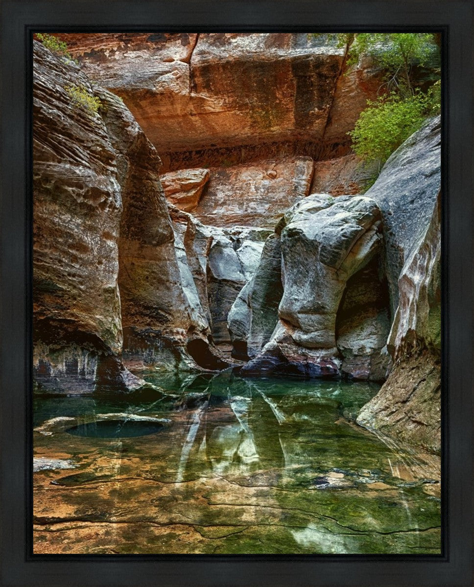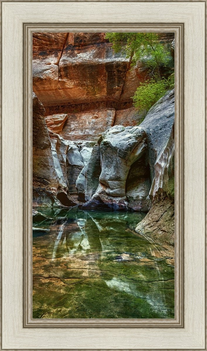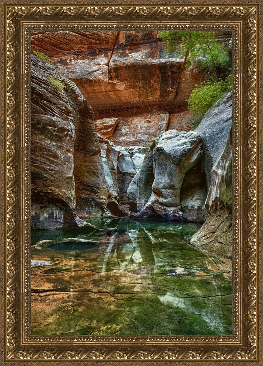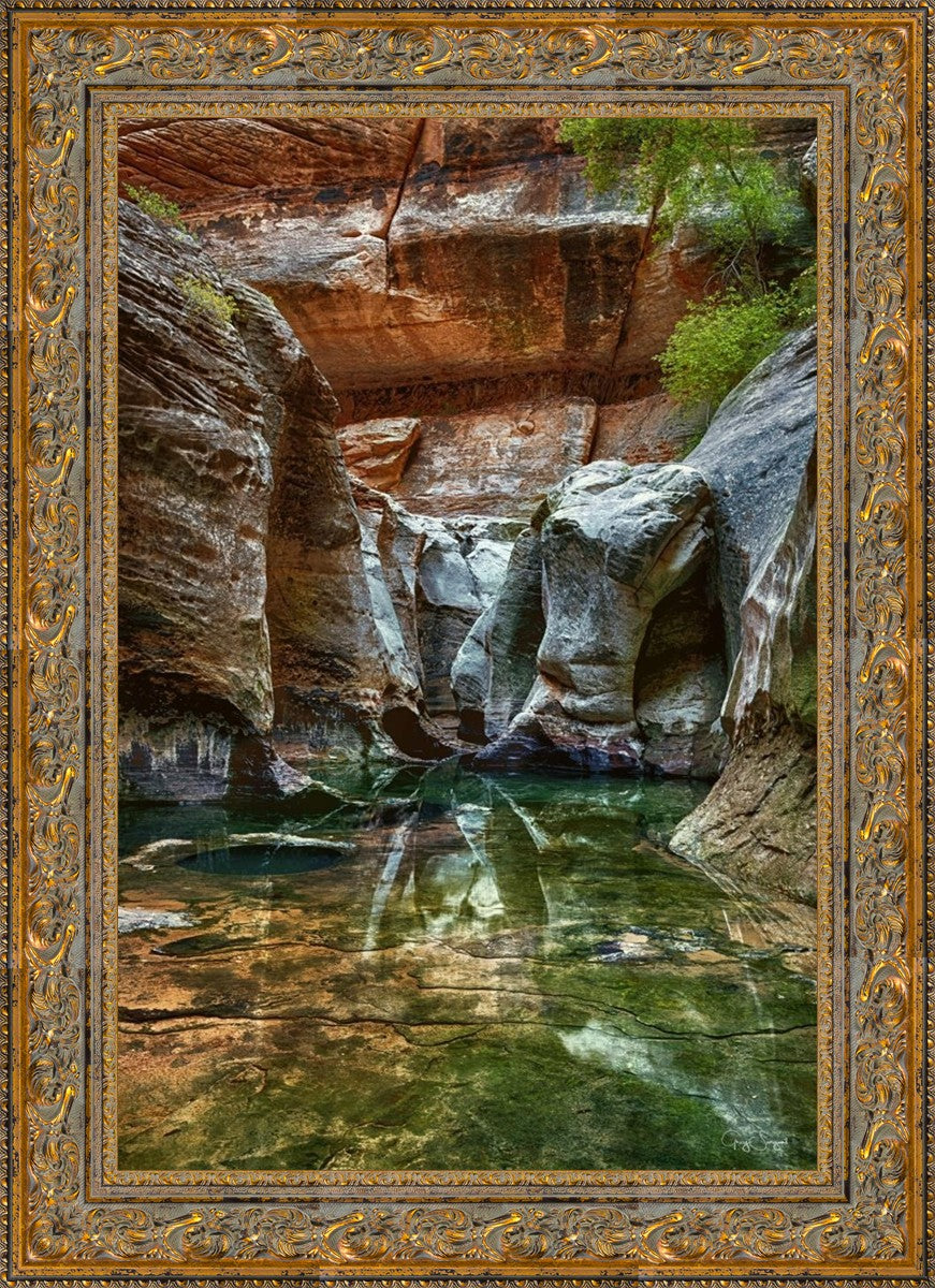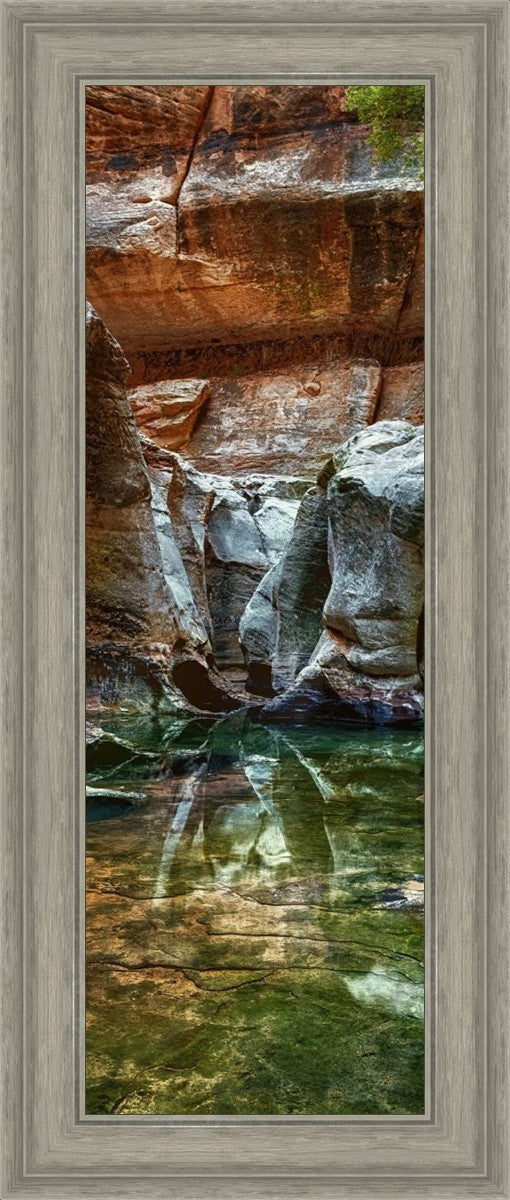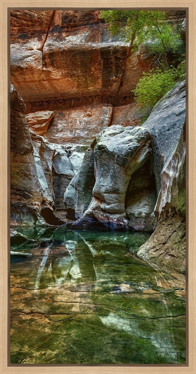 The canyon comes to and end, the water is calm and provides a perfect reflection deep inside of Zions Wilderness Area.