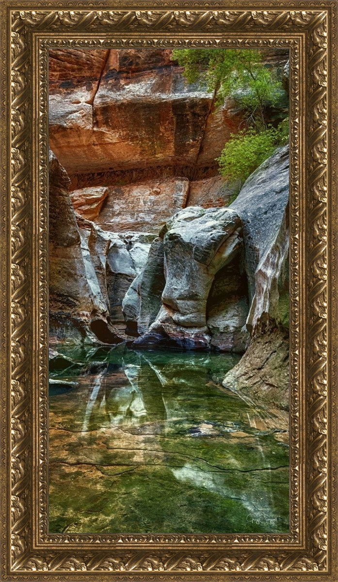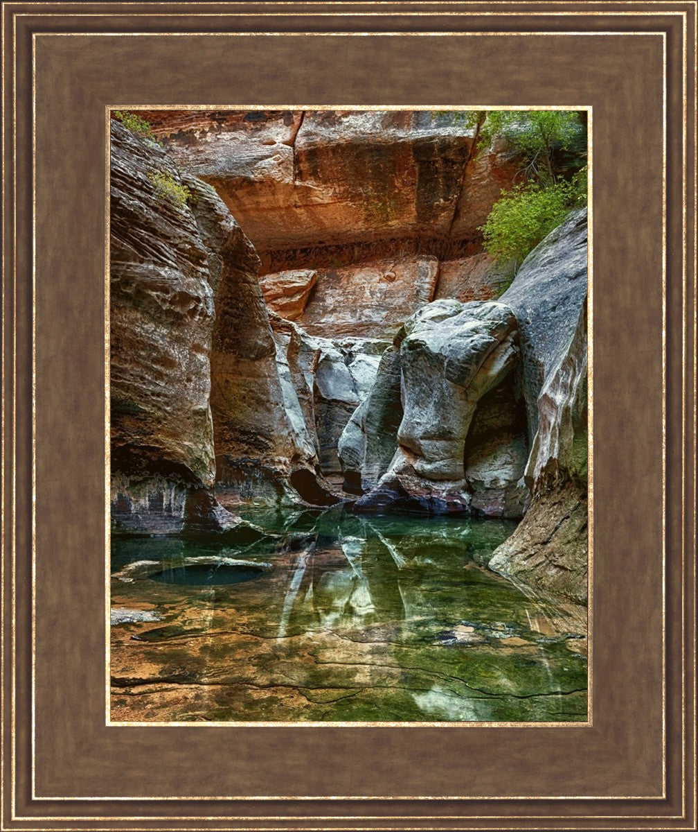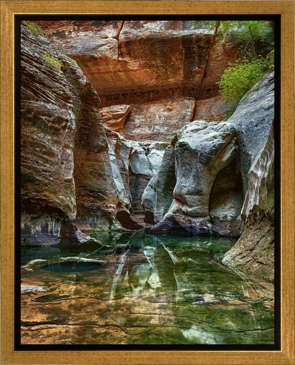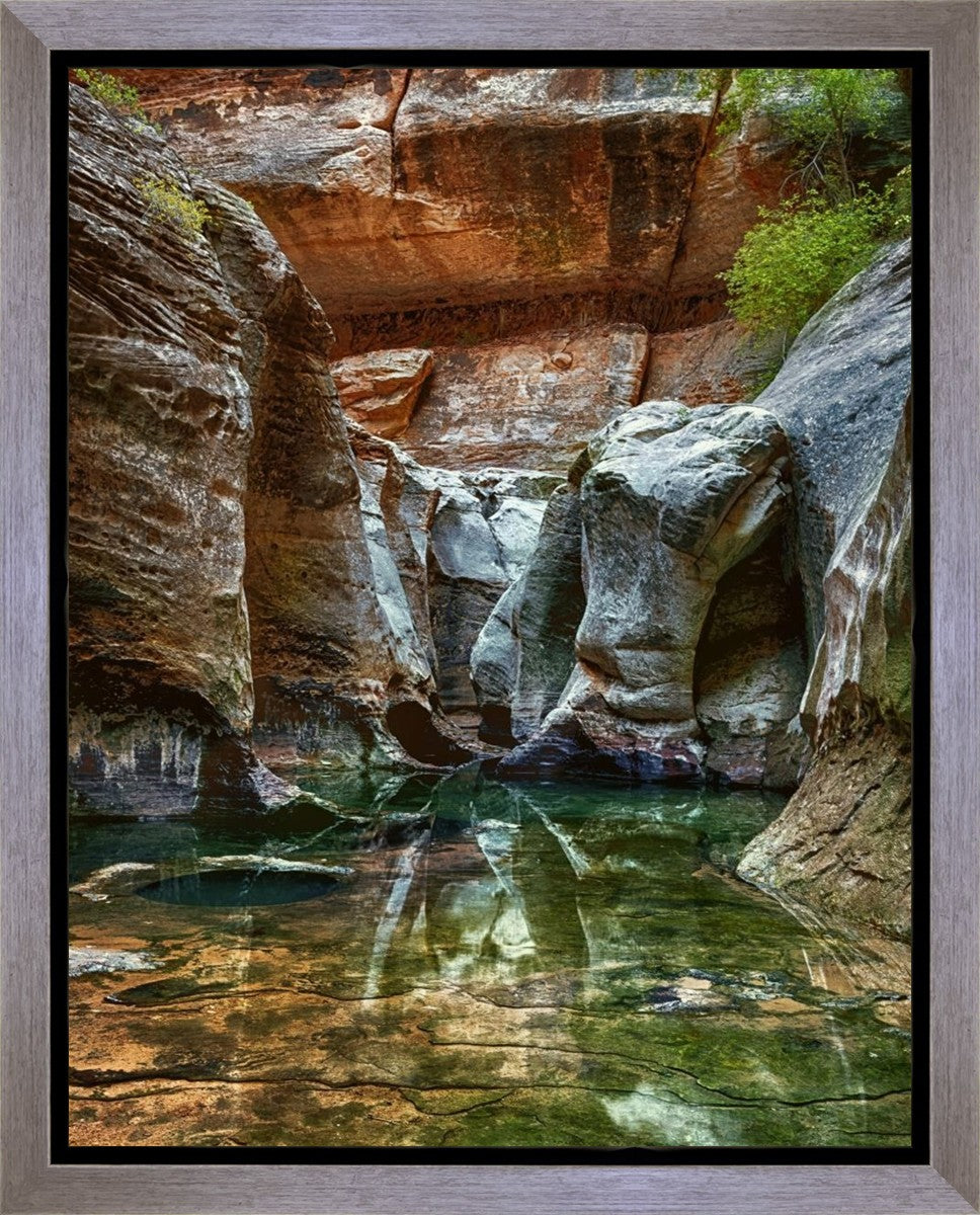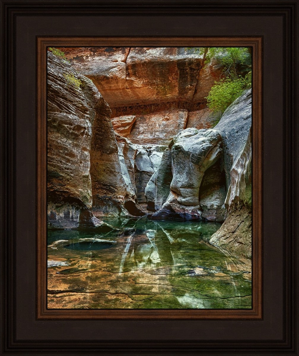 The canyon comes to and end, the water is calm and provides a perfect reflection deep inside of Zions Wilderness Area.