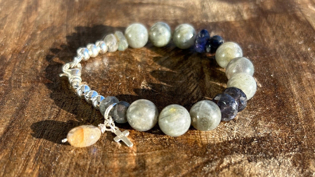 A Sterling Silver Cross and Labradorite Charm adorn three stone trinities of Labradorite separated by two sets of faceted purple Iolite, each side finished with a pair of faceted Labradorite. Two trinities of Sterling Silver Beads and a Sterling Silver Lobster Clasp complete the work.
