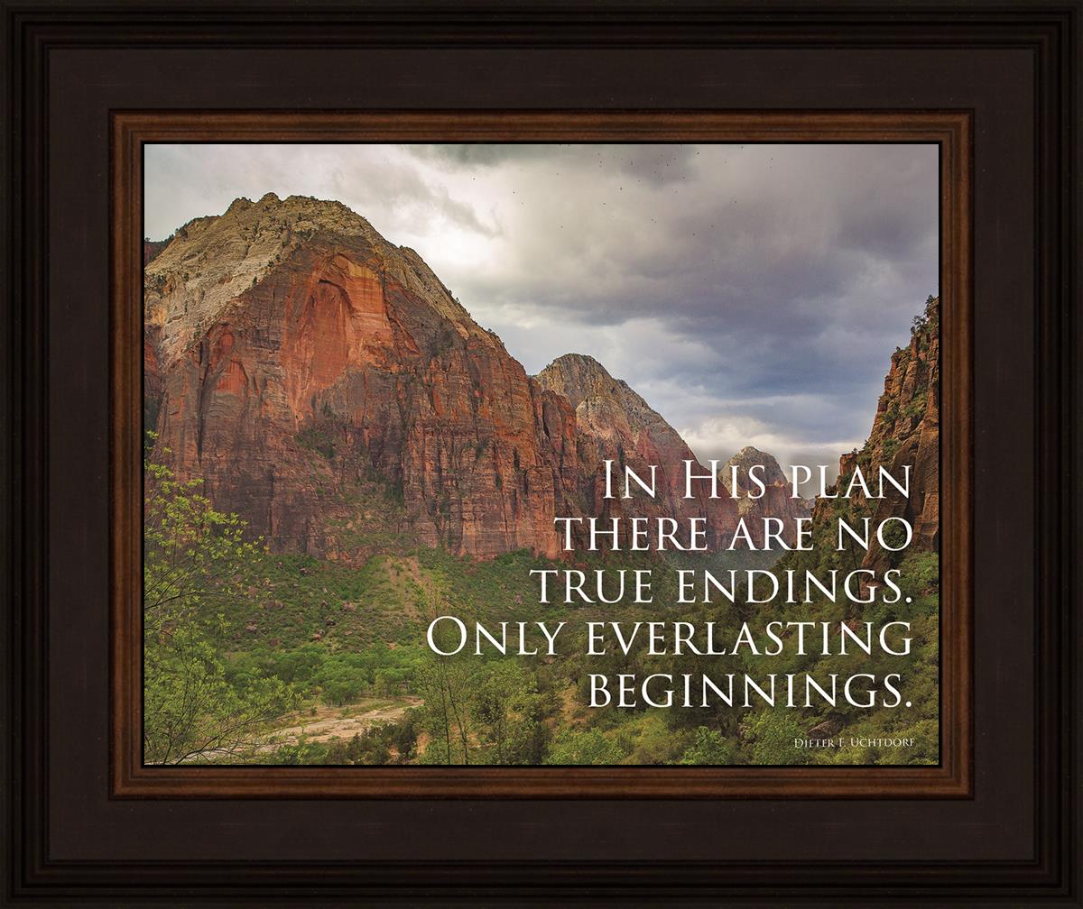 Everlasting Beginnings Motivisional Poster by Julie Kerr features a photograph of a Zion National Park with an insprational quote from Dieter F. Uchtdorf, ||In His plan there are no true endings. Only everlasting beginnings.||