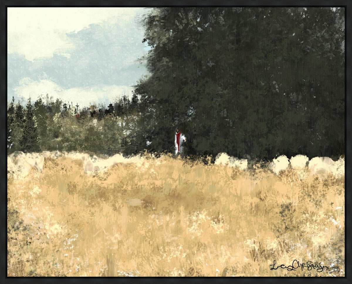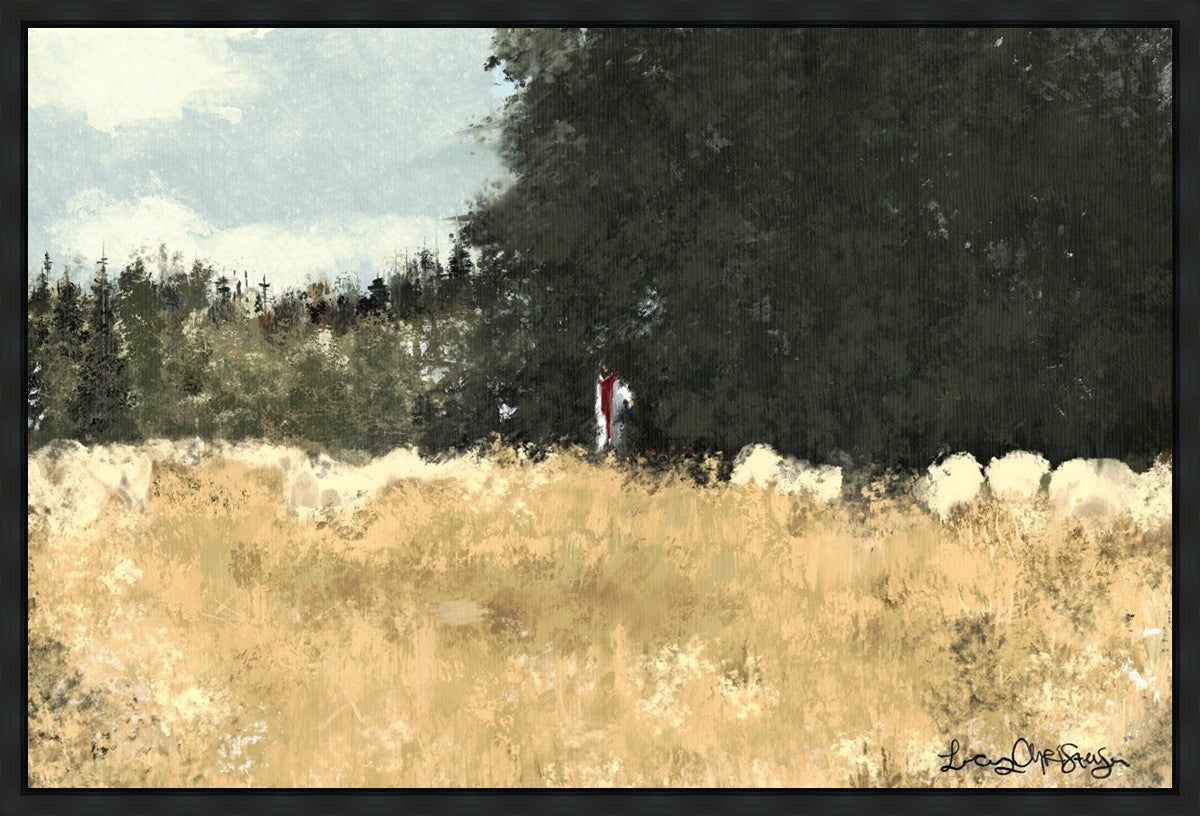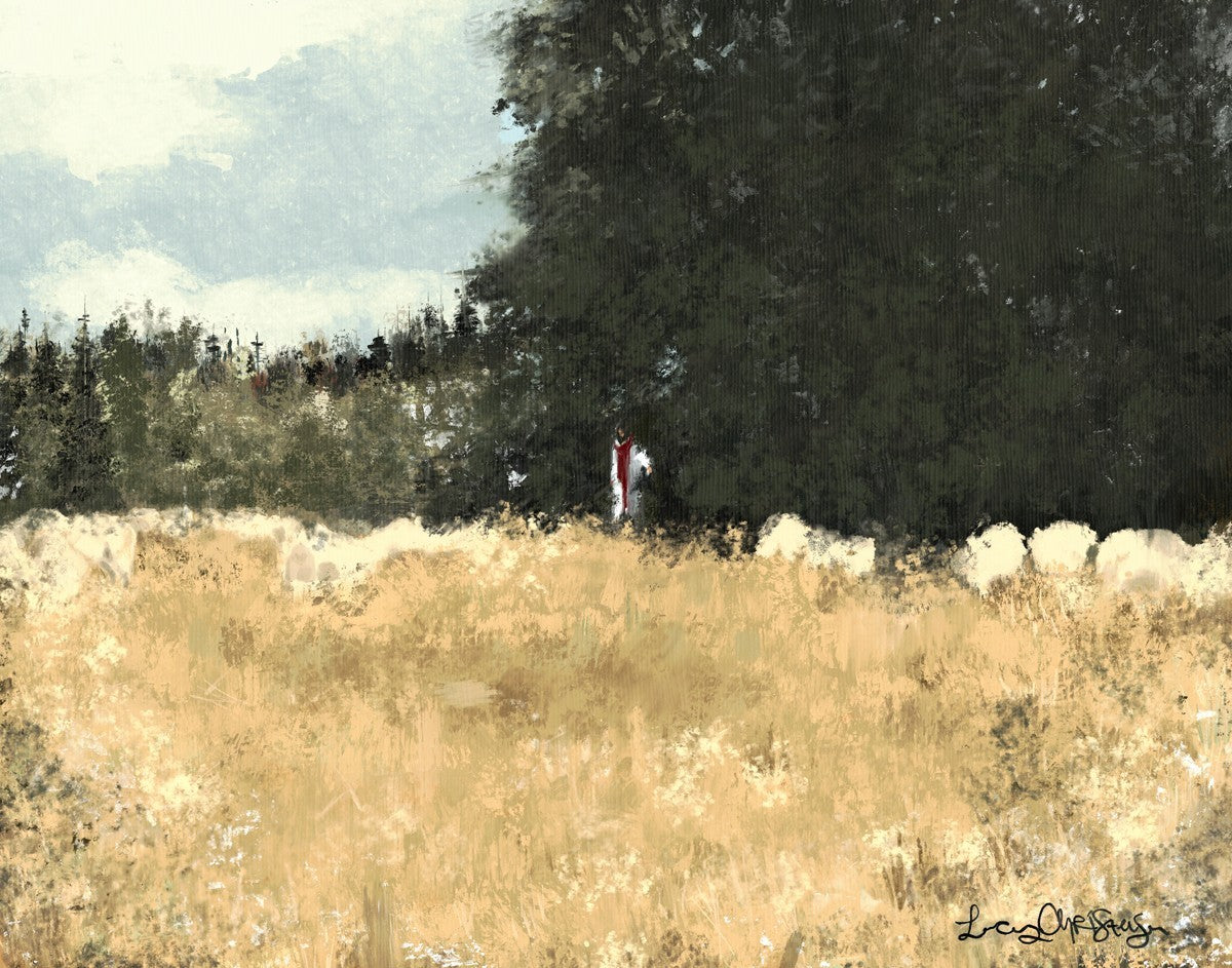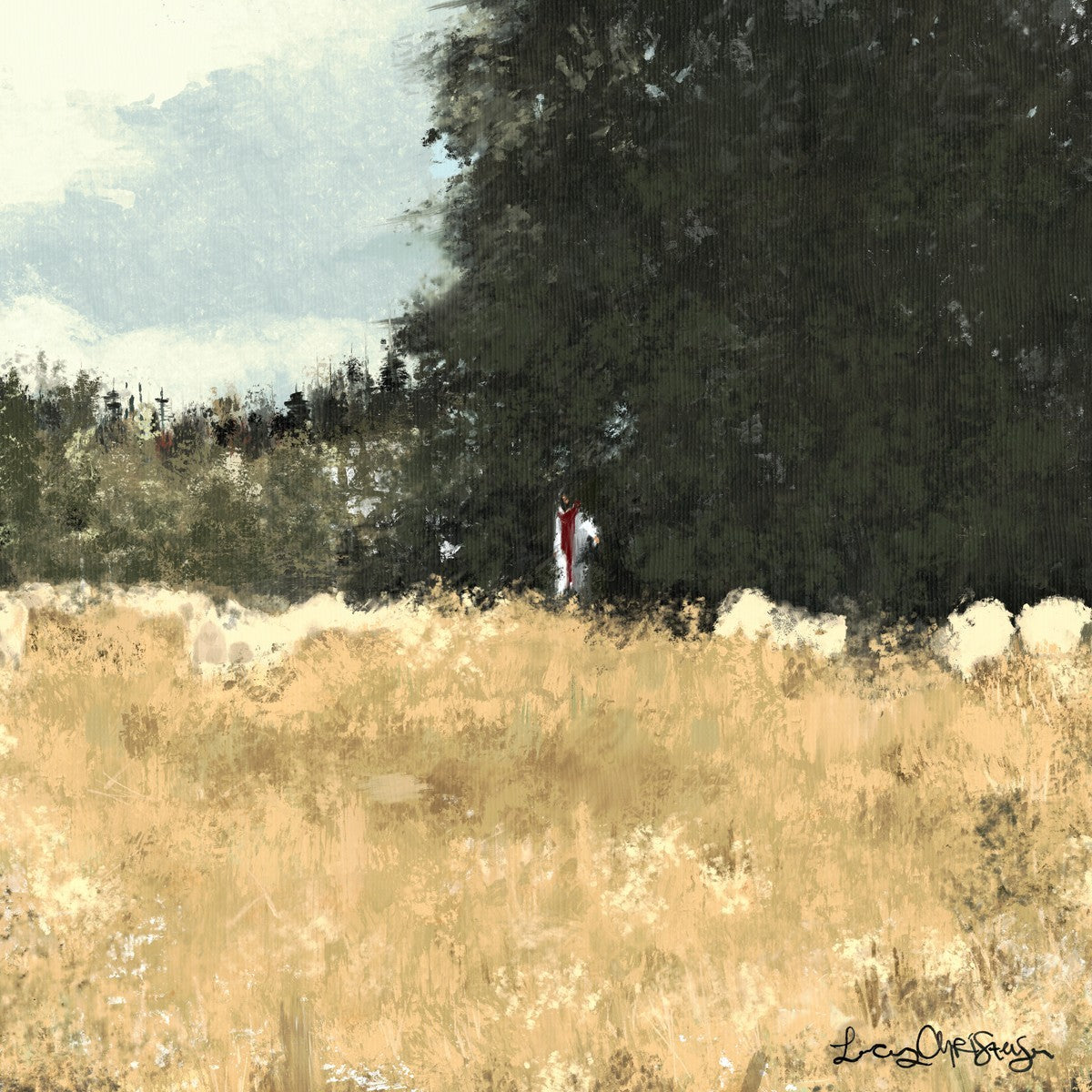 This Painting simply means a lot to me. Again it was something that I let the Spirit guide me on. It seemed as though I always came to this painting when I was trying to figure something out.. most of the time it was me trying to over come Fear about one thing or another. Up until yesterday there was no Christ at all in this painting. I kept wondering why this, its not coming together for me.. I love sheep and nature but Where’s Christ I feel like he should be here. Then I saw him perfectly. It was bone chilling and I covered my mouth even. There he was coming through out of the beautiful dark trees and I could see him perfectly. The whole painting came together with my thoughts I’d been having. Faith over Fear! Christ always triumphs!It was like I opened a door and I felt that happiness and excitement that was waiting.. and the joys I felt seeing Christ in this painting was just the best yet in all my creations. How many times have I simply thought, but where are you? I’ve had complete Faith, what more? And in the nick of time.. There he is. I always feel so bad when I have those moments but they are real.. Just like, Jesus The Christ is real.