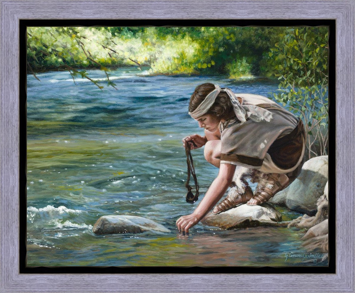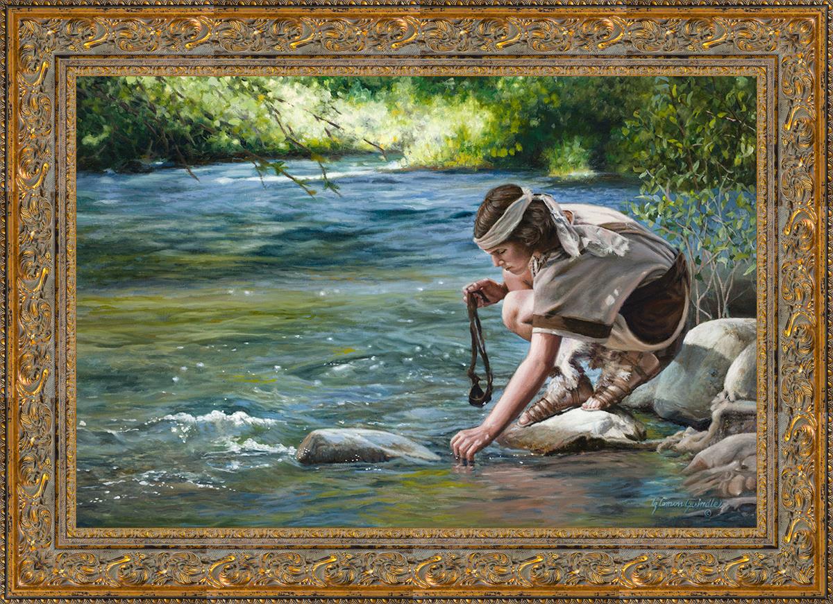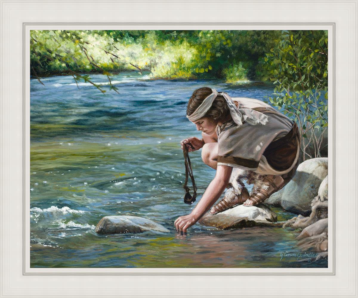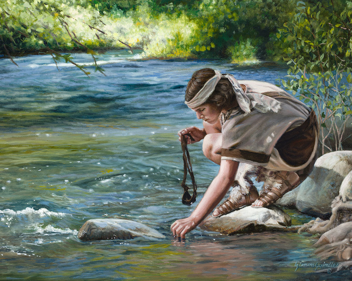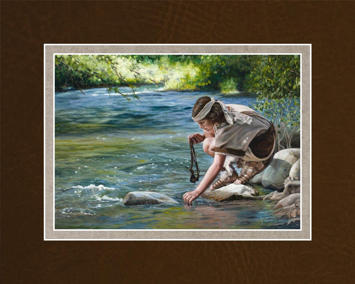 The painting Faith to Prepare by Liz Lemon Swindle portrays David selecting stones for his battle against Goliath. The Bible tells us that the Isrealite nation was in a battle with the Philistine people. Goliath was the champion for the Philistines. He challenged the Isrealite people daily and all the men were affraid of him. Who shall we send as our chamopion, asked King Saul. David, a young boy of about 12 years old, volunteered. With his leather sling, a single small stone, and great faith in God, David slayed the giant. This image reminds us that we can do the same with a bit of faith and preperation.