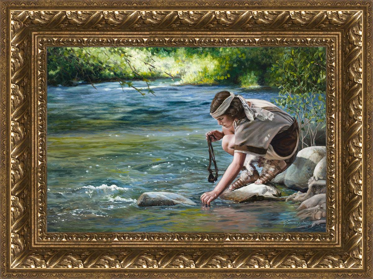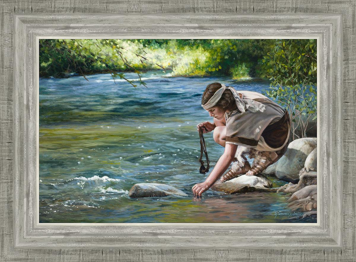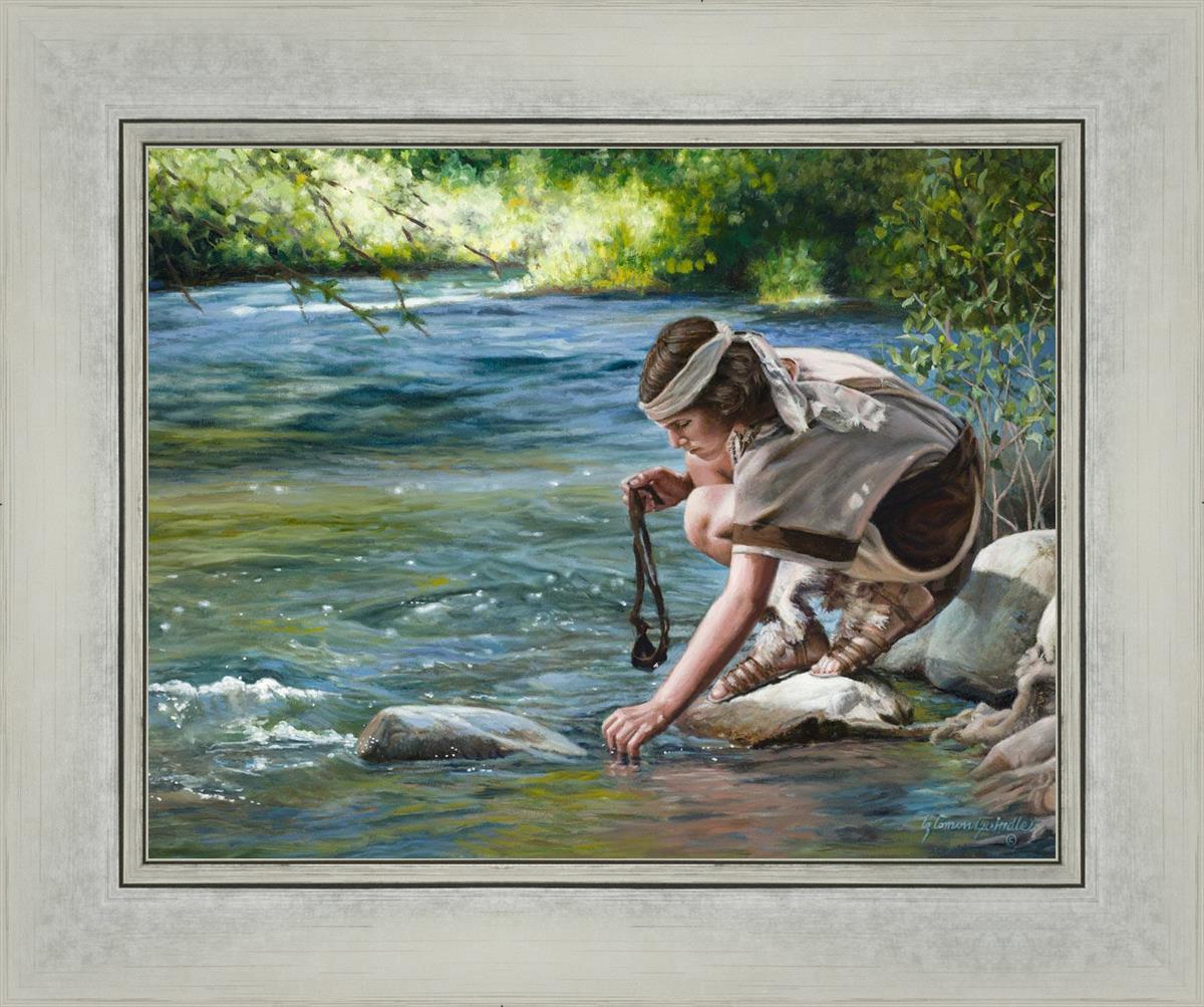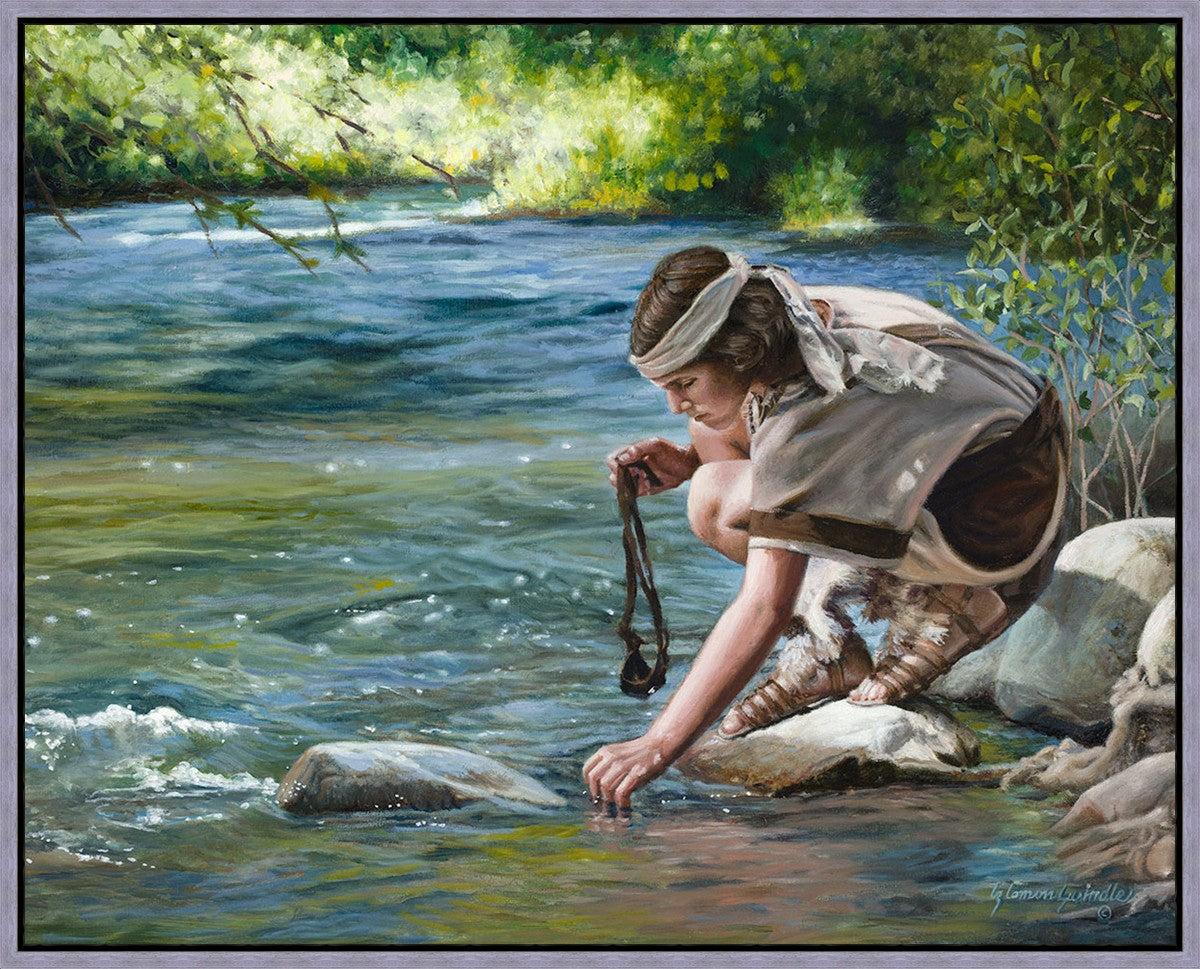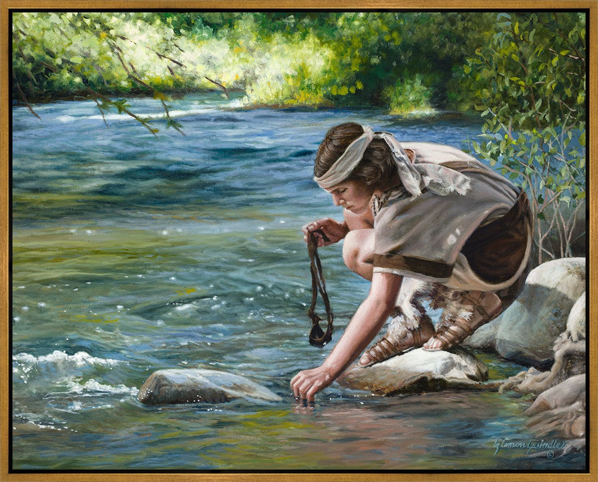 The painting Faith to Prepare by Liz Lemon Swindle portrays David selecting stones for his battle against Goliath. The Bible tells us that the Isrealite nation was in a battle with the Philistine people. Goliath was the champion for the Philistines. He challenged the Isrealite people daily and all the men were affraid of him. Who shall we send as our chamopion, asked King Saul. David, a young boy of about 12 years old, volunteered. With his leather sling, a single small stone, and great faith in God, David slayed the giant. This image reminds us that we can do the same with a bit of faith and preperation.