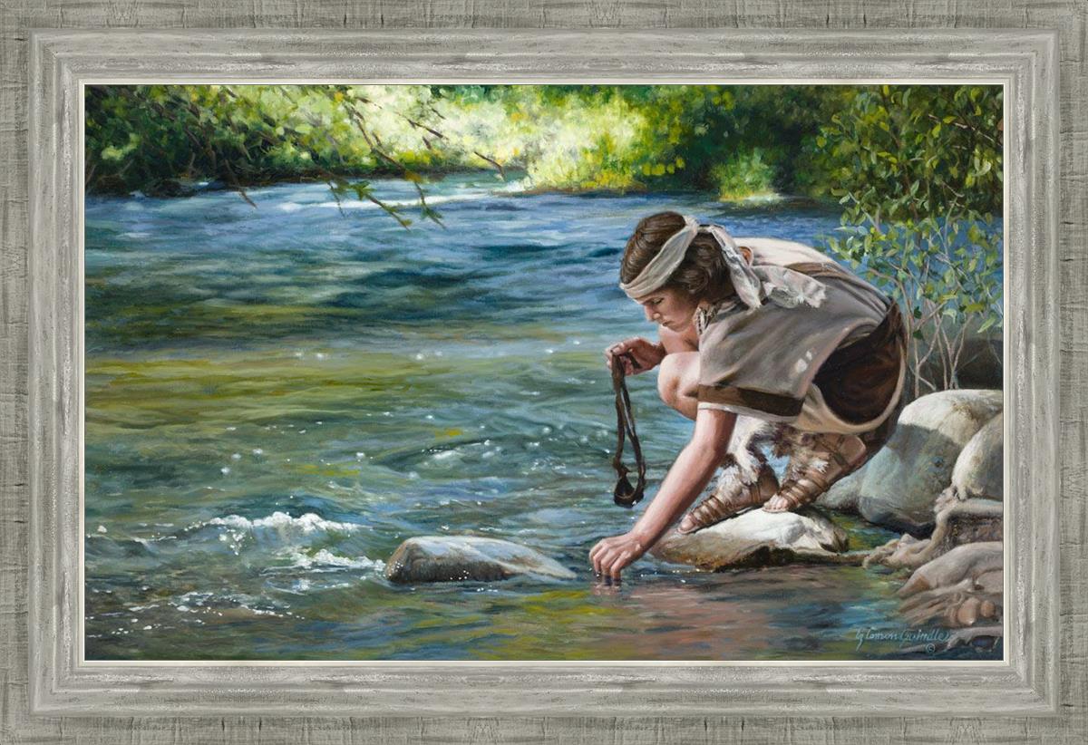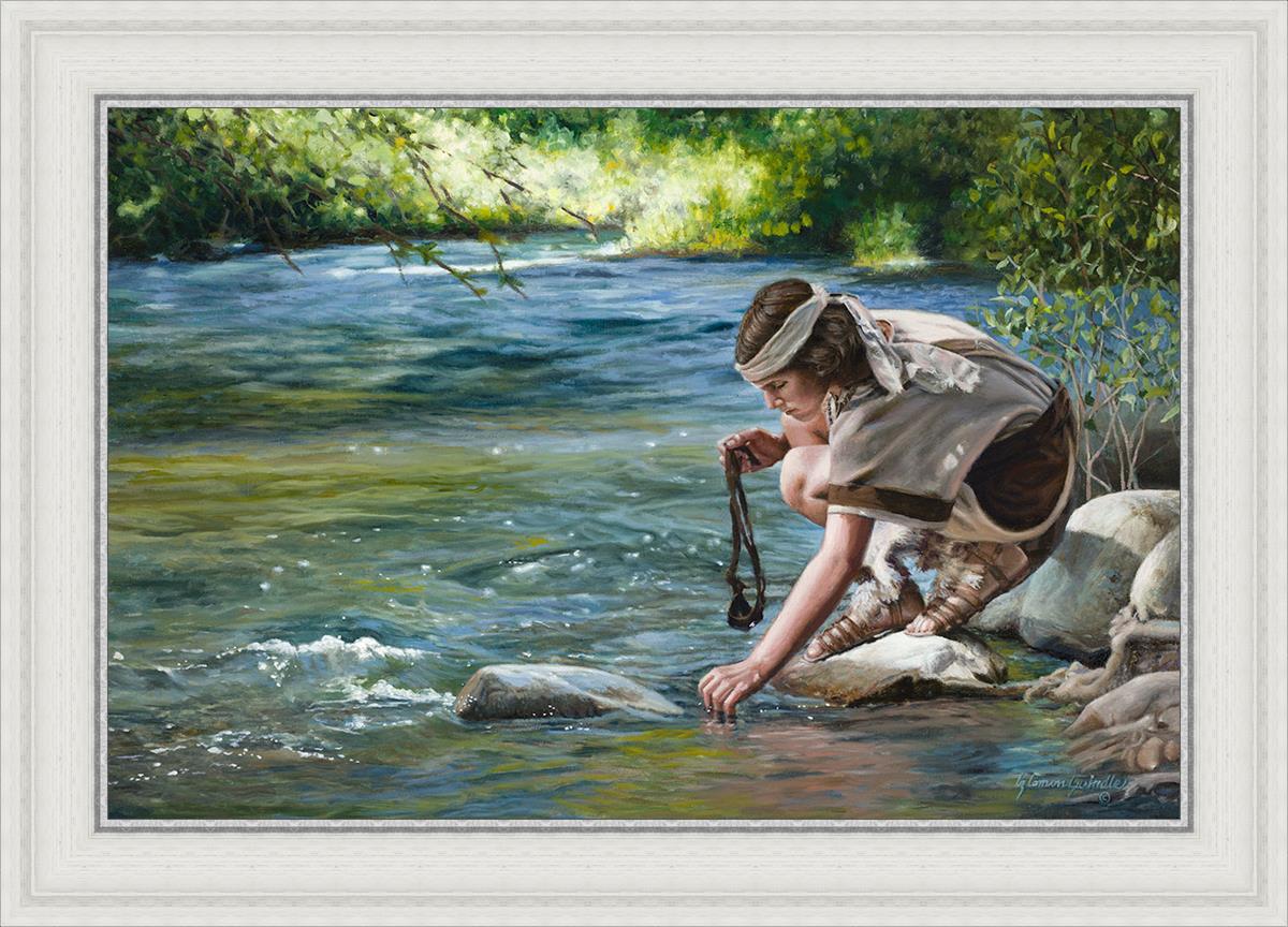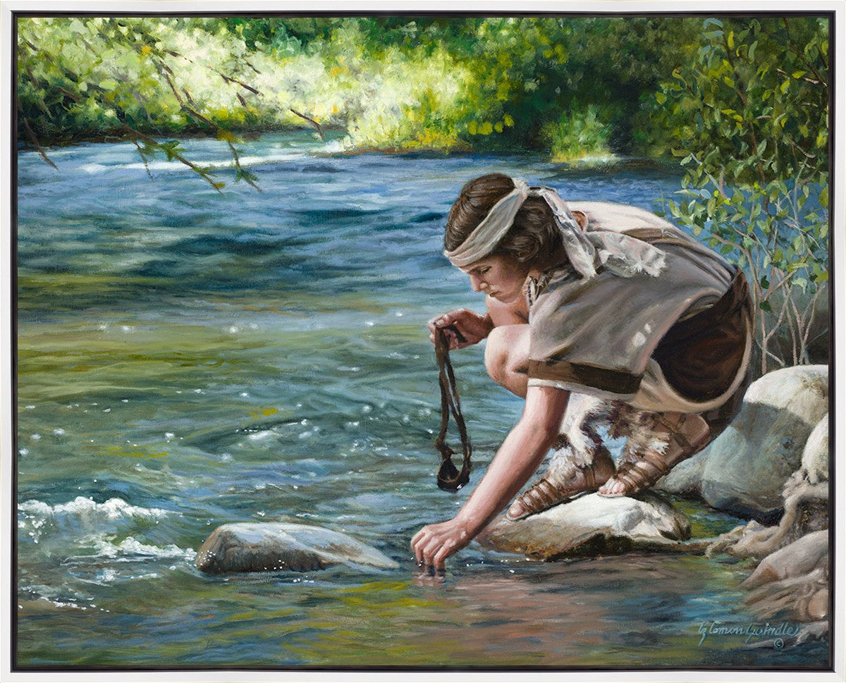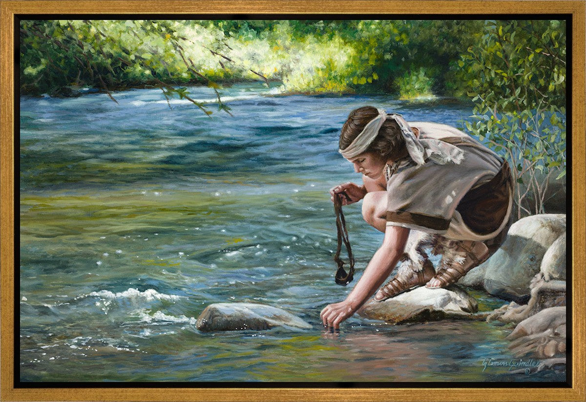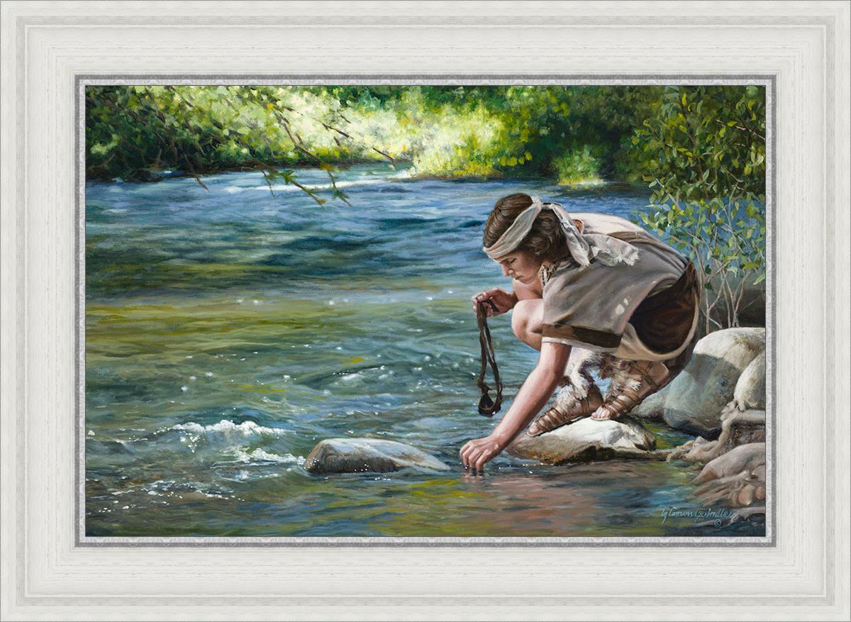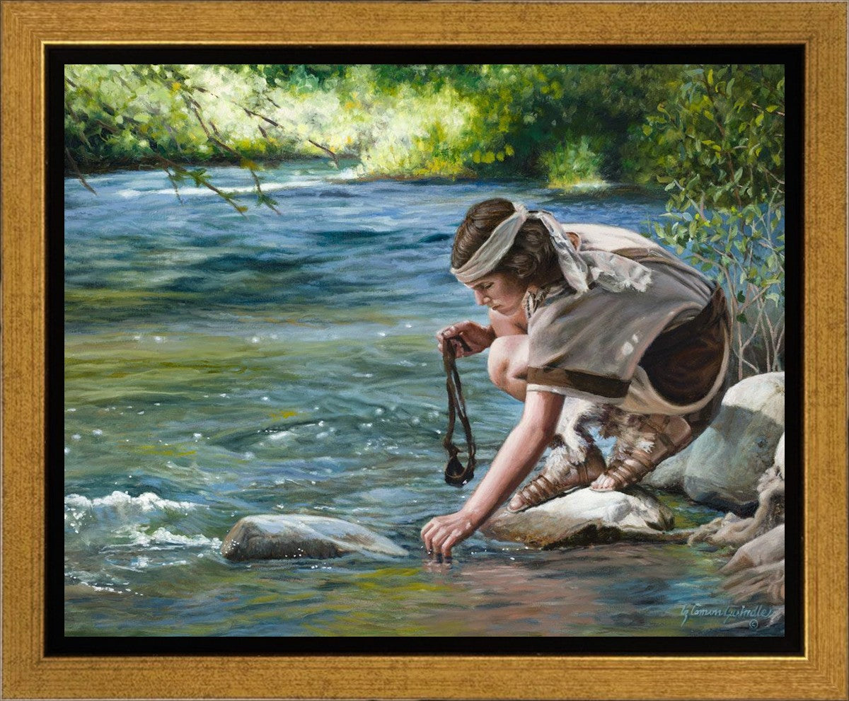 The painting Faith to Prepare by Liz Lemon Swindle portrays David selecting stones for his battle against Goliath. The Bible tells us that the Isrealite nation was in a battle with the Philistine people. Goliath was the champion for the Philistines. He challenged the Isrealite people daily and all the men were affraid of him. Who shall we send as our chamopion, asked King Saul. David, a young boy of about 12 years old, volunteered. With his leather sling, a single small stone, and great faith in God, David slayed the giant. This image reminds us that we can do the same with a bit of faith and preperation.