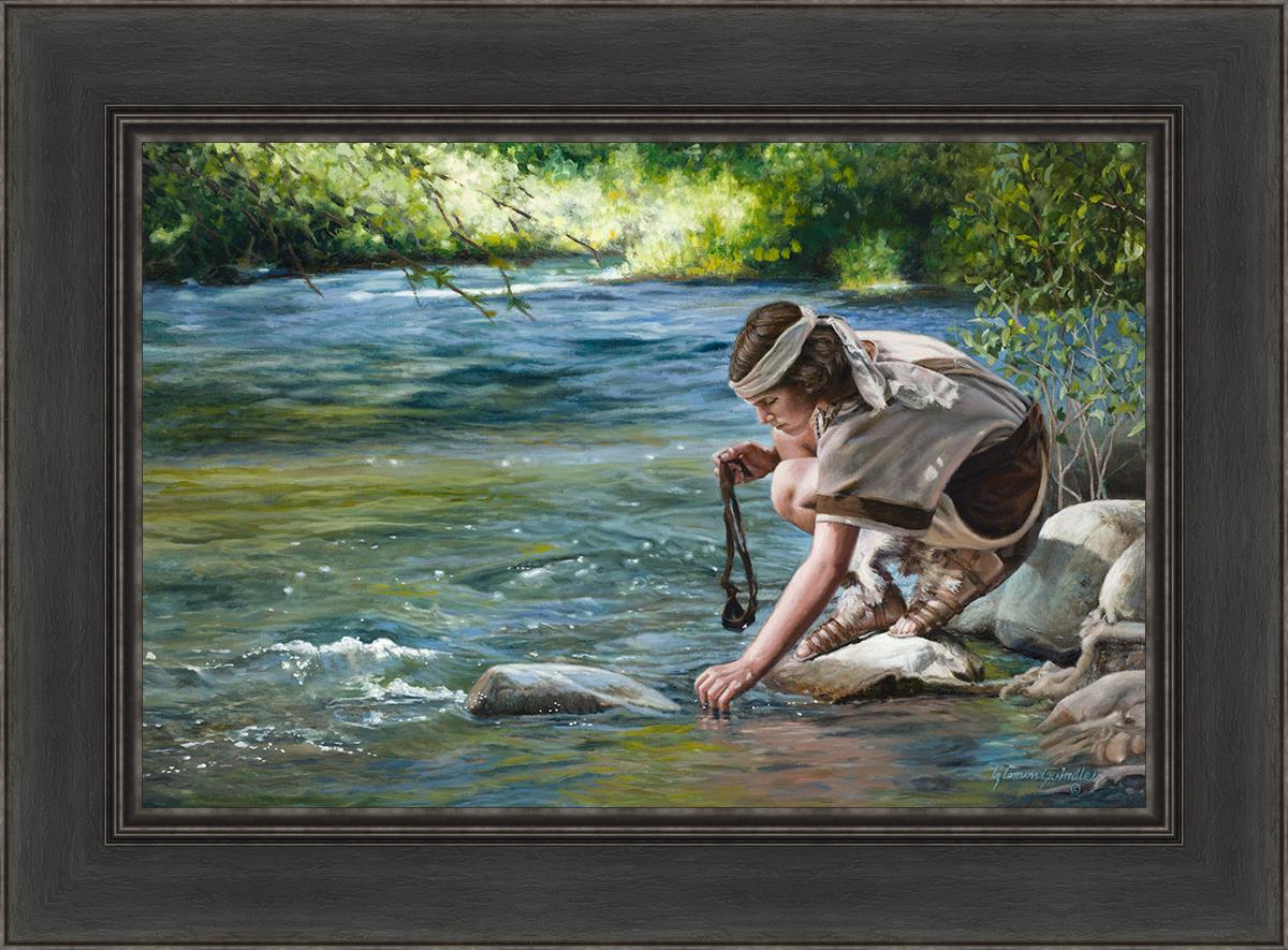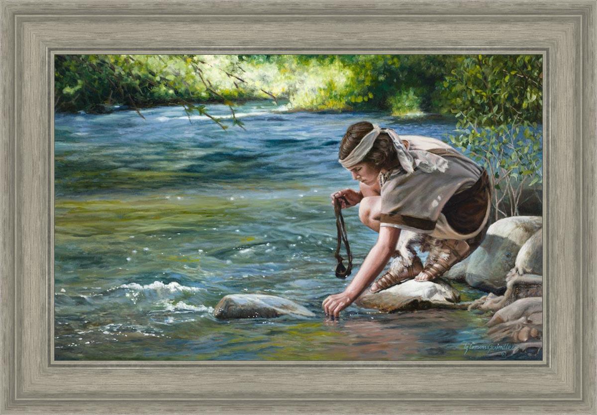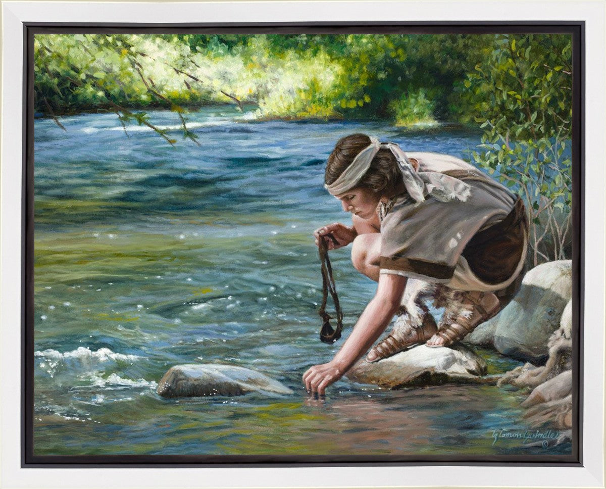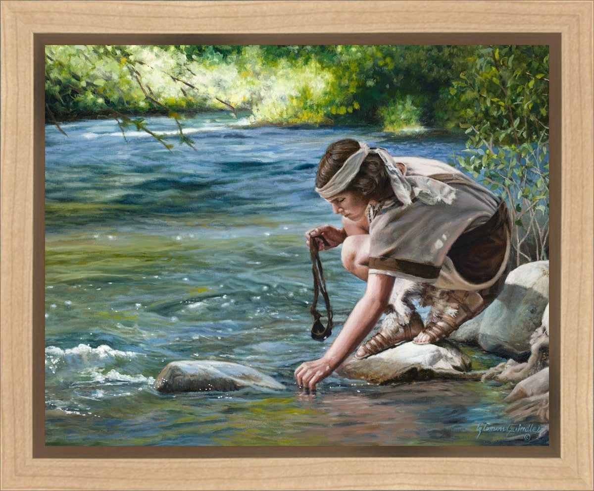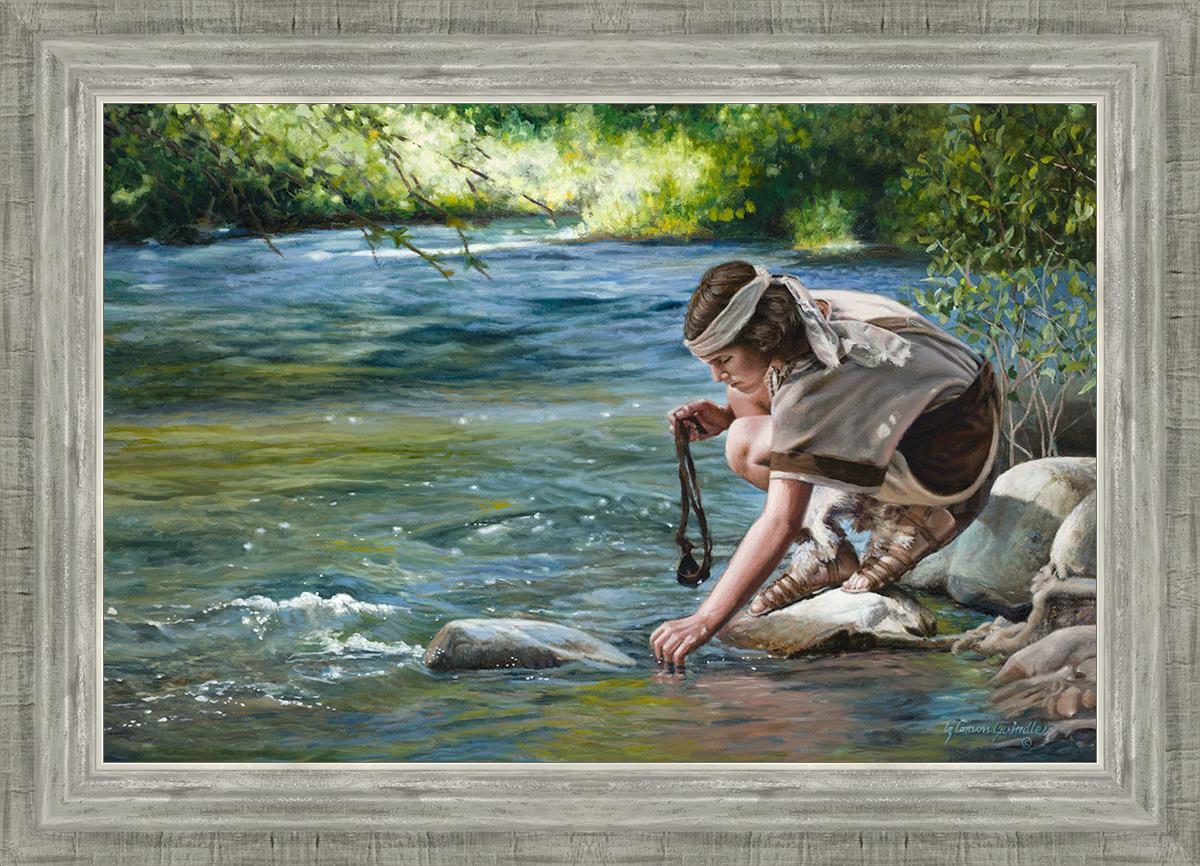 The painting Faith to Prepare by Liz Lemon Swindle portrays David selecting stones for his battle against Goliath. The Bible tells us that the Isrealite nation was in a battle with the Philistine people. Goliath was the champion for the Philistines. He challenged the Isrealite people daily and all the men were affraid of him. Who shall we send as our chamopion, asked King Saul. David, a young boy of about 12 years old, volunteered. With his leather sling, a single small stone, and great faith in God, David slayed the giant. This image reminds us that we can do the same with a bit of faith and preperation.