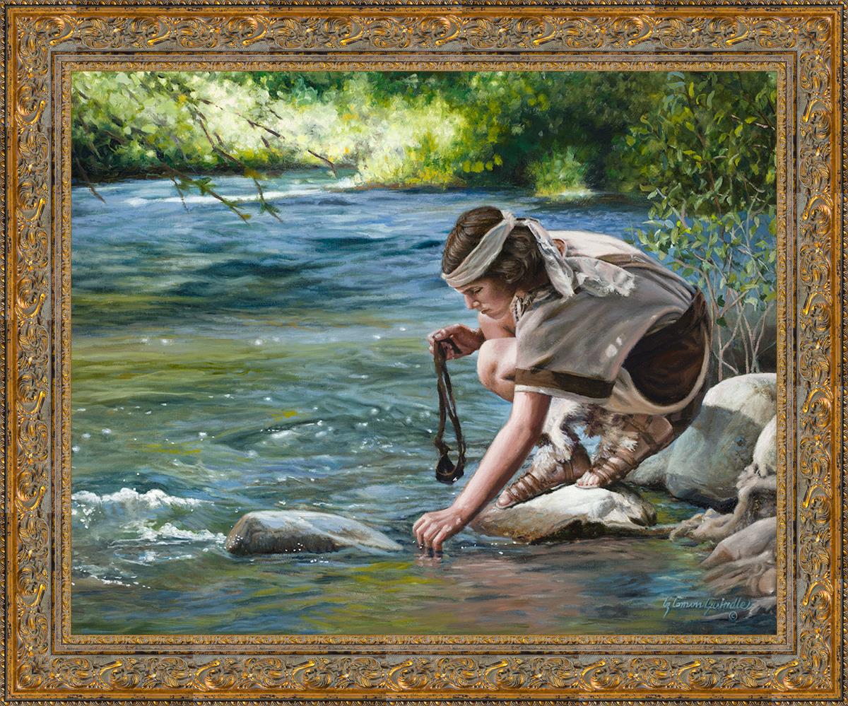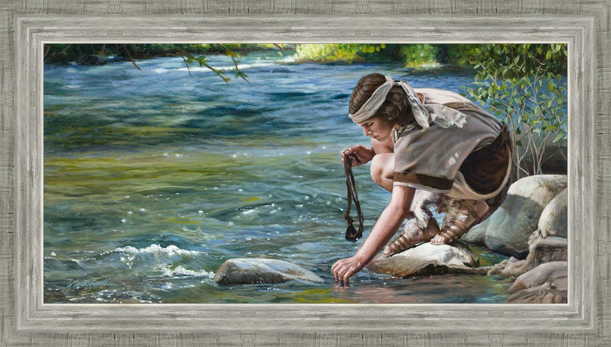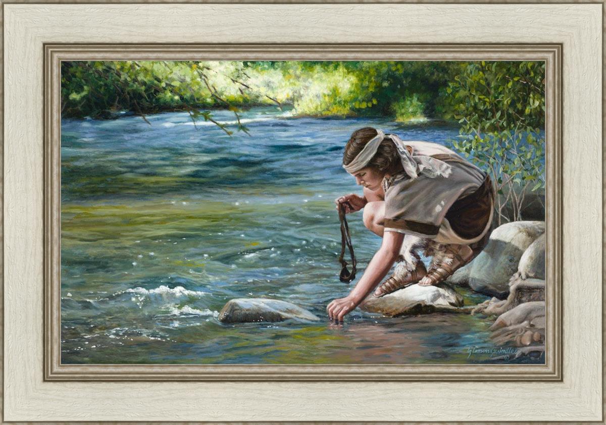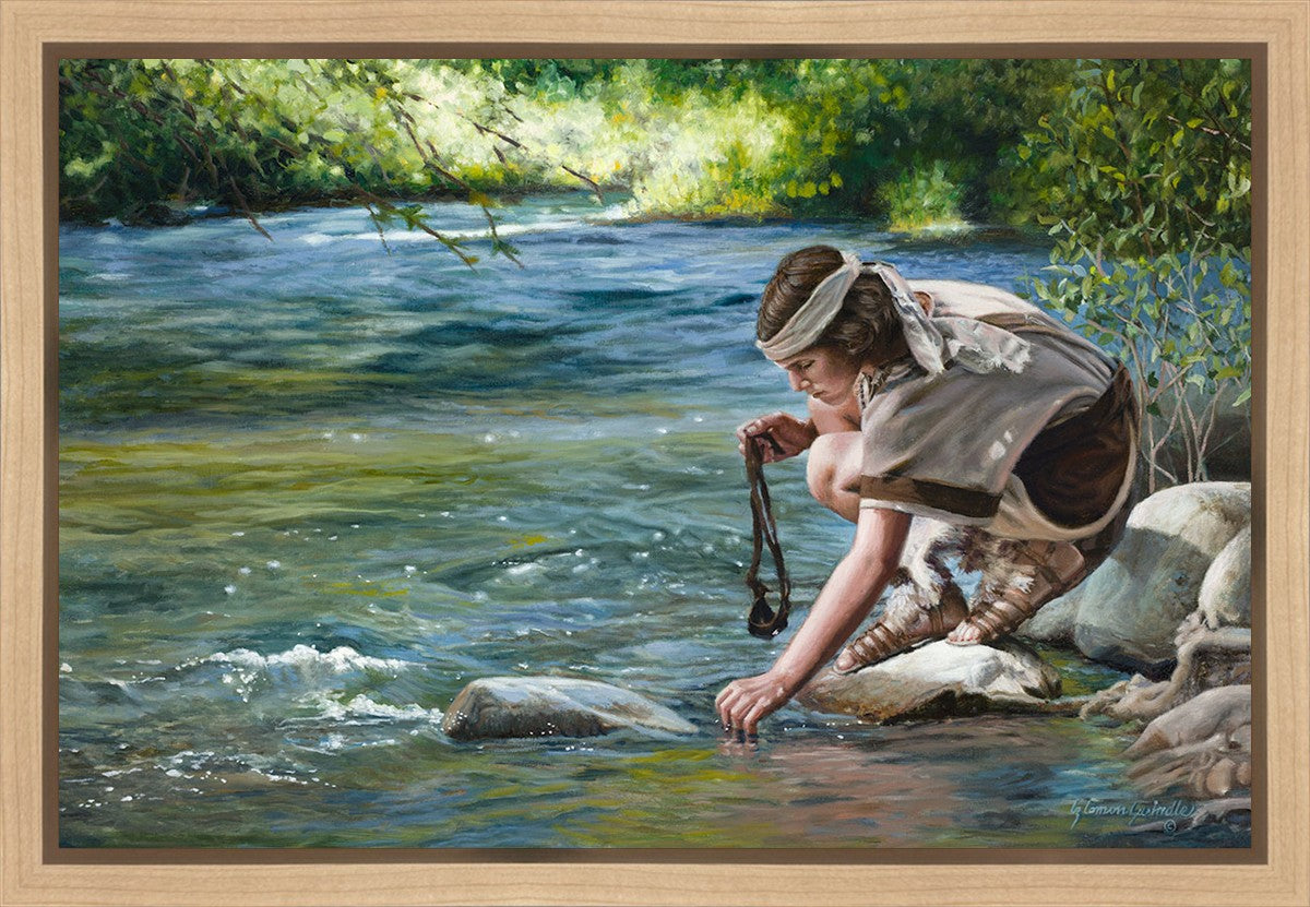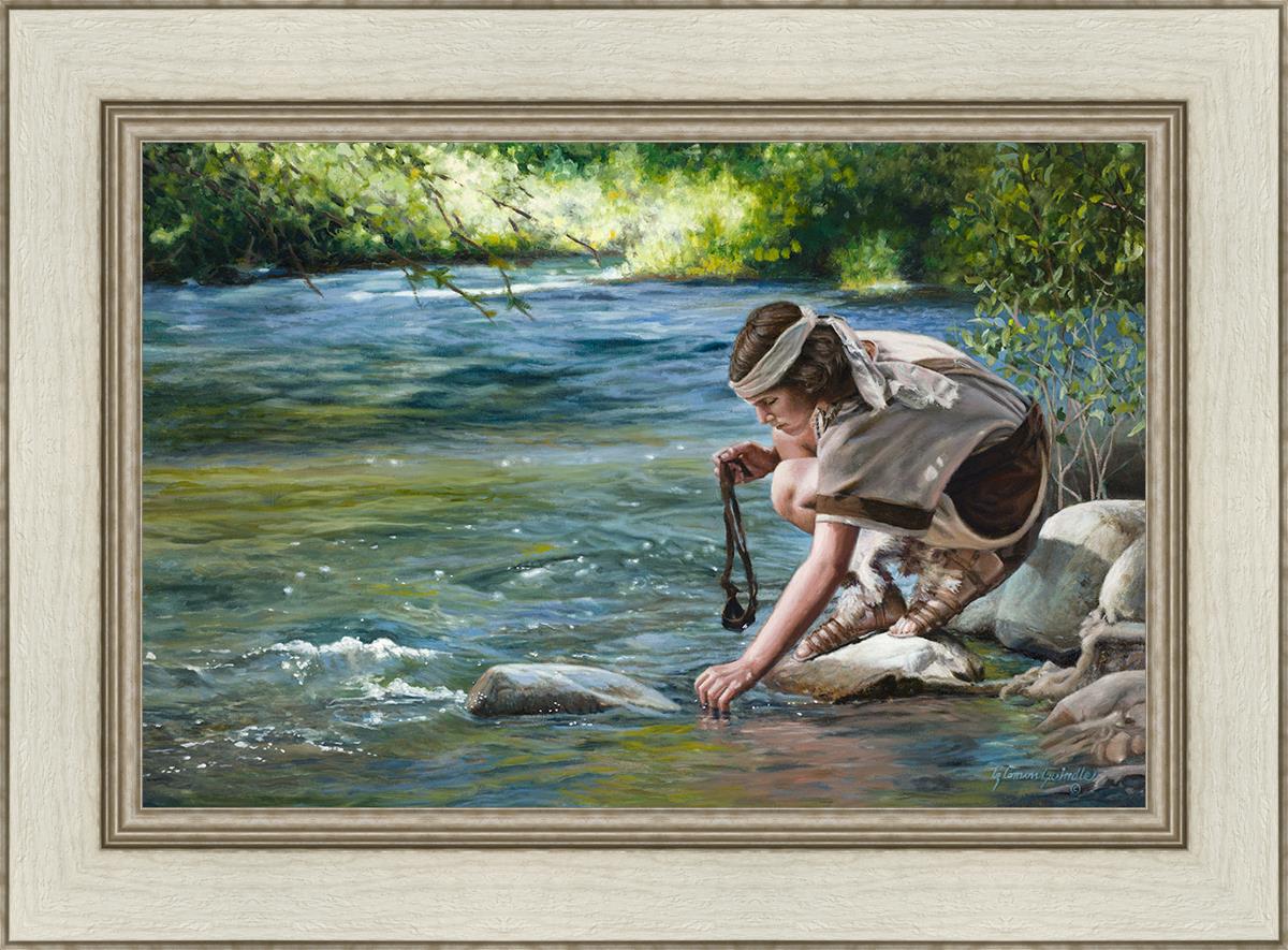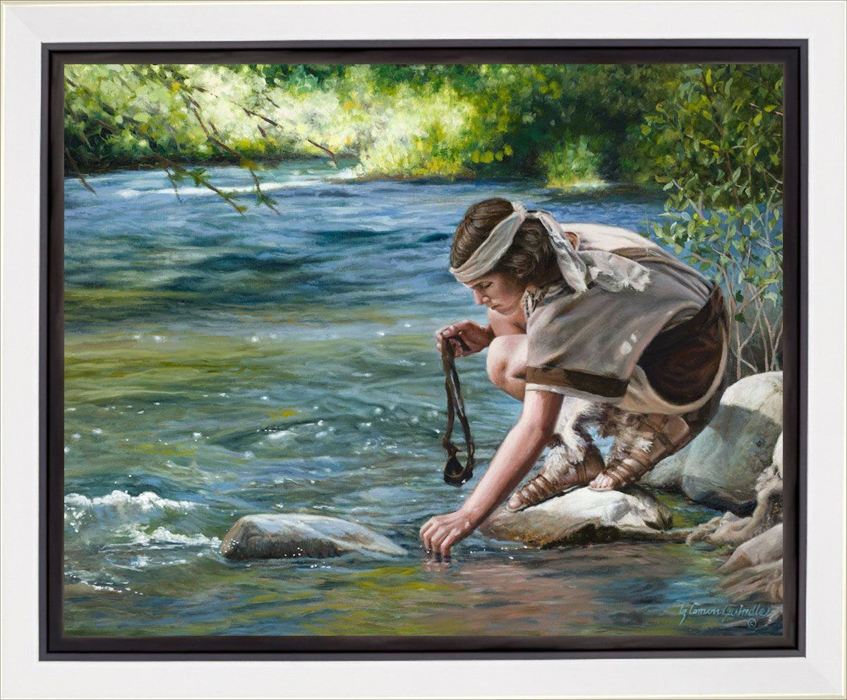 The painting Faith to Prepare by Liz Lemon Swindle portrays David selecting stones for his battle against Goliath. The Bible tells us that the Isrealite nation was in a battle with the Philistine people. Goliath was the champion for the Philistines. He challenged the Isrealite people daily and all the men were affraid of him. Who shall we send as our chamopion, asked King Saul. David, a young boy of about 12 years old, volunteered. With his leather sling, a single small stone, and great faith in God, David slayed the giant. This image reminds us that we can do the same with a bit of faith and preperation.
