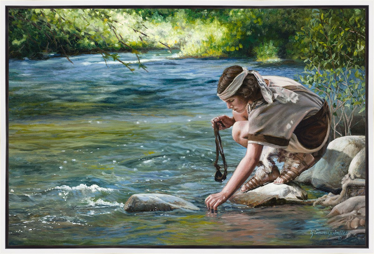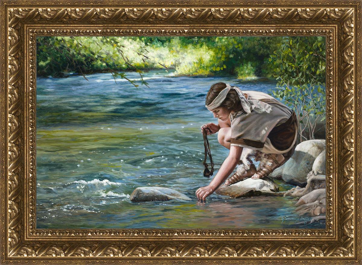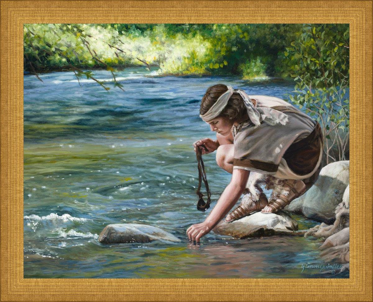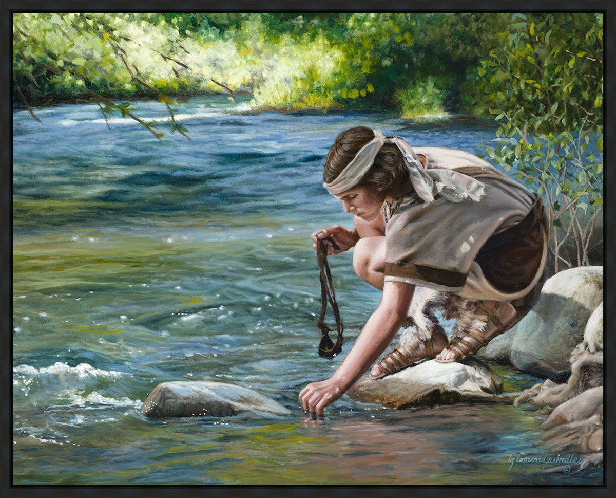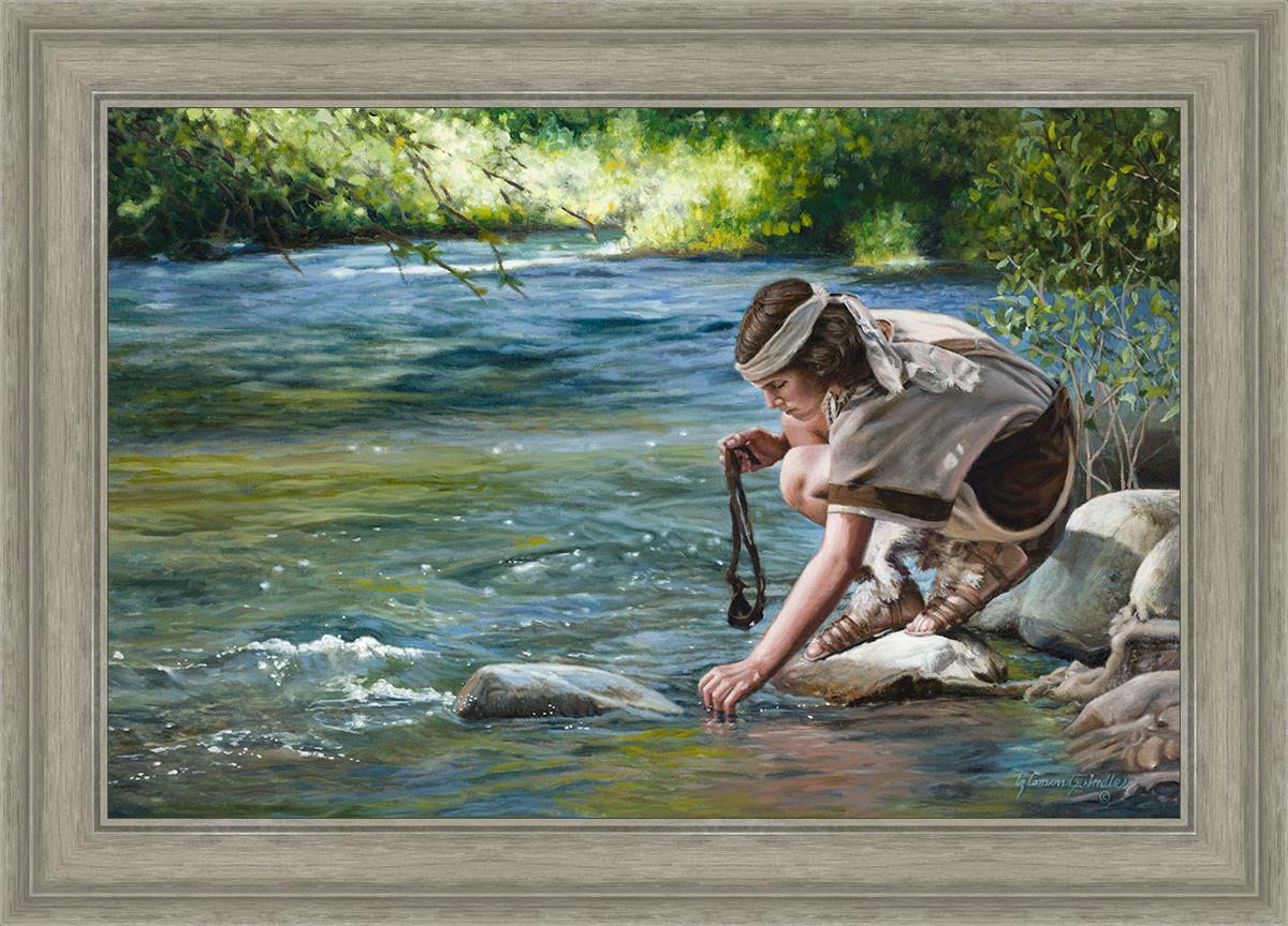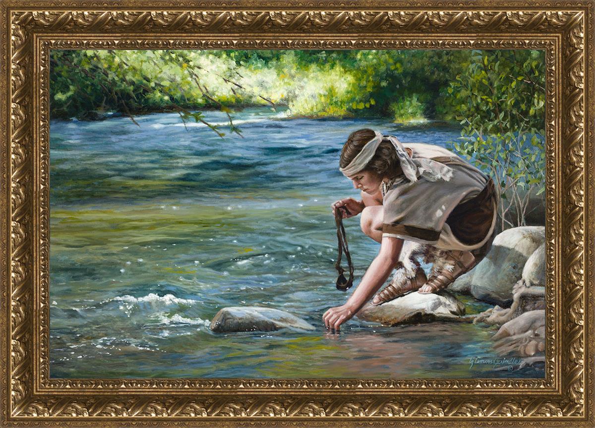 The painting Faith to Prepare by Liz Lemon Swindle portrays David selecting stones for his battle against Goliath. The Bible tells us that the Isrealite nation was in a battle with the Philistine people. Goliath was the champion for the Philistines. He challenged the Isrealite people daily and all the men were affraid of him. Who shall we send as our chamopion, asked King Saul. David, a young boy of about 12 years old, volunteered. With his leather sling, a single small stone, and great faith in God, David slayed the giant. This image reminds us that we can do the same with a bit of faith and preperation.