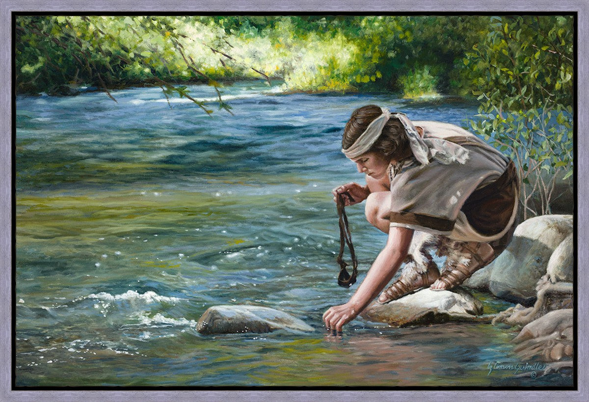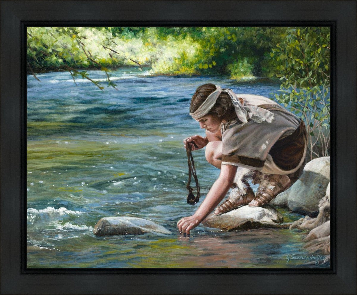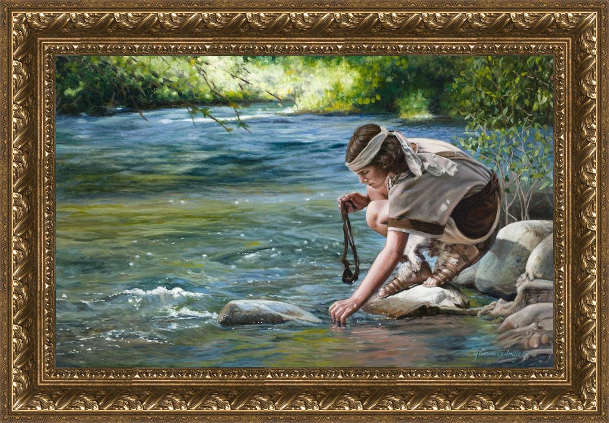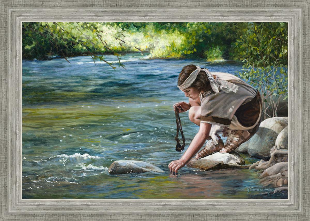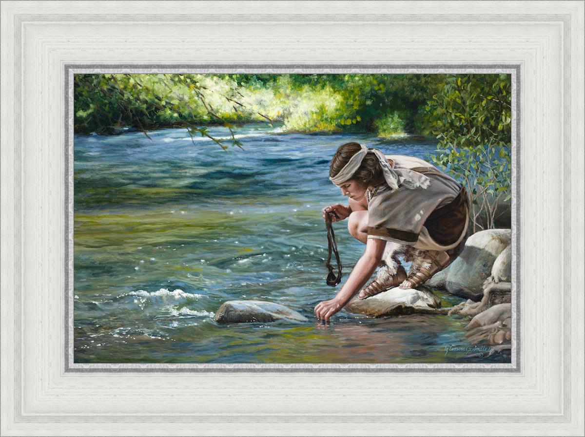 The painting Faith to Prepare by Liz Lemon Swindle portrays David selecting stones for his battle against Goliath. The Bible tells us that the Isrealite nation was in a battle with the Philistine people. Goliath was the champion for the Philistines. He challenged the Isrealite people daily and all the men were affraid of him. Who shall we send as our chamopion, asked King Saul. David, a young boy of about 12 years old, volunteered. With his leather sling, a single small stone, and great faith in God, David slayed the giant. This image reminds us that we can do the same with a bit of faith and preperation.