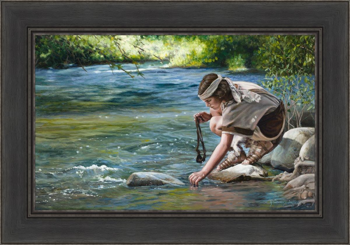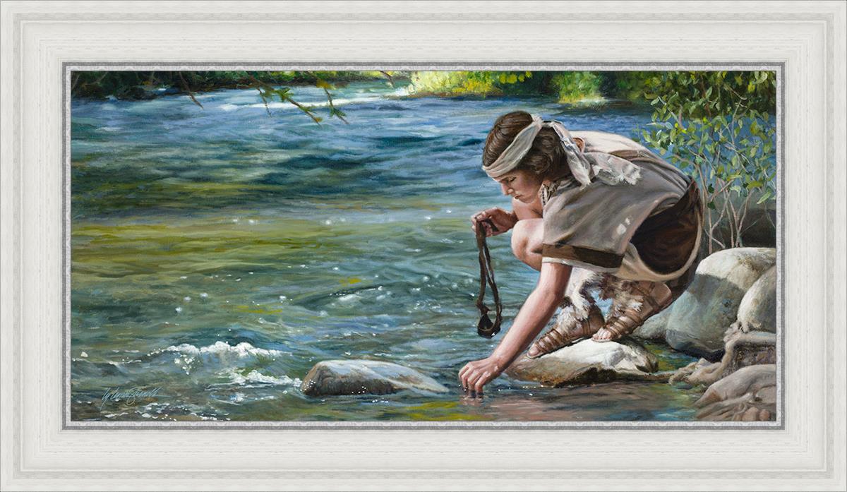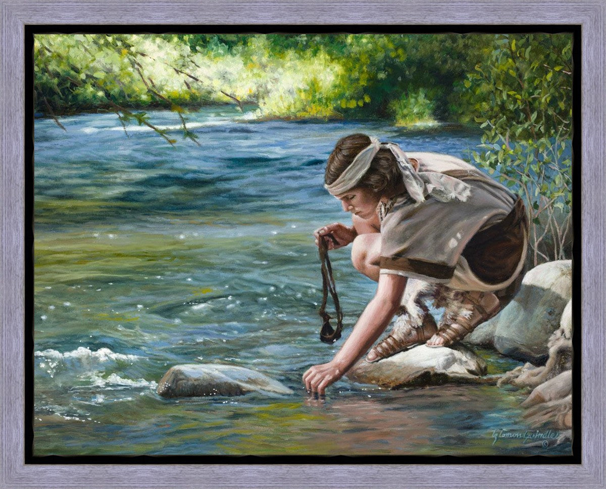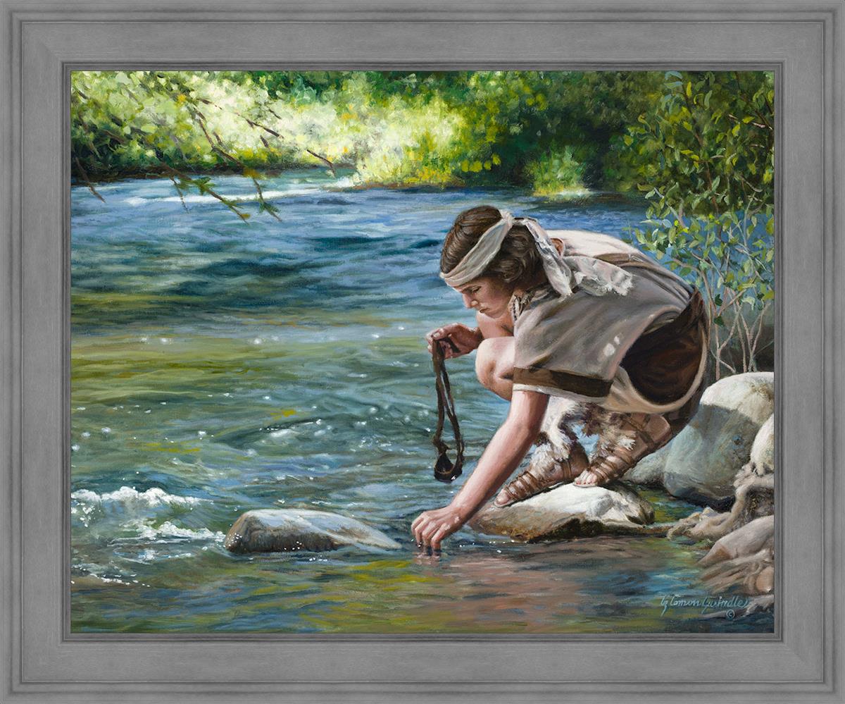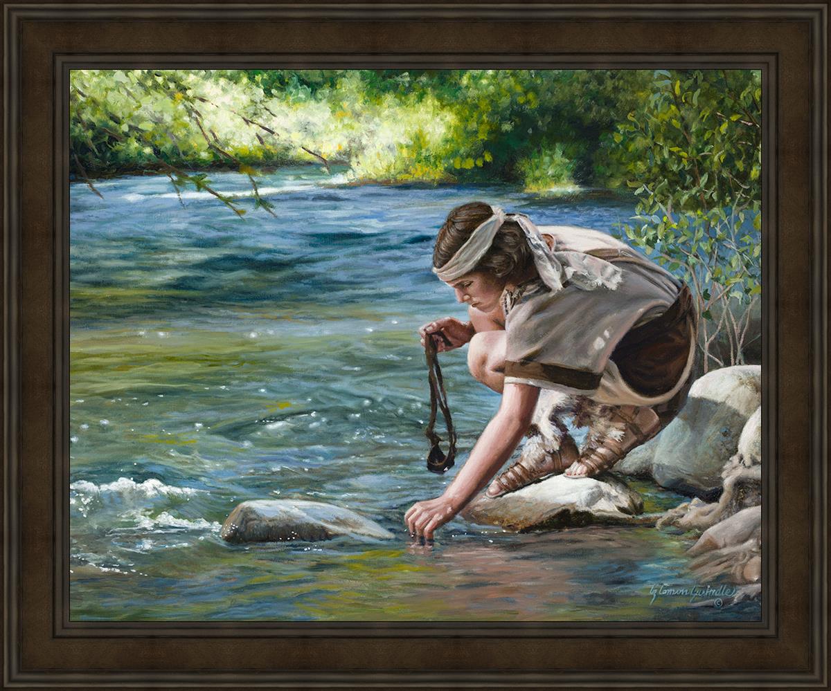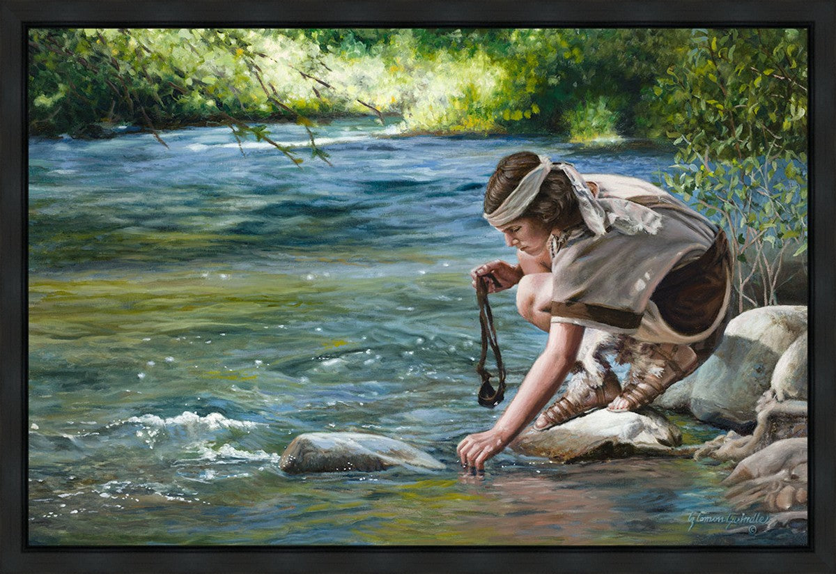 The painting Faith to Prepare by Liz Lemon Swindle portrays David selecting stones for his battle against Goliath. The Bible tells us that the Isrealite nation was in a battle with the Philistine people. Goliath was the champion for the Philistines. He challenged the Isrealite people daily and all the men were affraid of him. Who shall we send as our chamopion, asked King Saul. David, a young boy of about 12 years old, volunteered. With his leather sling, a single small stone, and great faith in God, David slayed the giant. This image reminds us that we can do the same with a bit of faith and preperation.