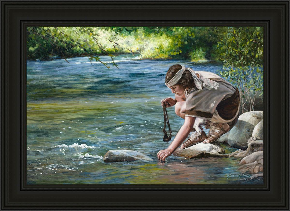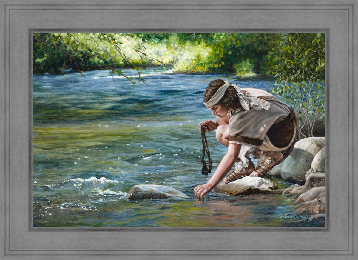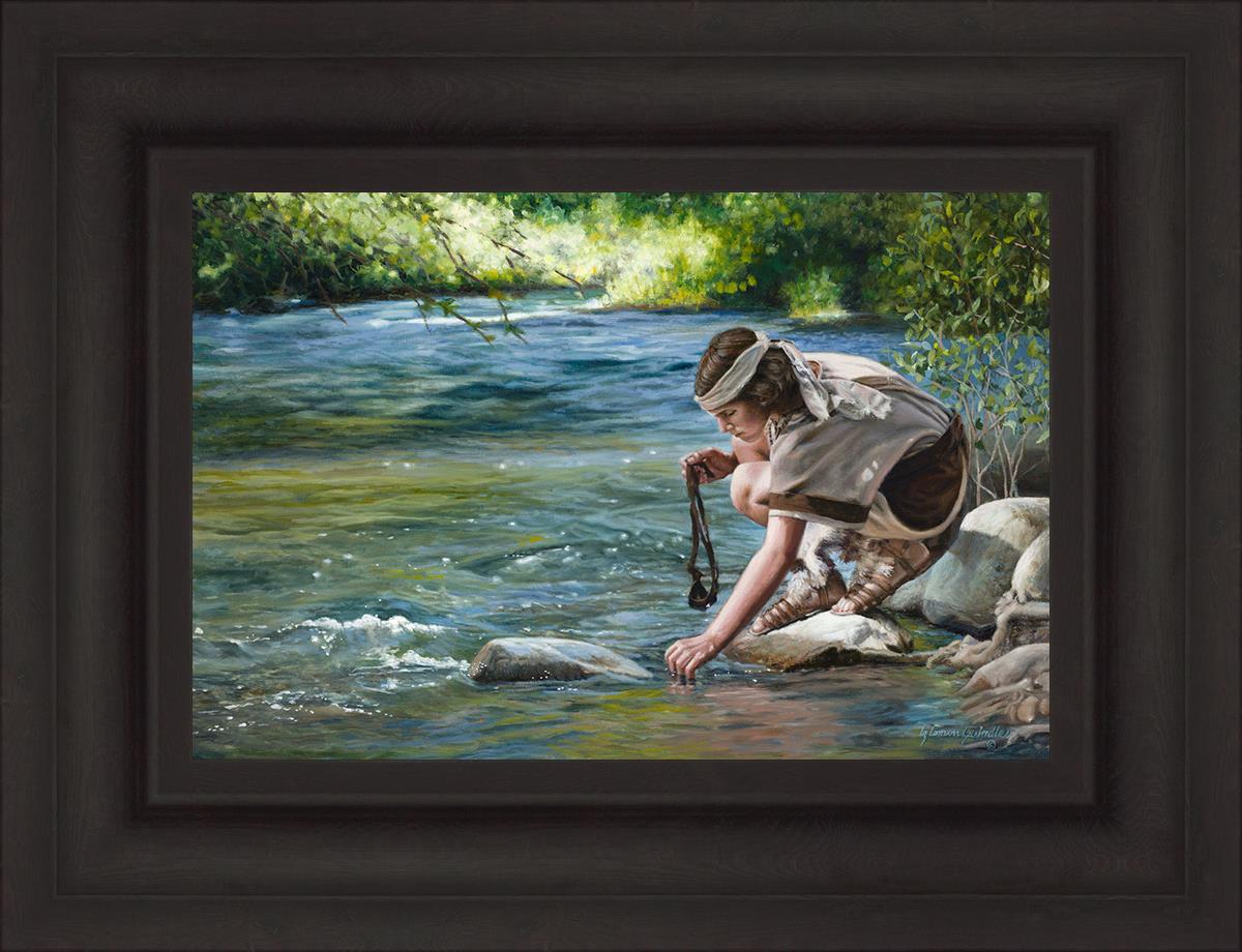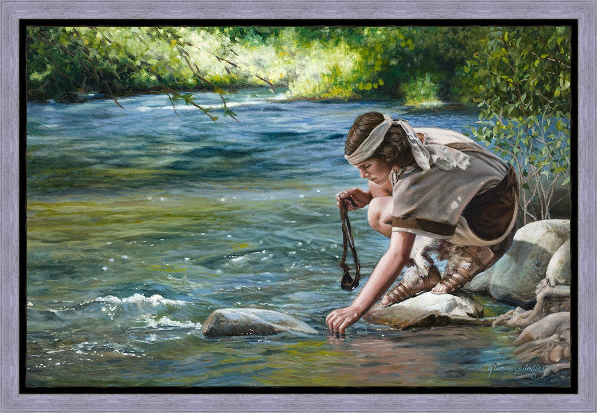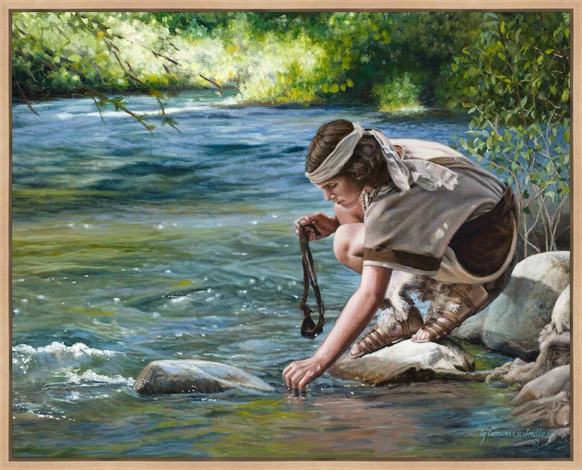 The painting Faith to Prepare by Liz Lemon Swindle portrays David selecting stones for his battle against Goliath. The Bible tells us that the Isrealite nation was in a battle with the Philistine people. Goliath was the champion for the Philistines. He challenged the Isrealite people daily and all the men were affraid of him. Who shall we send as our chamopion, asked King Saul. David, a young boy of about 12 years old, volunteered. With his leather sling, a single small stone, and great faith in God, David slayed the giant. This image reminds us that we can do the same with a bit of faith and preperation.