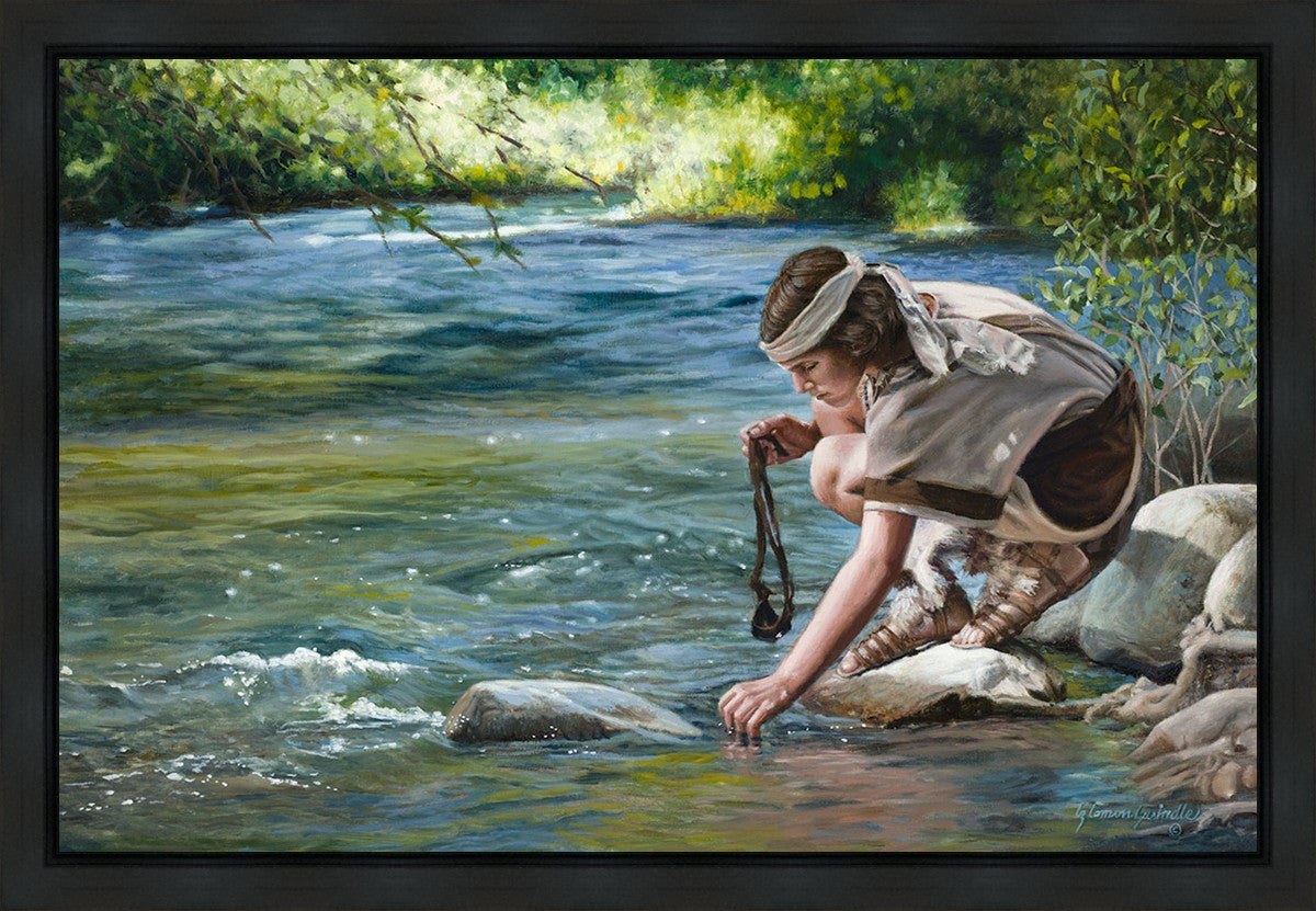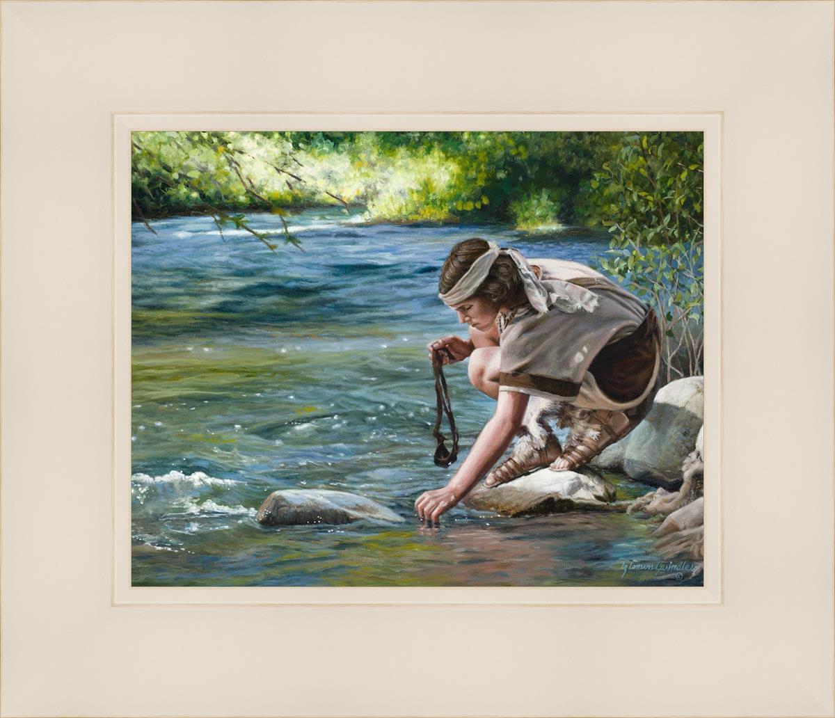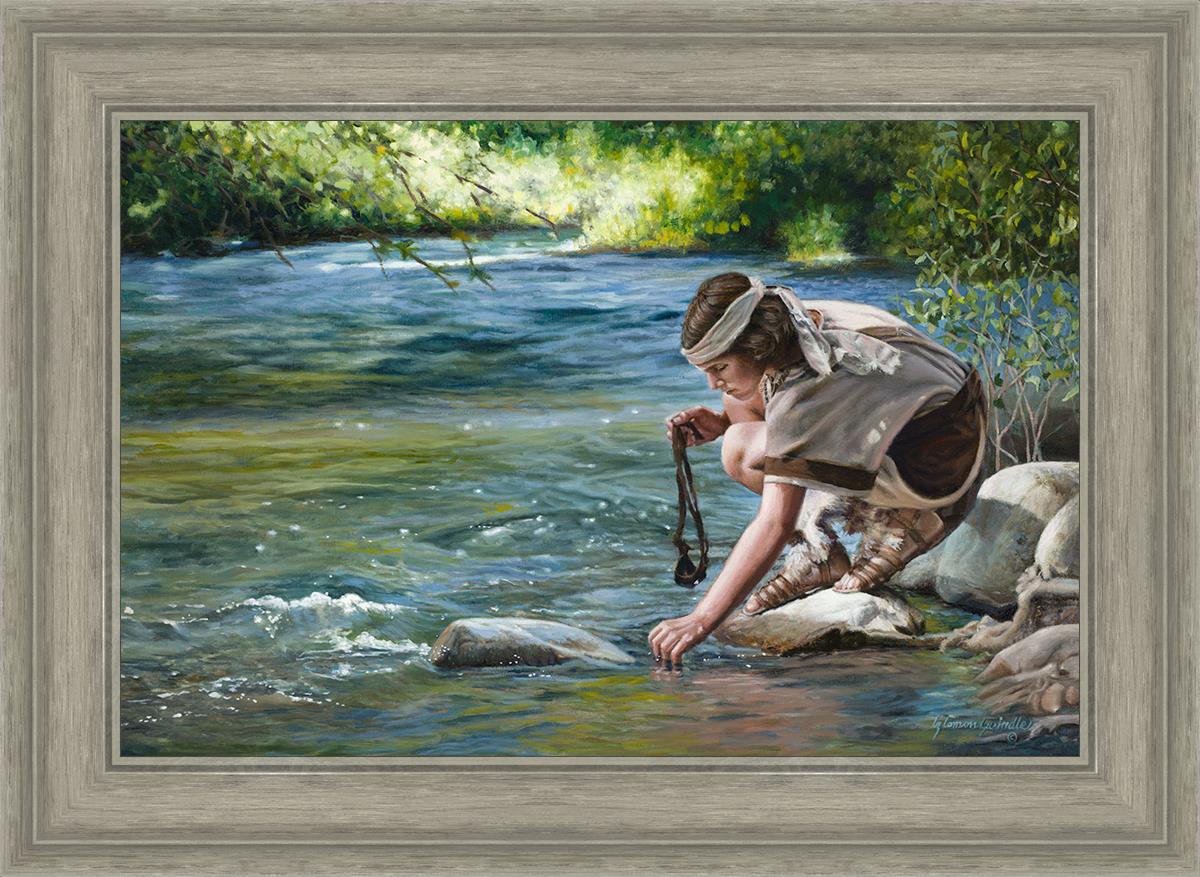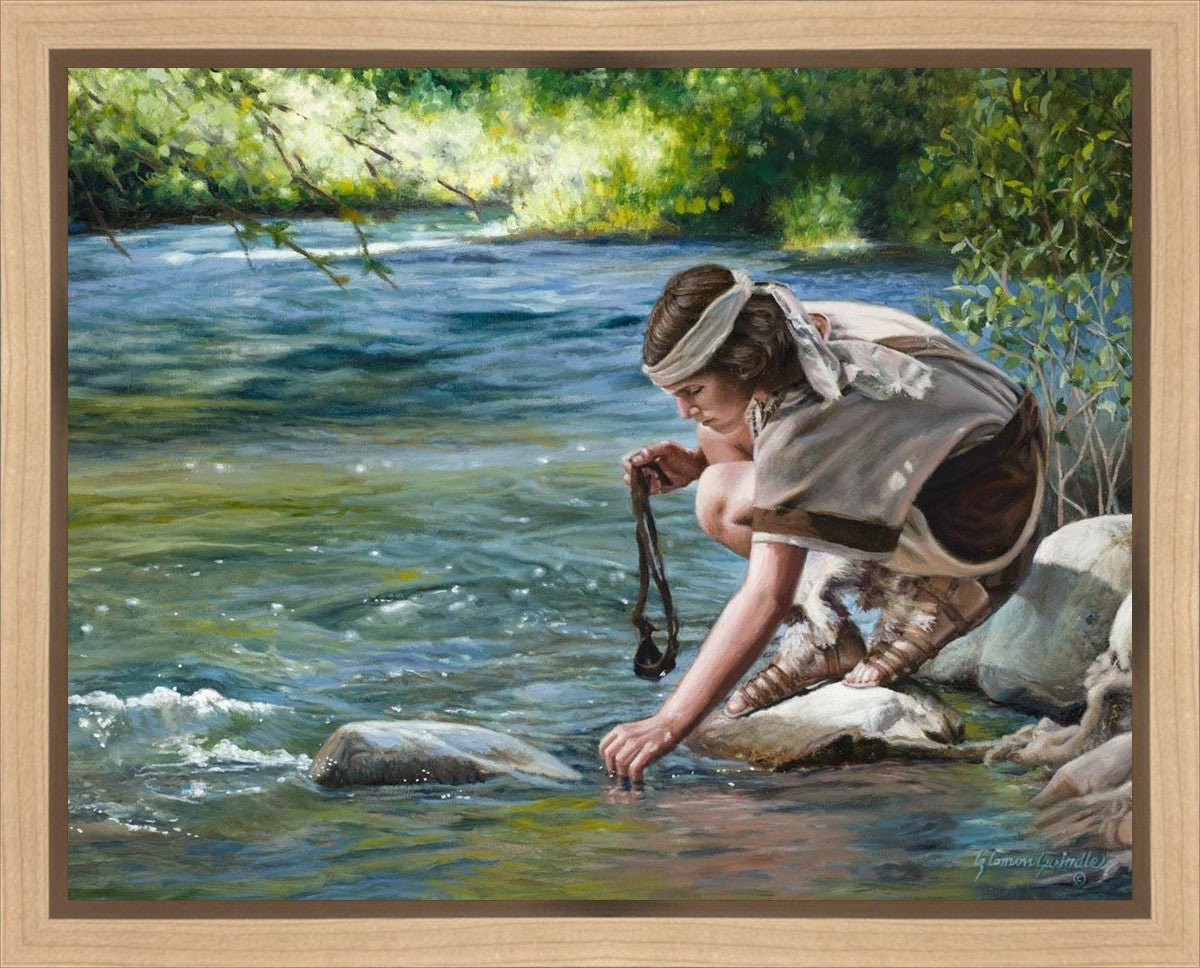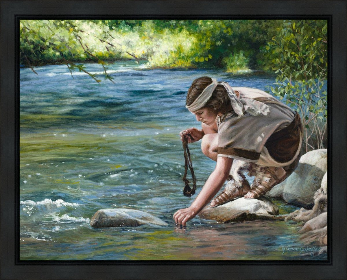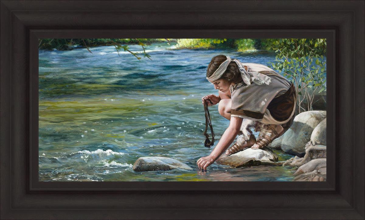 The painting Faith to Prepare by Liz Lemon Swindle portrays David selecting stones for his battle against Goliath. The Bible tells us that the Isrealite nation was in a battle with the Philistine people. Goliath was the champion for the Philistines. He challenged the Isrealite people daily and all the men were affraid of him. Who shall we send as our chamopion, asked King Saul. David, a young boy of about 12 years old, volunteered. With his leather sling, a single small stone, and great faith in God, David slayed the giant. This image reminds us that we can do the same with a bit of faith and preperation.