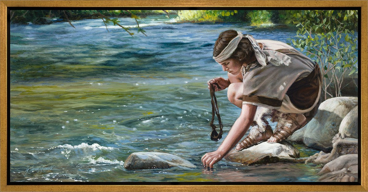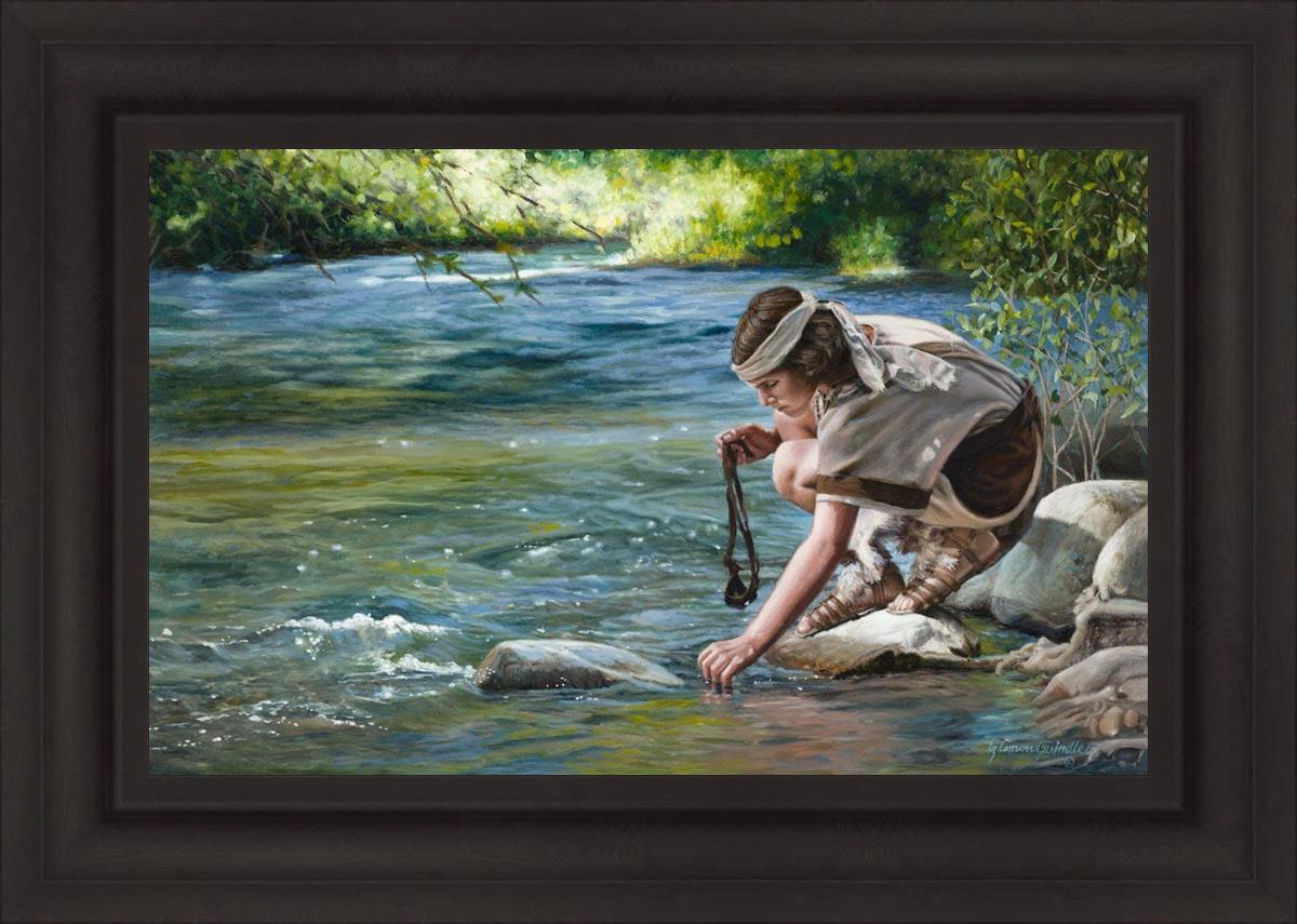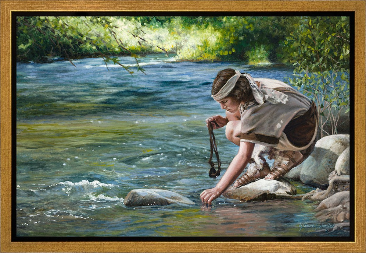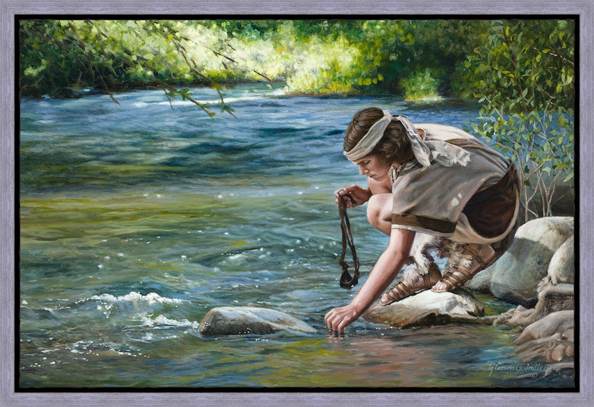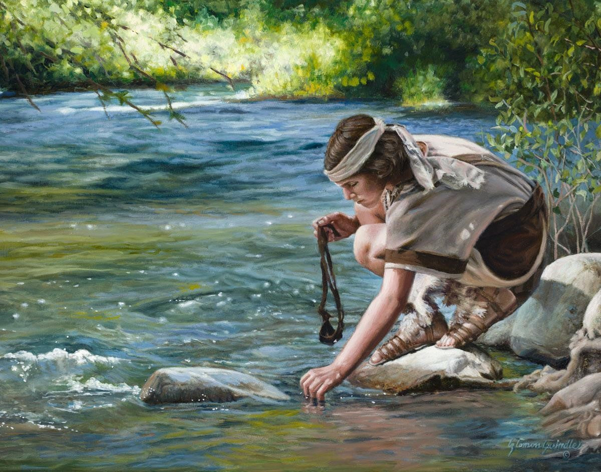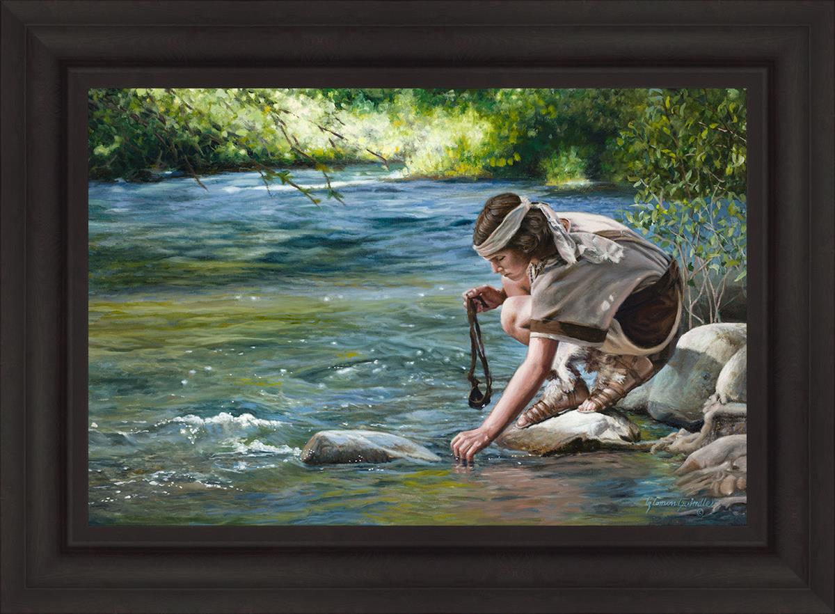 The painting Faith to Prepare by Liz Lemon Swindle portrays David selecting stones for his battle against Goliath. The Bible tells us that the Isrealite nation was in a battle with the Philistine people. Goliath was the champion for the Philistines. He challenged the Isrealite people daily and all the men were affraid of him. Who shall we send as our chamopion, asked King Saul. David, a young boy of about 12 years old, volunteered. With his leather sling, a single small stone, and great faith in God, David slayed the giant. This image reminds us that we can do the same with a bit of faith and preperation.