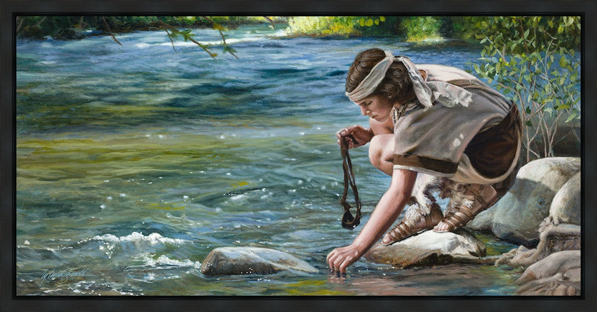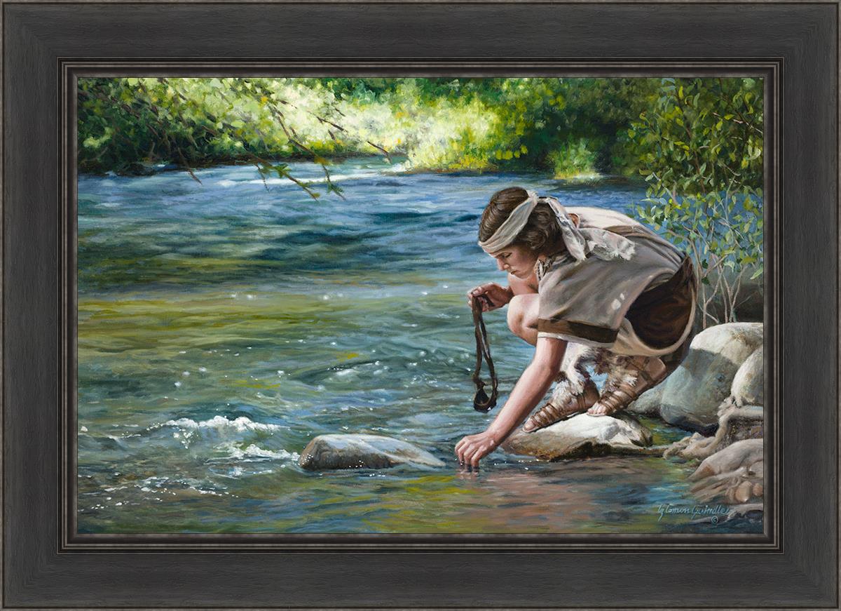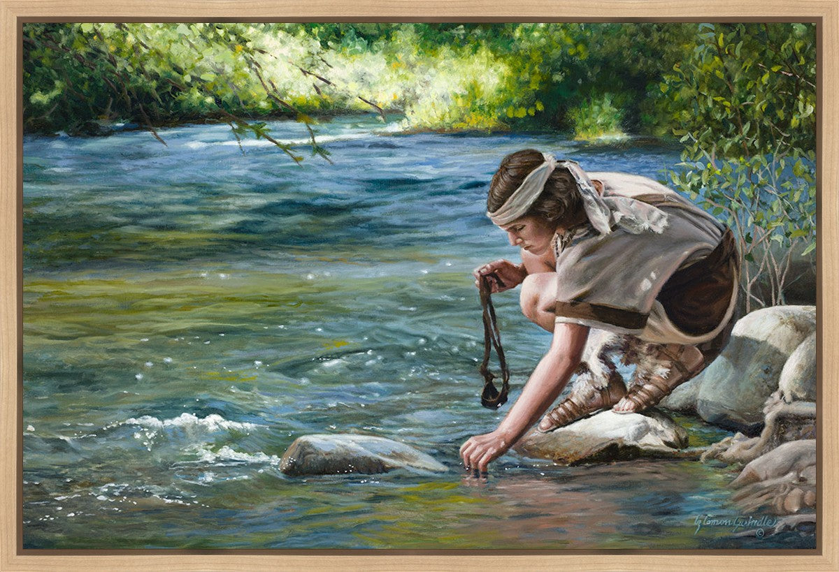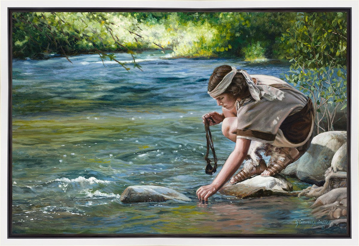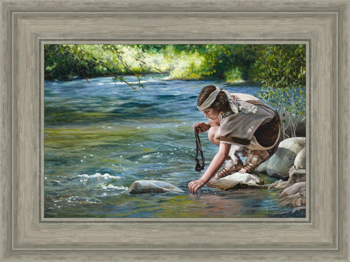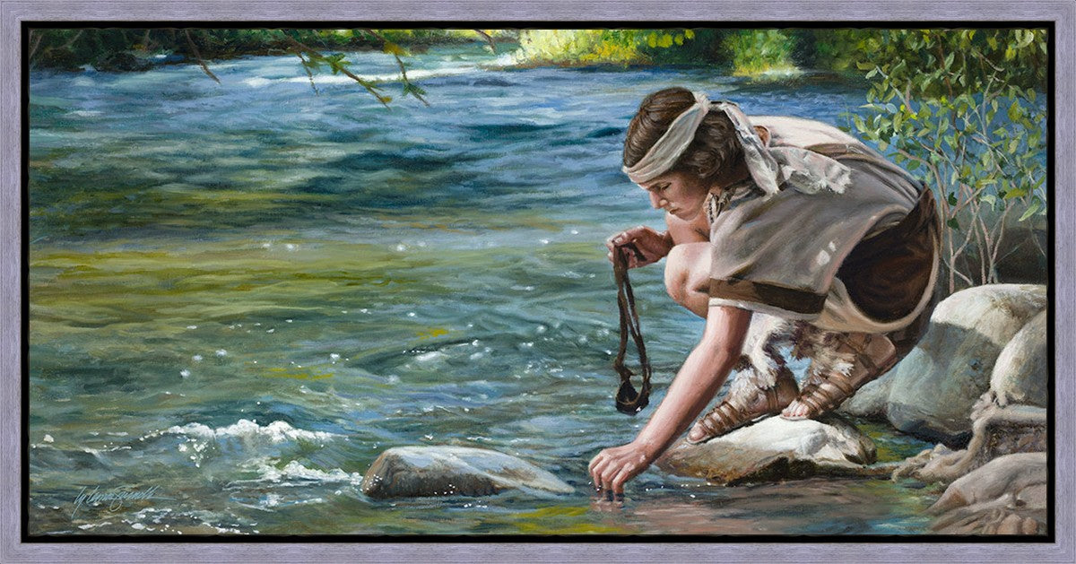 The painting Faith to Prepare by Liz Lemon Swindle portrays David selecting stones for his battle against Goliath. The Bible tells us that the Isrealite nation was in a battle with the Philistine people. Goliath was the champion for the Philistines. He challenged the Isrealite people daily and all the men were affraid of him. Who shall we send as our chamopion, asked King Saul. David, a young boy of about 12 years old, volunteered. With his leather sling, a single small stone, and great faith in God, David slayed the giant. This image reminds us that we can do the same with a bit of faith and preperation.