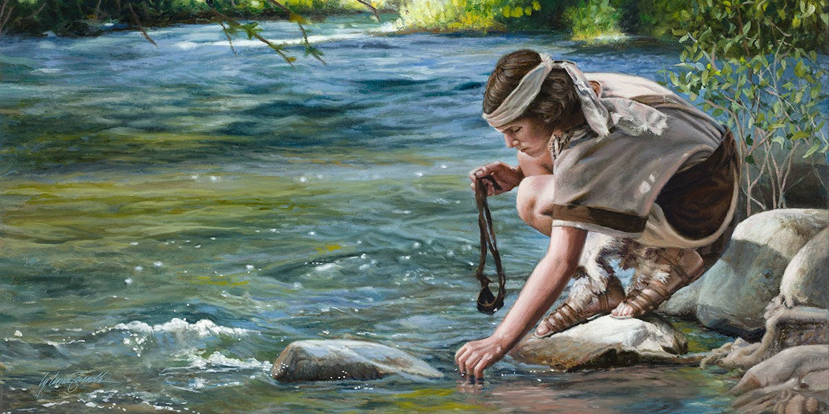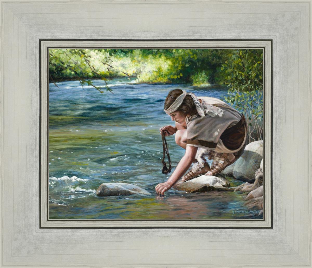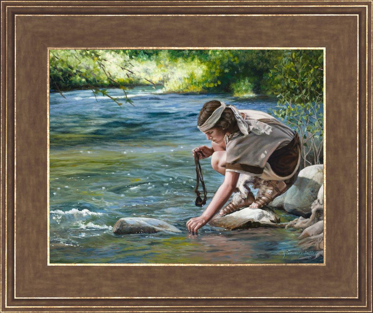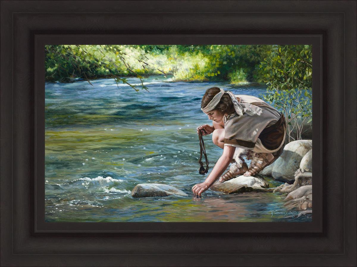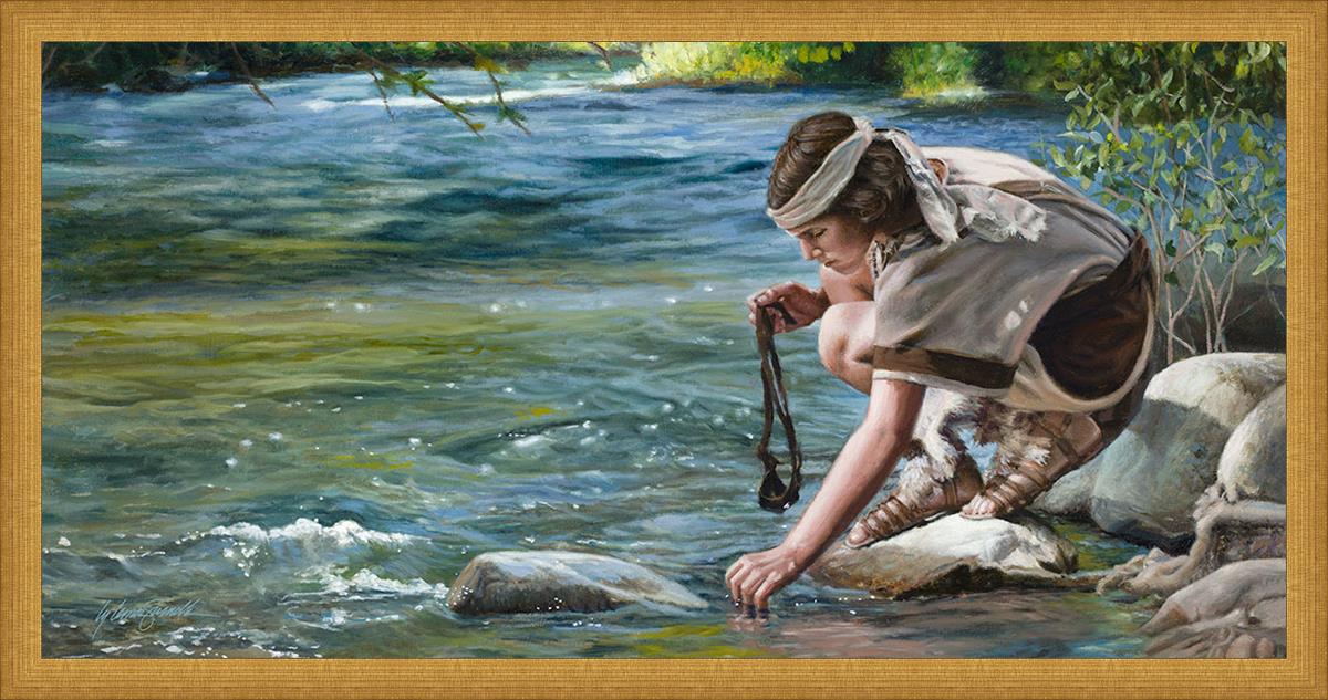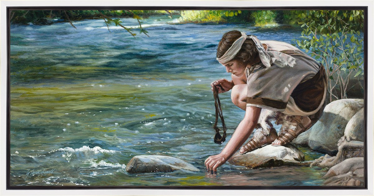 The painting Faith to Prepare by Liz Lemon Swindle portrays David selecting stones for his battle against Goliath. The Bible tells us that the Isrealite nation was in a battle with the Philistine people. Goliath was the champion for the Philistines. He challenged the Isrealite people daily and all the men were affraid of him. Who shall we send as our chamopion, asked King Saul. David, a young boy of about 12 years old, volunteered. With his leather sling, a single small stone, and great faith in God, David slayed the giant. This image reminds us that we can do the same with a bit of faith and preperation.
