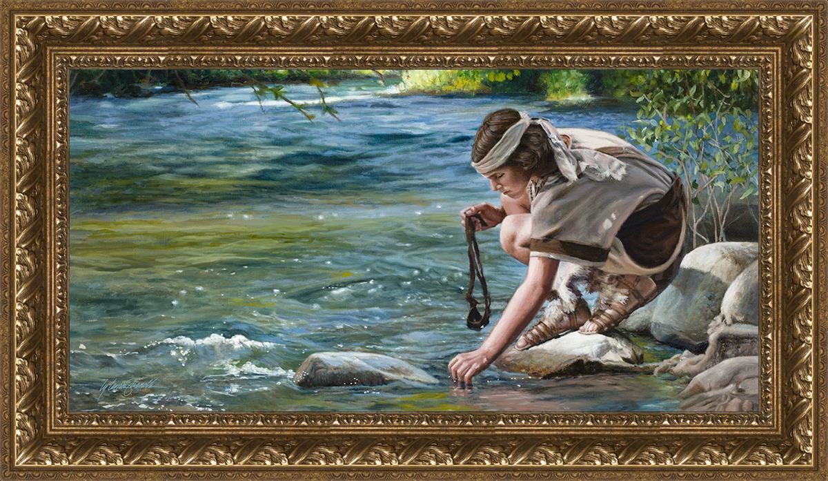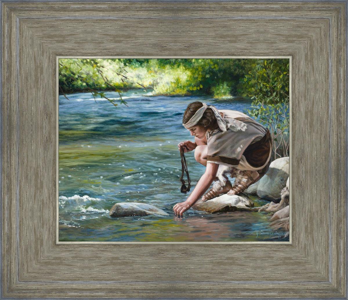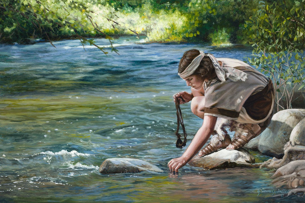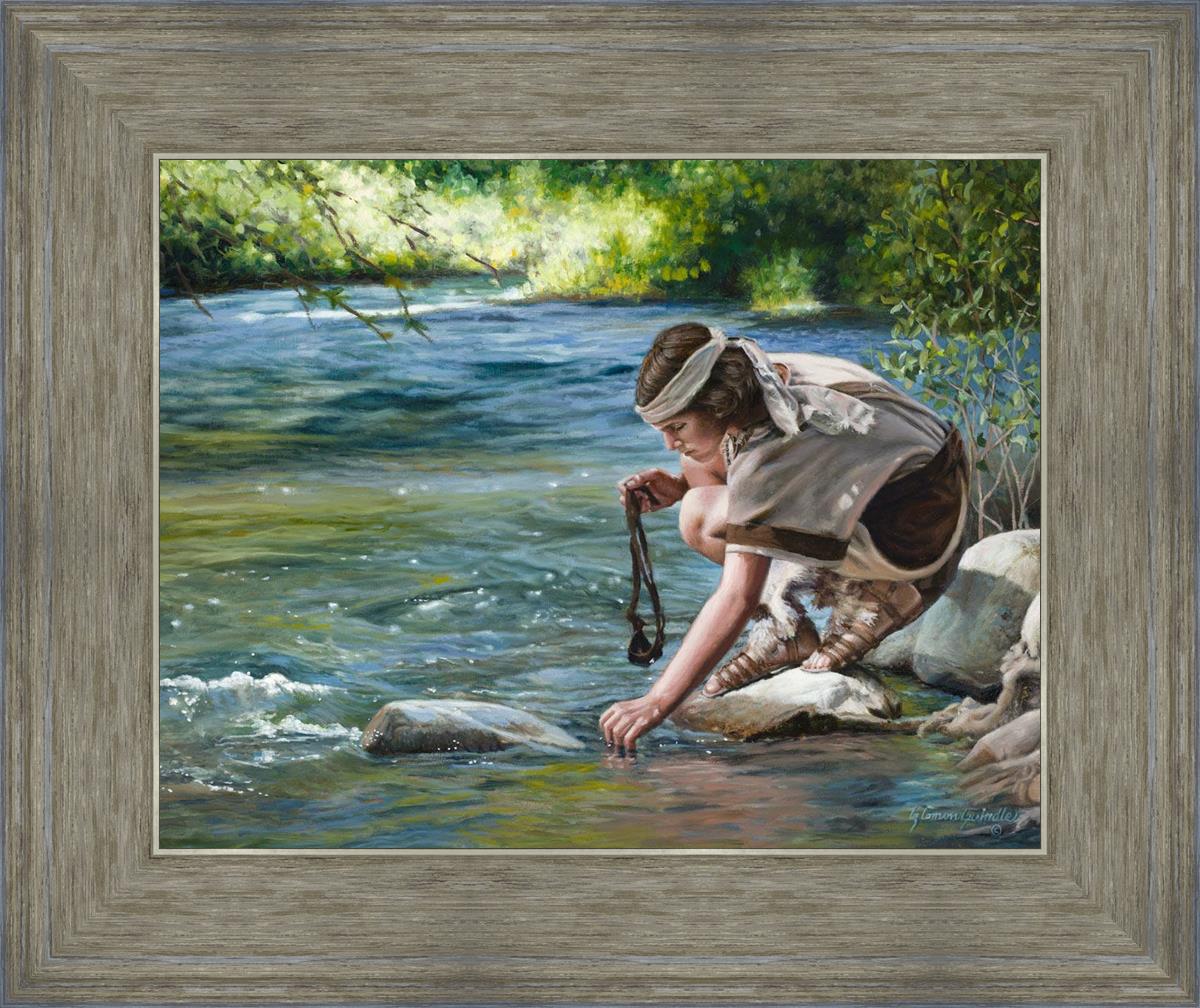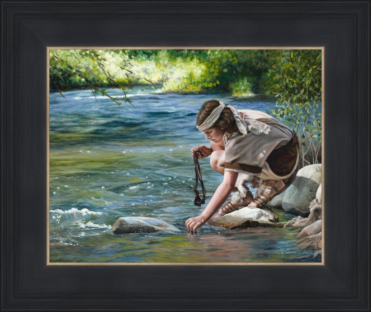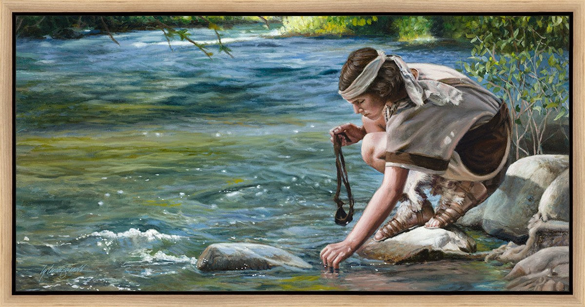The painting Faith to Prepare by Liz Lemon Swindle portrays David selecting stones for his battle against Goliath. The Bible tells us that the Isrealite nation was in a battle with the Philistine people. Goliath was the champion for the Philistines. He challenged the Isrealite people daily and all the men were affraid of him. Who shall we send as our chamopion, asked King Saul. David, a young boy of about 12 years old, volunteered. With his leather sling, a single small stone, and great faith in God, David slayed the giant. This image reminds us that we can do the same with a bit of faith and preperation.
