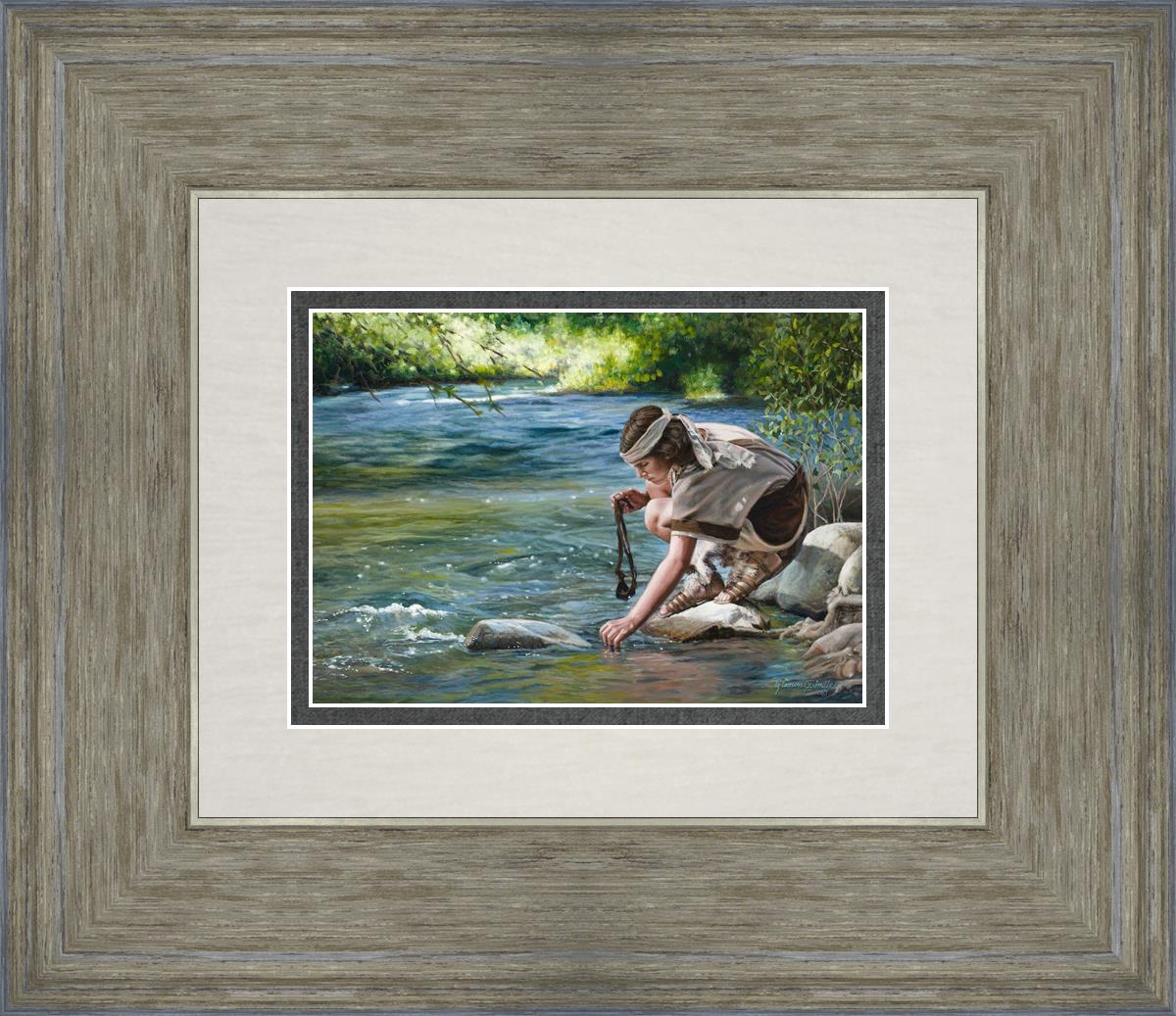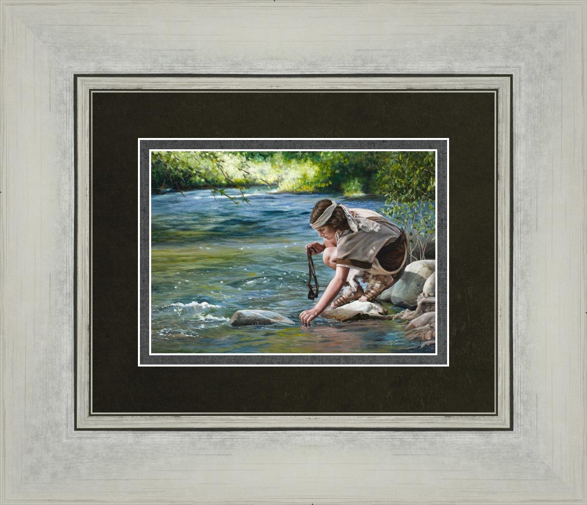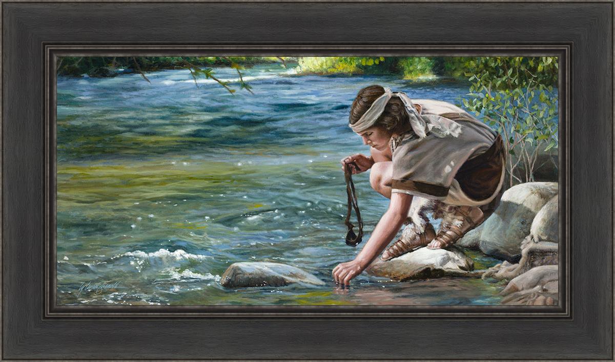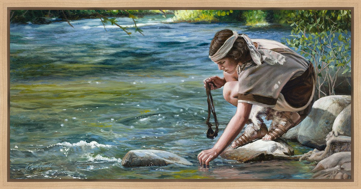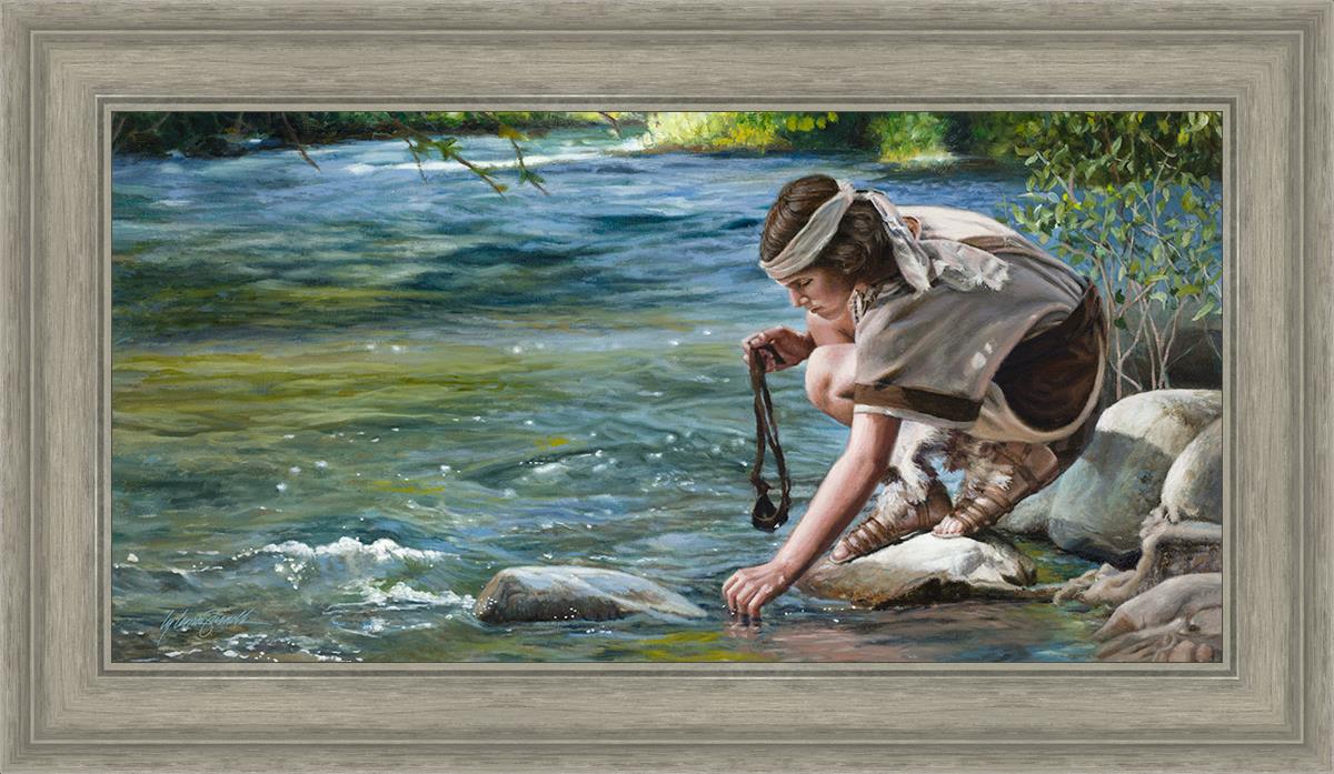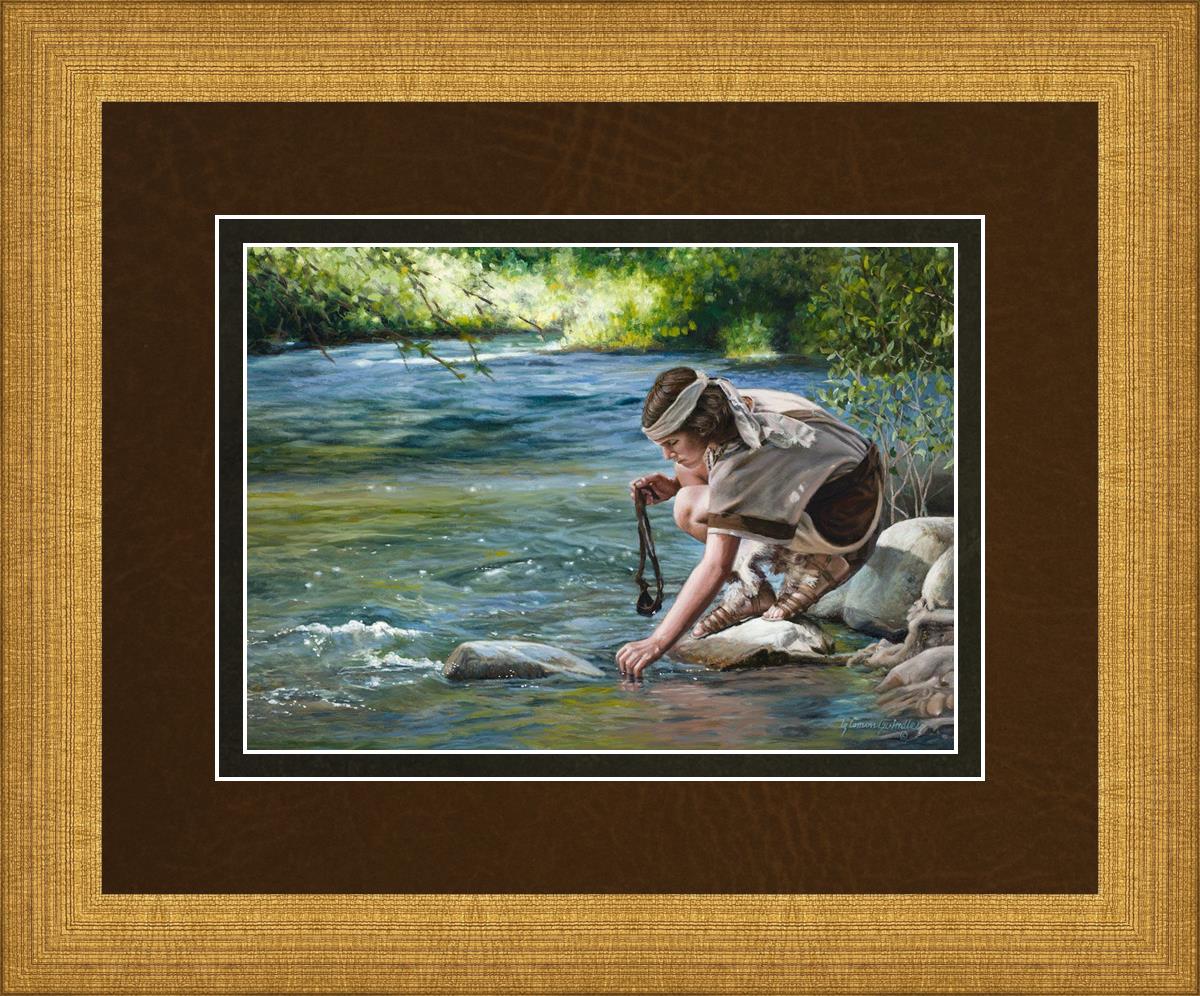 The painting Faith to Prepare by Liz Lemon Swindle portrays David selecting stones for his battle against Goliath. The Bible tells us that the Isrealite nation was in a battle with the Philistine people. Goliath was the champion for the Philistines. He challenged the Isrealite people daily and all the men were affraid of him. Who shall we send as our chamopion, asked King Saul. David, a young boy of about 12 years old, volunteered. With his leather sling, a single small stone, and great faith in God, David slayed the giant. This image reminds us that we can do the same with a bit of faith and preperation.
