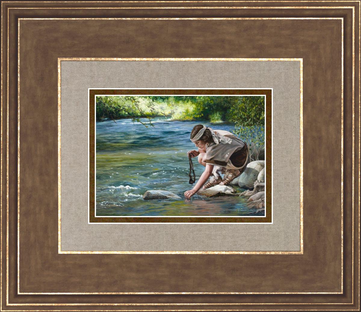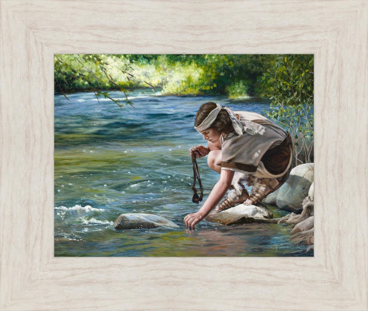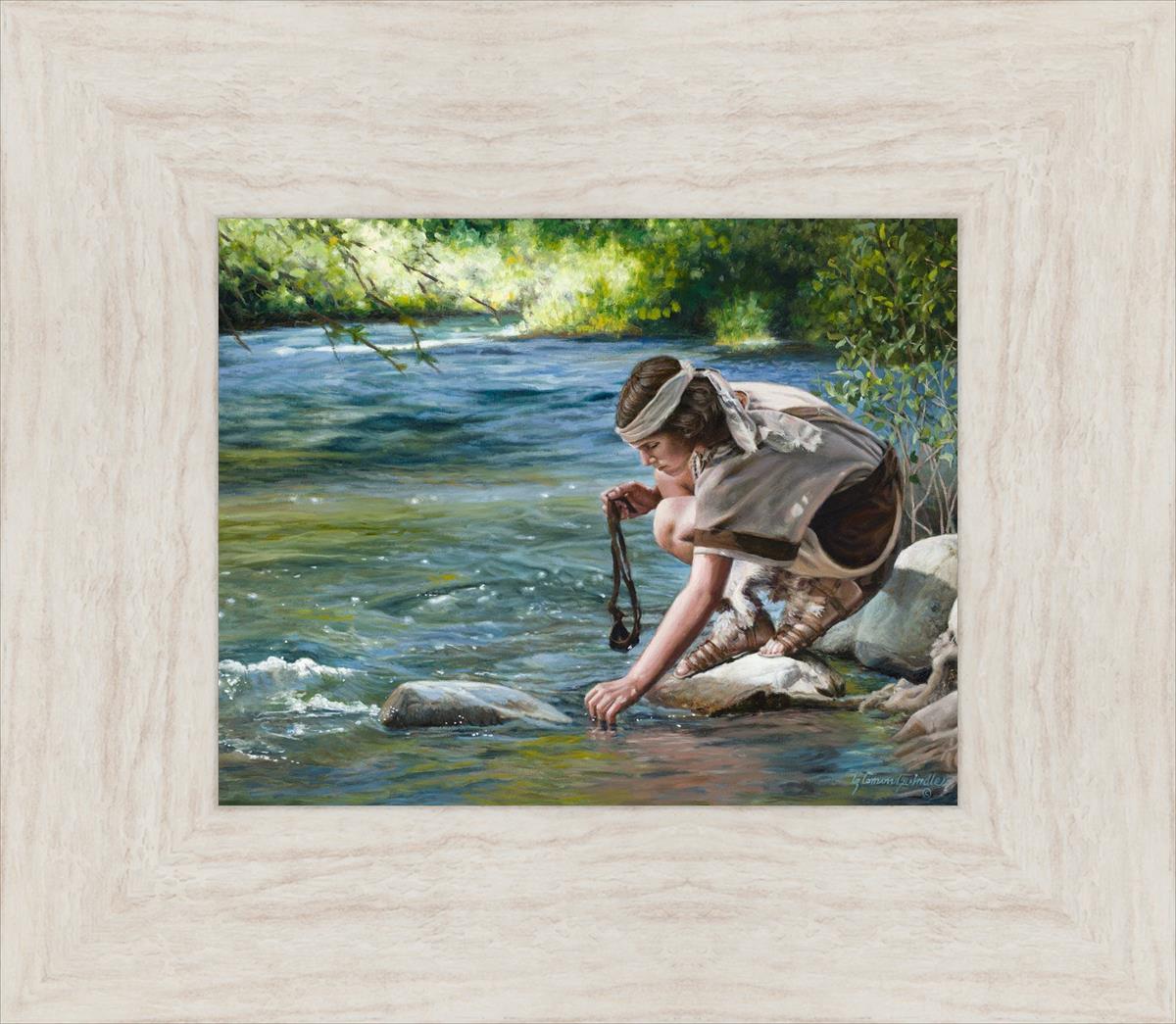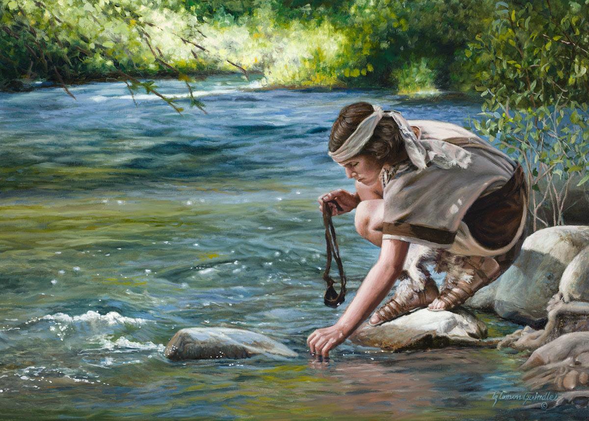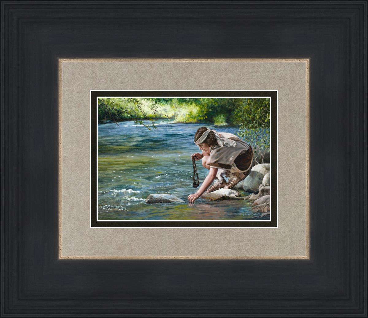 The painting Faith to Prepare by Liz Lemon Swindle portrays David selecting stones for his battle against Goliath. The Bible tells us that the Isrealite nation was in a battle with the Philistine people. Goliath was the champion for the Philistines. He challenged the Isrealite people daily and all the men were affraid of him. Who shall we send as our chamopion, asked King Saul. David, a young boy of about 12 years old, volunteered. With his leather sling, a single small stone, and great faith in God, David slayed the giant. This image reminds us that we can do the same with a bit of faith and preperation.