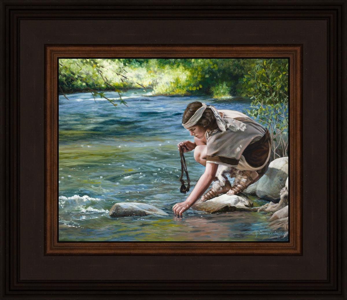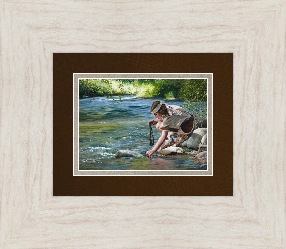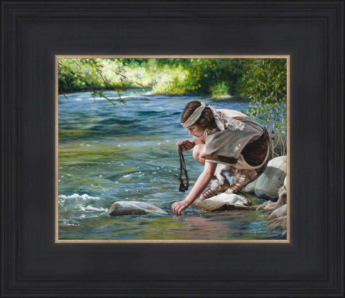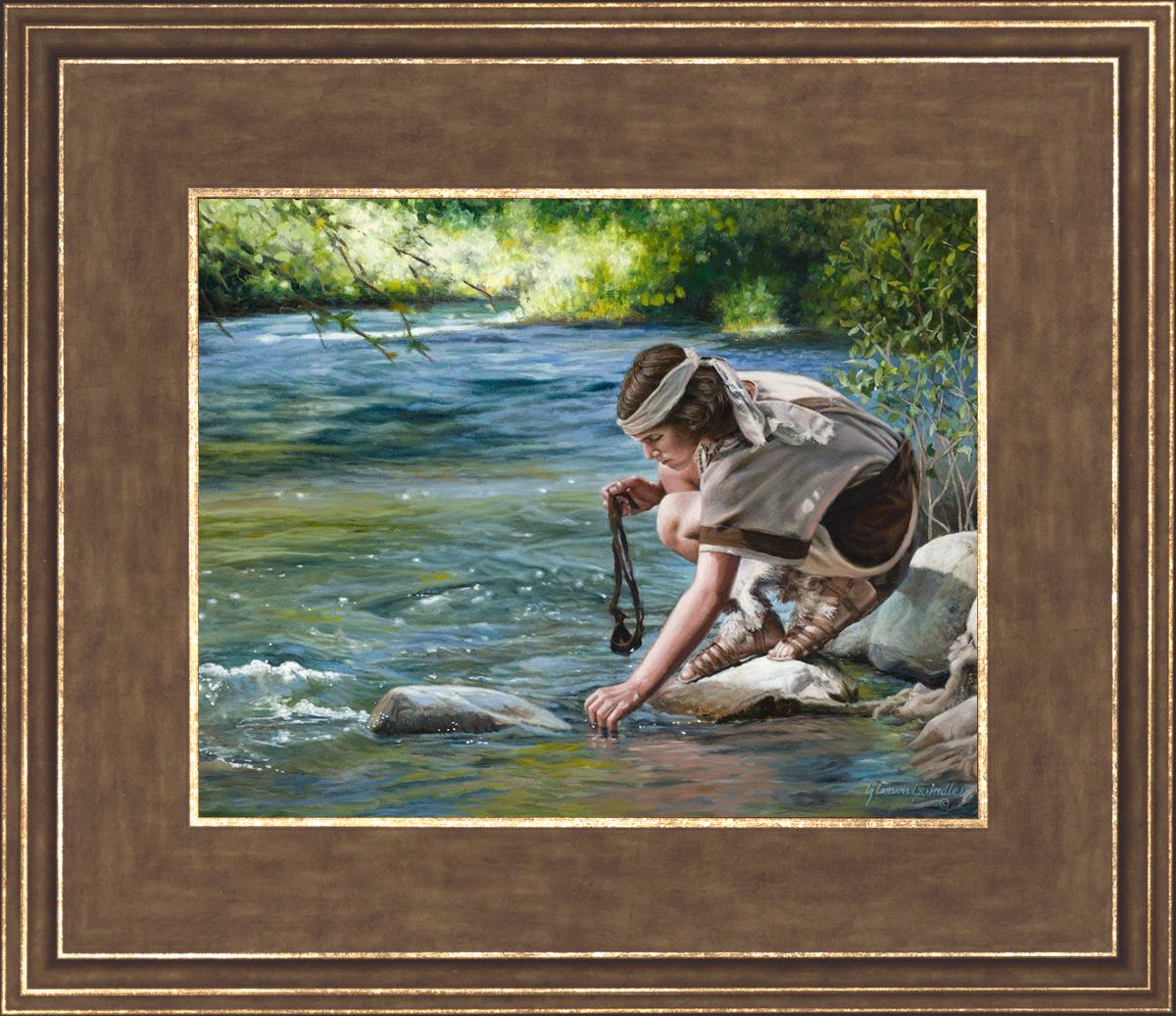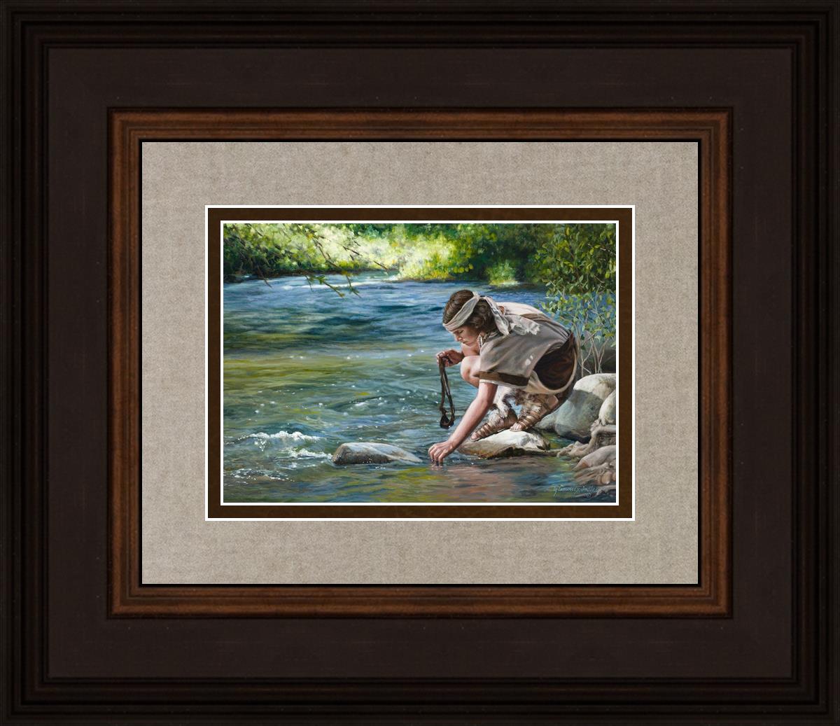The painting Faith to Prepare by Liz Lemon Swindle portrays David selecting stones for his battle against Goliath. The Bible tells us that the Isrealite nation was in a battle with the Philistine people. Goliath was the champion for the Philistines. He challenged the Isrealite people daily and all the men were affraid of him. Who shall we send as our chamopion, asked King Saul. David, a young boy of about 12 years old, volunteered. With his leather sling, a single small stone, and great faith in God, David slayed the giant. This image reminds us that we can do the same with a bit of faith and preperation.