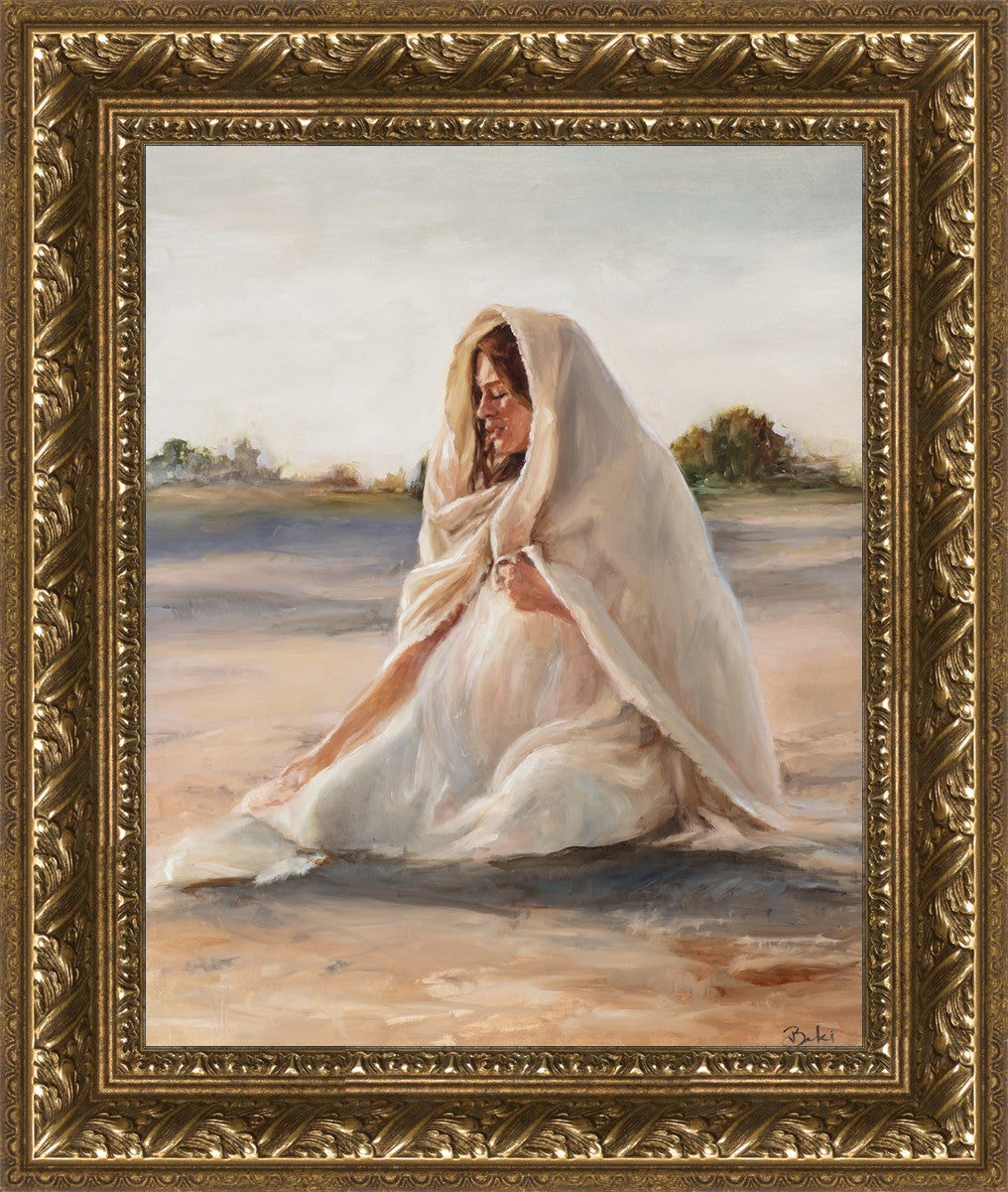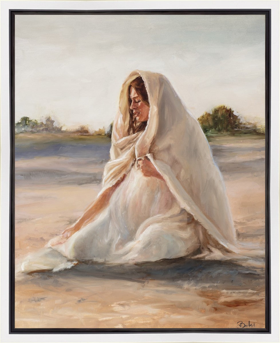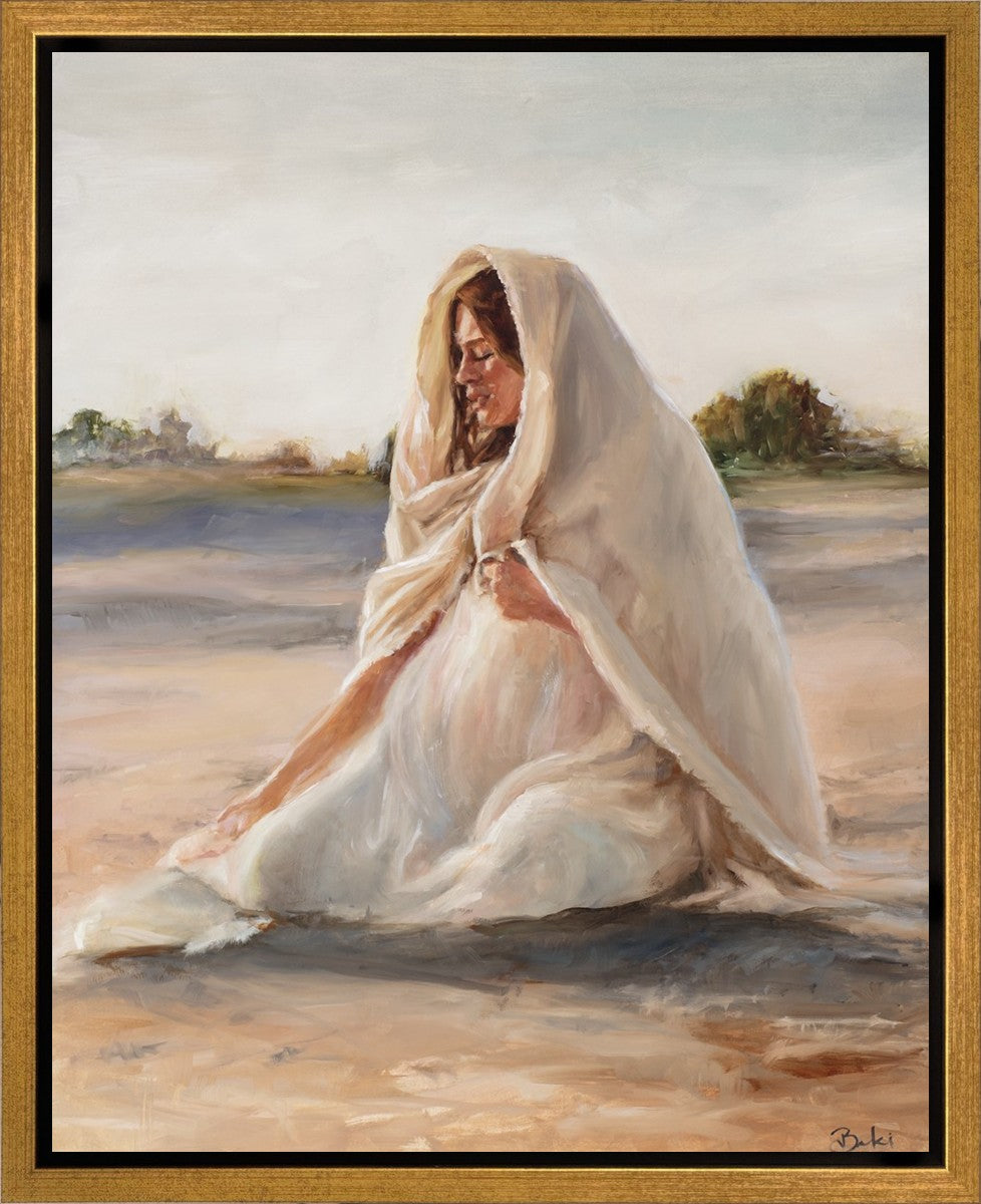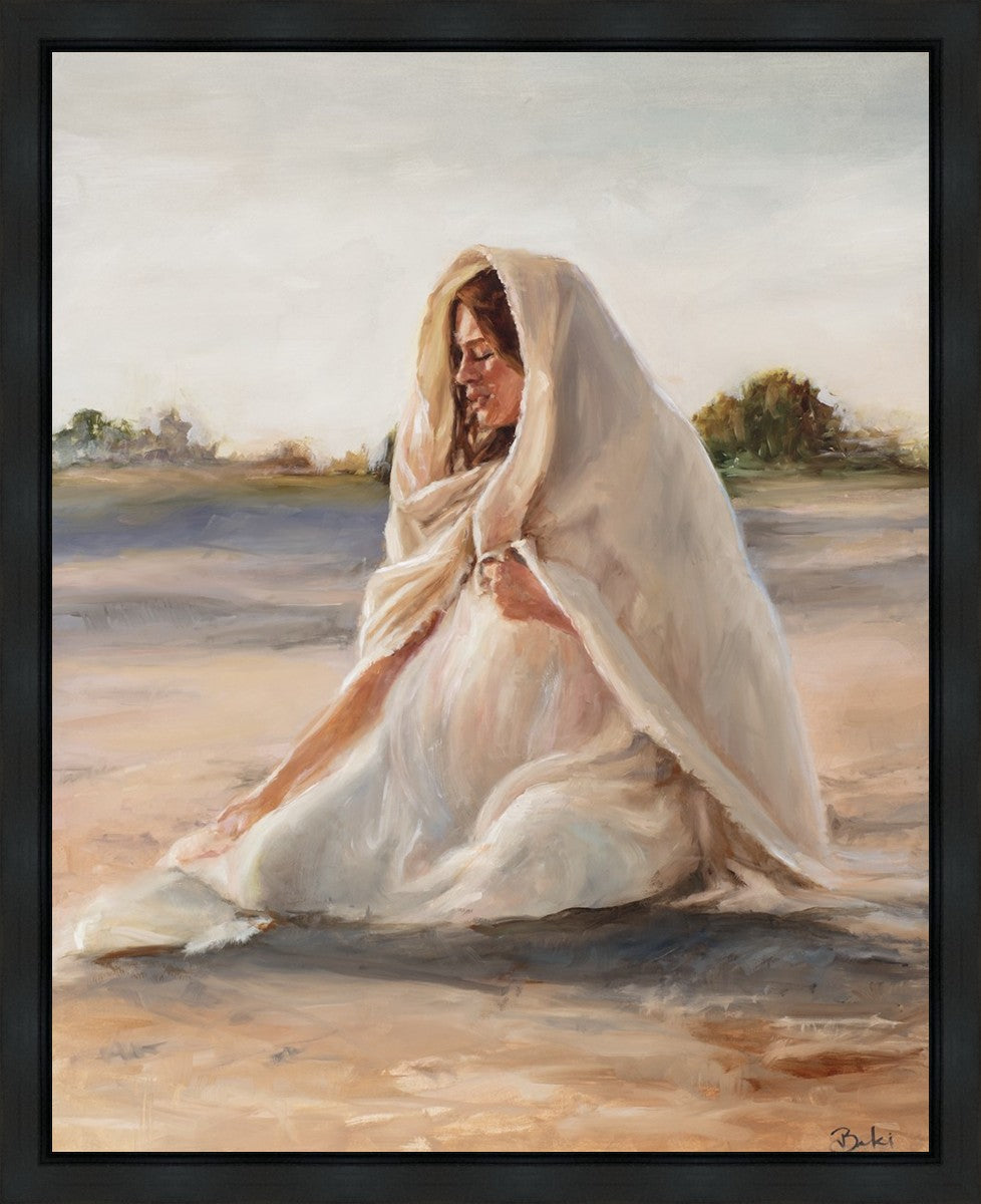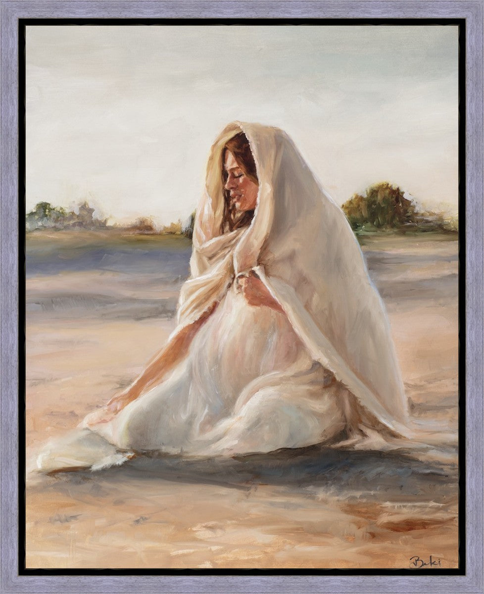 This painting is my tribute to Mary, an attempt at capturing the emotions she must have had to conquer as she prepared to travel to Bethlehem. With her time drawing near, leaving behind comfort and family support, she was about to bring the Child of God into the world.