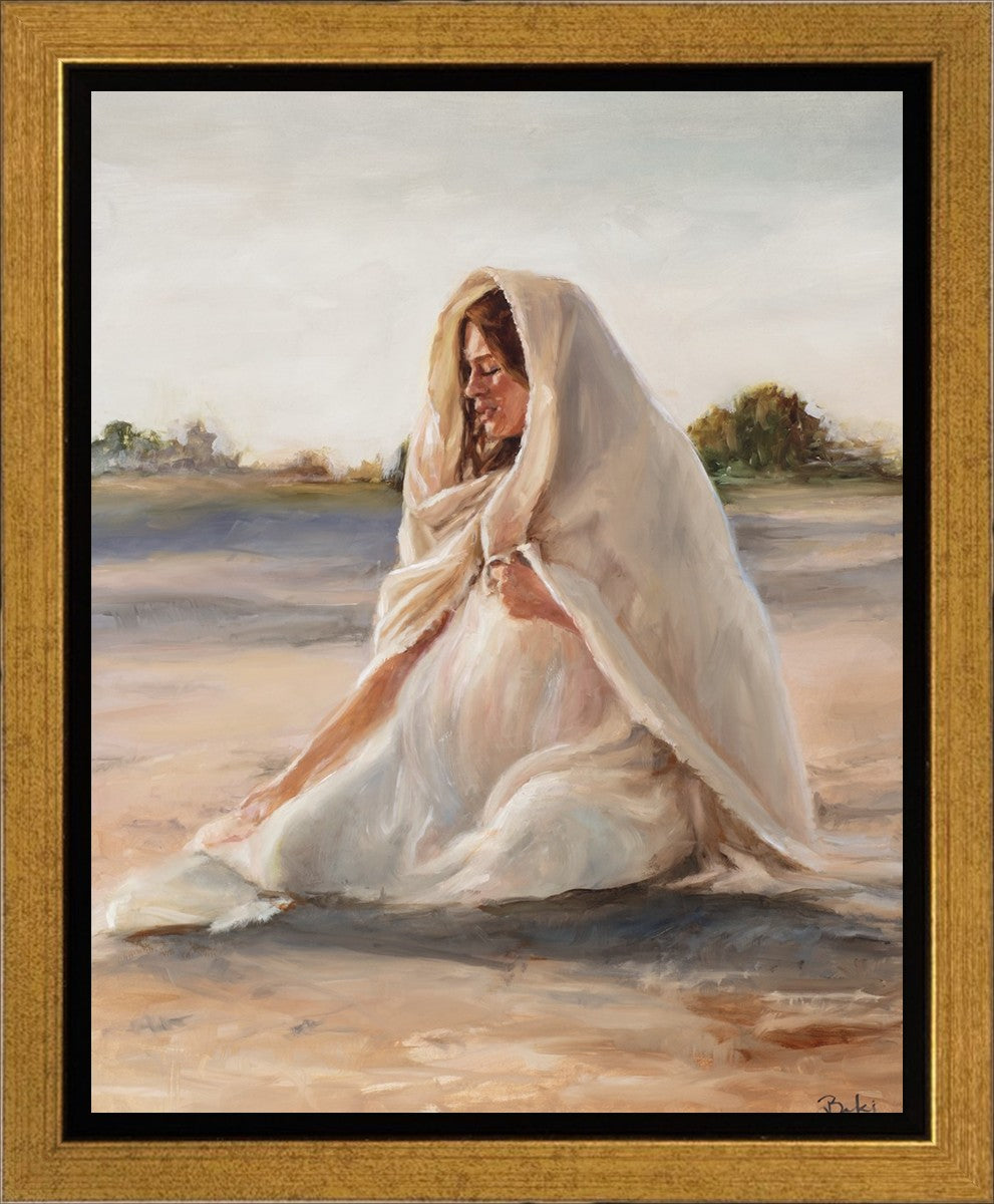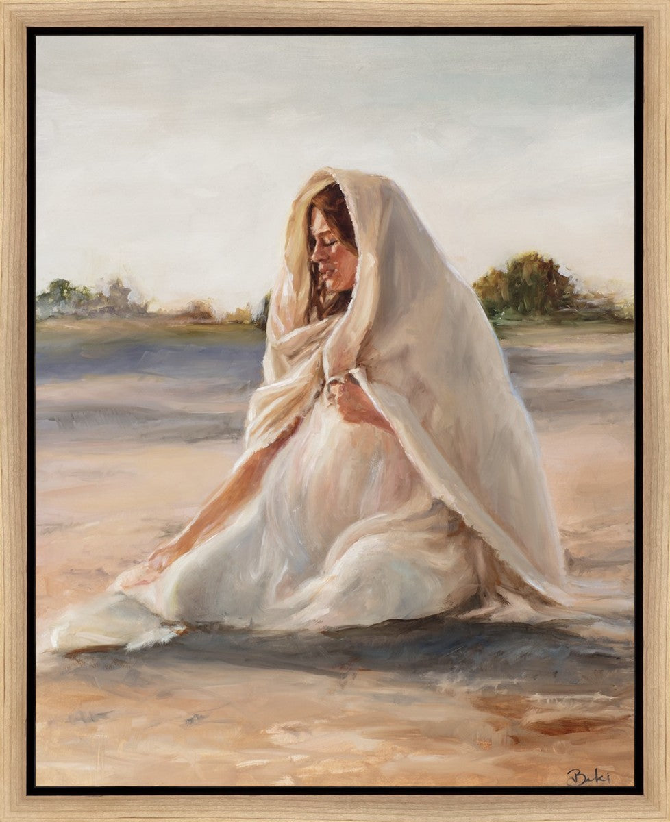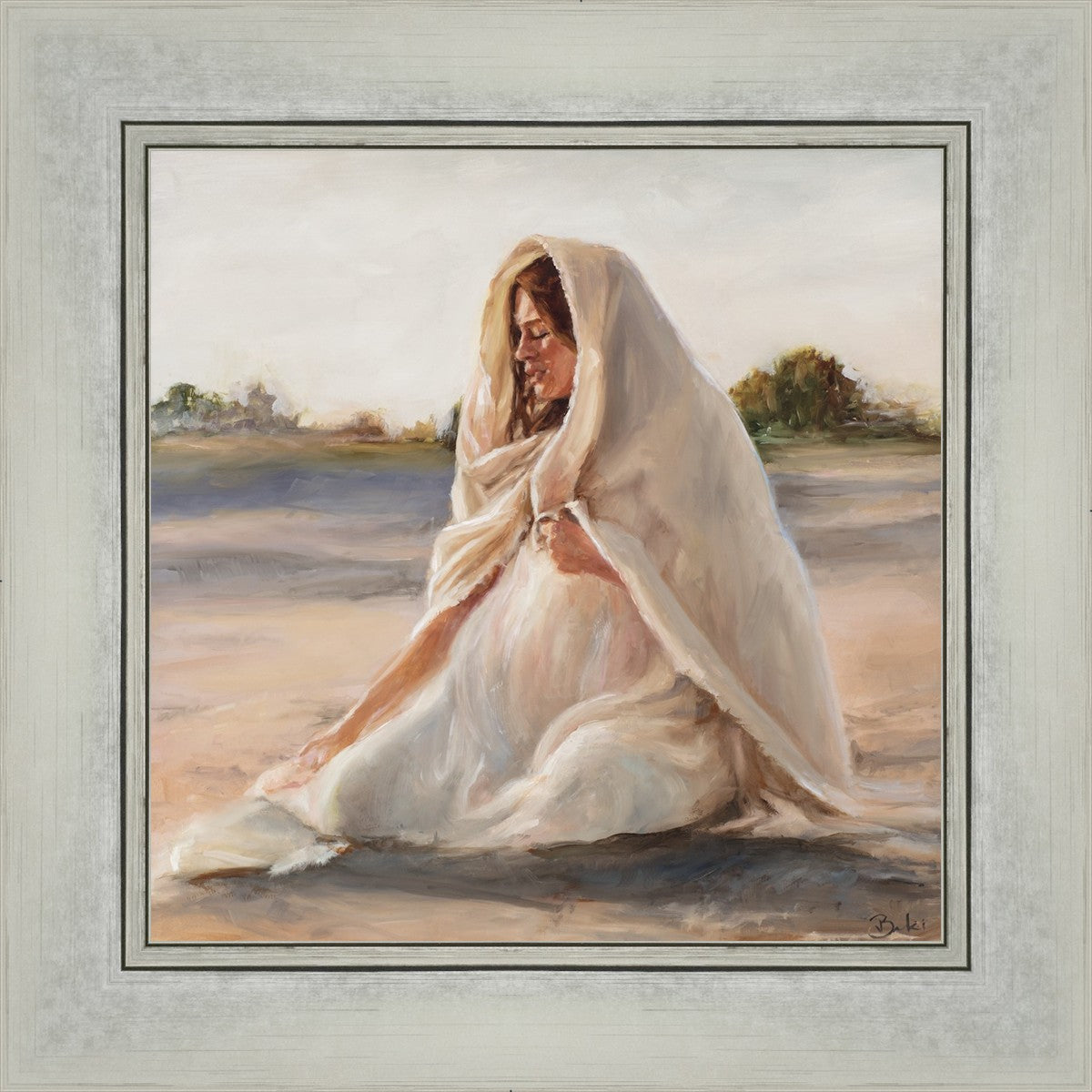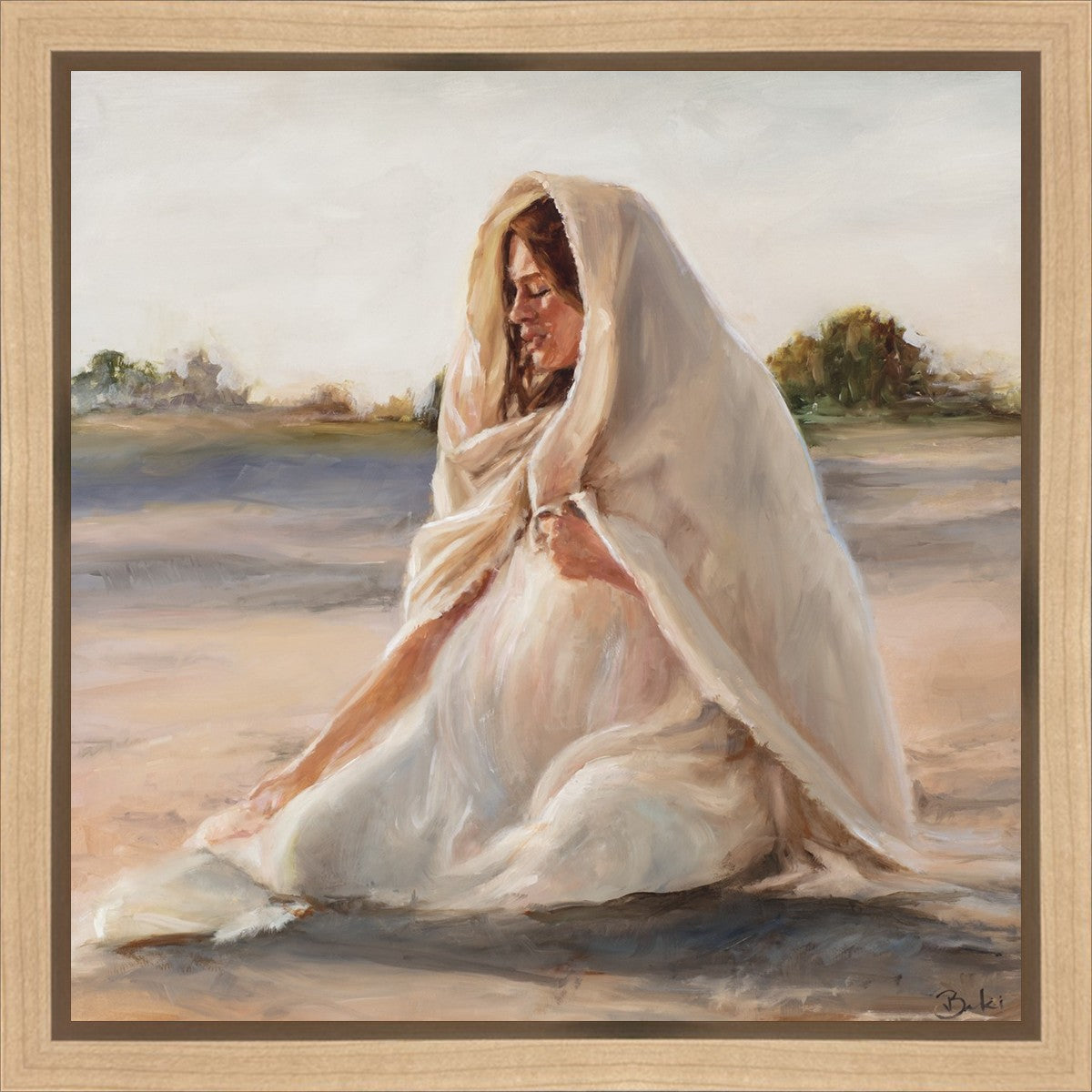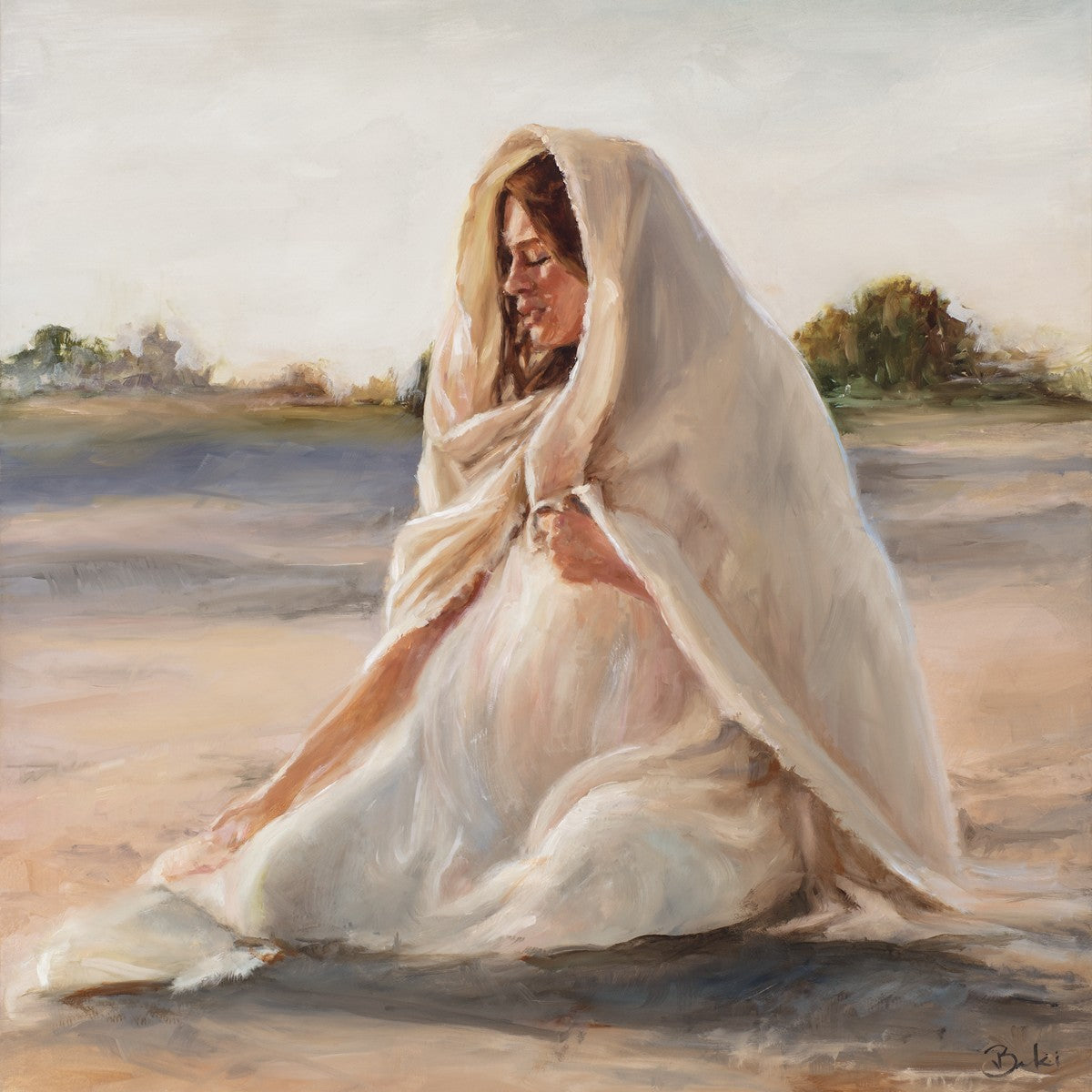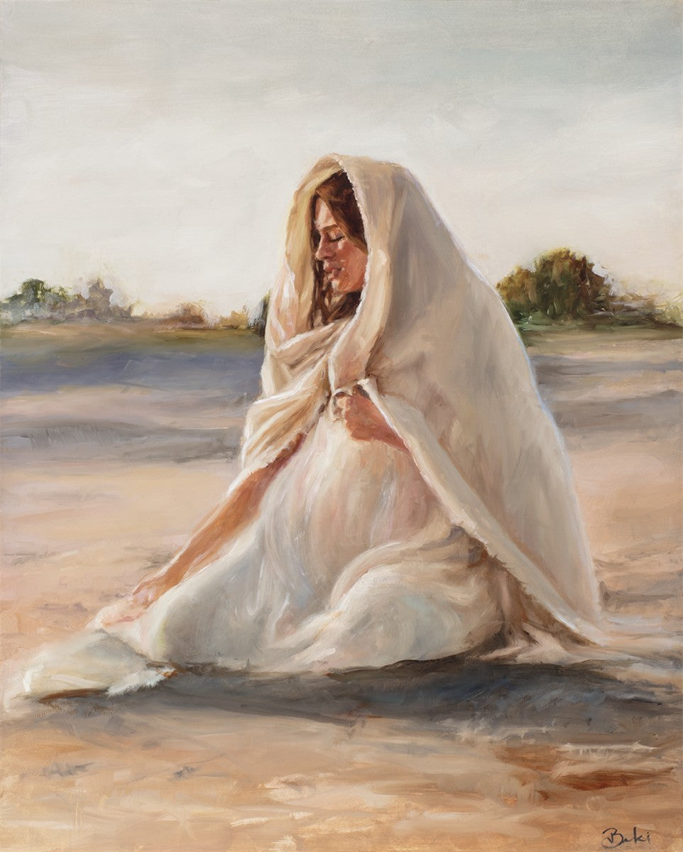 This painting is my tribute to Mary, an attempt at capturing the emotions she must have had to conquer as she prepared to travel to Bethlehem. With her time drawing near, leaving behind comfort and family support, she was about to bring the Child of God into the world.