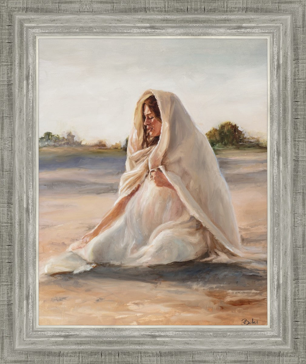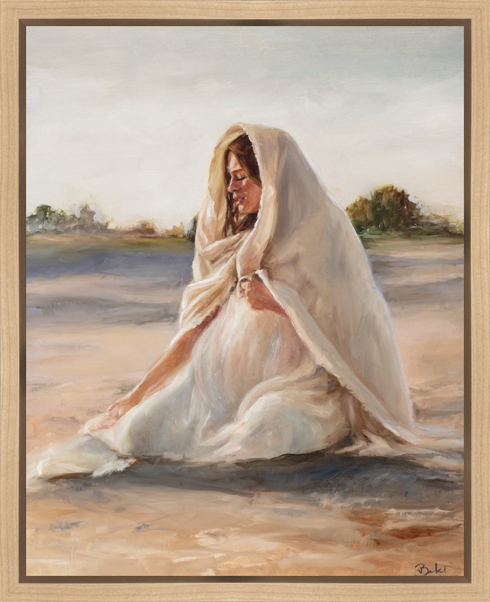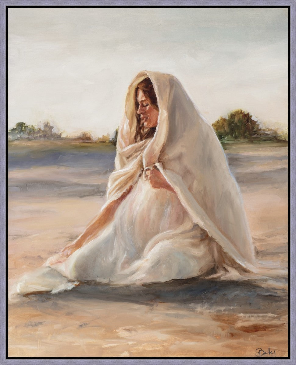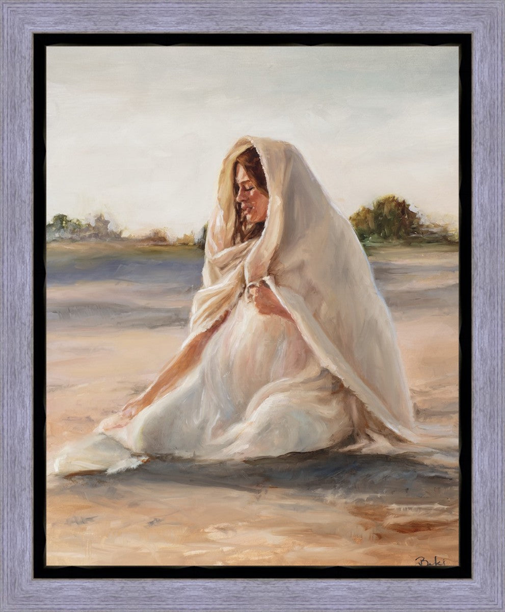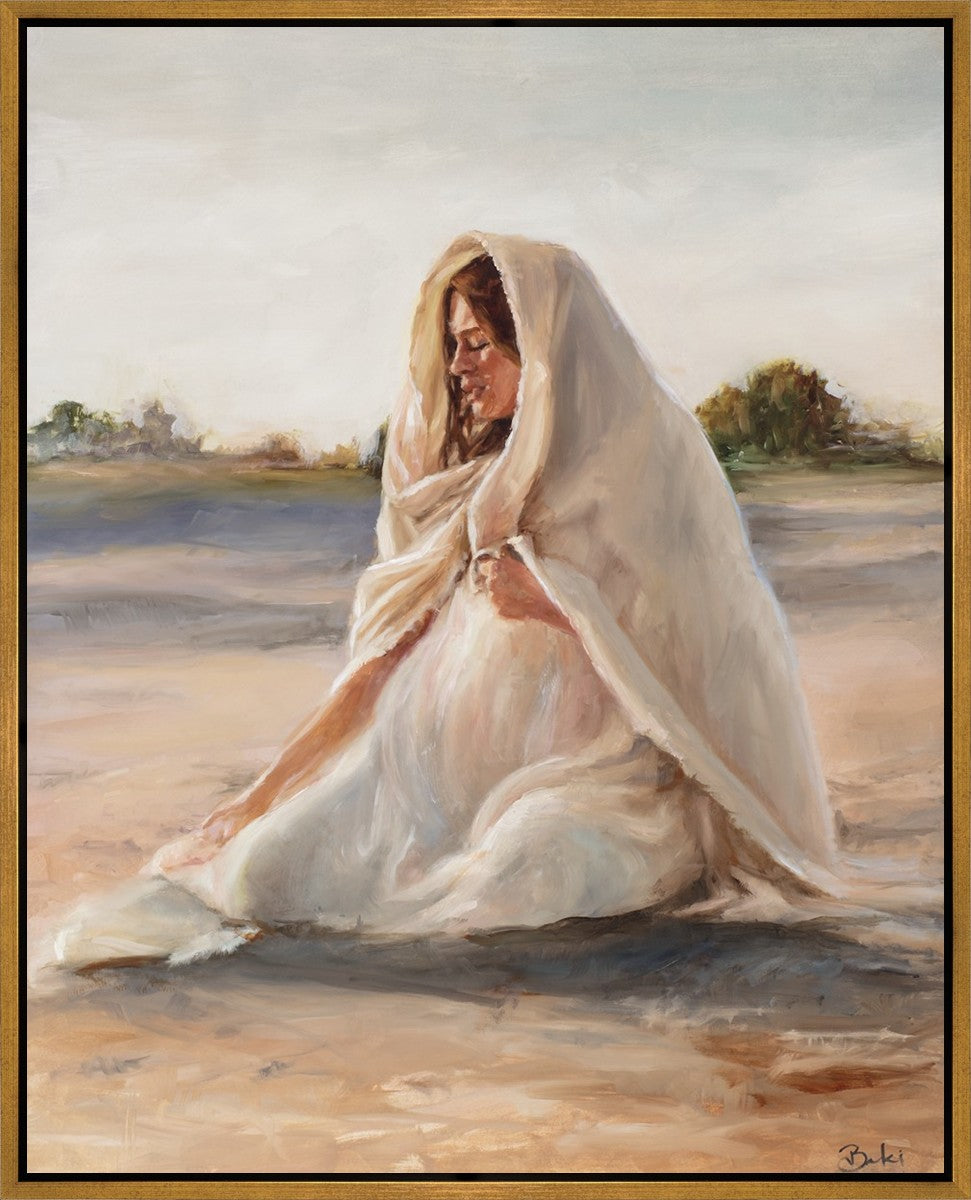This painting is my tribute to Mary, an attempt at capturing the emotions she must have had to conquer as she prepared to travel to Bethlehem. With her time drawing near, leaving behind comfort and family support, she was about to bring the Child of God into the world.