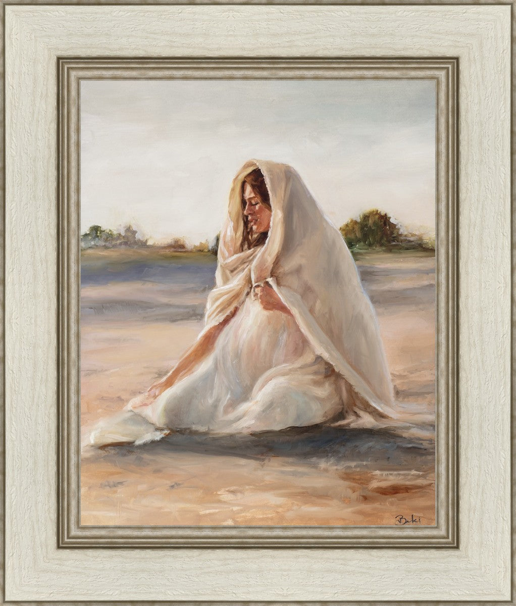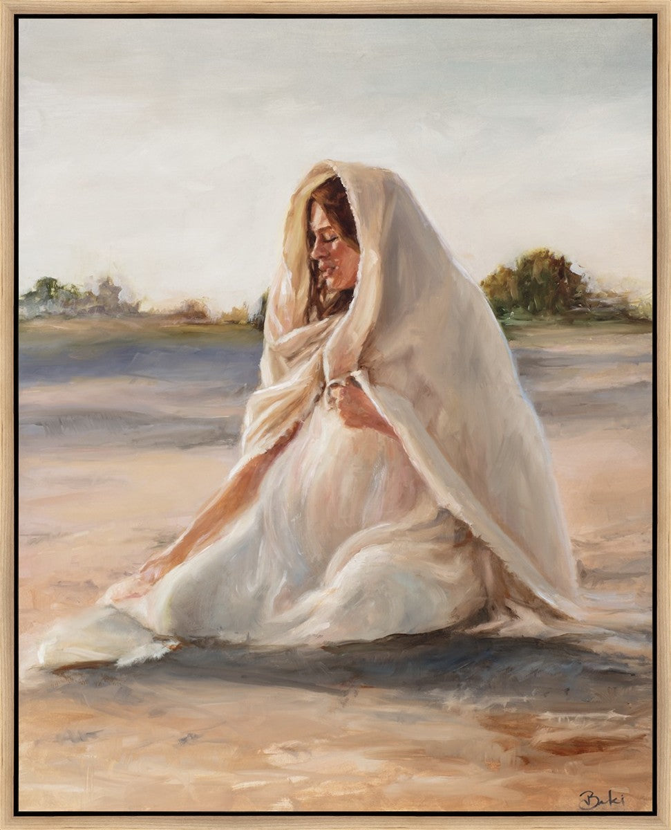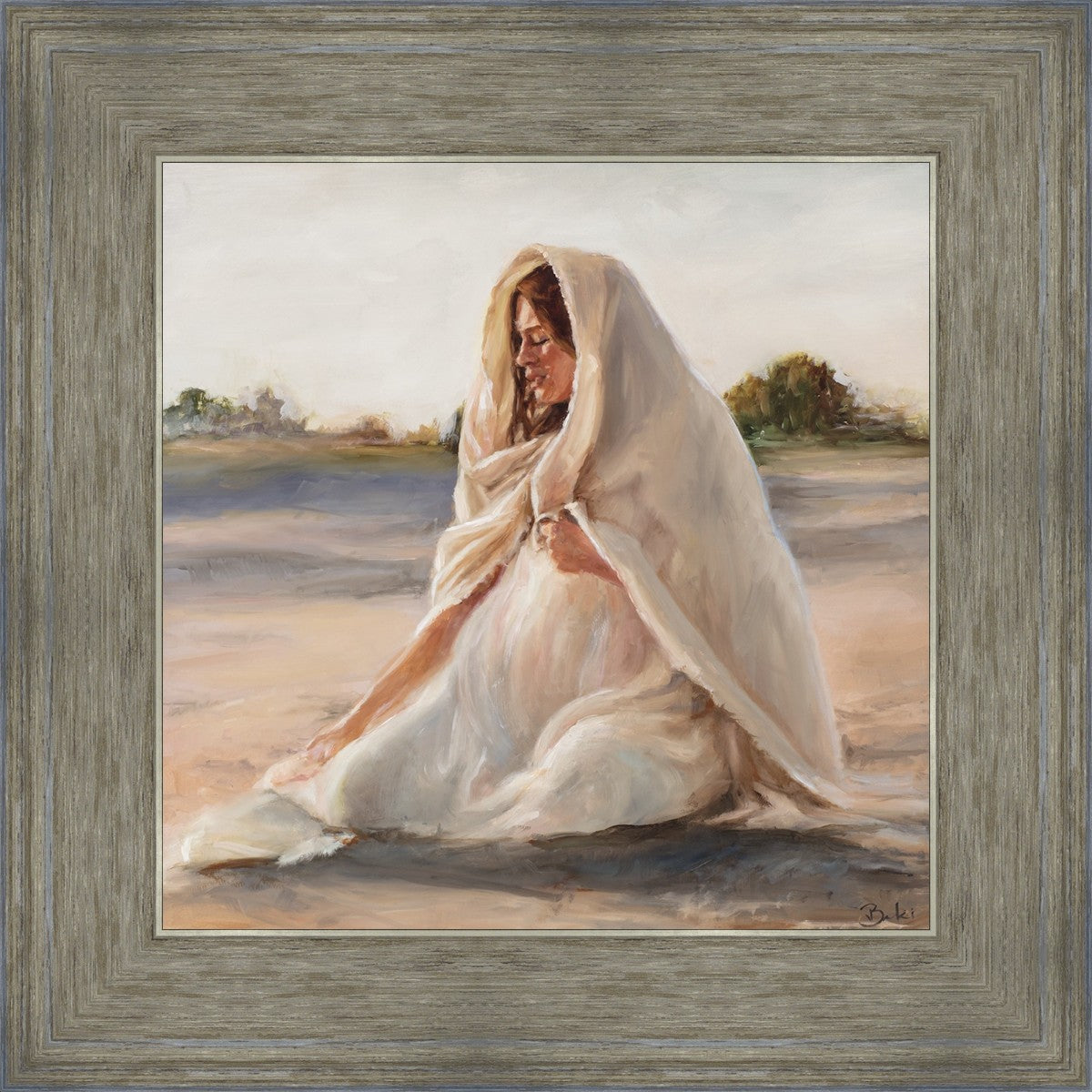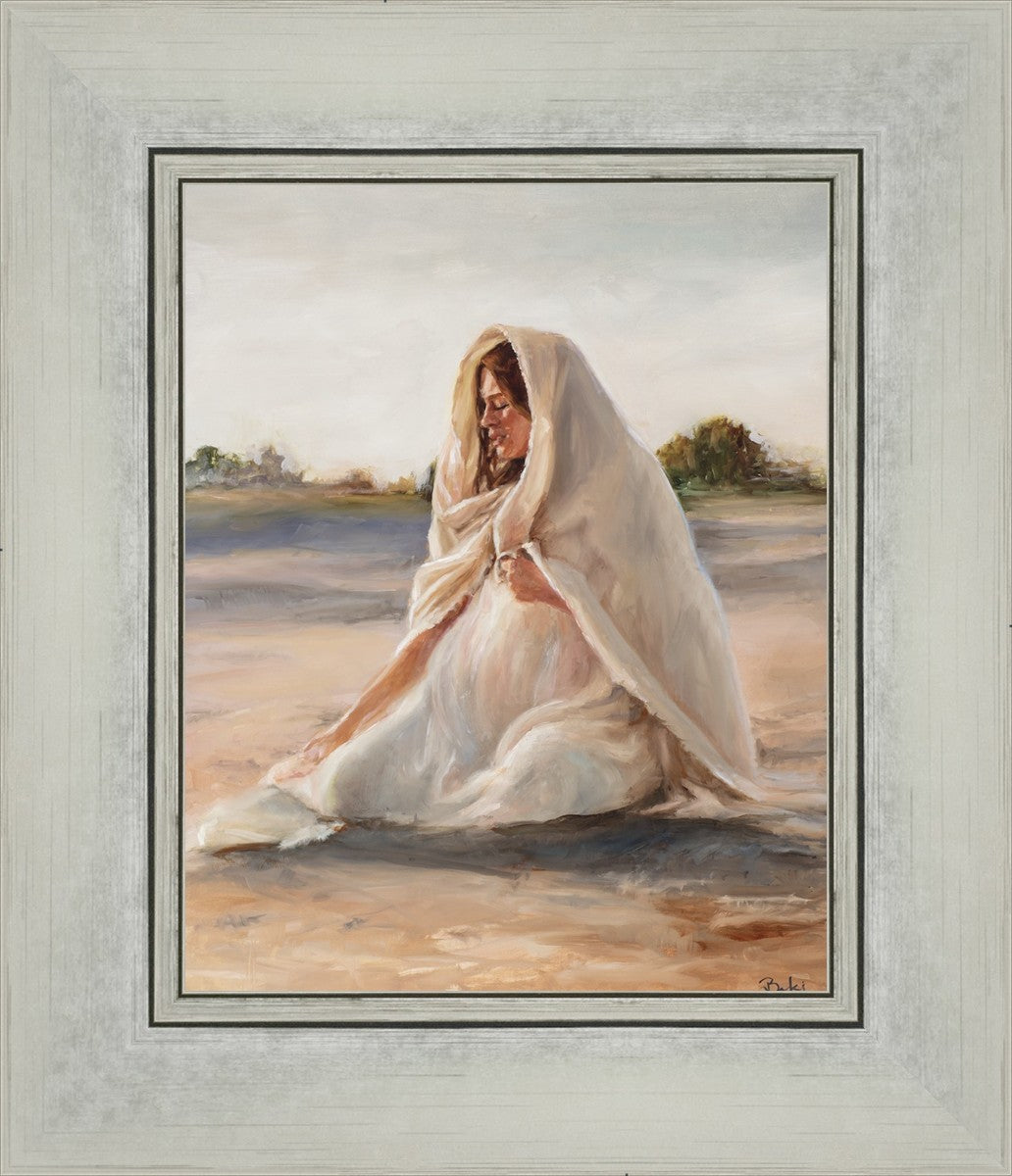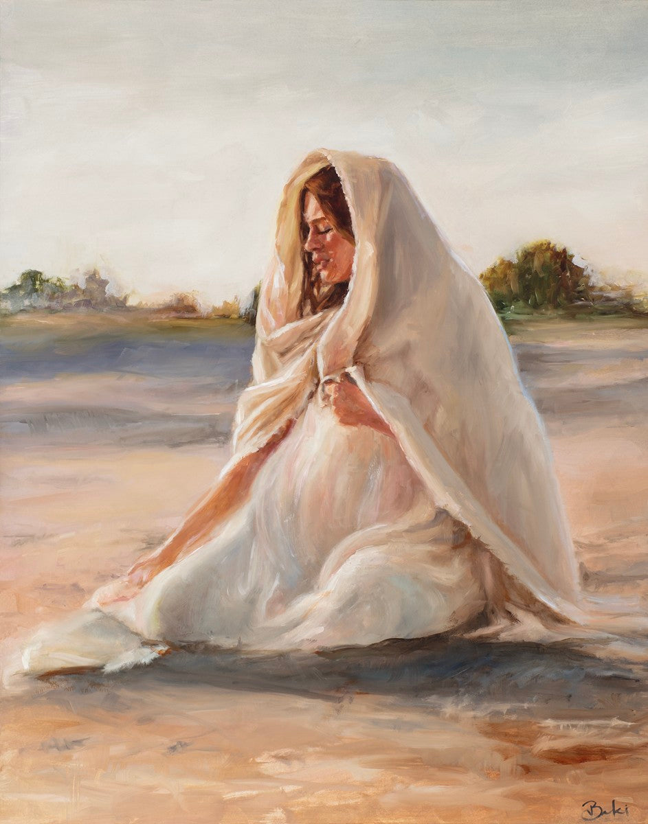 This painting is my tribute to Mary, an attempt at capturing the emotions she must have had to conquer as she prepared to travel to Bethlehem. With her time drawing near, leaving behind comfort and family support, she was about to bring the Child of God into the world.