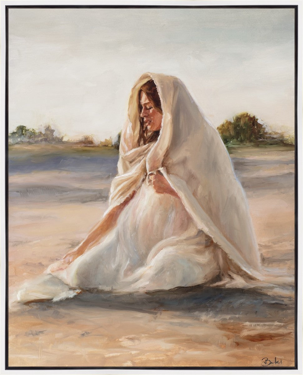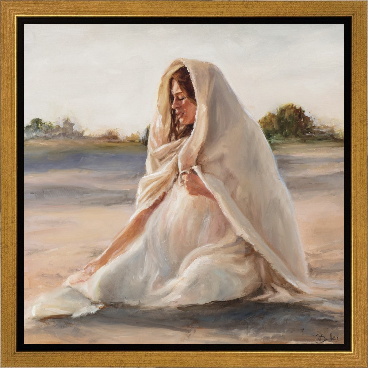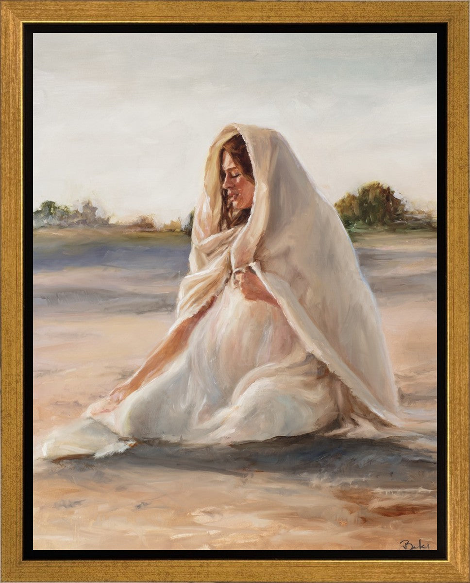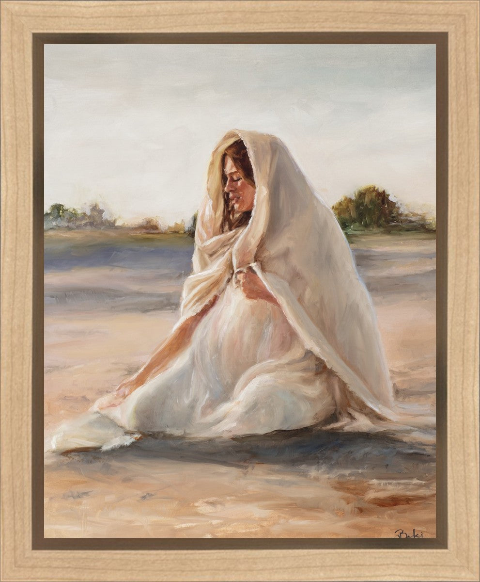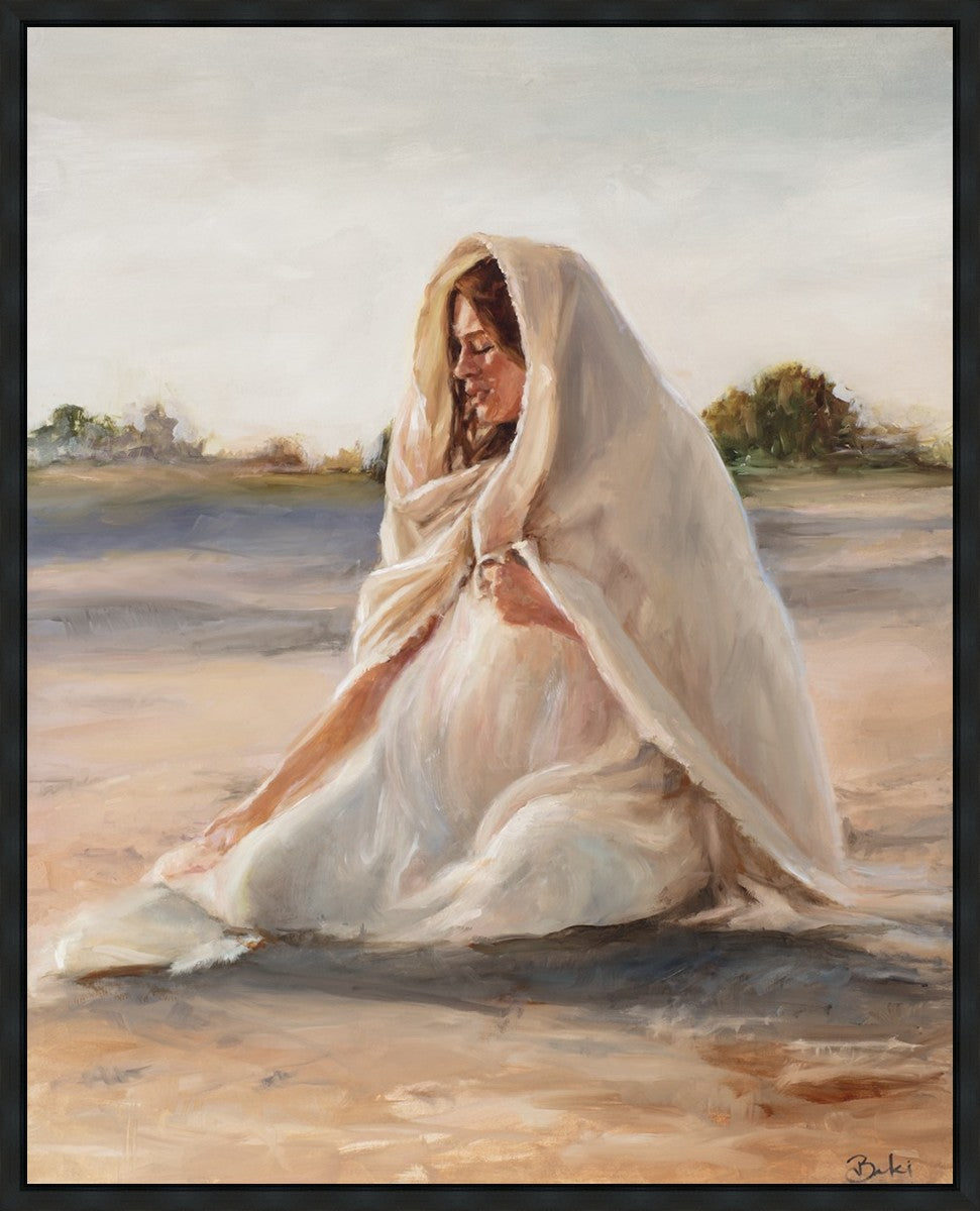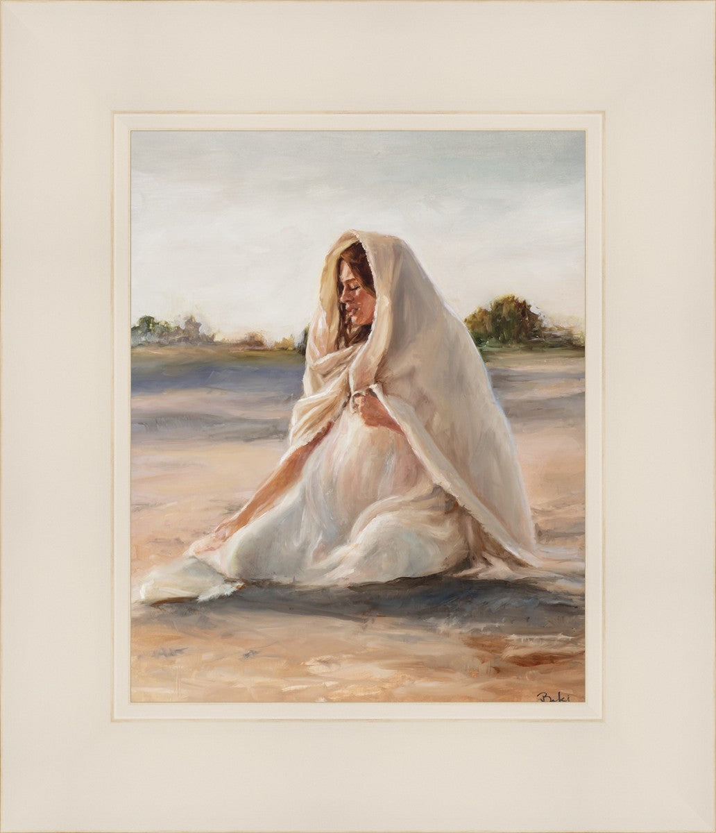 This painting is my tribute to Mary, an attempt at capturing the emotions she must have had to conquer as she prepared to travel to Bethlehem. With her time drawing near, leaving behind comfort and family support, she was about to bring the Child of God into the world.