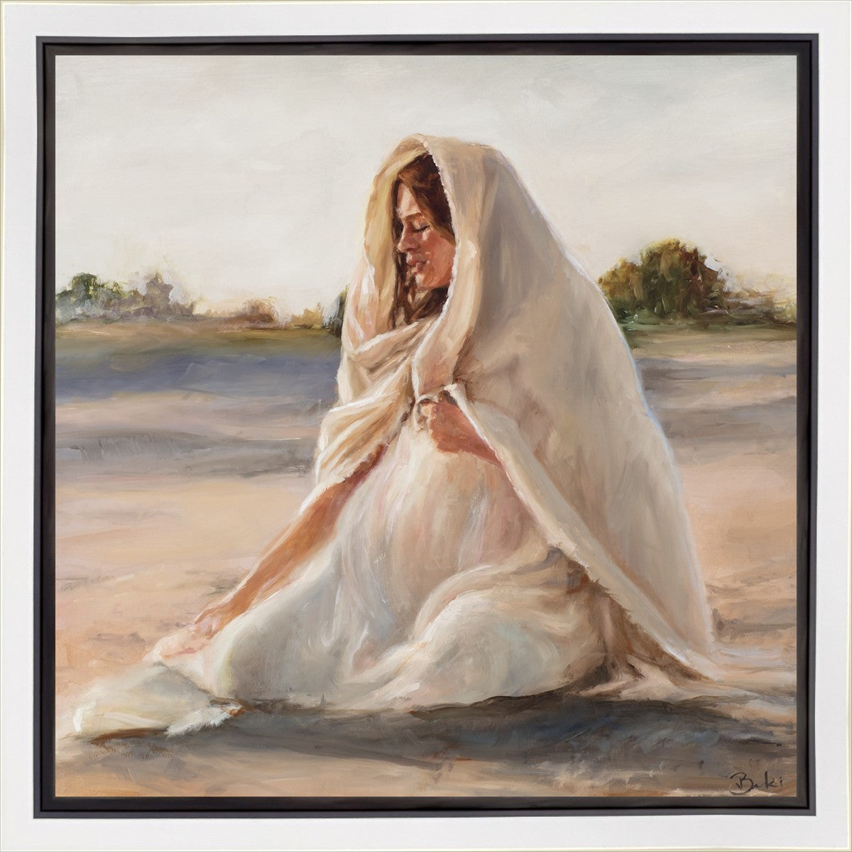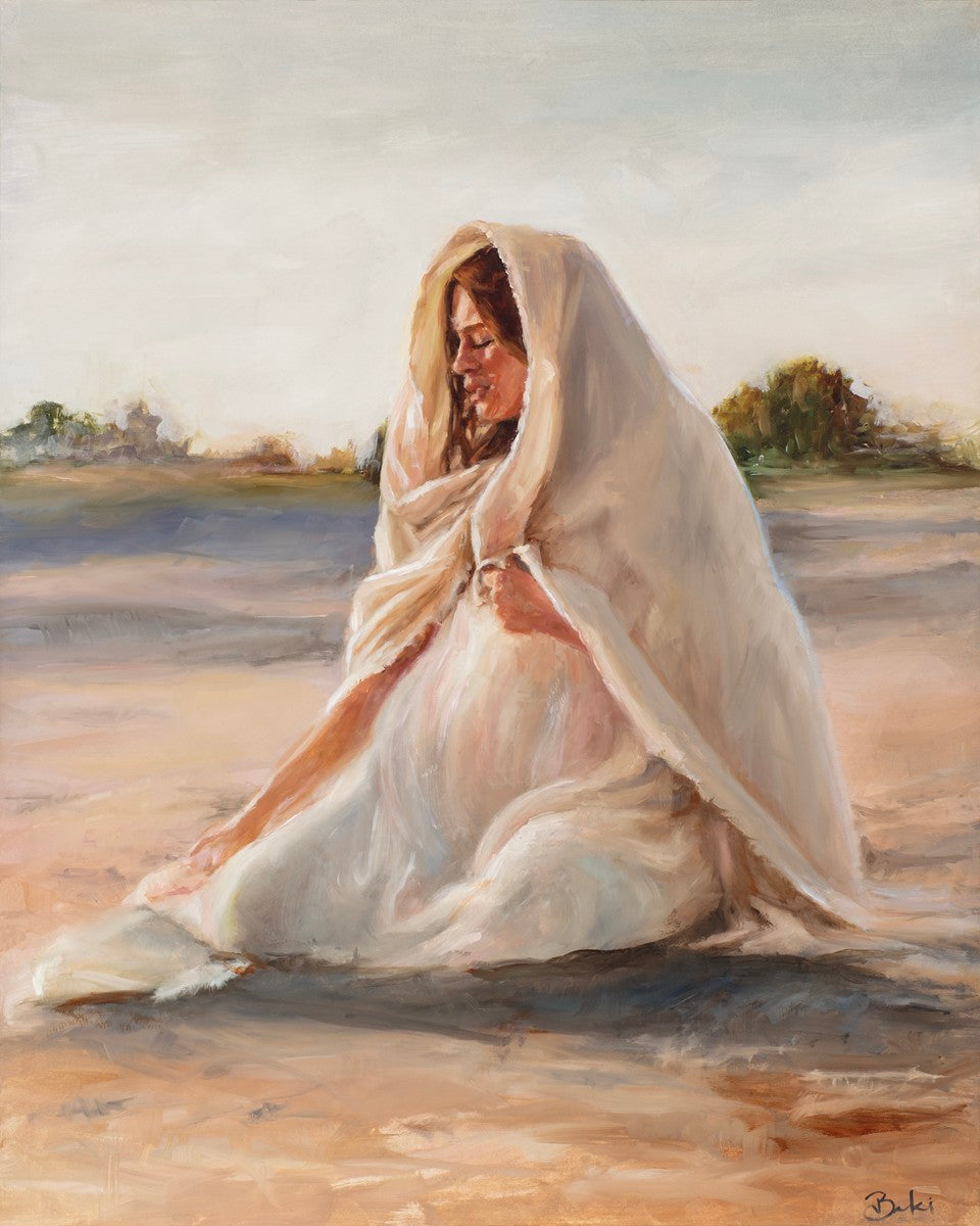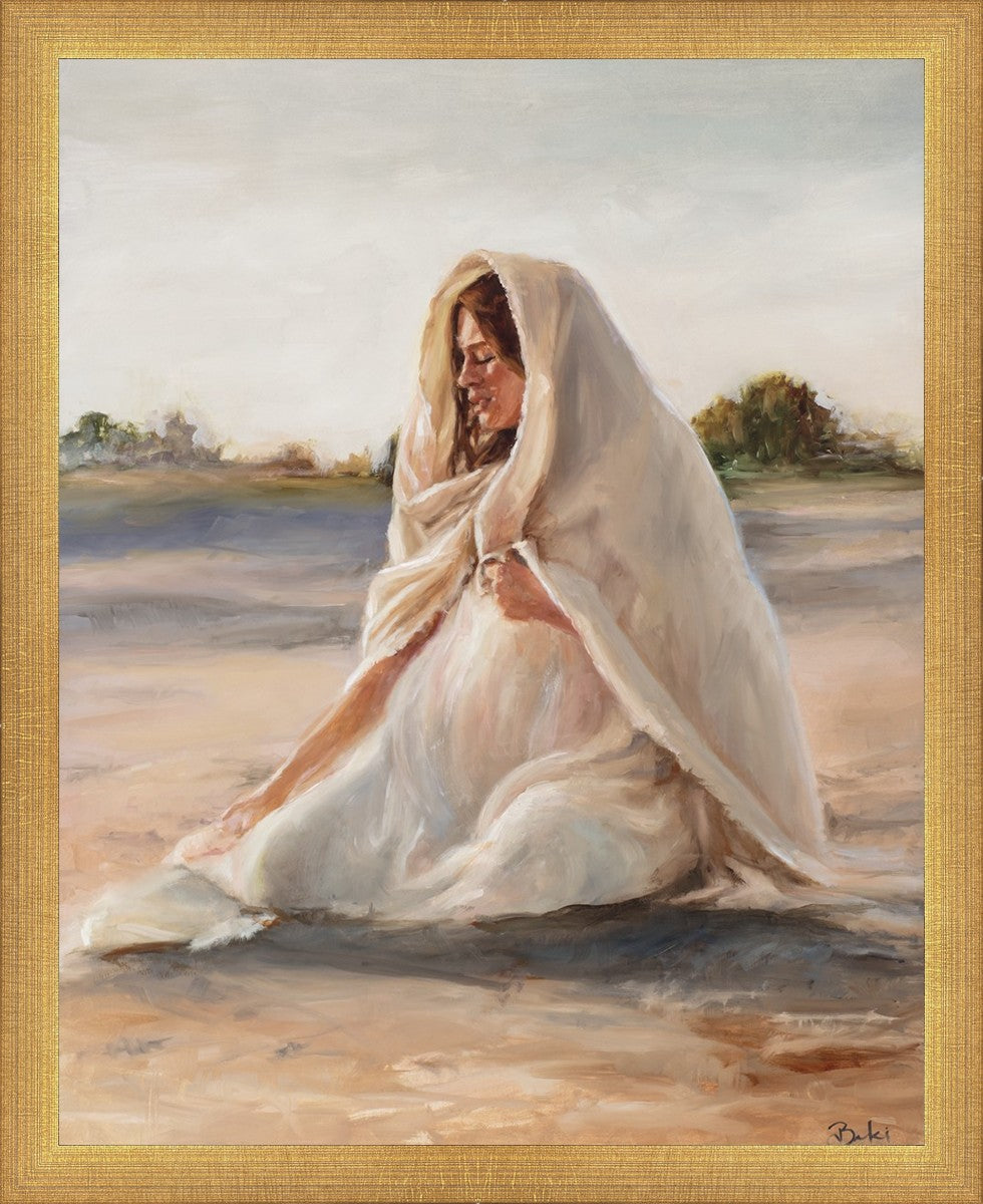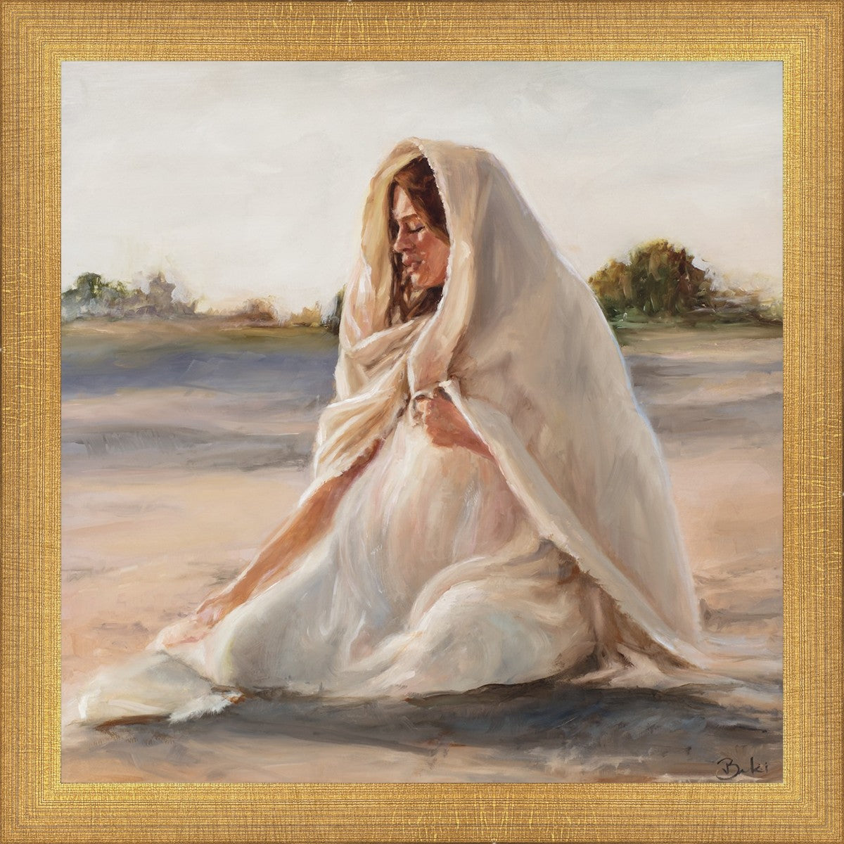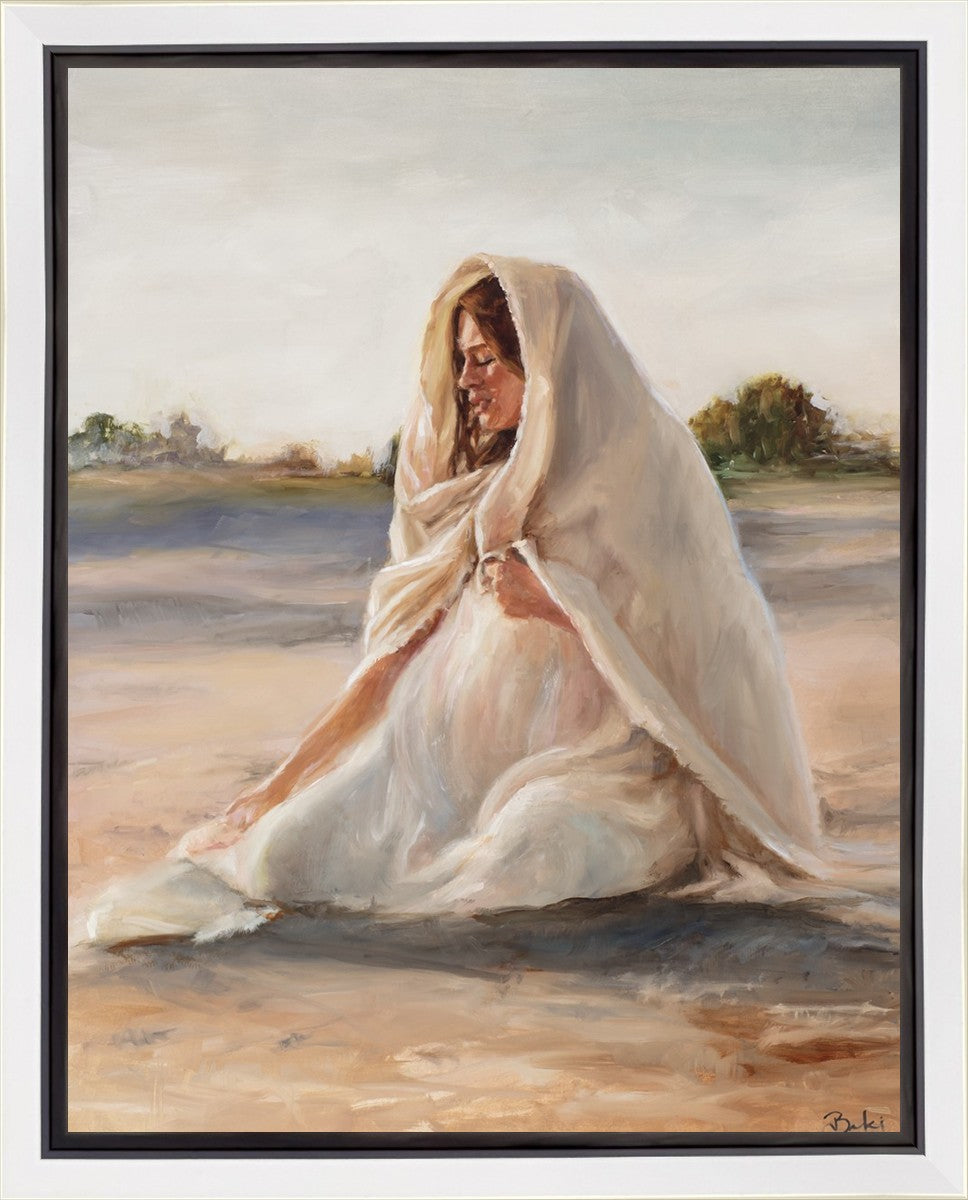 This painting is my tribute to Mary, an attempt at capturing the emotions she must have had to conquer as she prepared to travel to Bethlehem. With her time drawing near, leaving behind comfort and family support, she was about to bring the Child of God into the world.