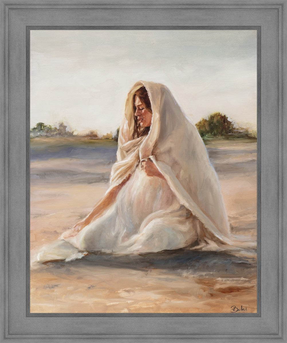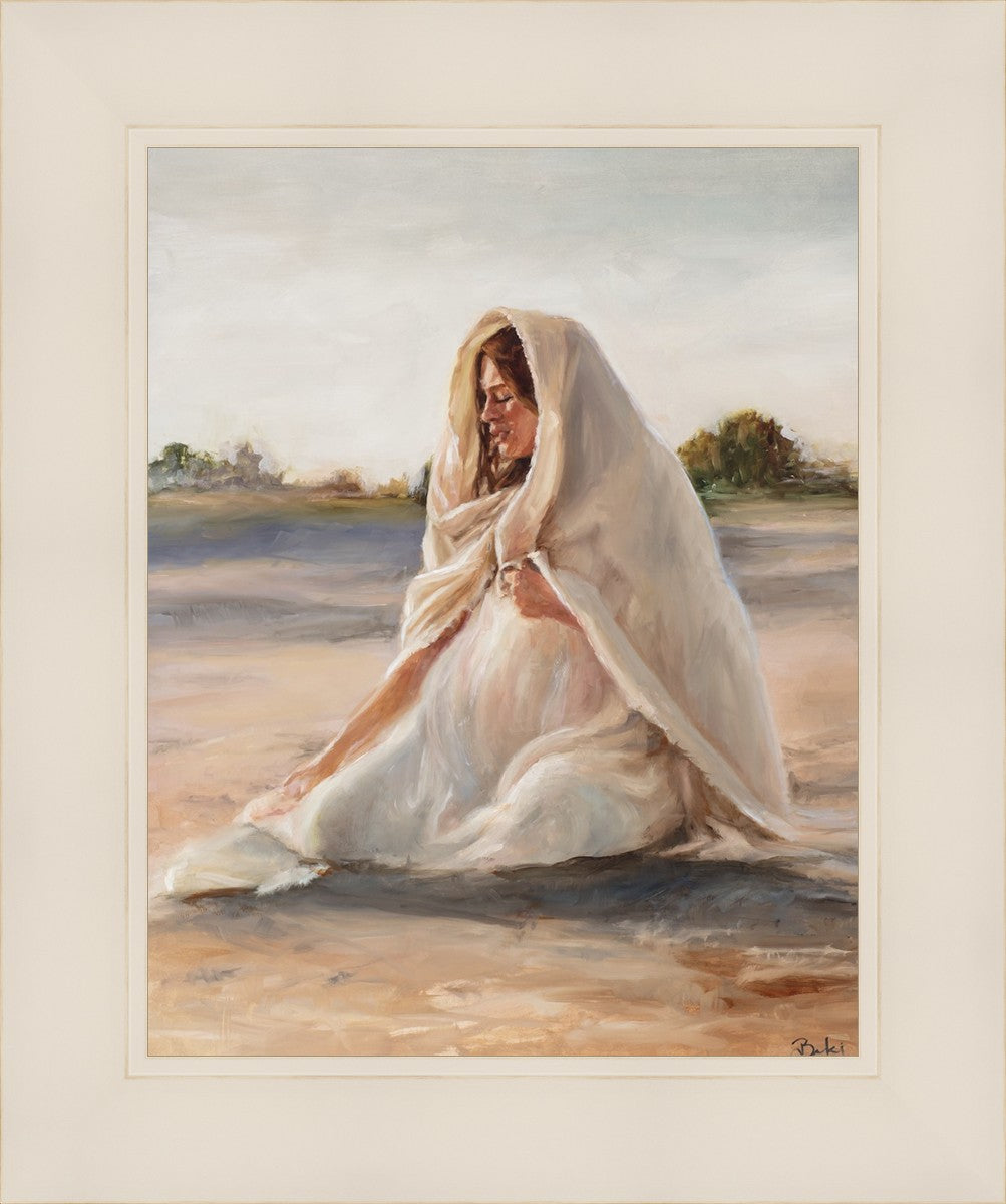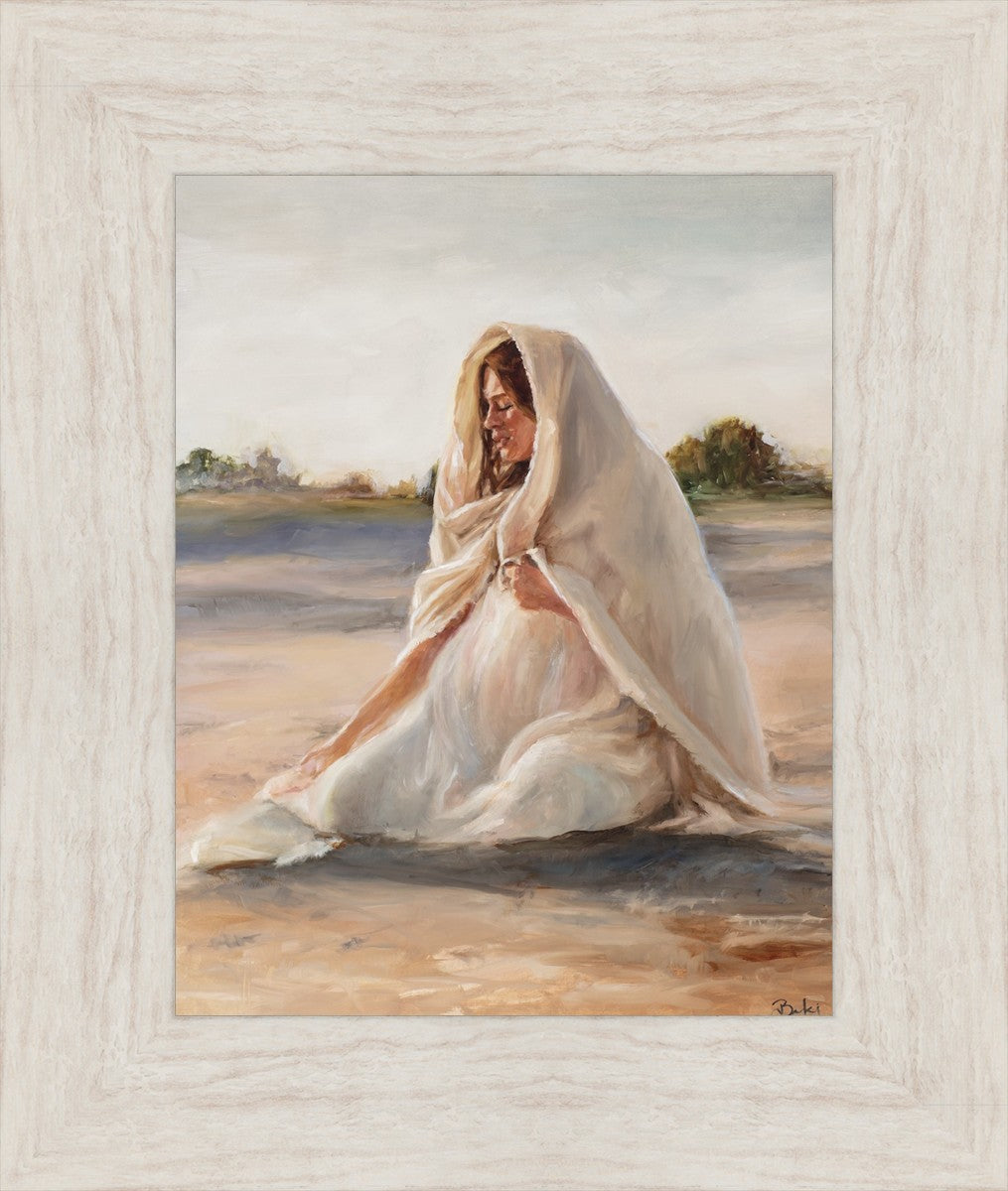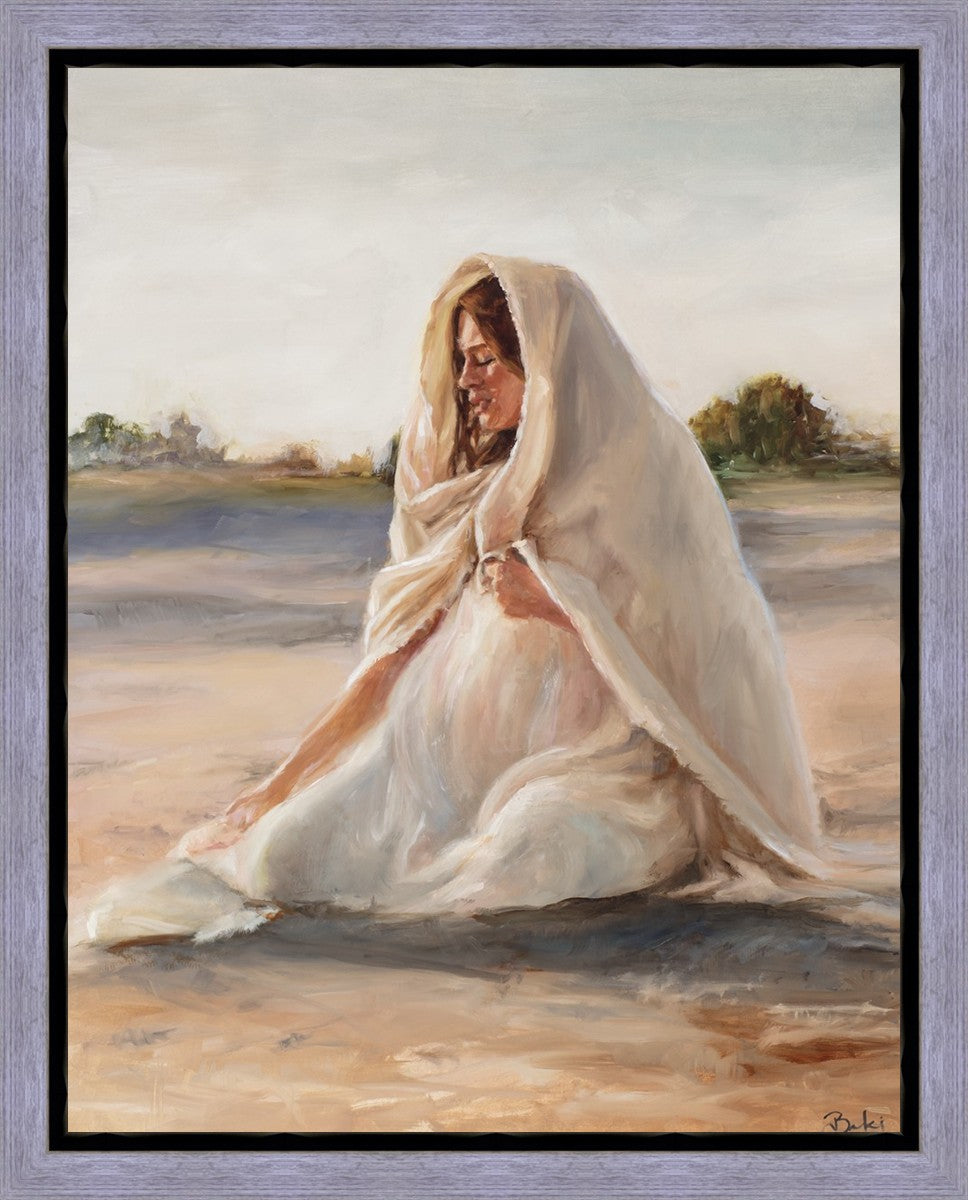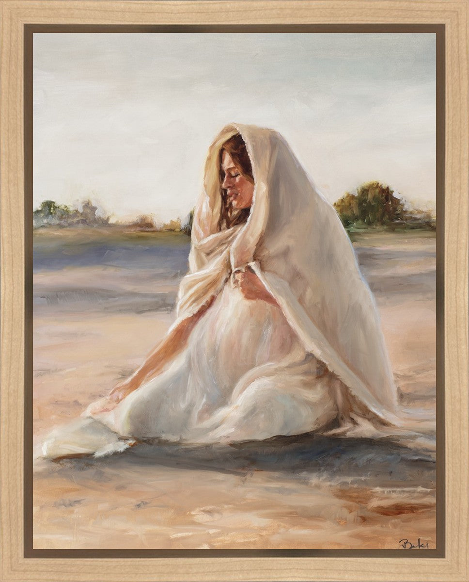 This painting is my tribute to Mary, an attempt at capturing the emotions she must have had to conquer as she prepared to travel to Bethlehem. With her time drawing near, leaving behind comfort and family support, she was about to bring the Child of God into the world.