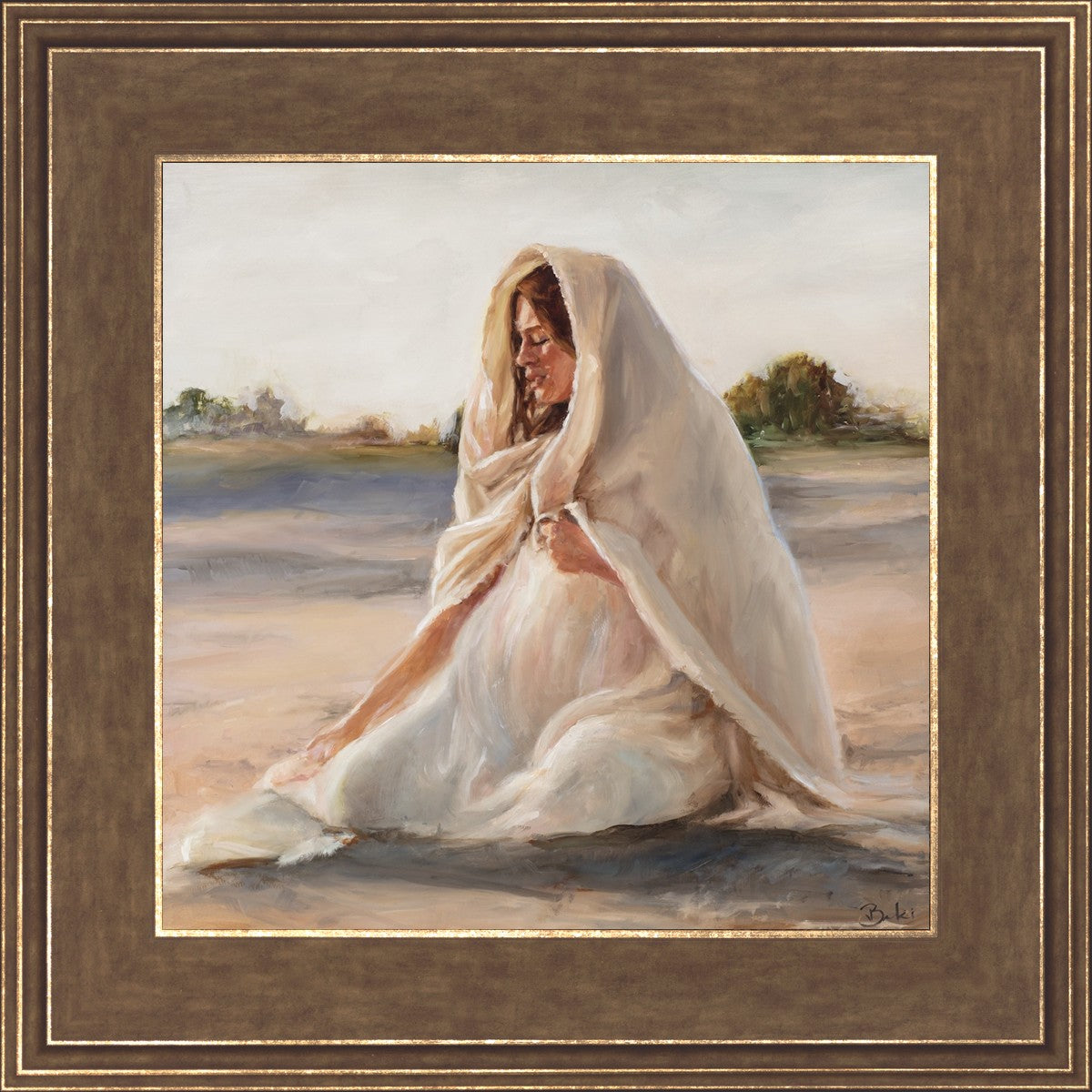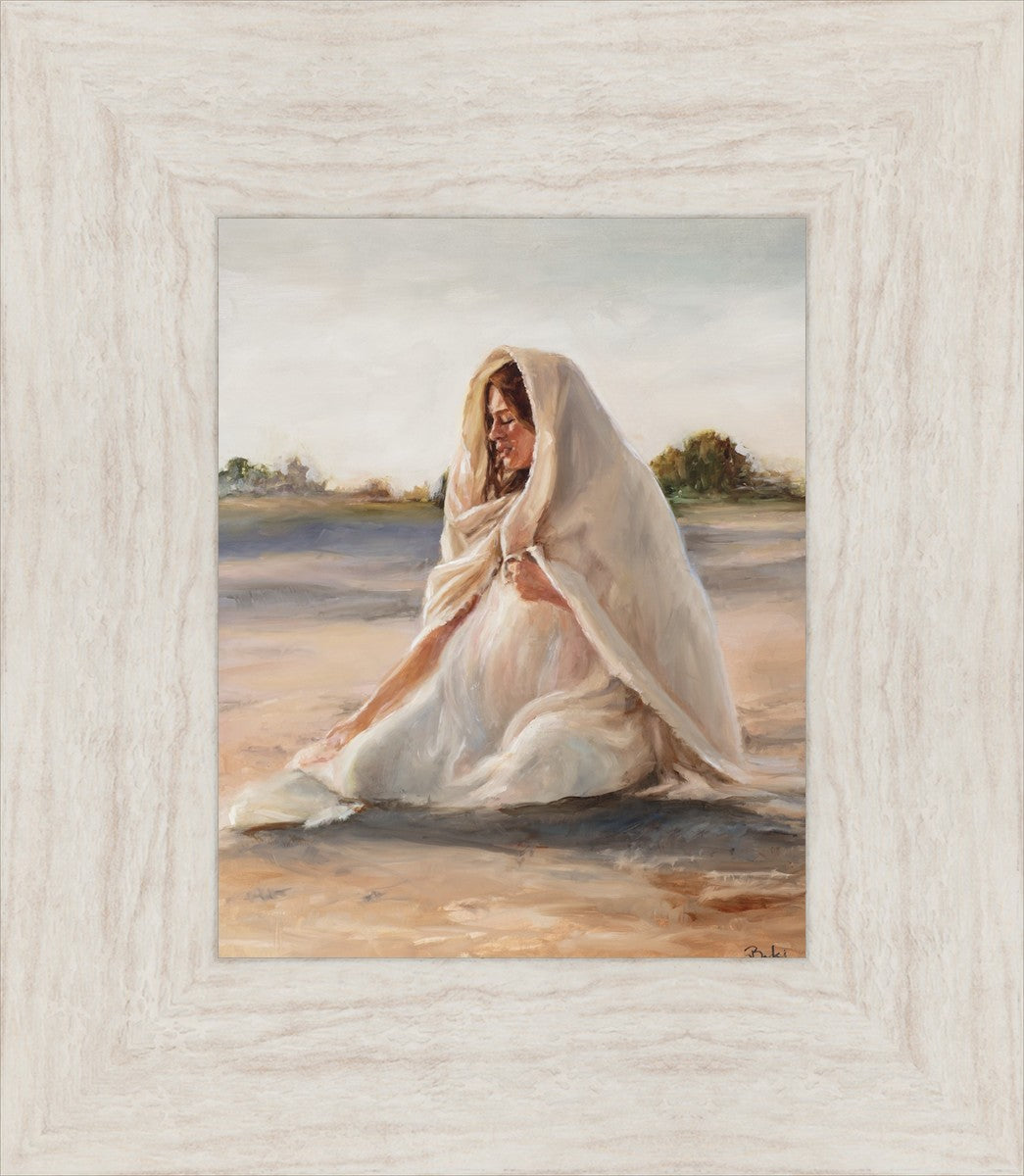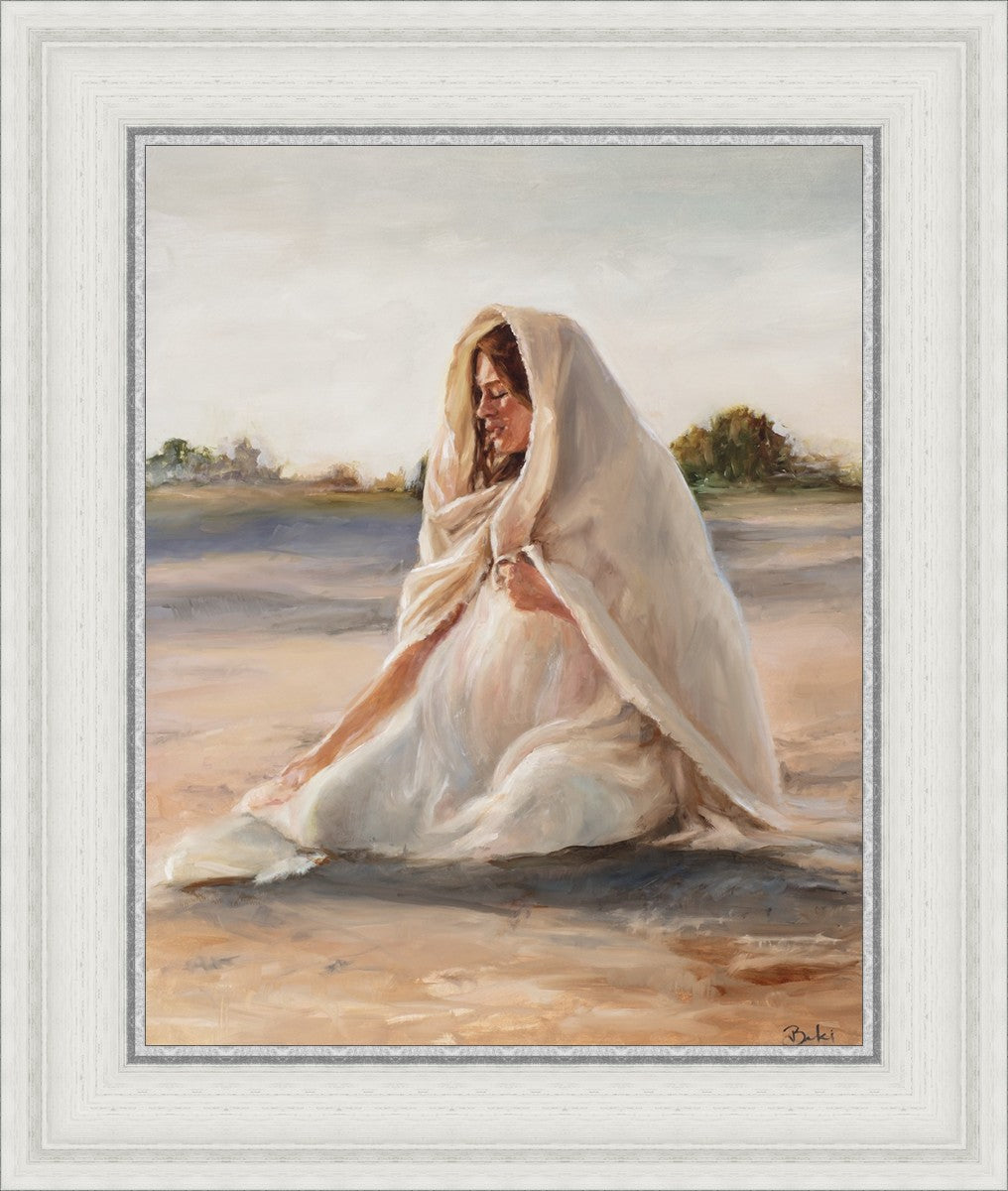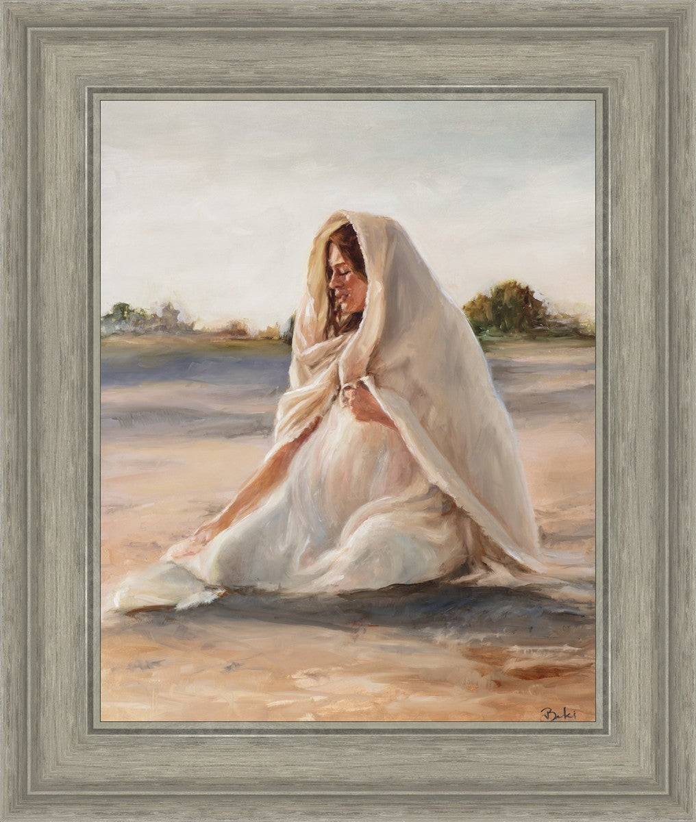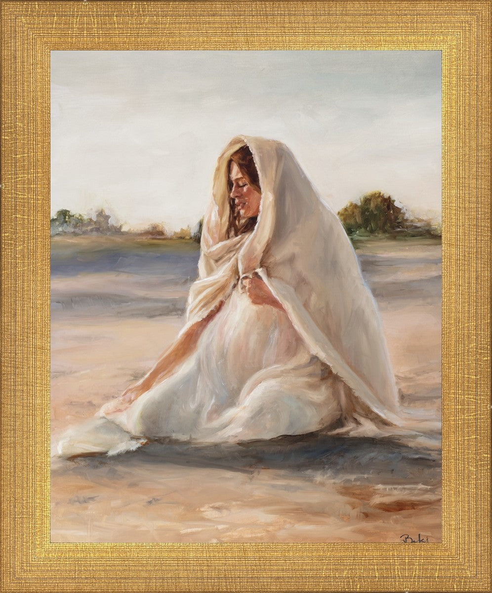 This painting is my tribute to Mary, an attempt at capturing the emotions she must have had to conquer as she prepared to travel to Bethlehem. With her time drawing near, leaving behind comfort and family support, she was about to bring the Child of God into the world.