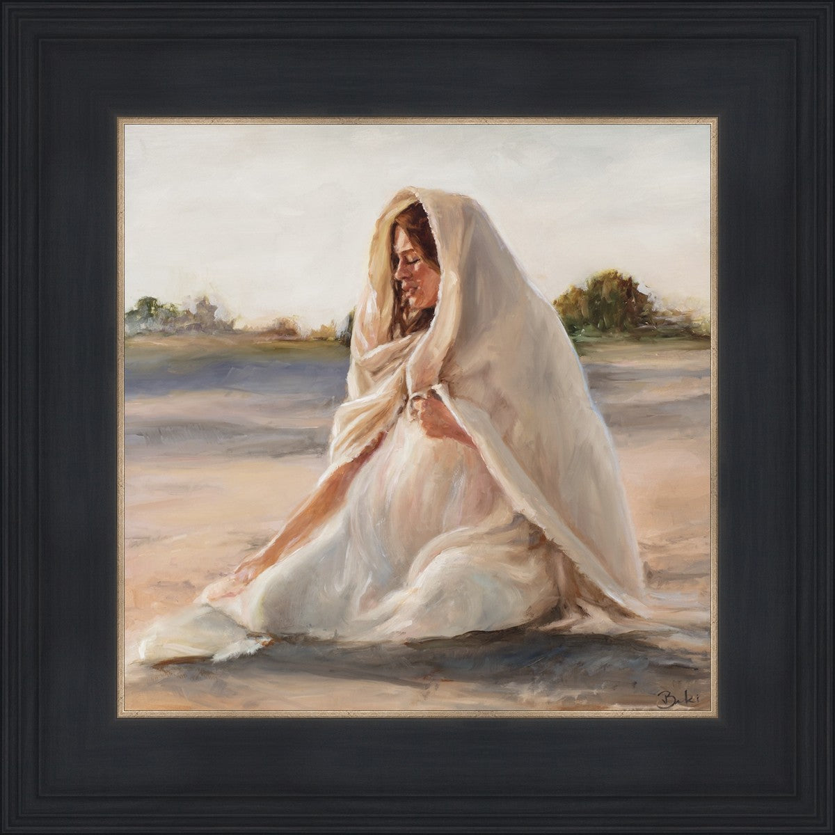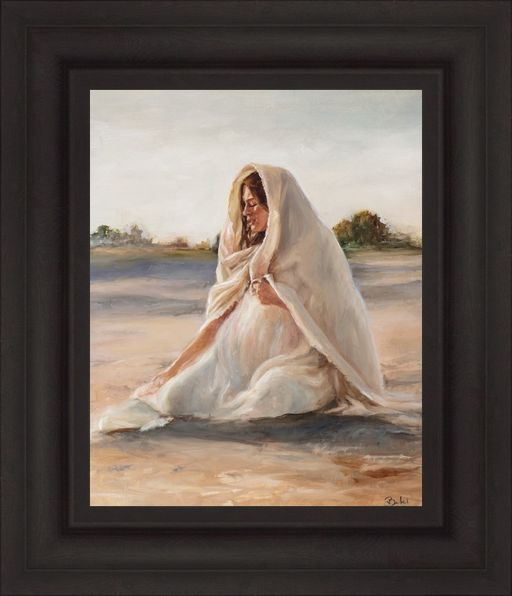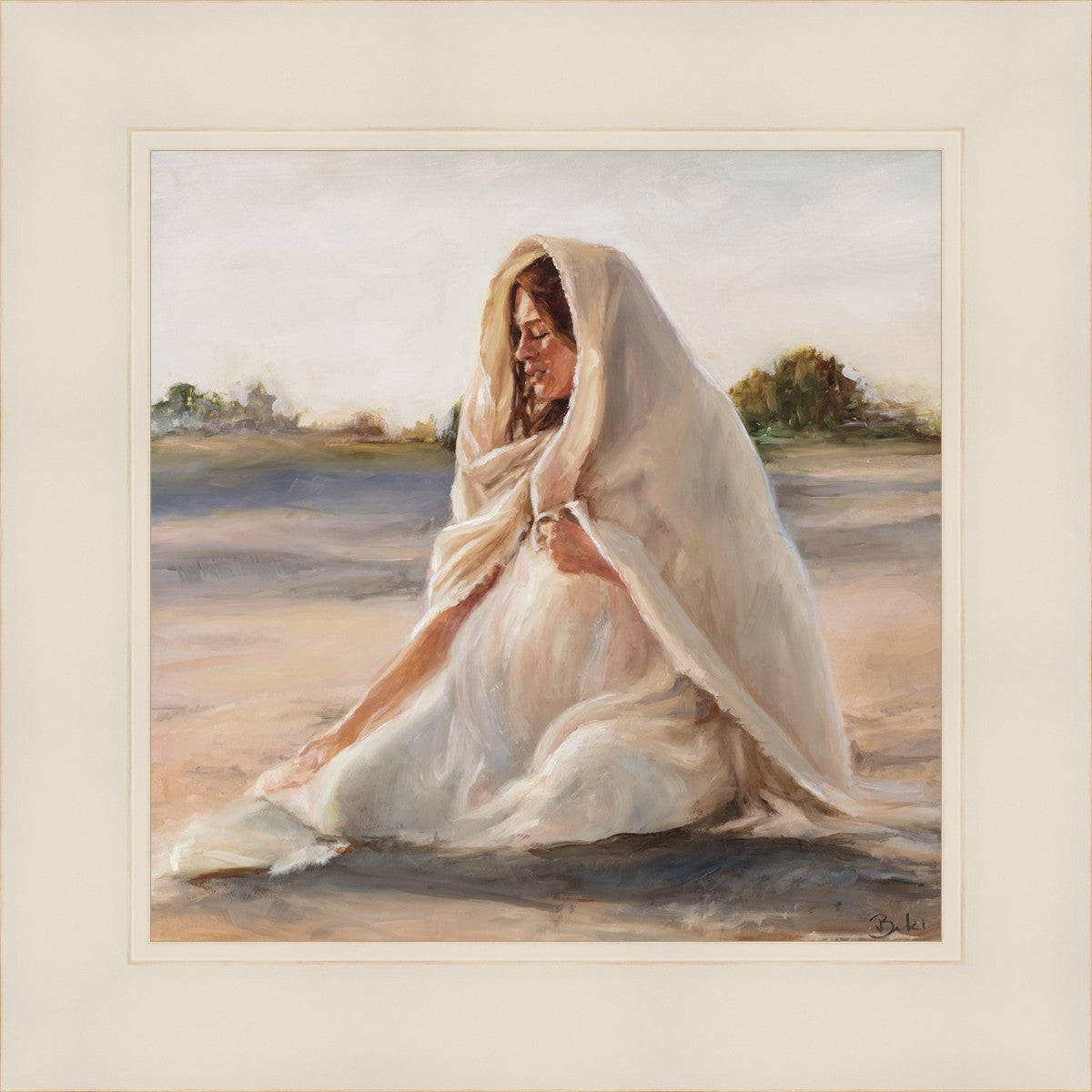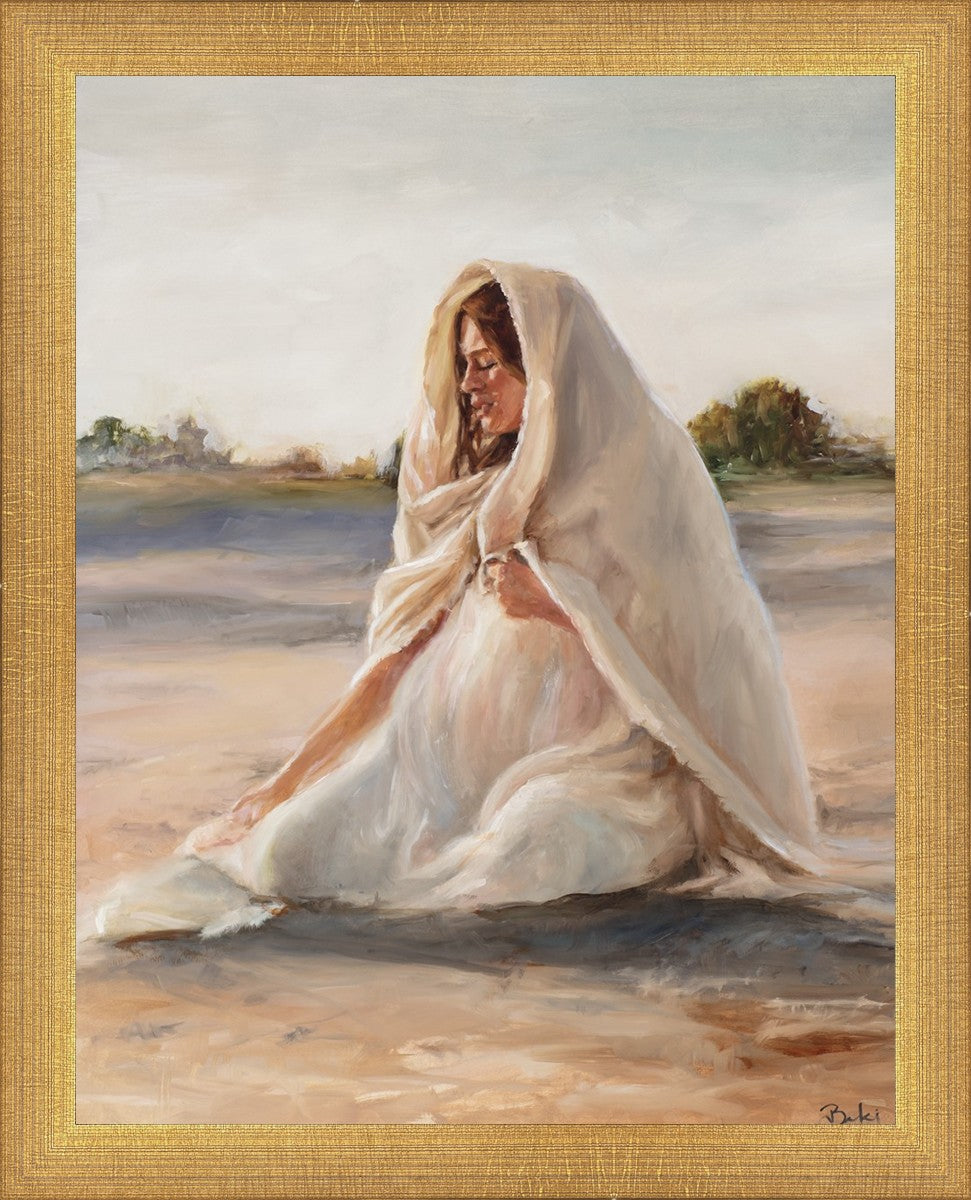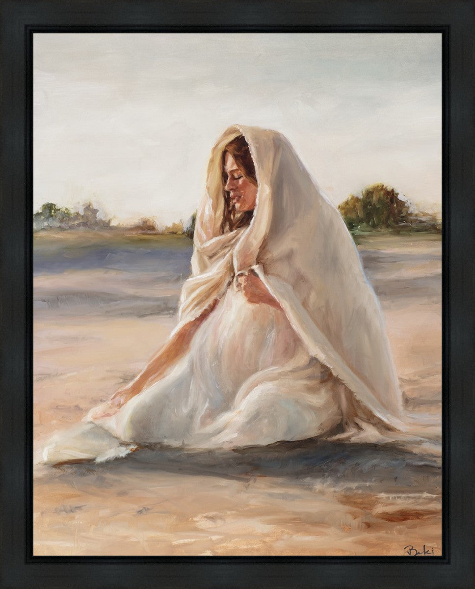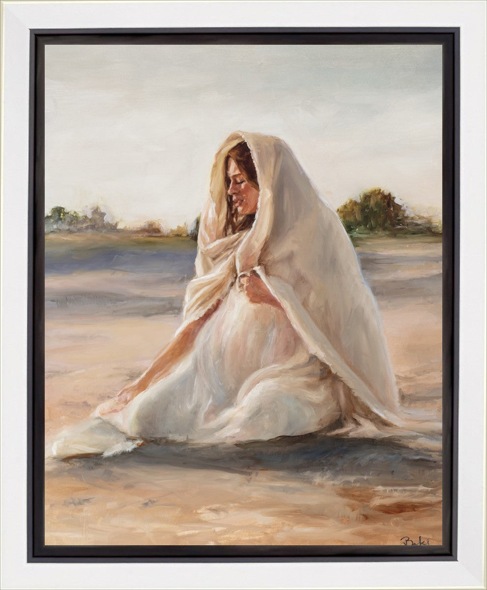 This painting is my tribute to Mary, an attempt at capturing the emotions she must have had to conquer as she prepared to travel to Bethlehem. With her time drawing near, leaving behind comfort and family support, she was about to bring the Child of God into the world.